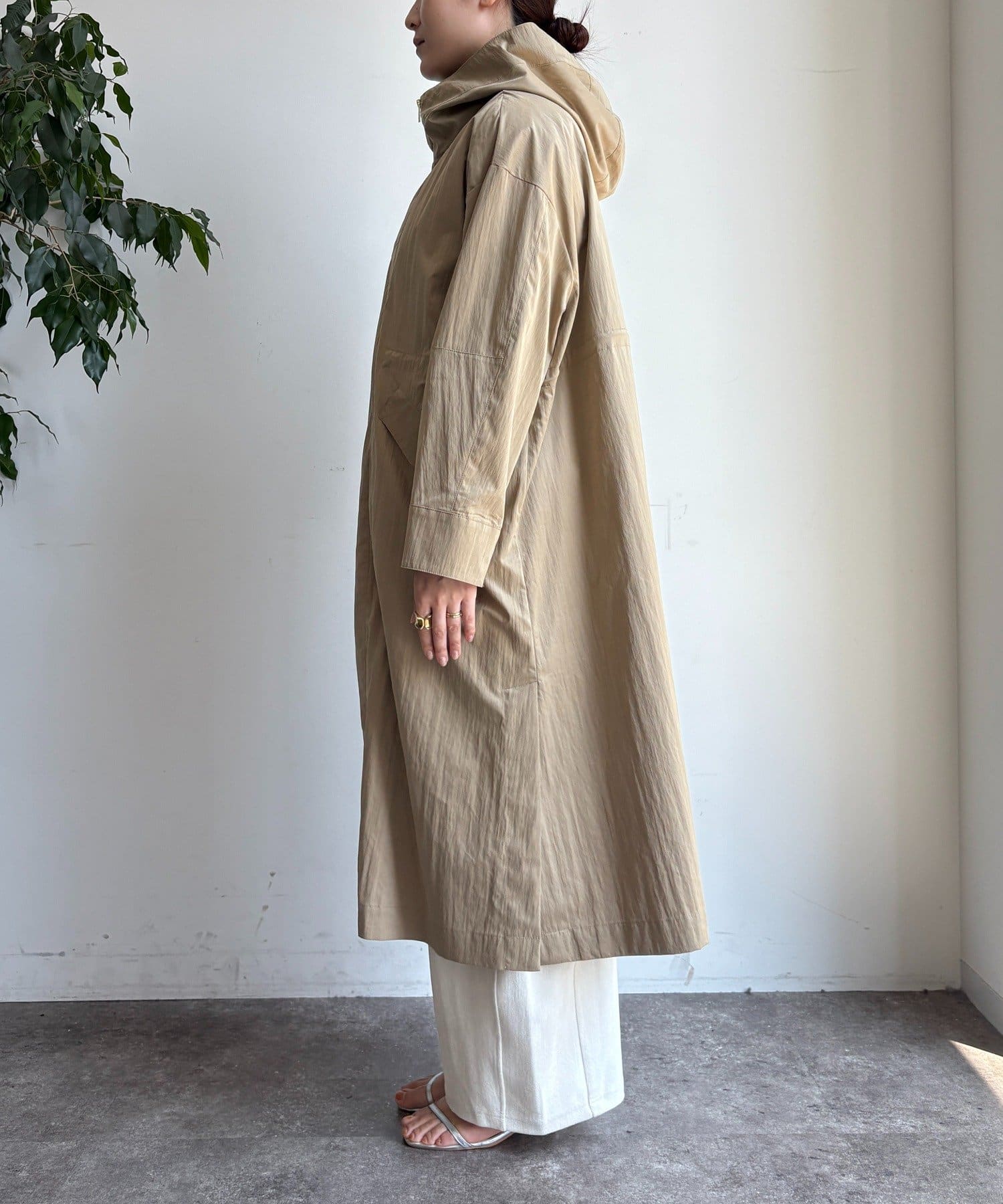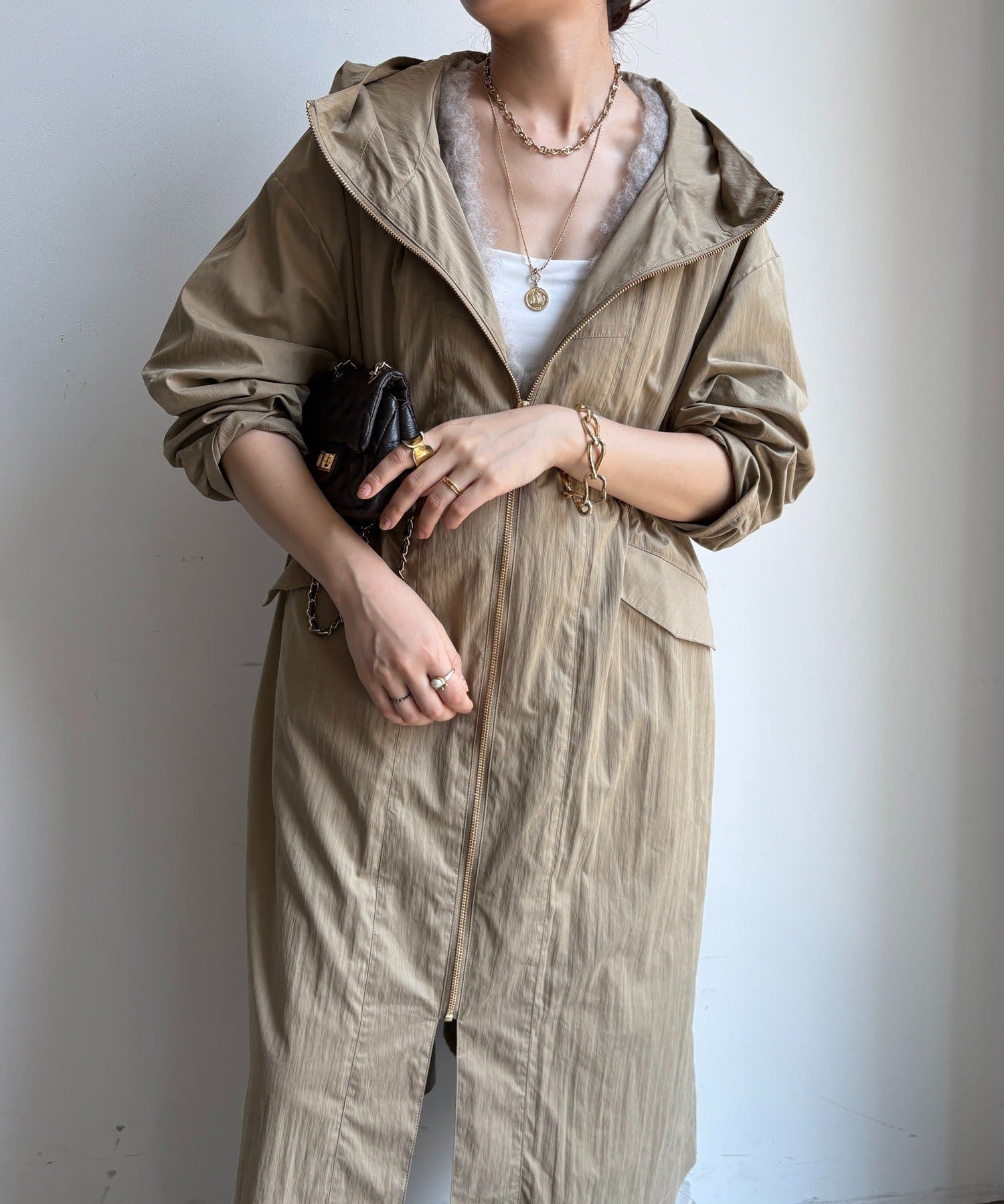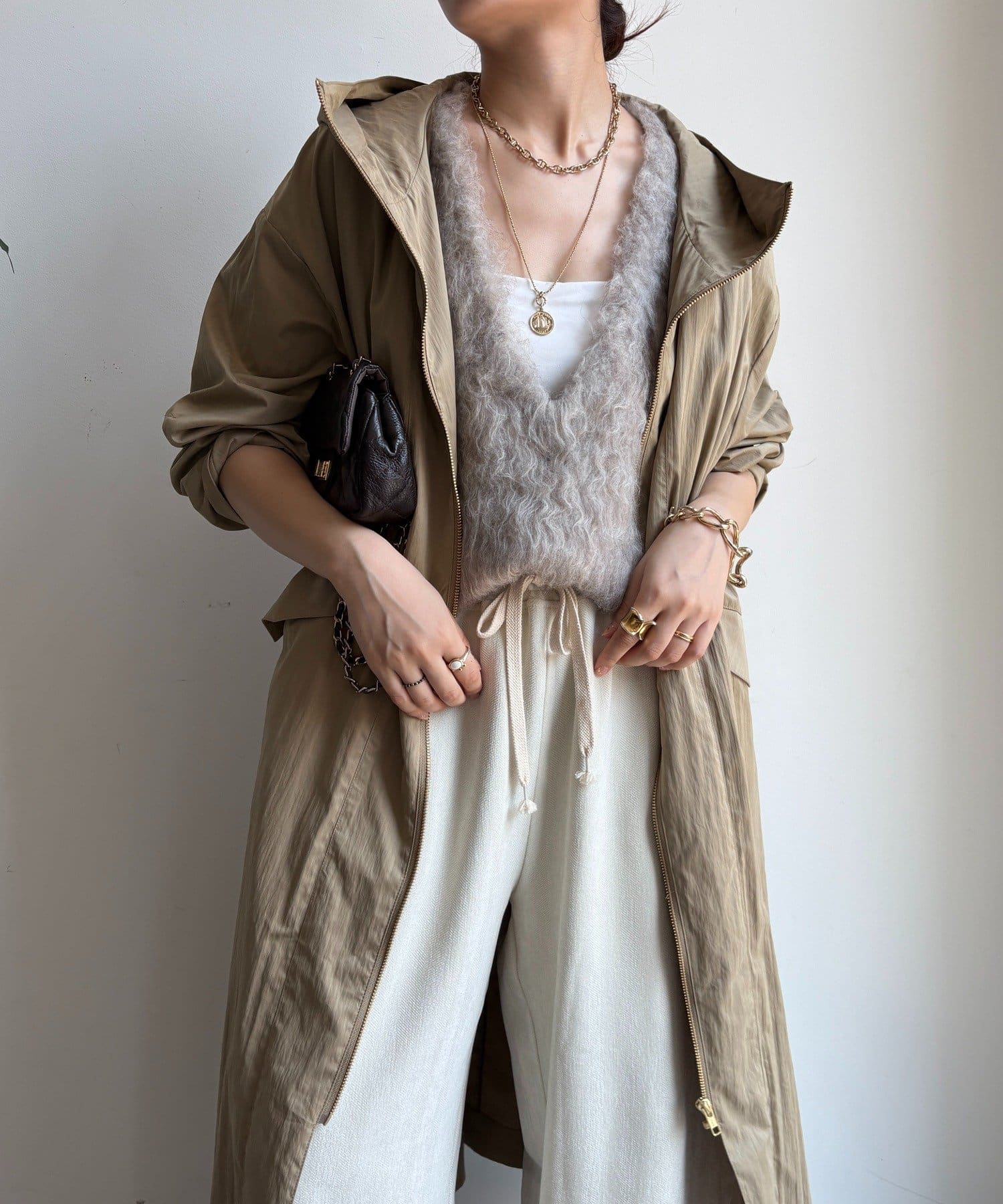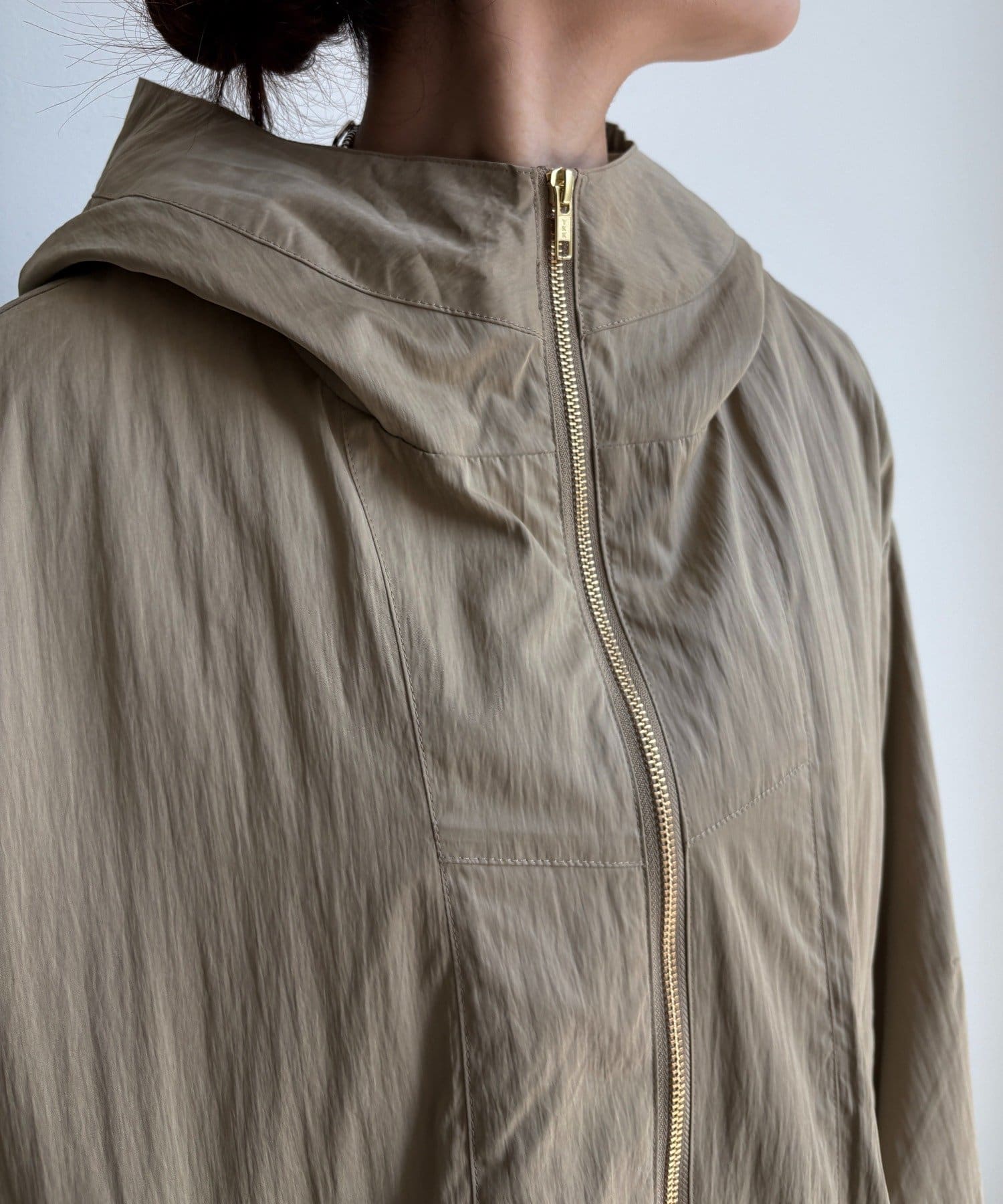 カジュアルなフーディーデザインながらも、上品な光沢と落ち感のある素材が