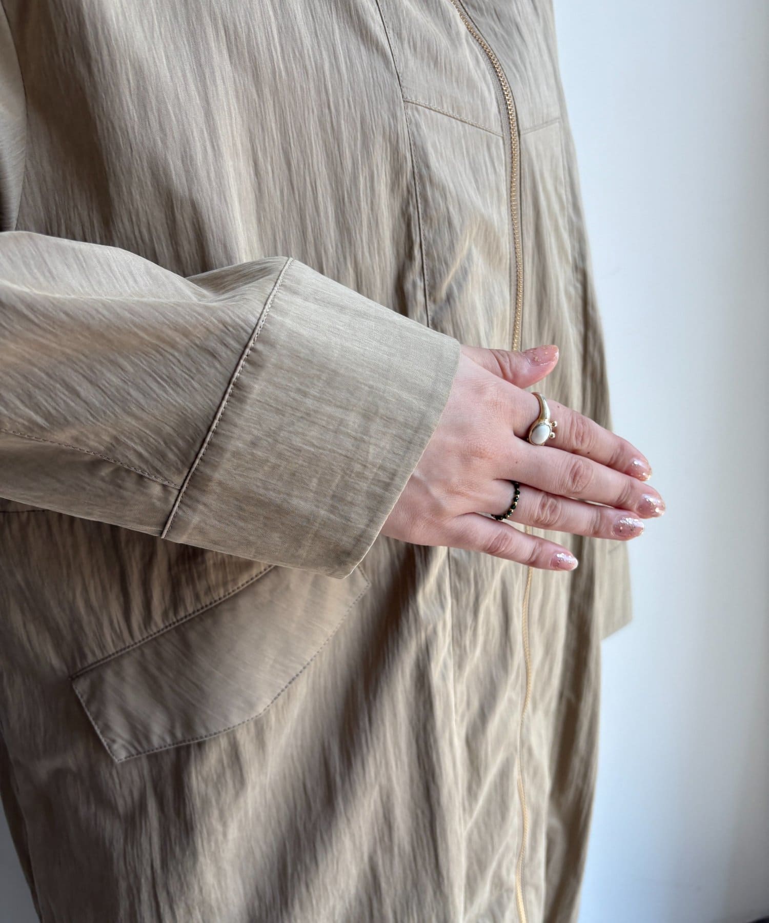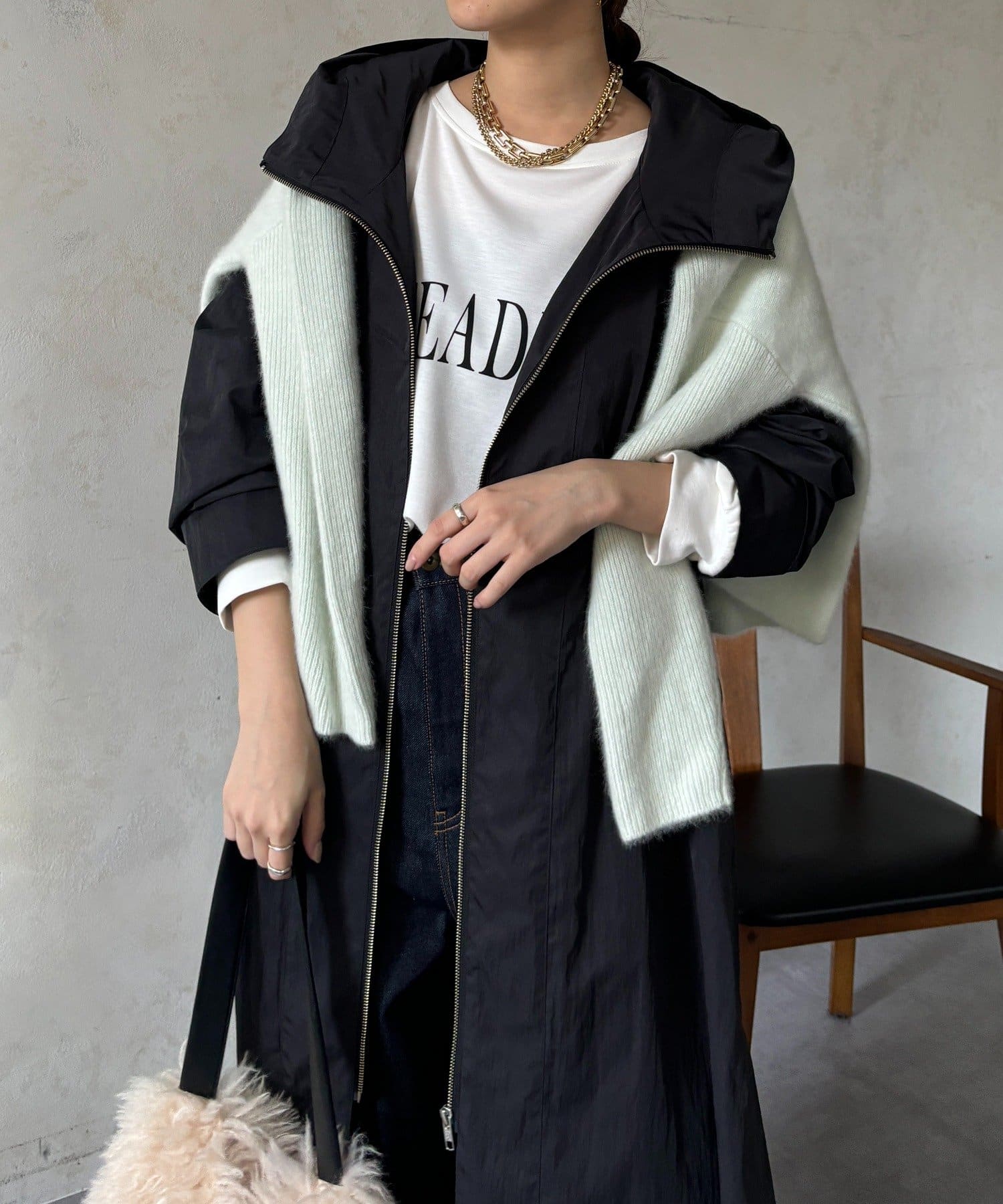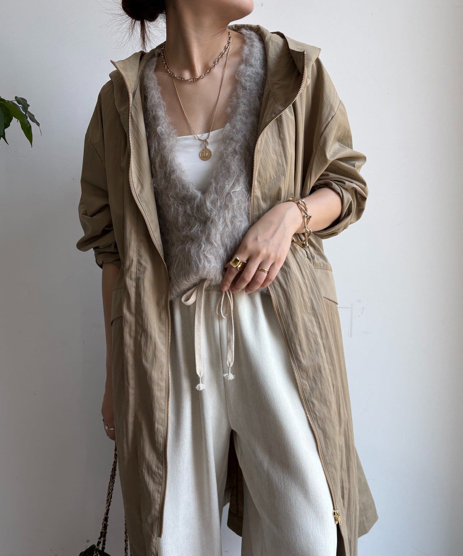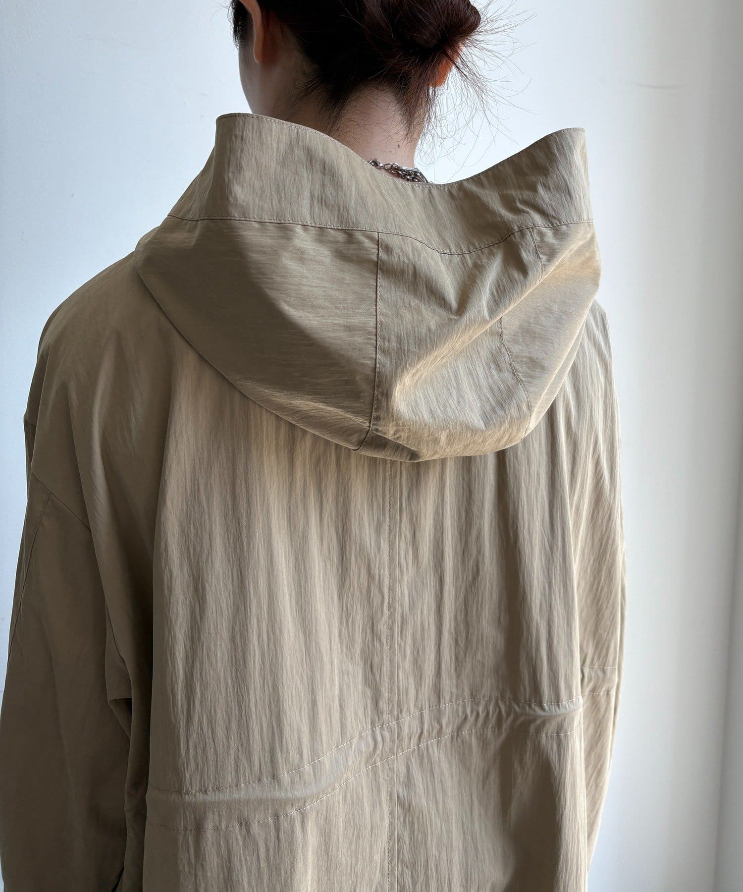 カジュアルなフーディーデザインながらも、上品な光沢と落ち感のある素材が