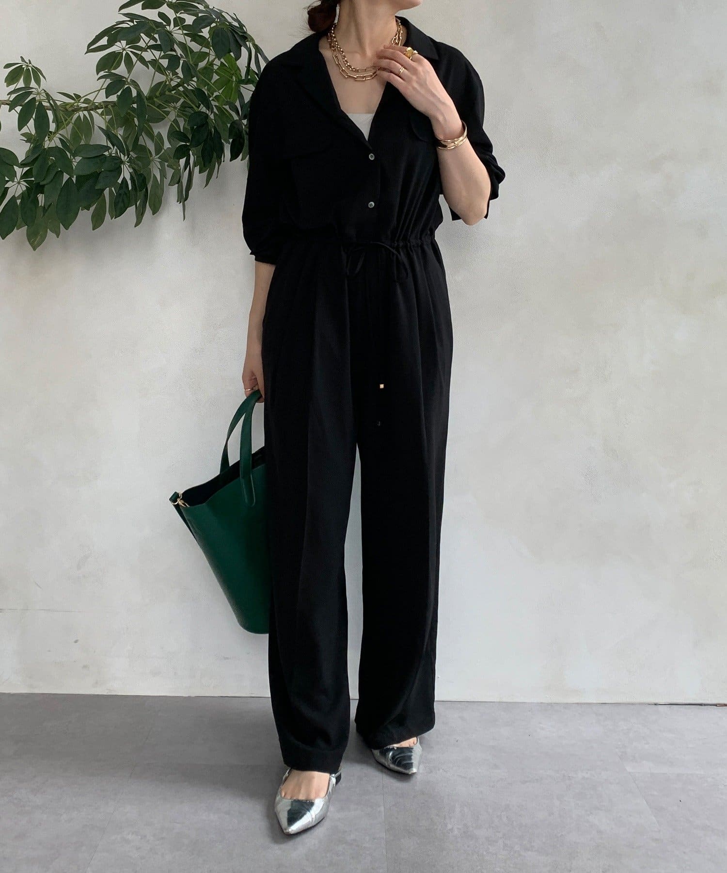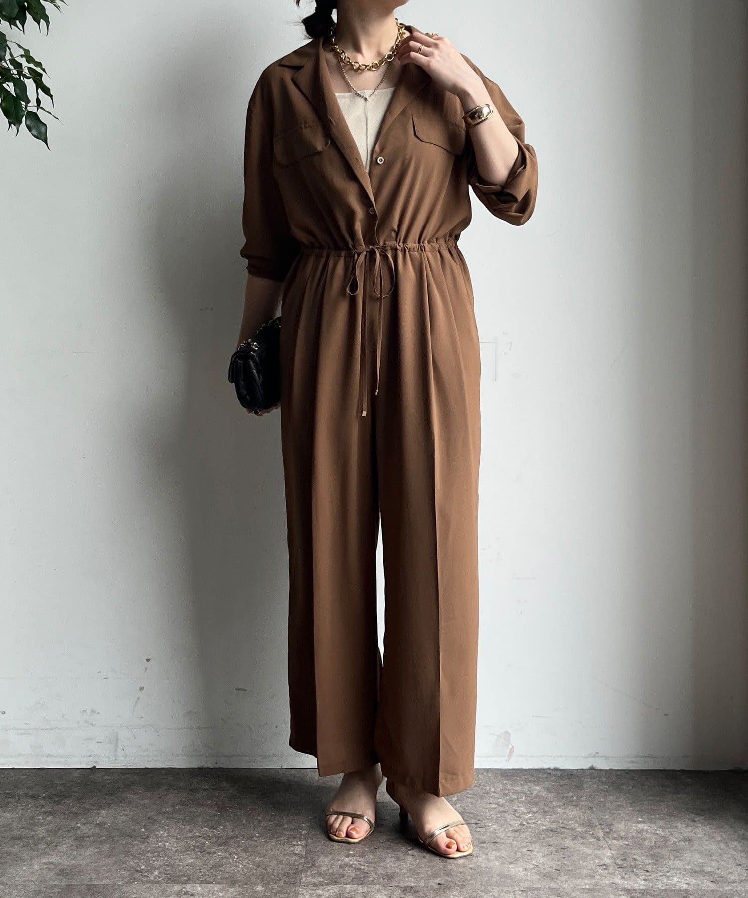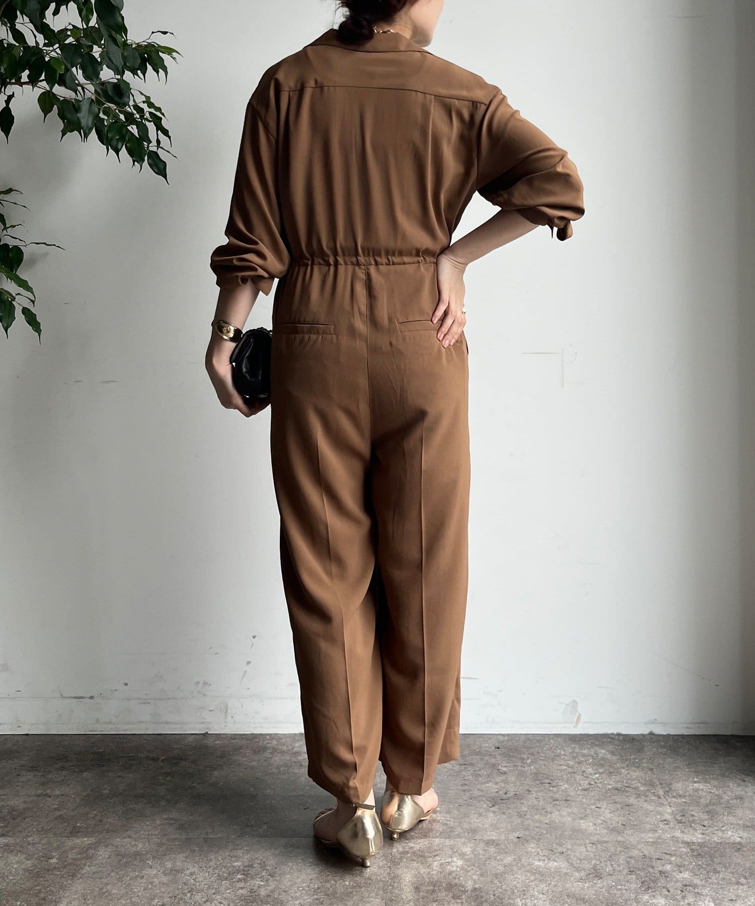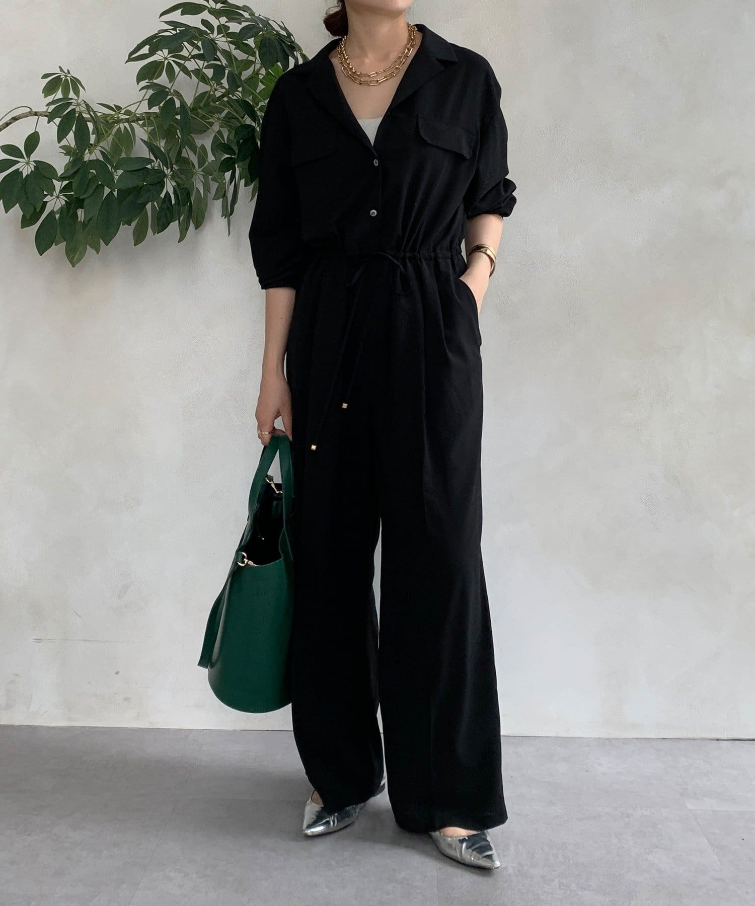ジャンプスーツならではの、ワイドなストレートシルエットがルーズな印象でおしゃれに。