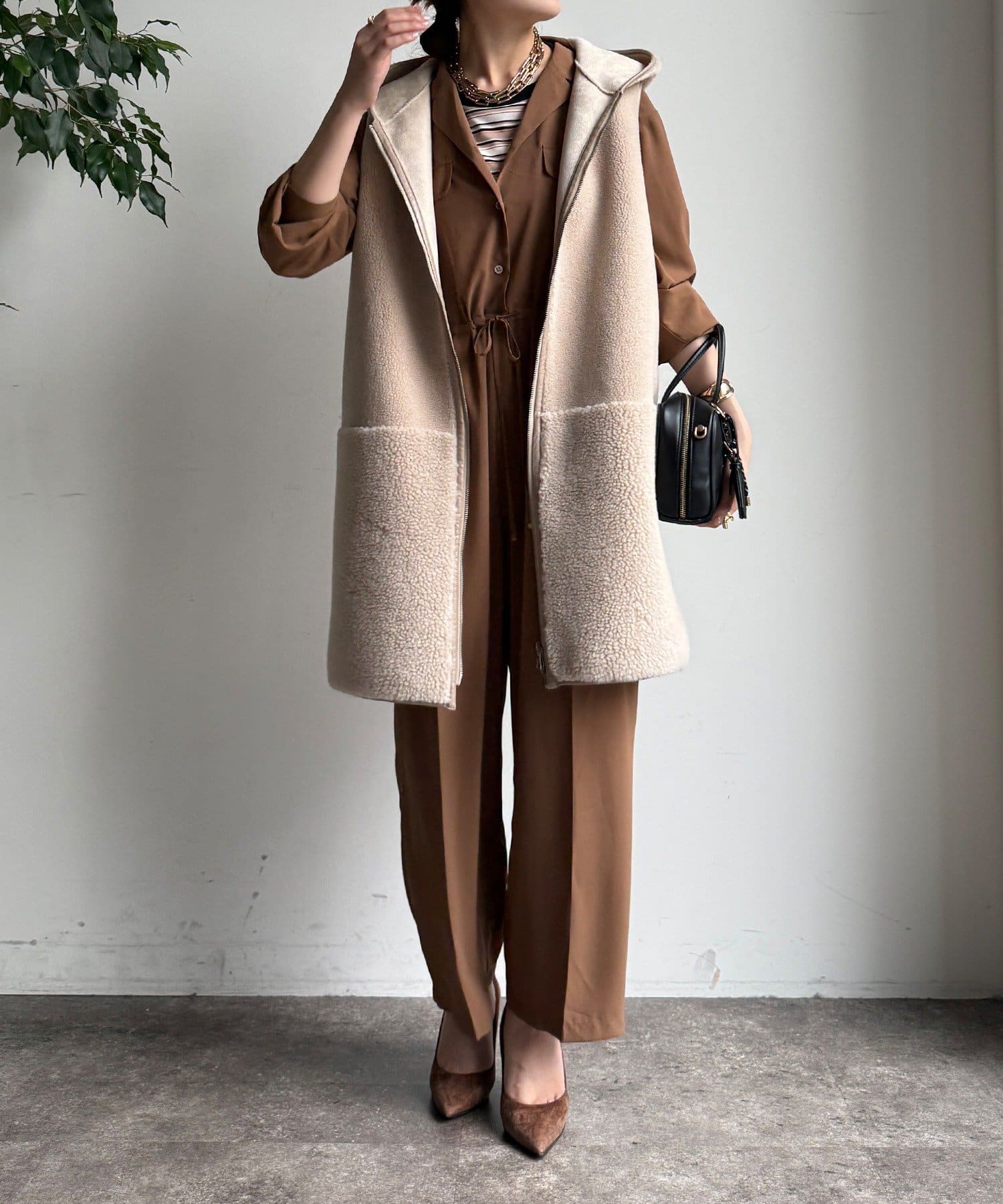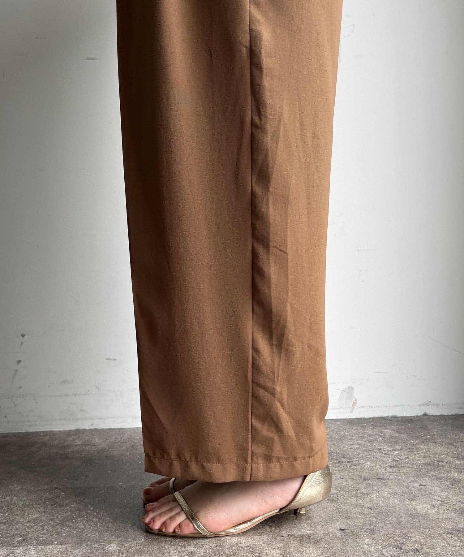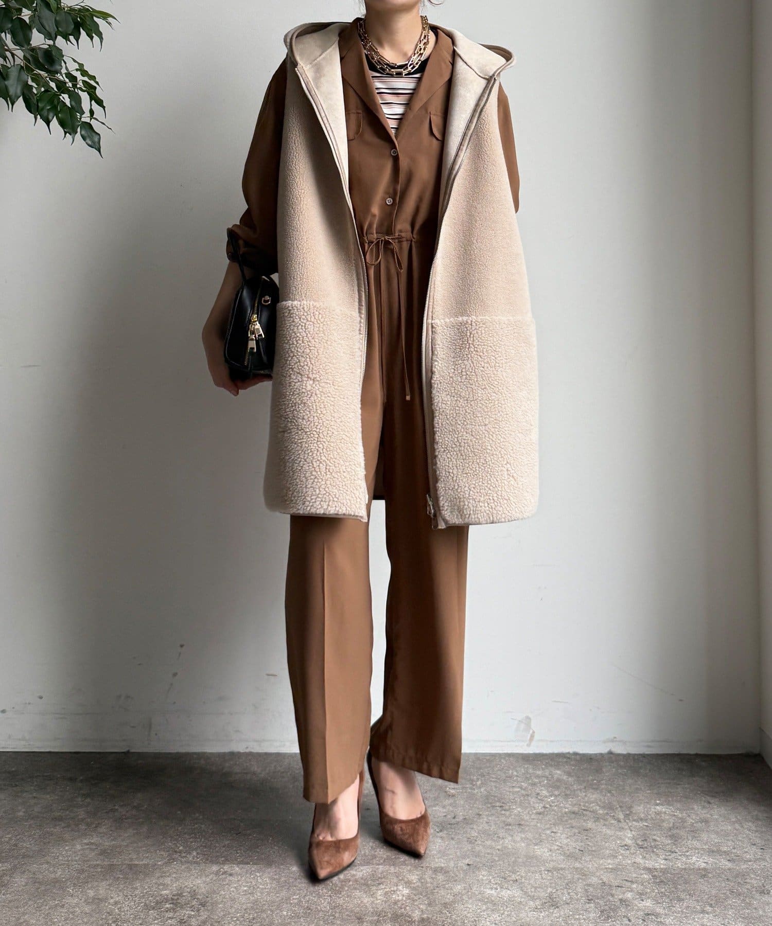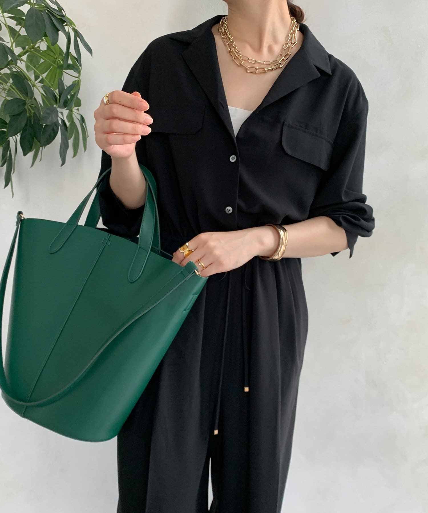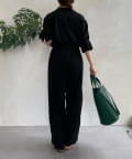 ジャンプスーツならではの、ワイドなストレートシルエットがルーズな印象でおしゃれに。