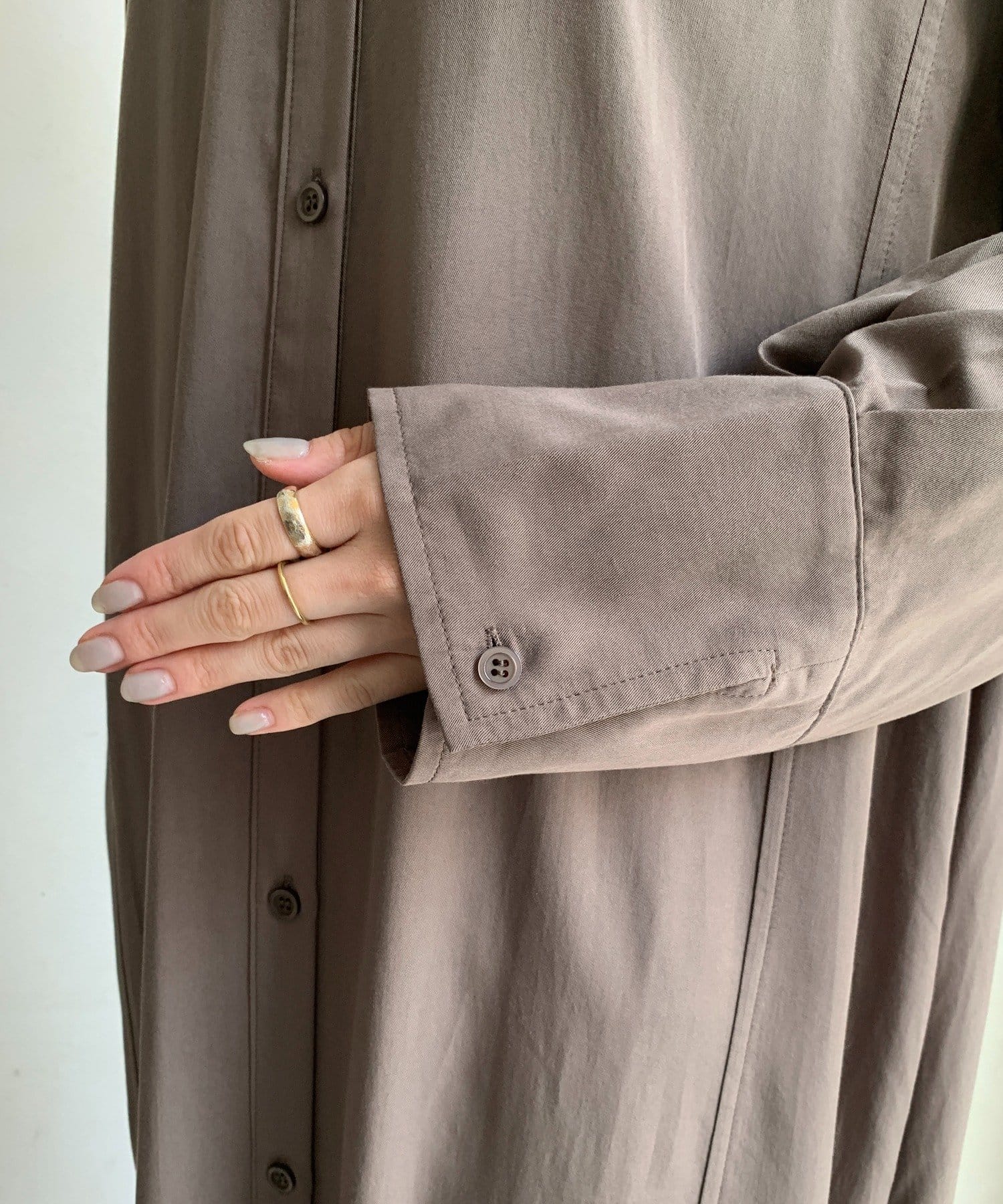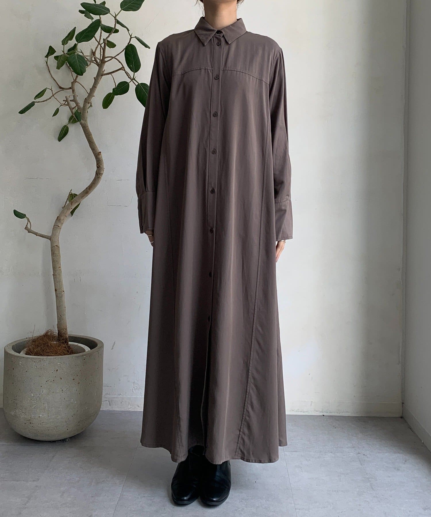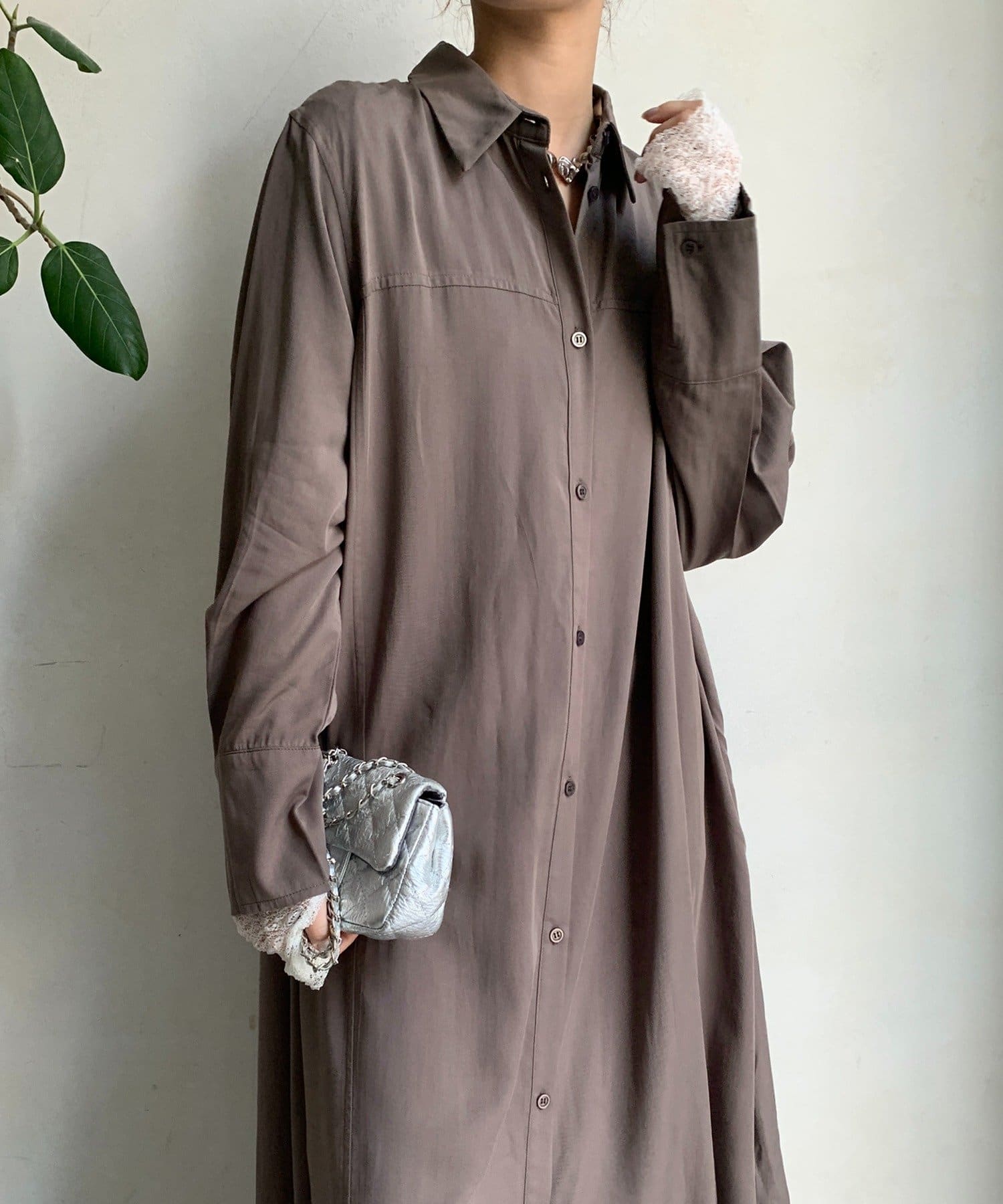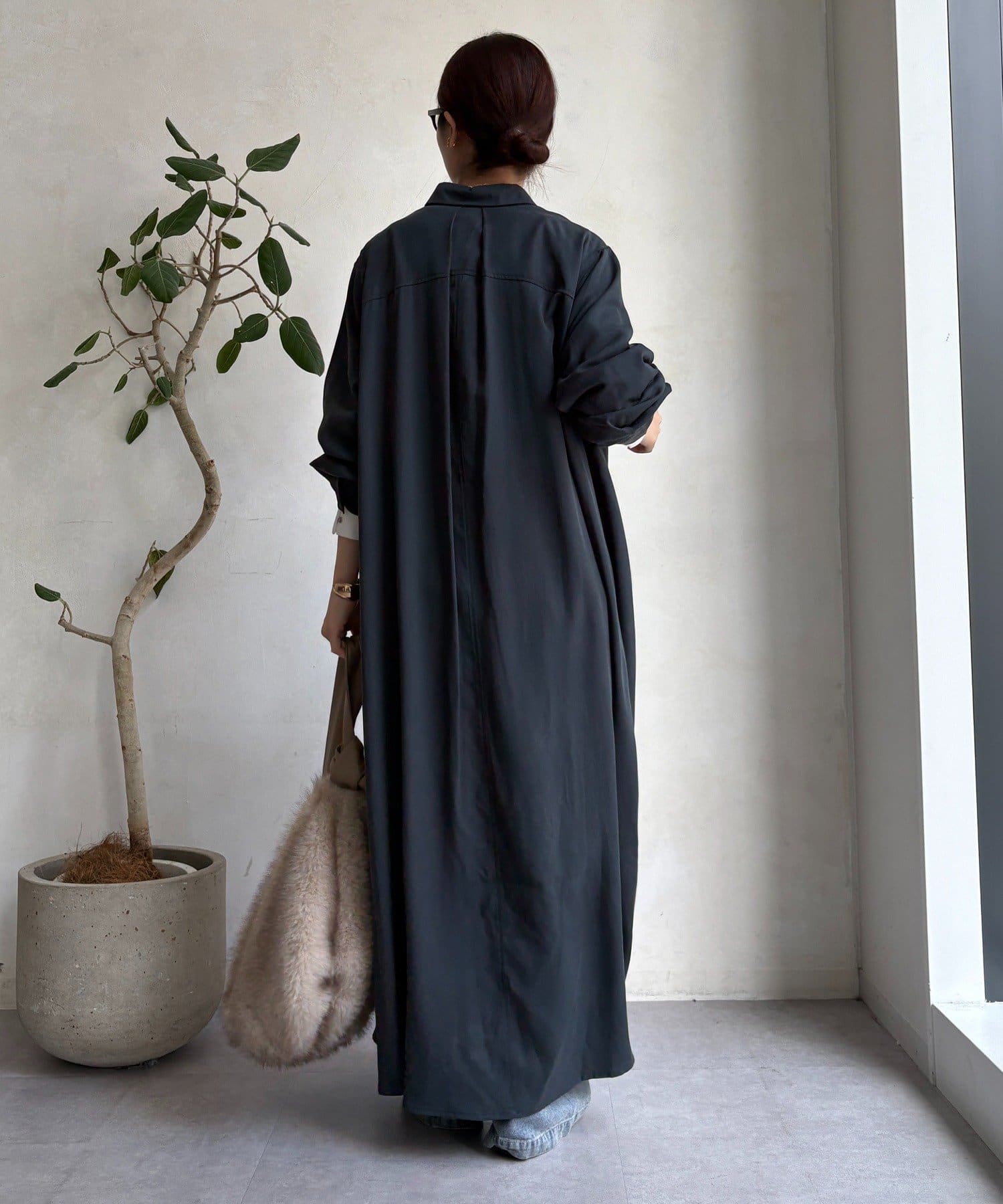 落ち感ある素材で仕上げたロングシャツワンピース。