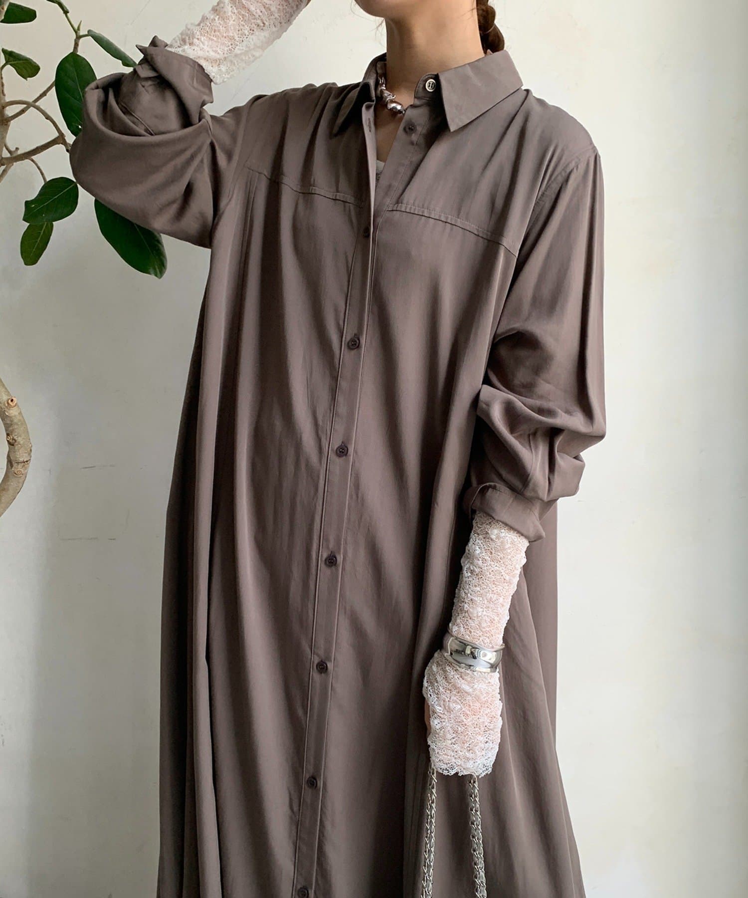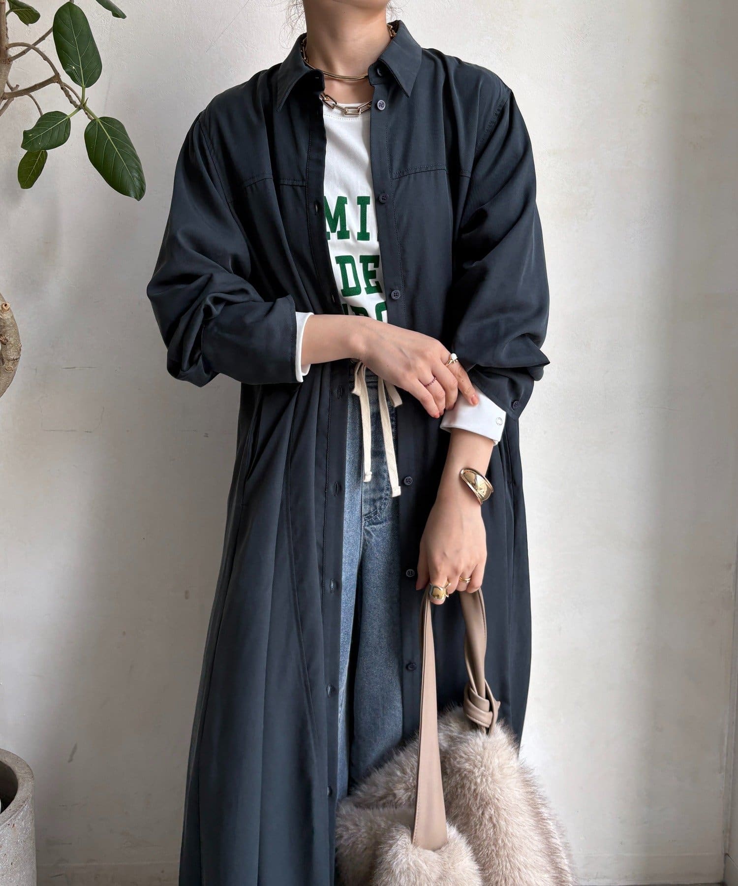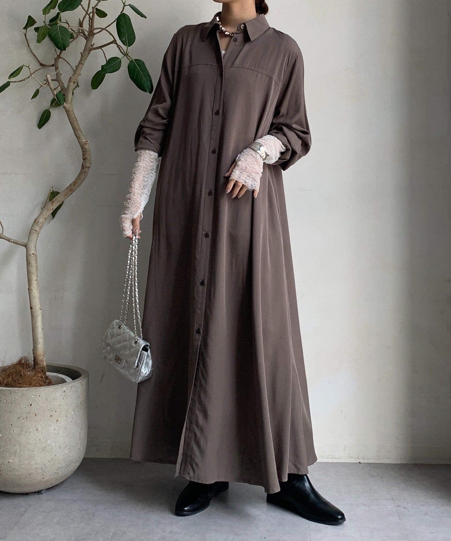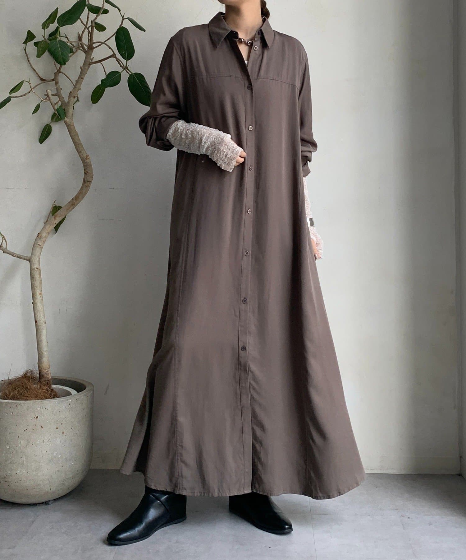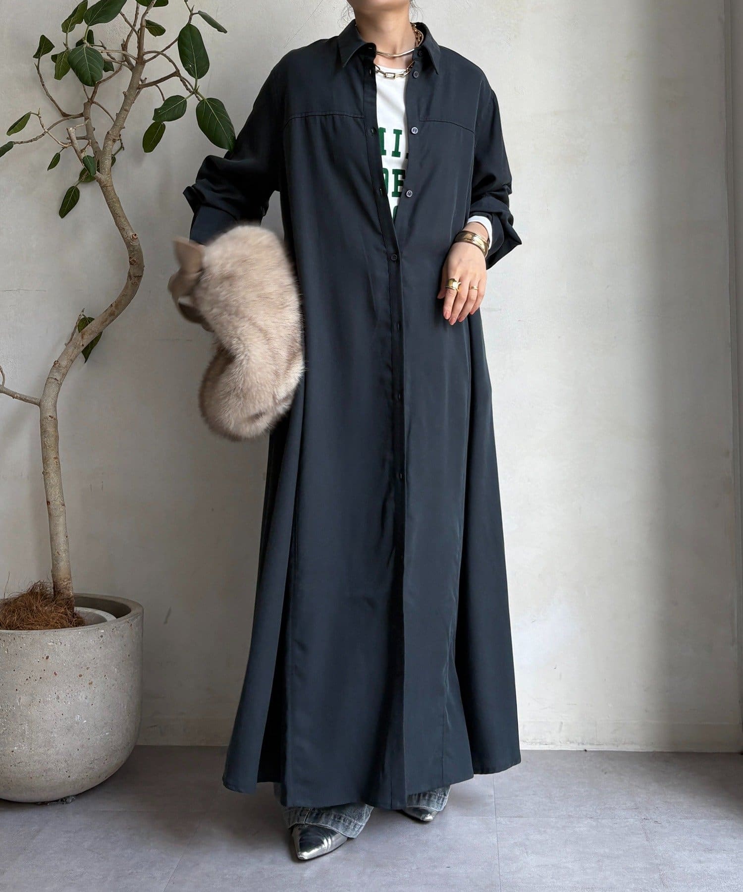 落ち感ある素材で仕上げたロングシャツワンピース。