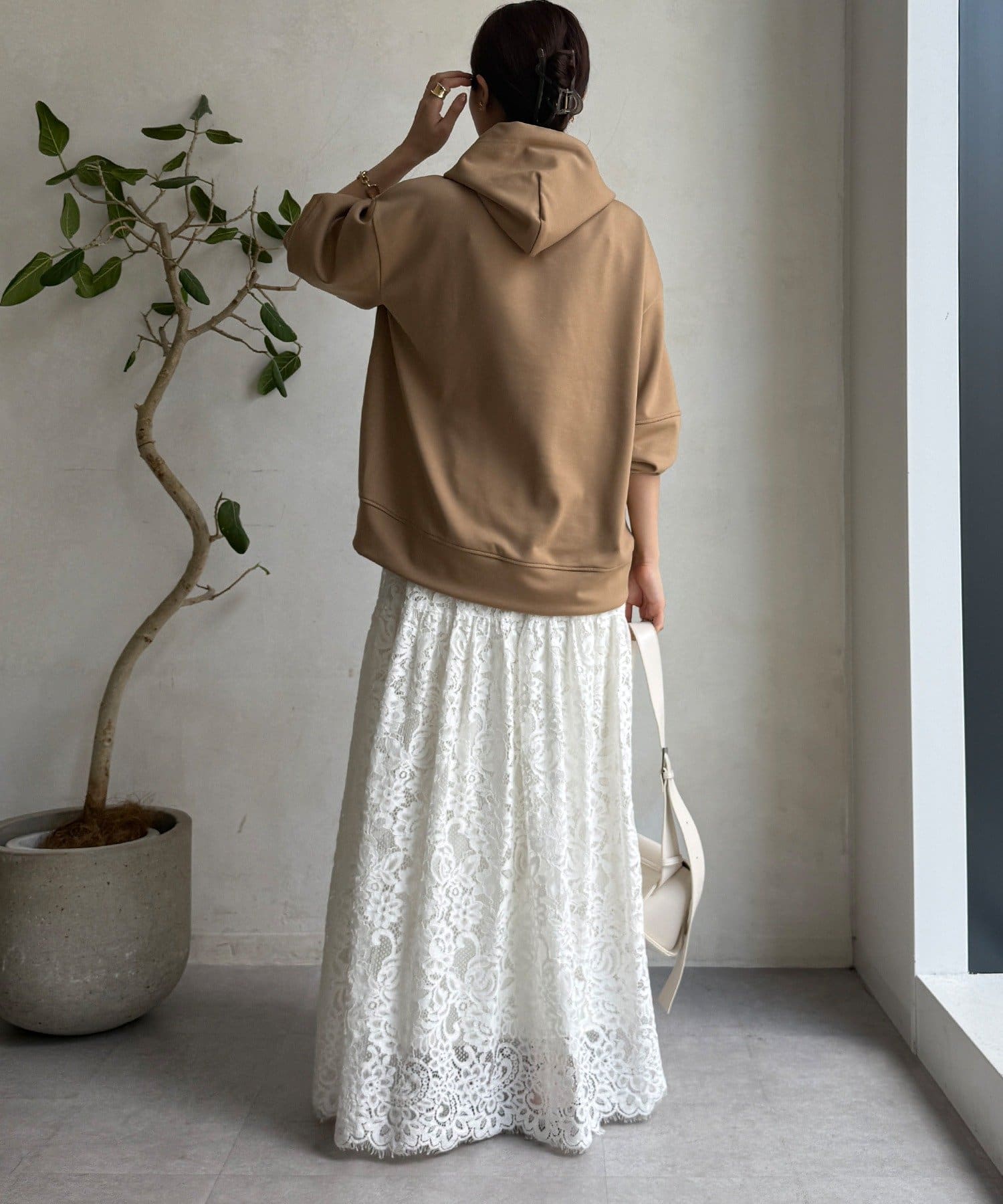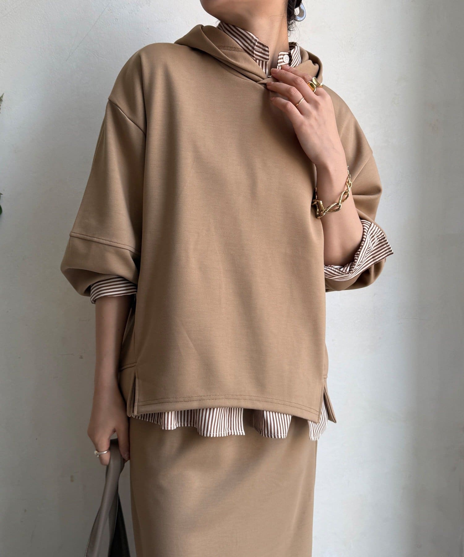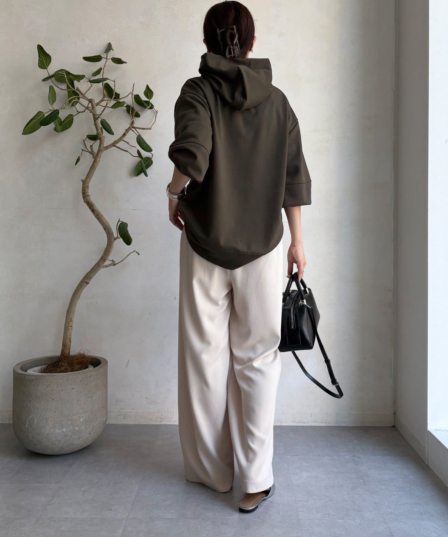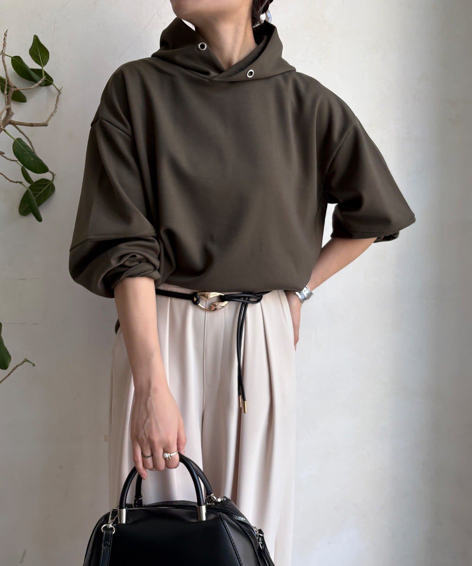 トップスは、大人の女性にも似合うカジュアルな印象のフーディーで、