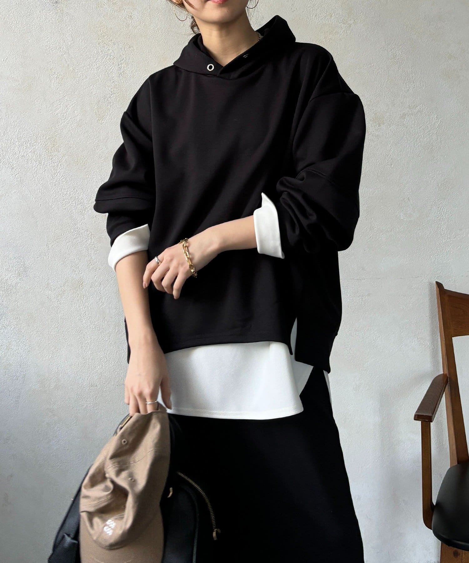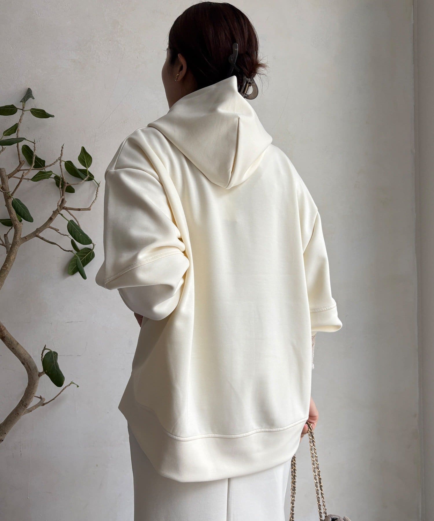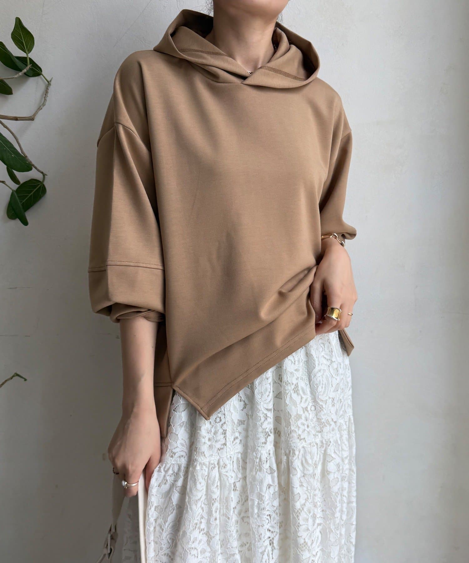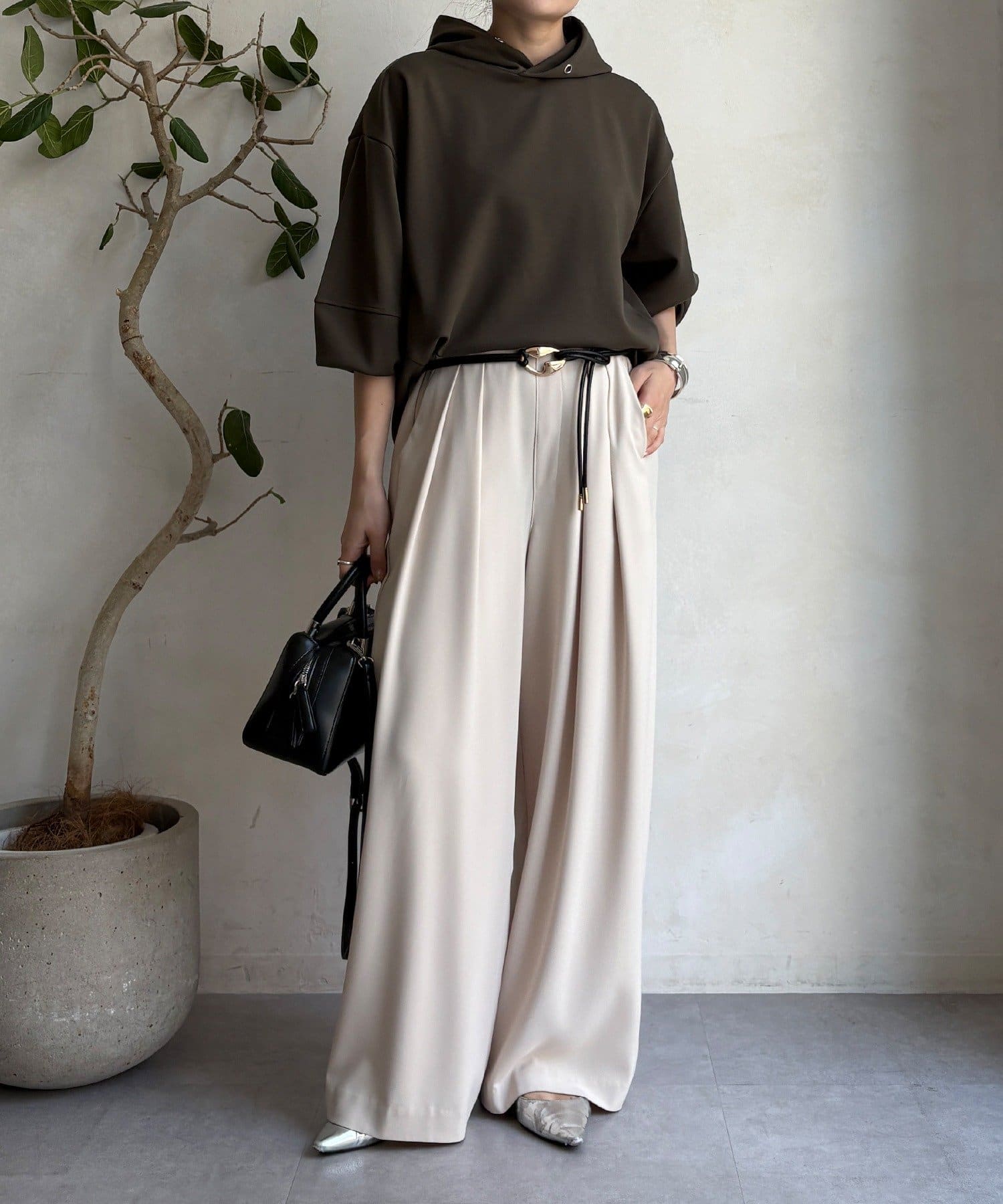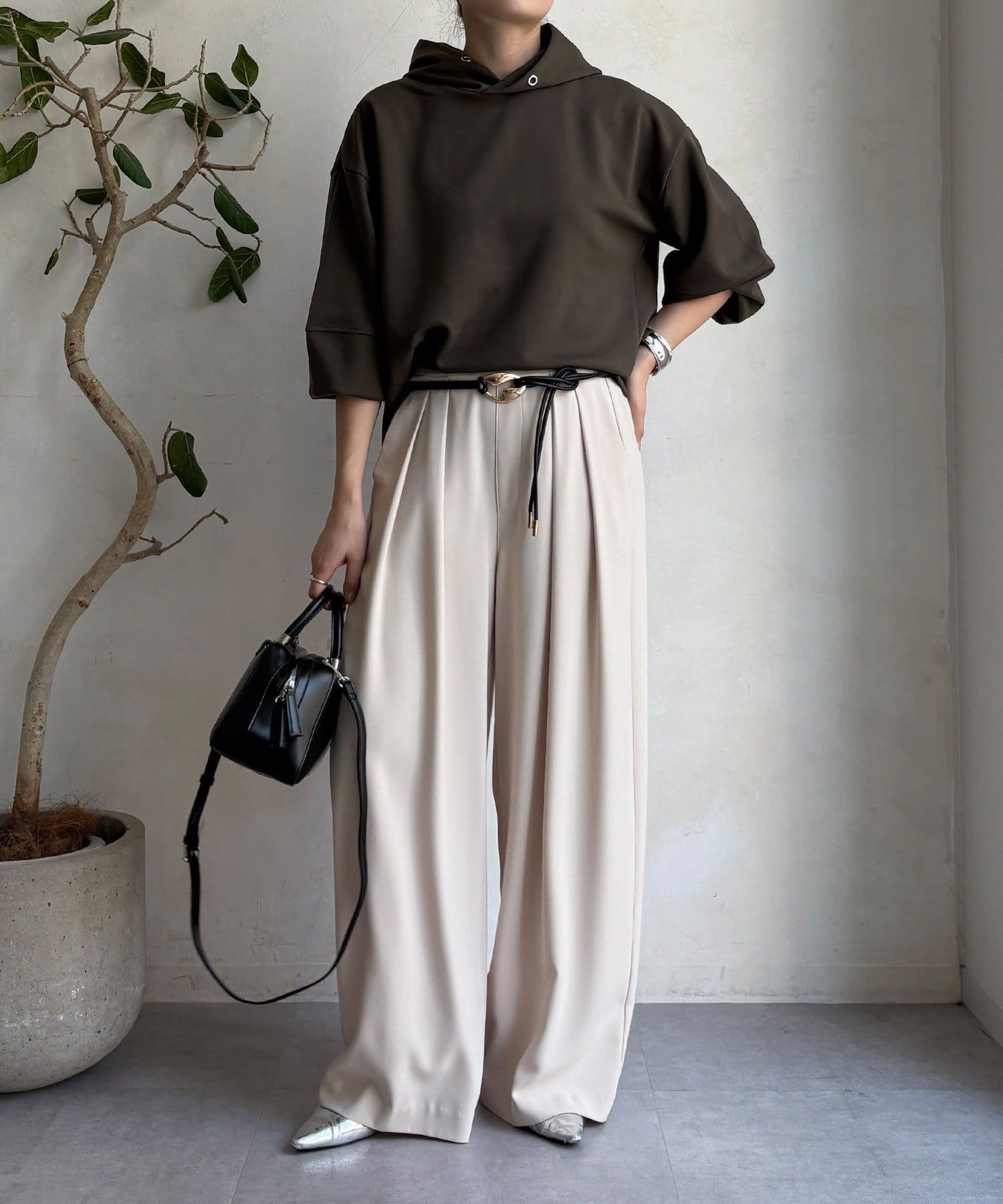 トップスは、大人の女性にも似合うカジュアルな印象のフーディーで、