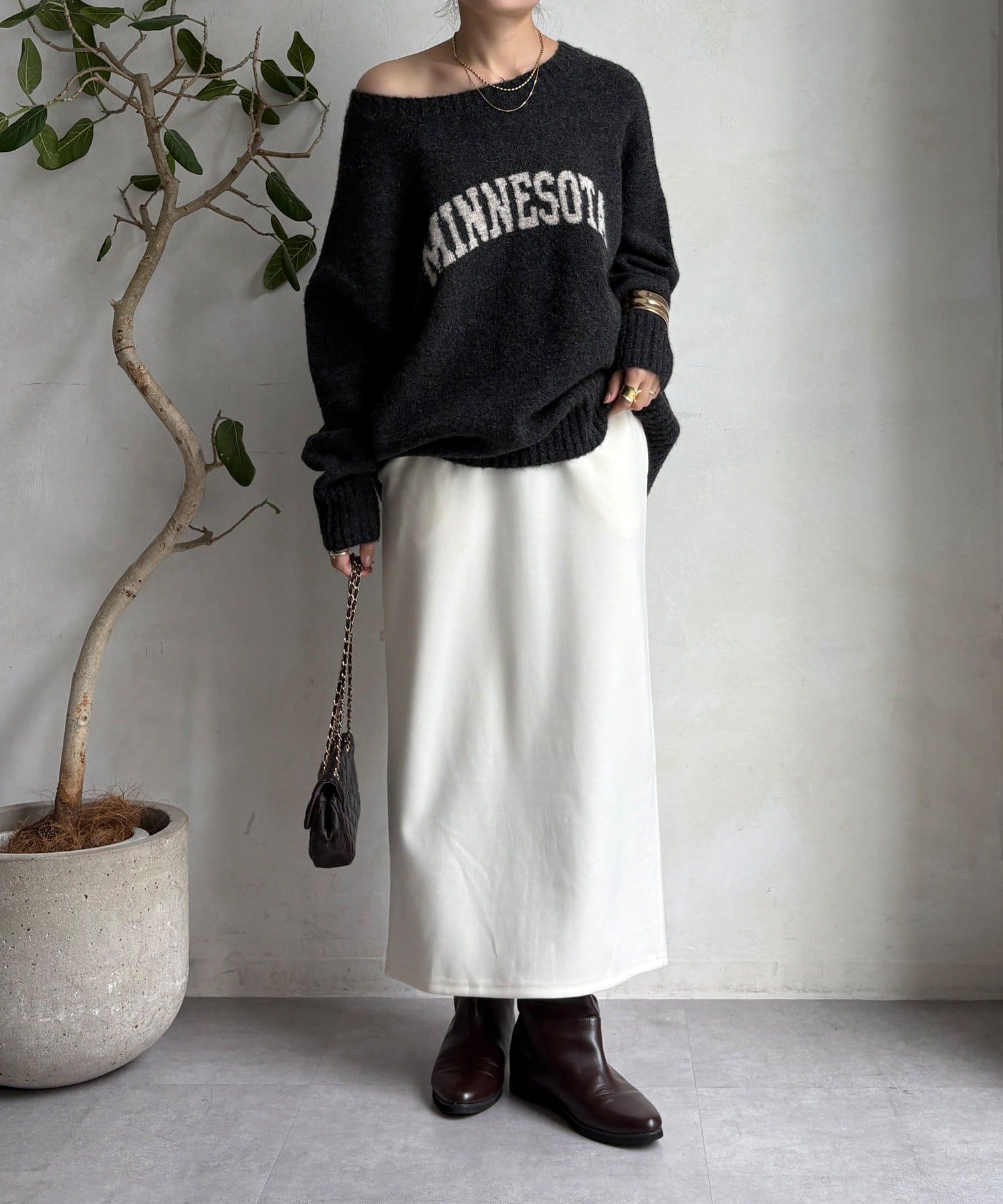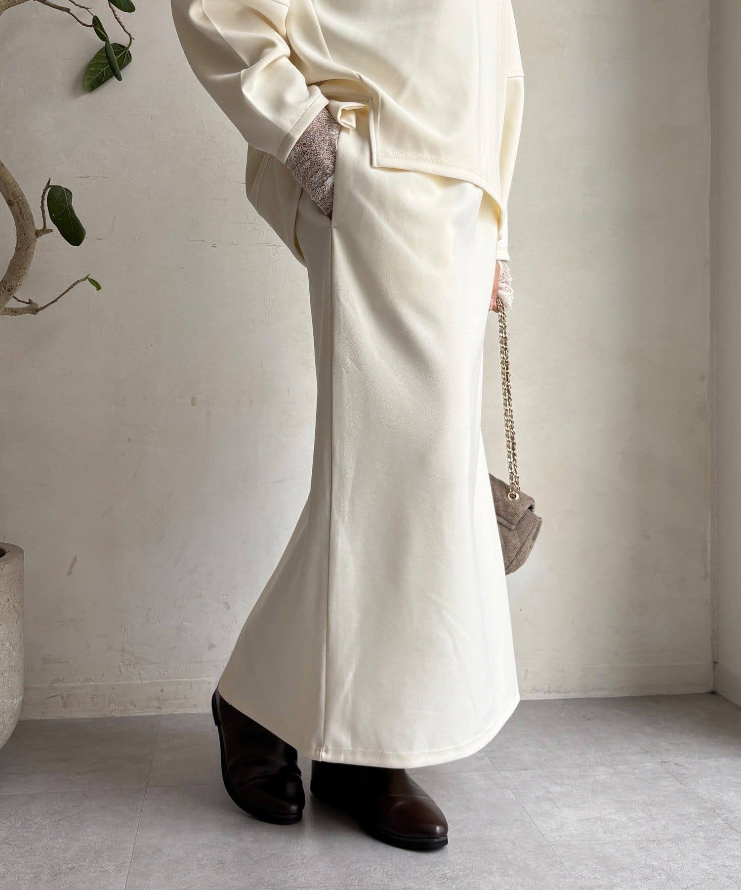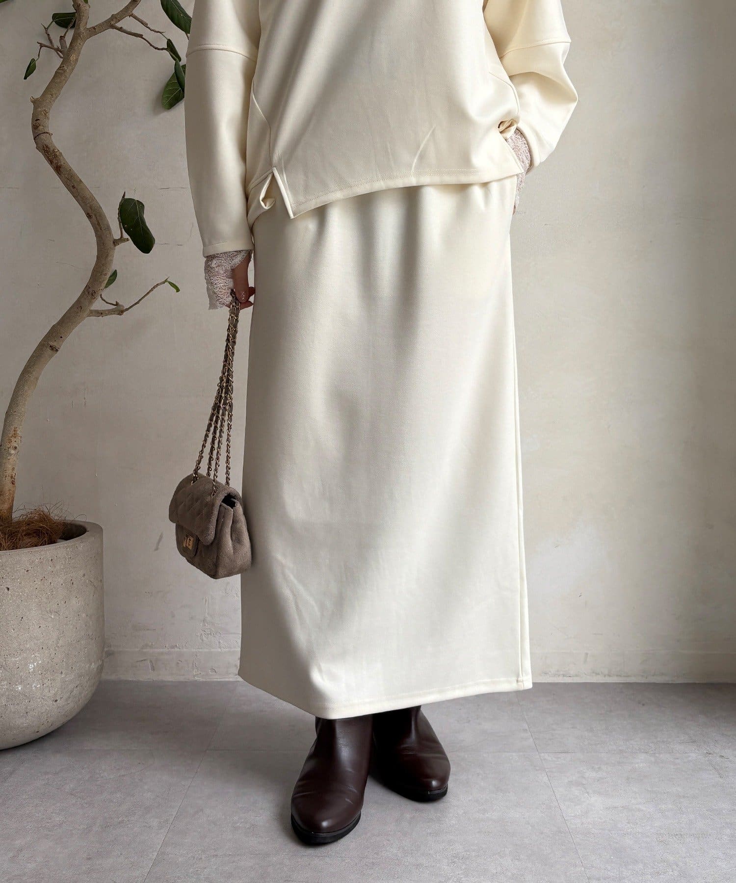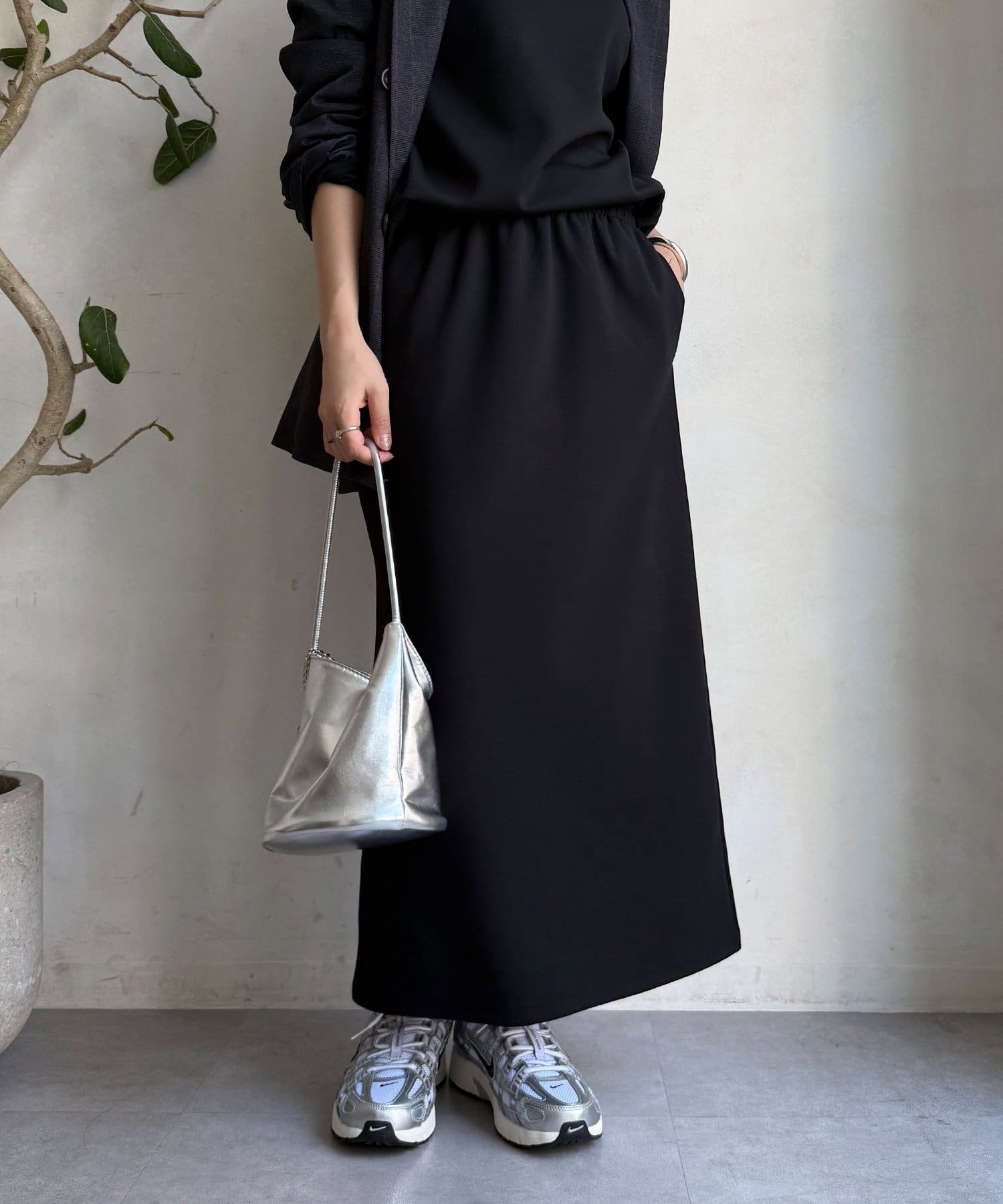 ボトムスは、すとんと落ちるIラインシルエットが美しいロングスカート。