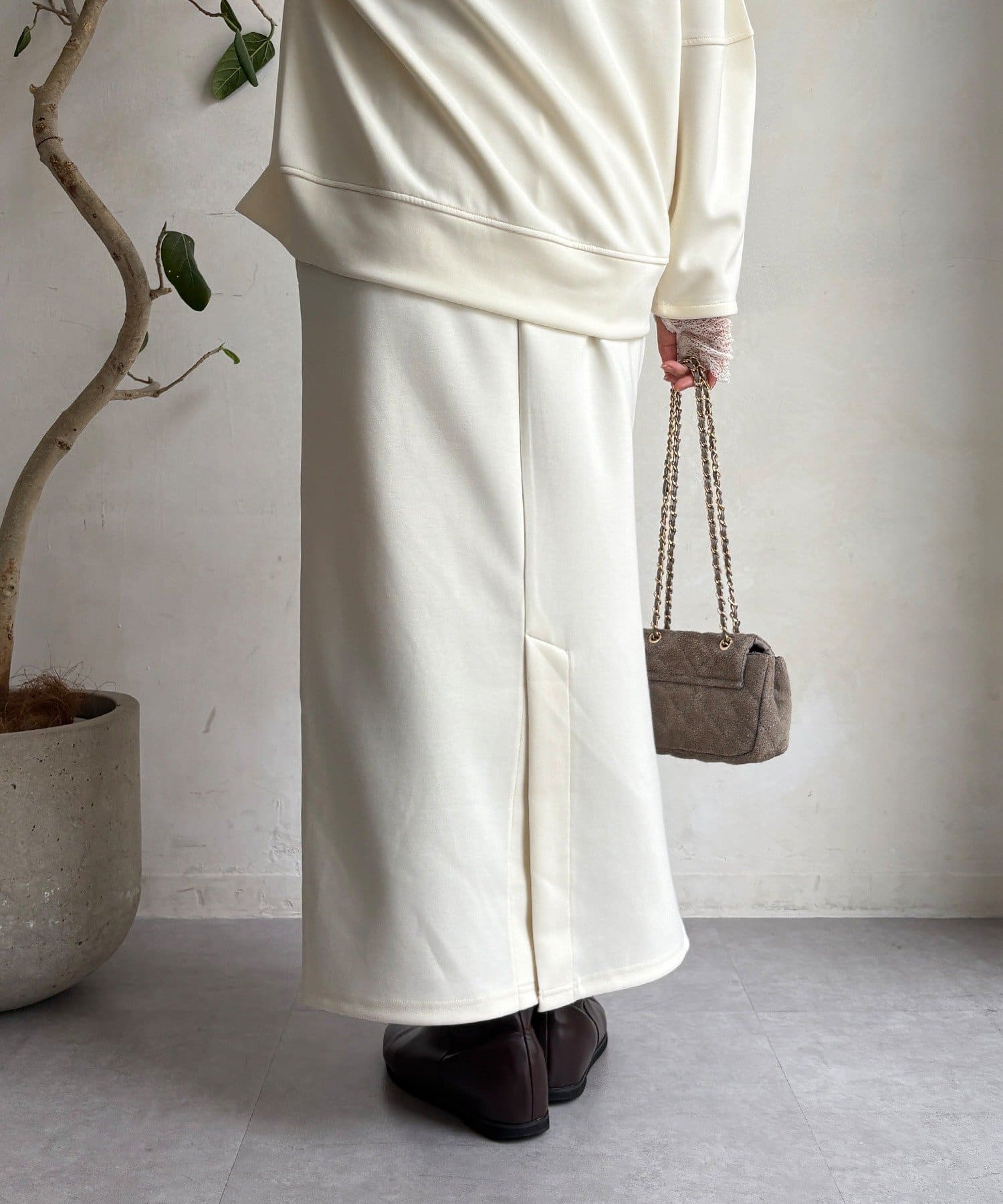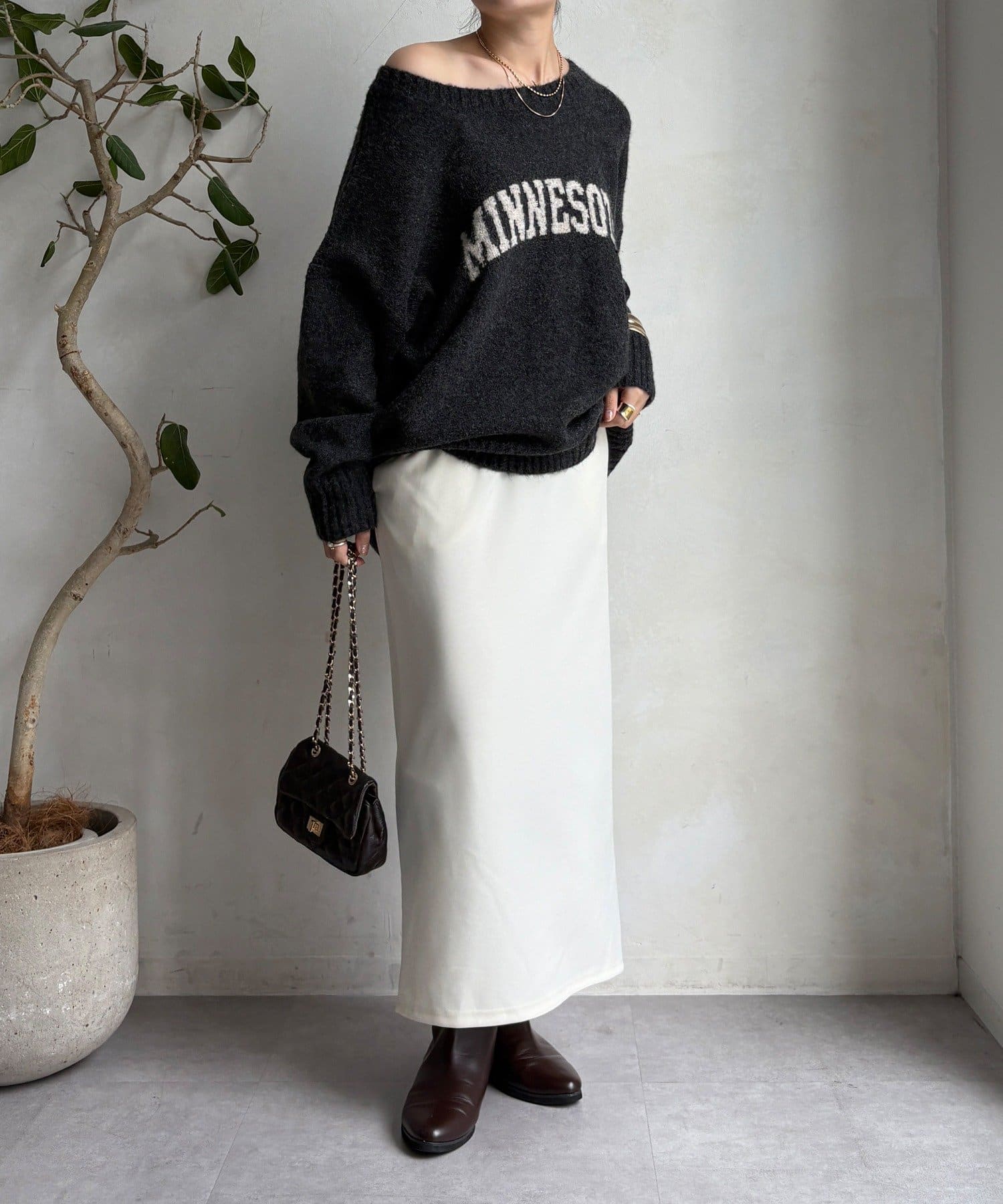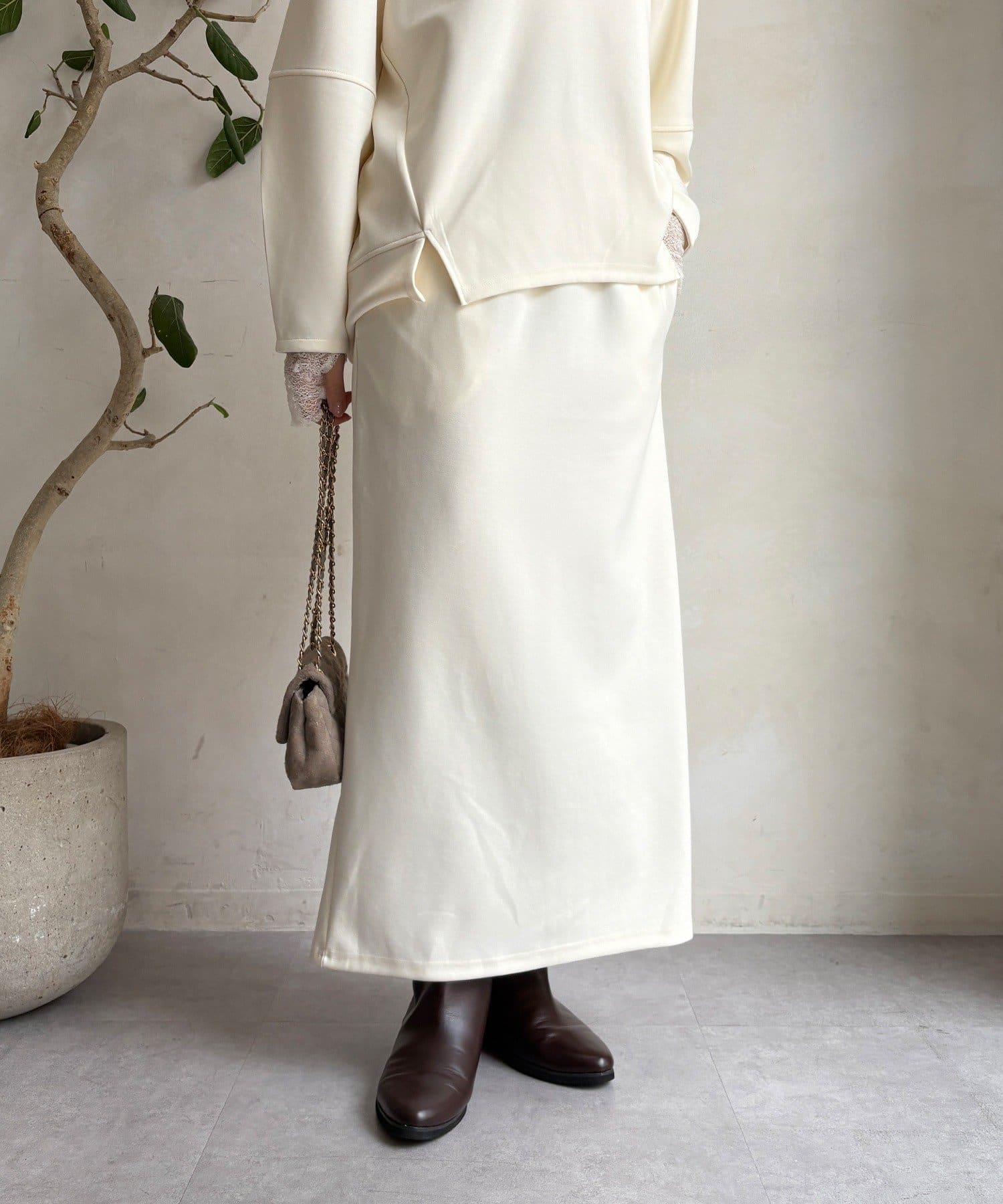 ボトムスは、すとんと落ちるIラインシルエットが美しいロングスカート。