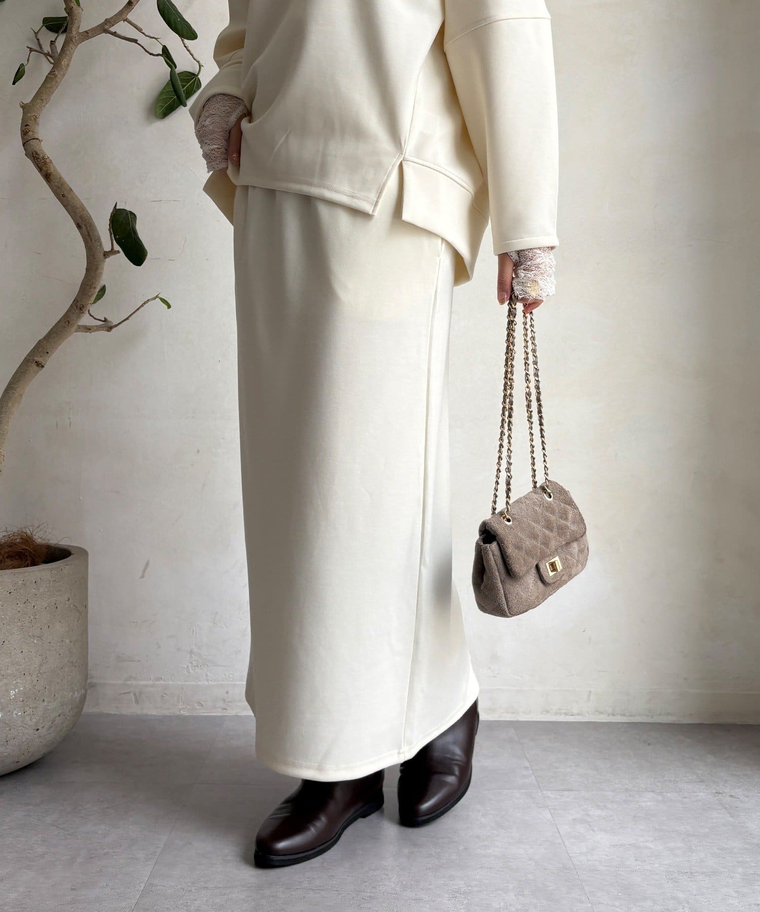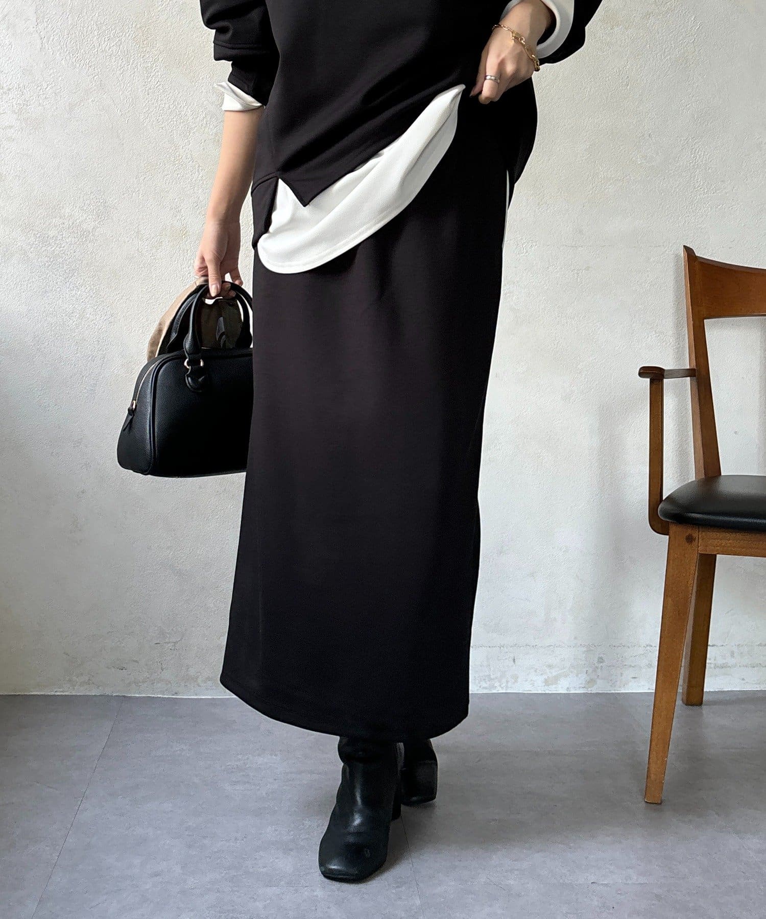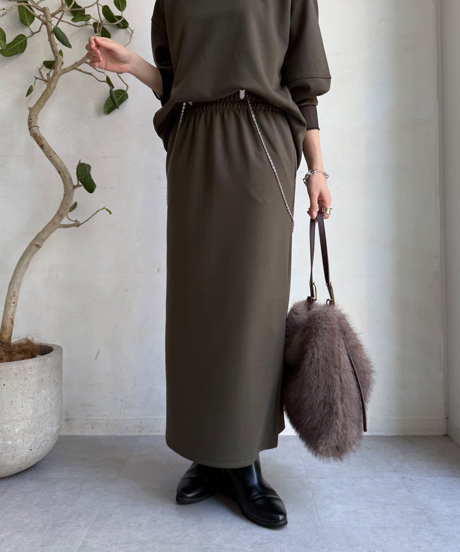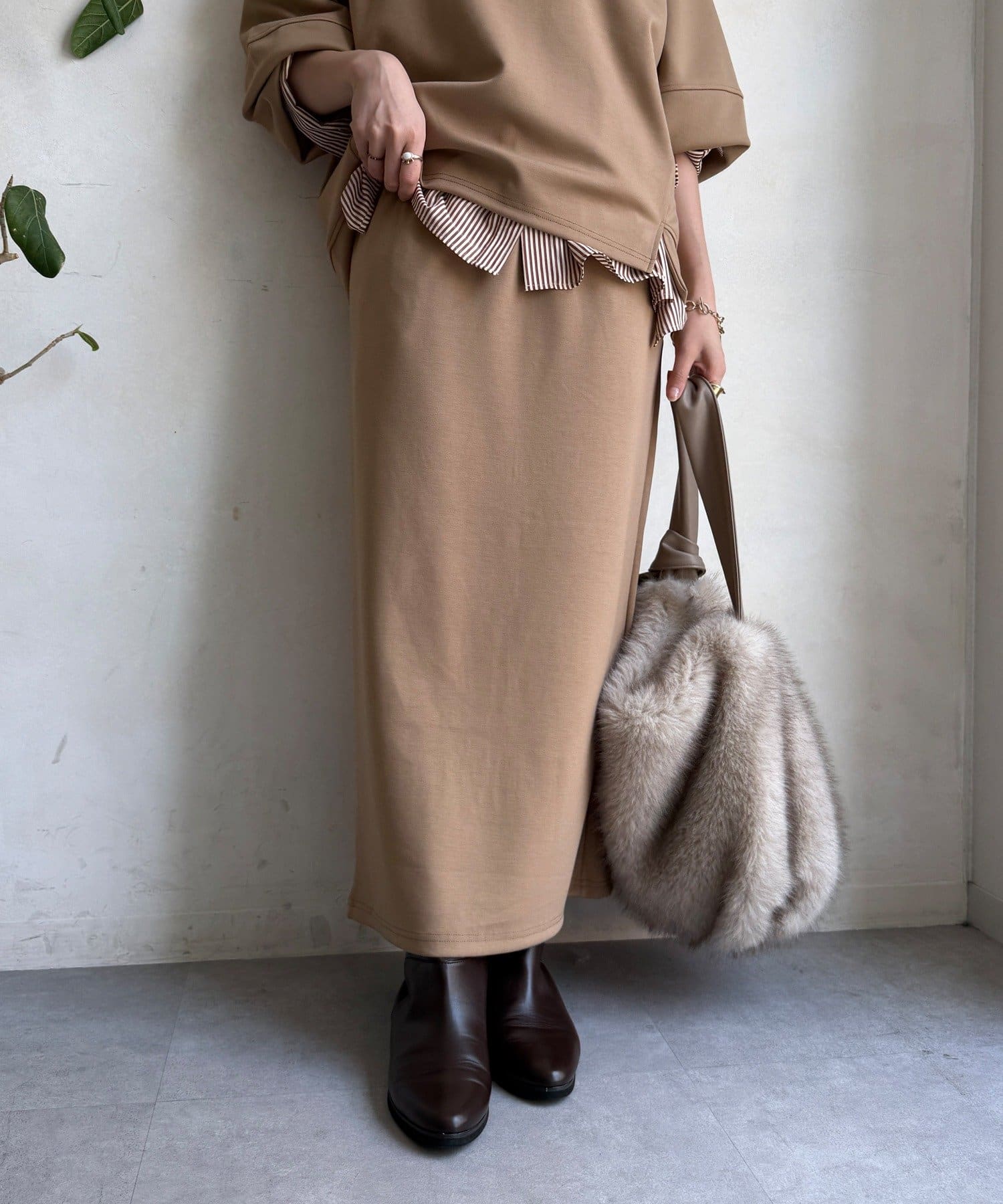 ボトムスは、すとんと落ちるIラインシルエットが美しいロングスカート。