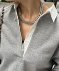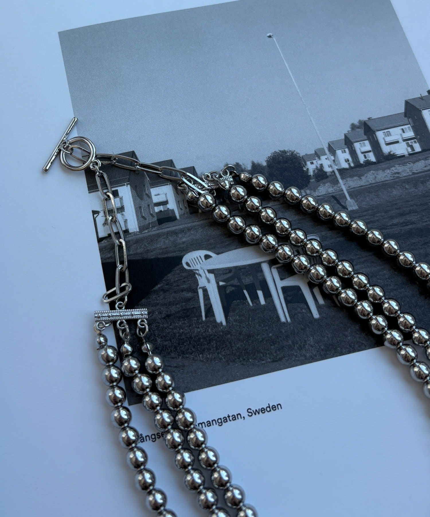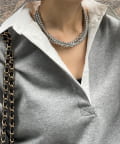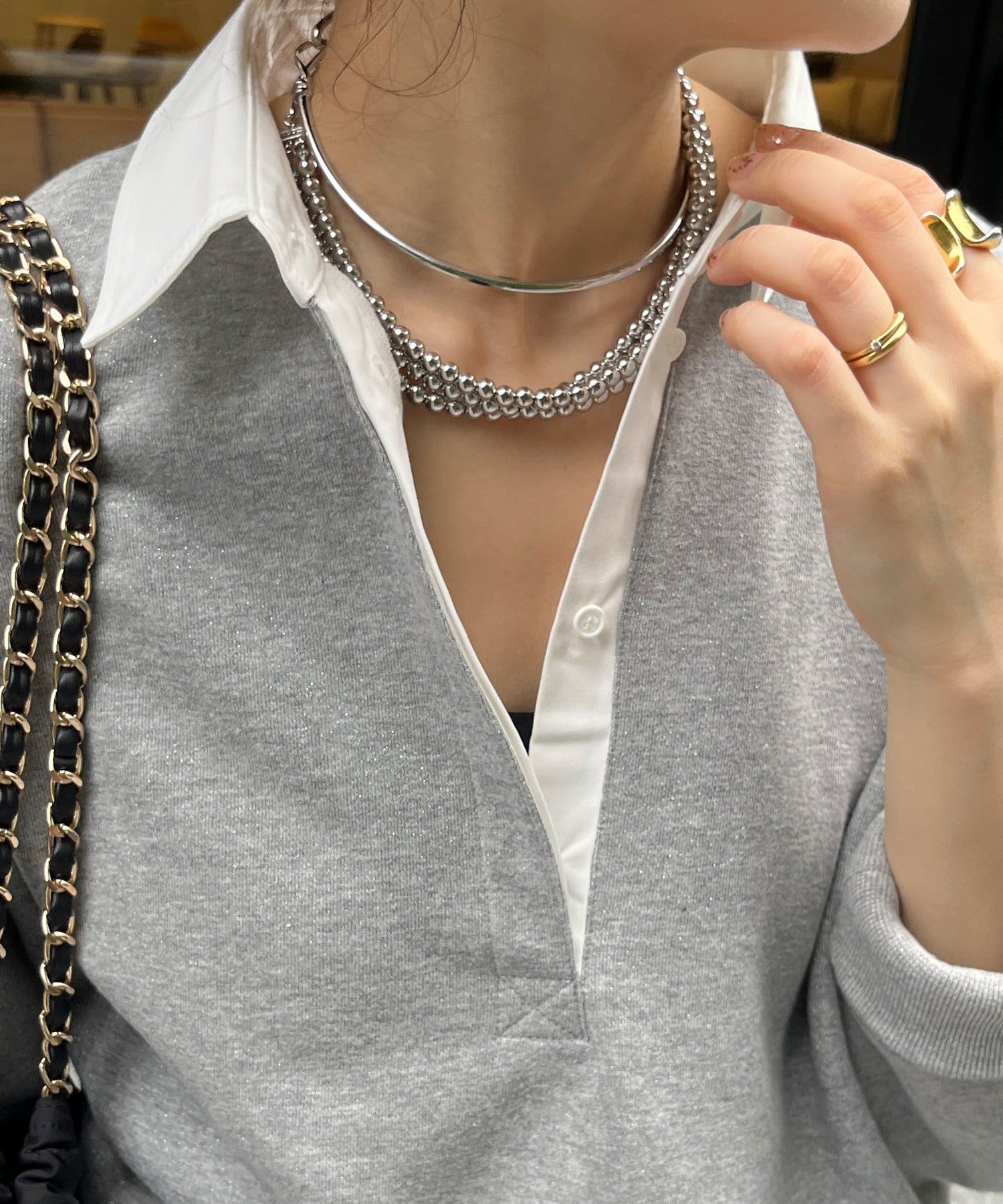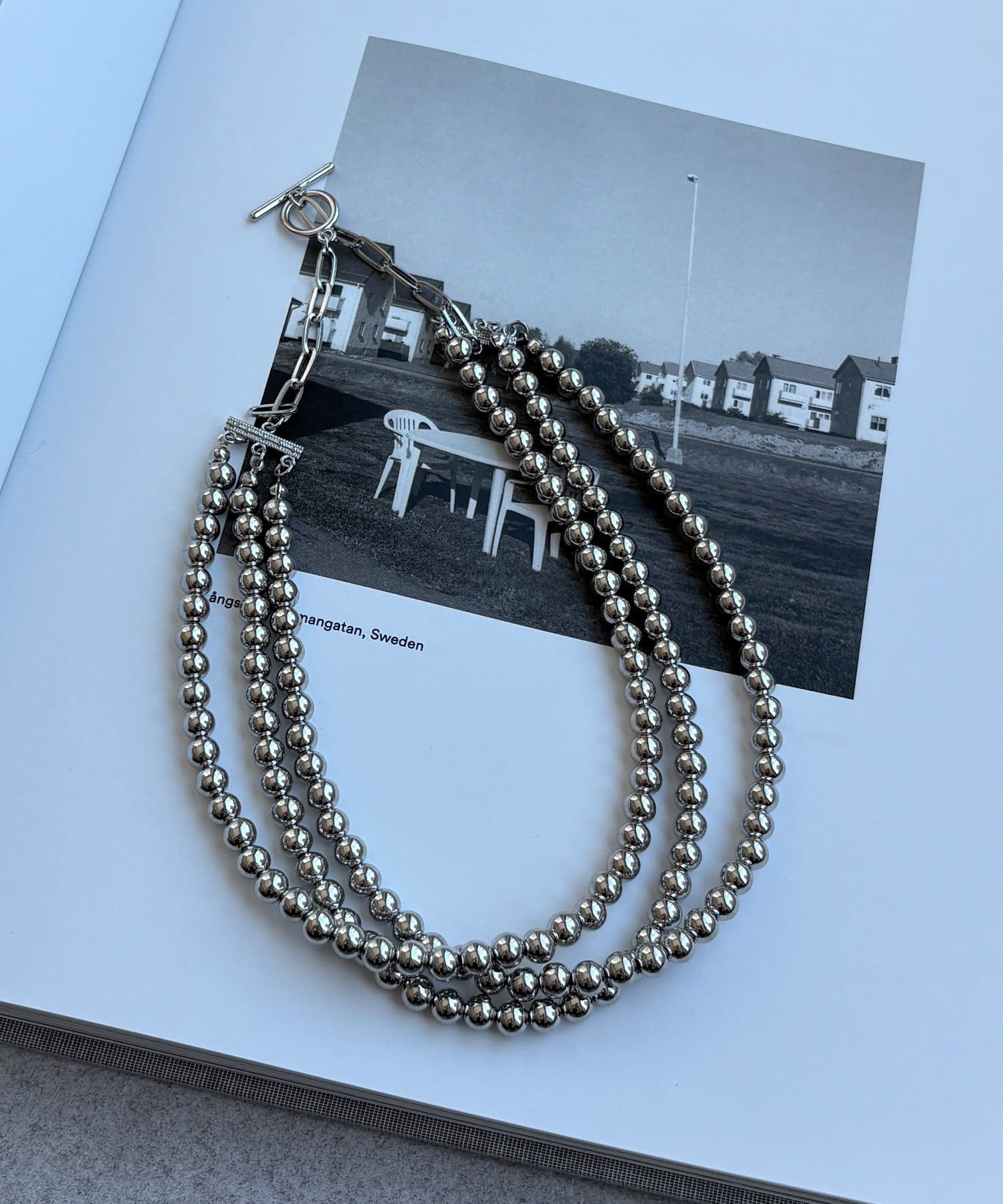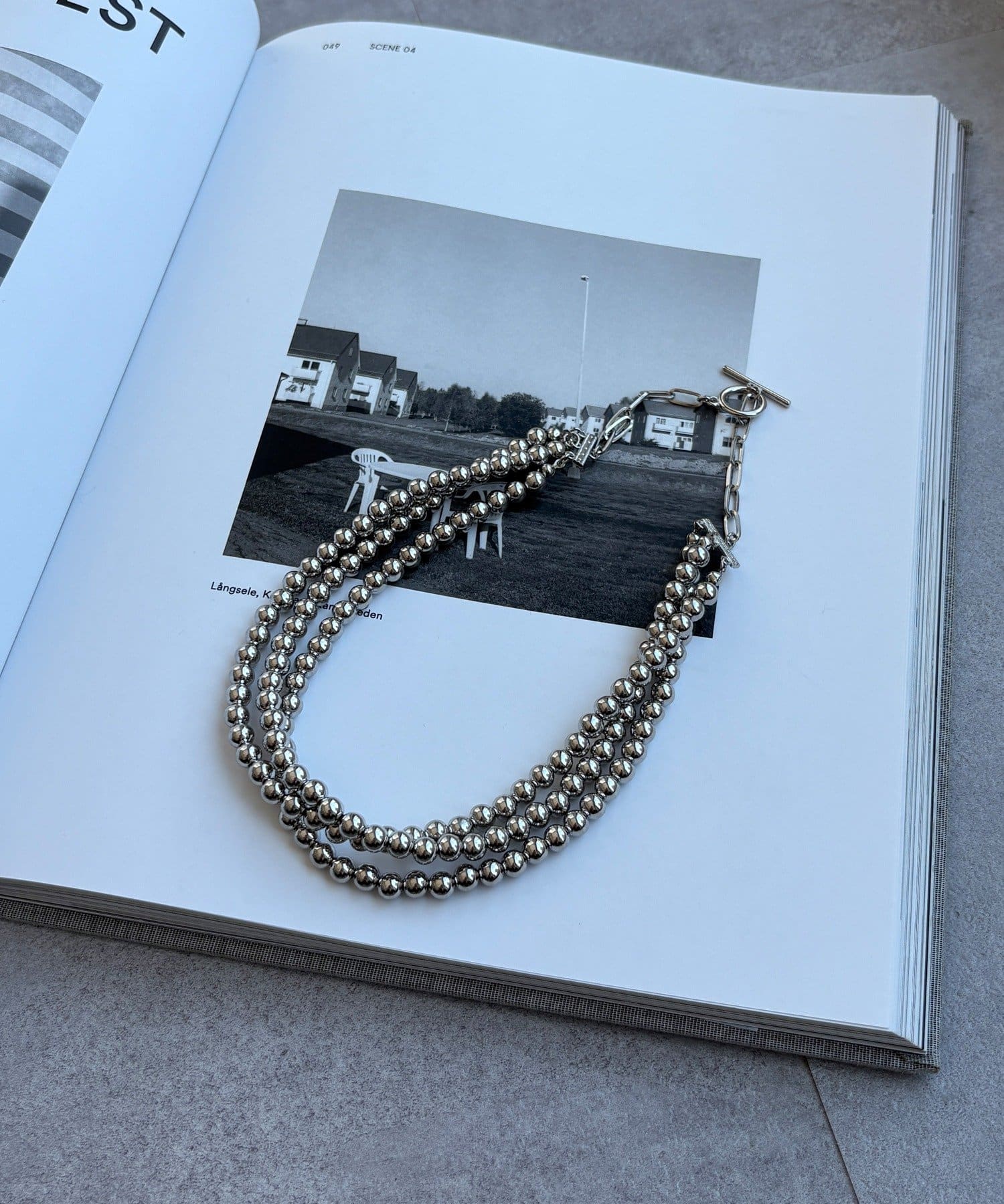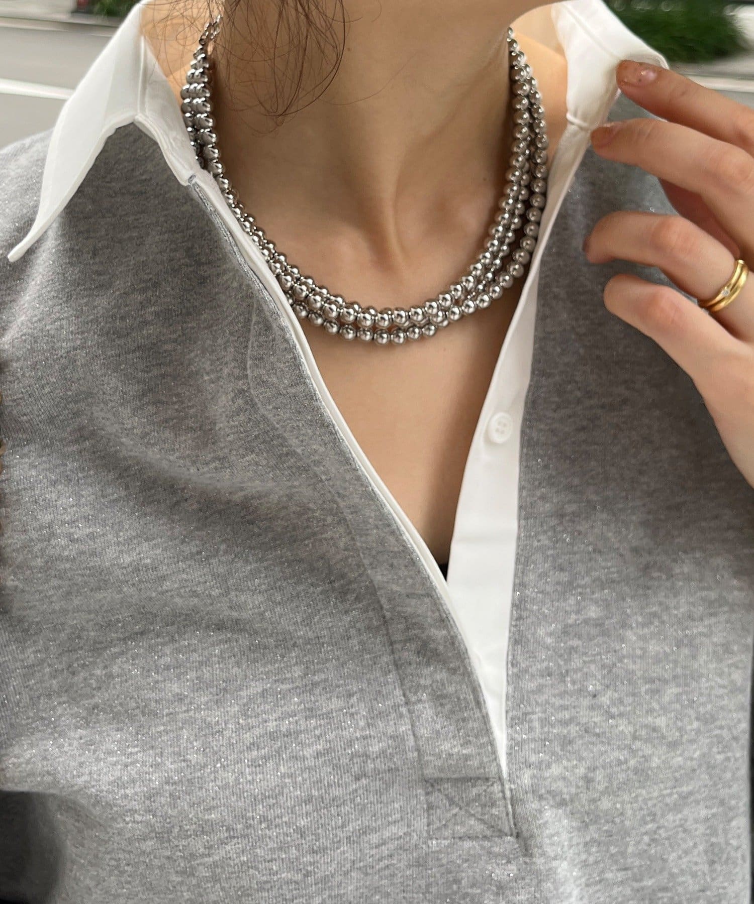 3連のボールチェーンが、首元に確かな存在感を放つネックレス