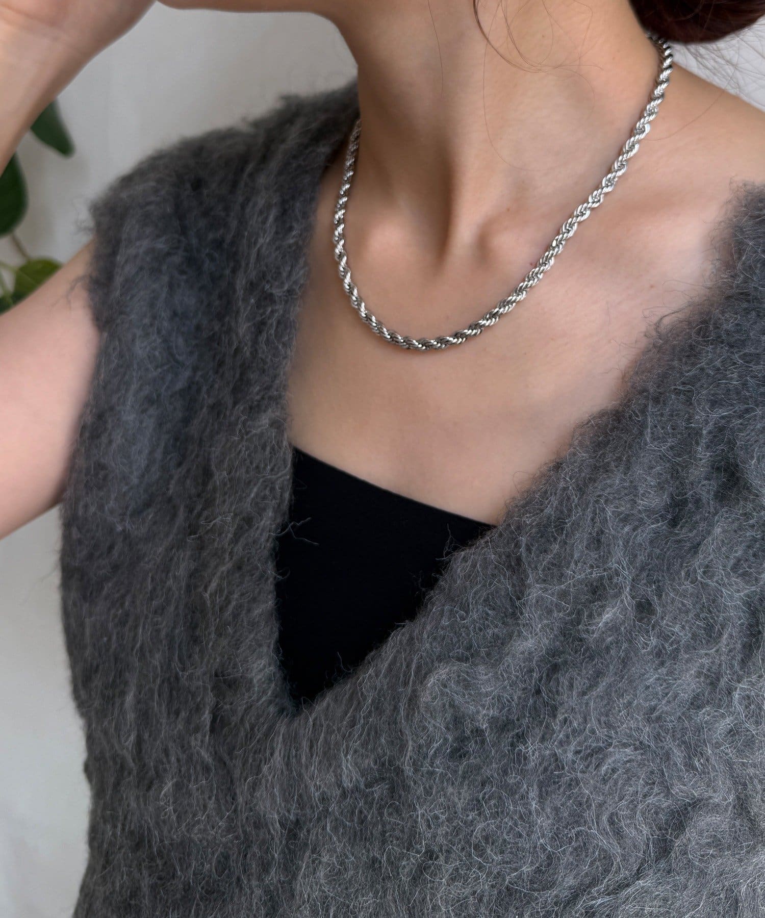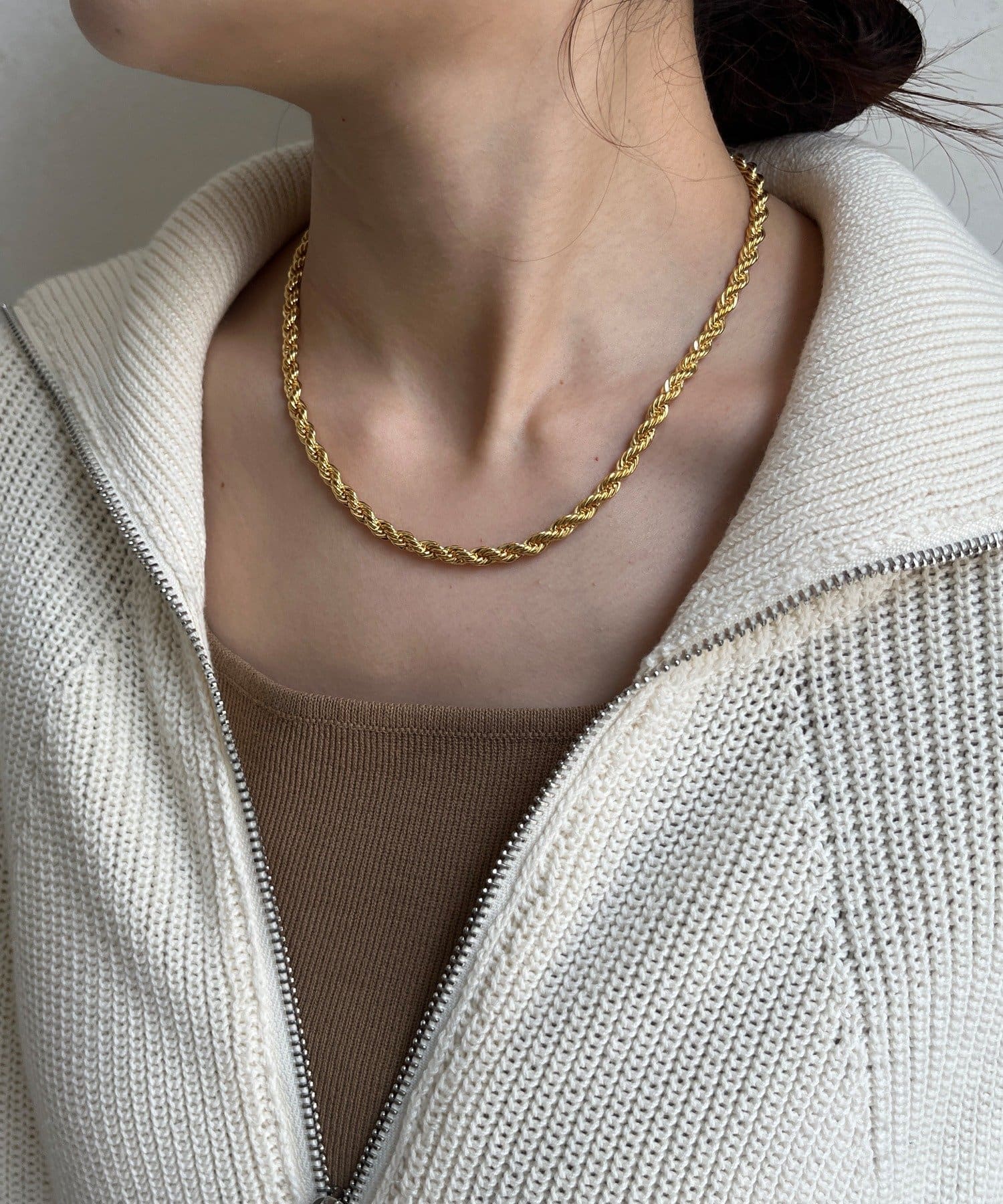 チェーンの輝きが、デコルテを美しく見せてくれます。