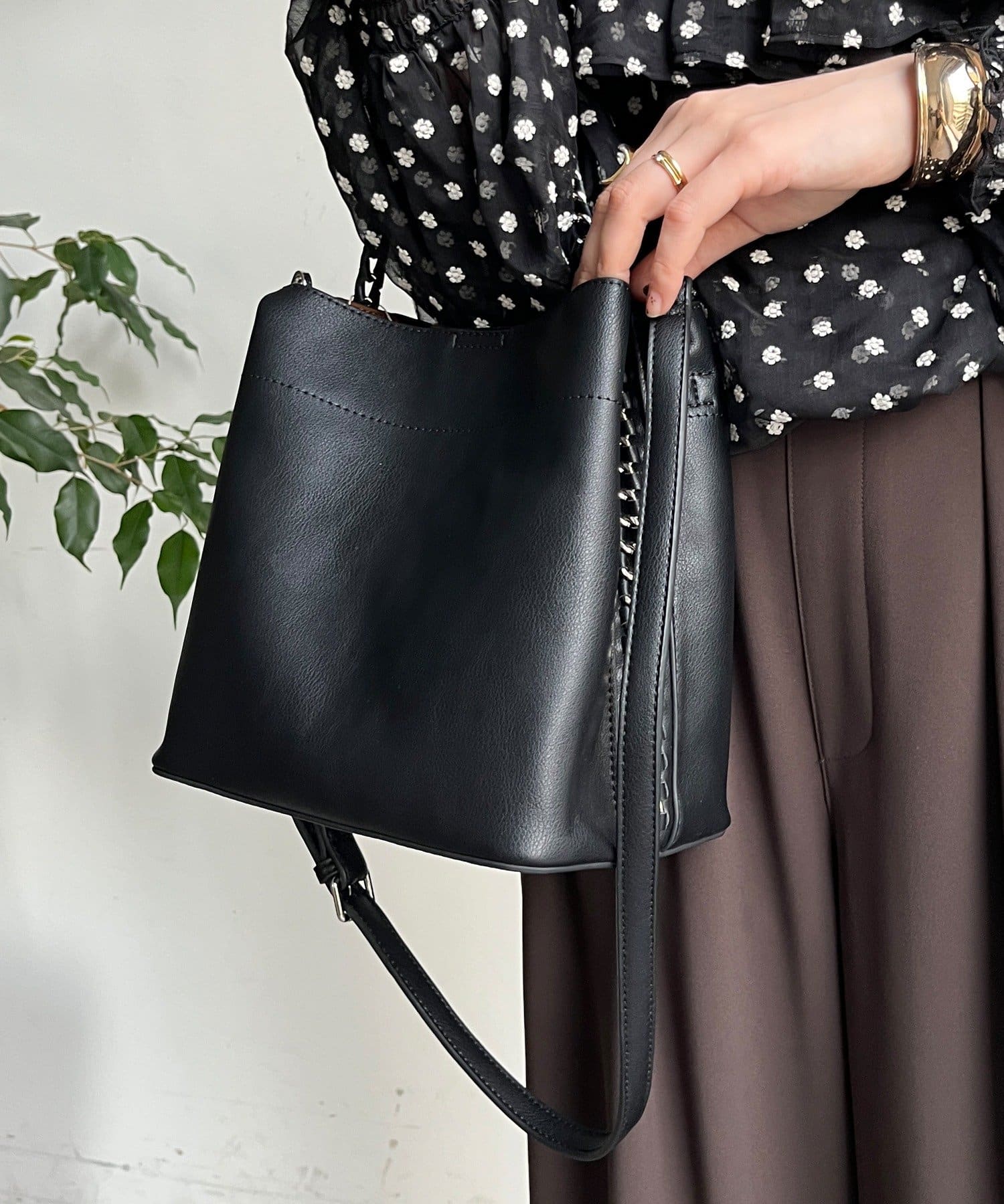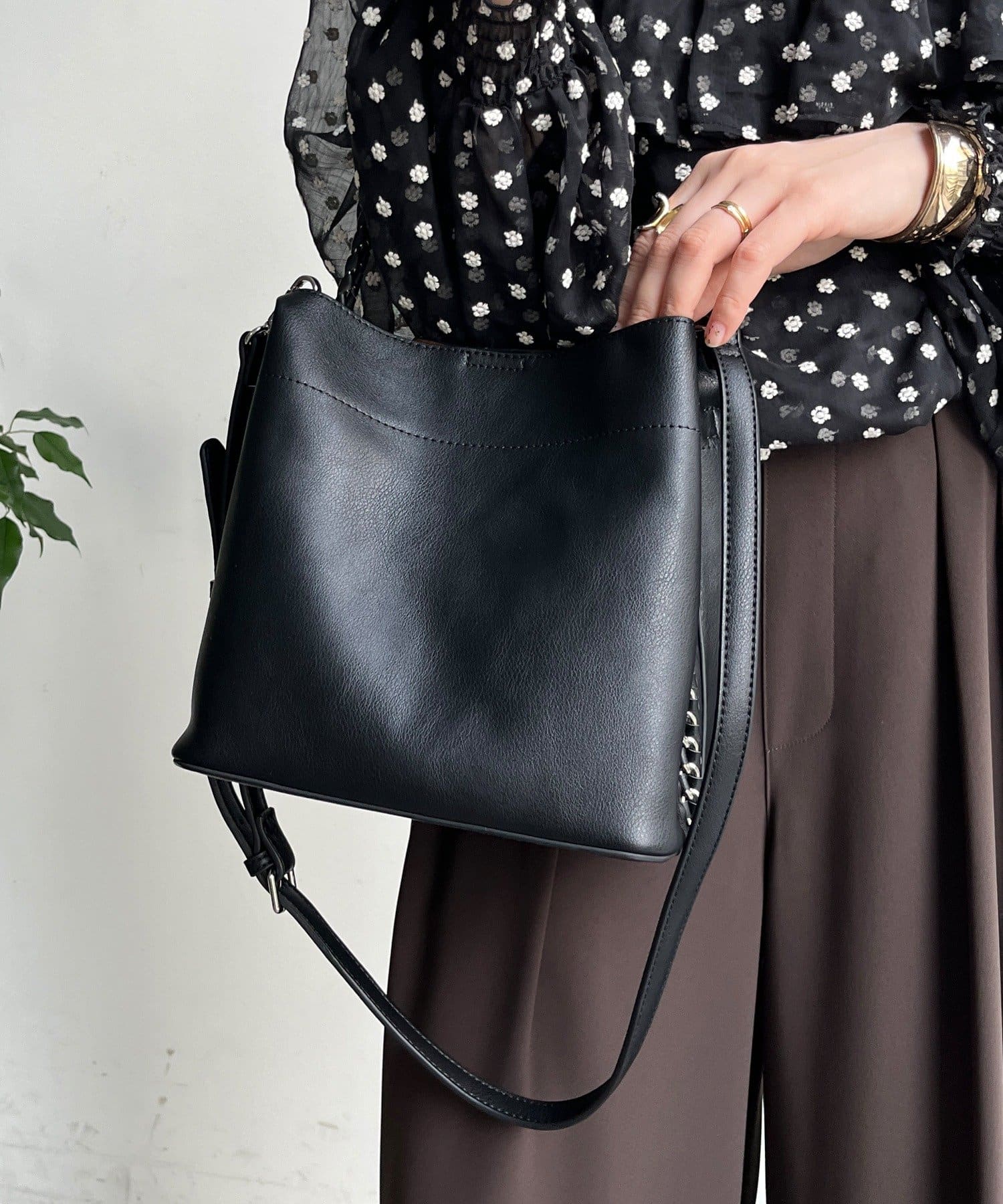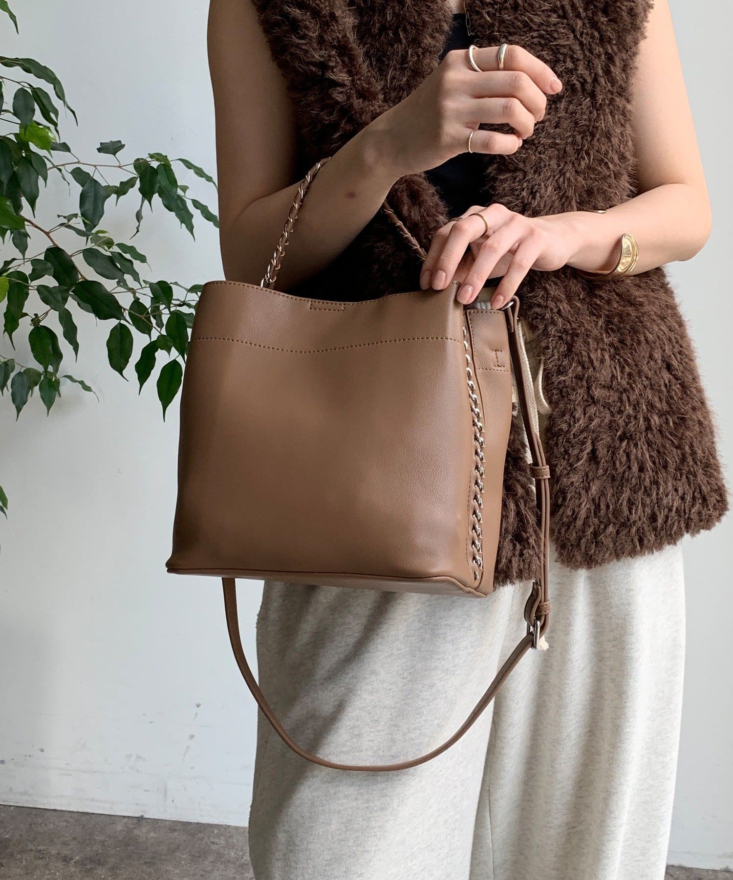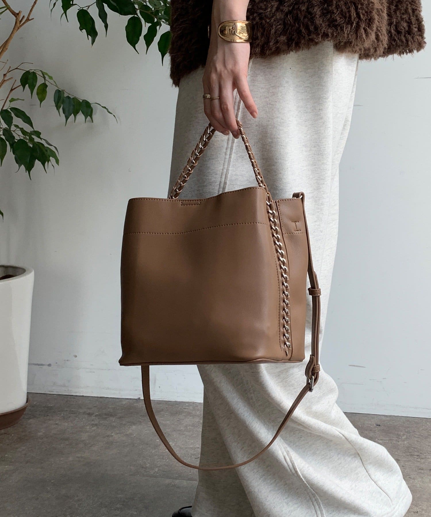 サイドのかがりチェーンがデザインポイントの2wayトートバッグ。