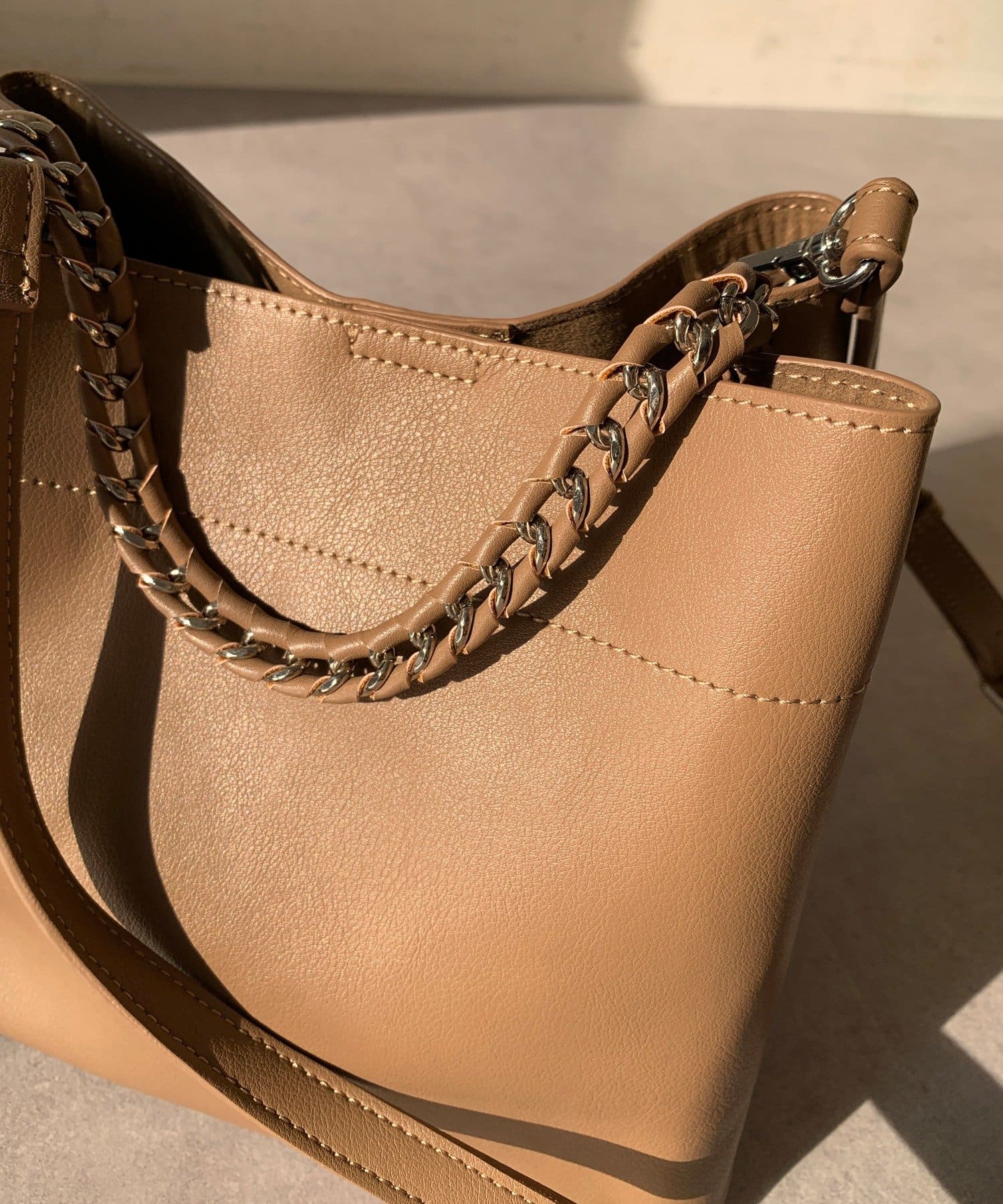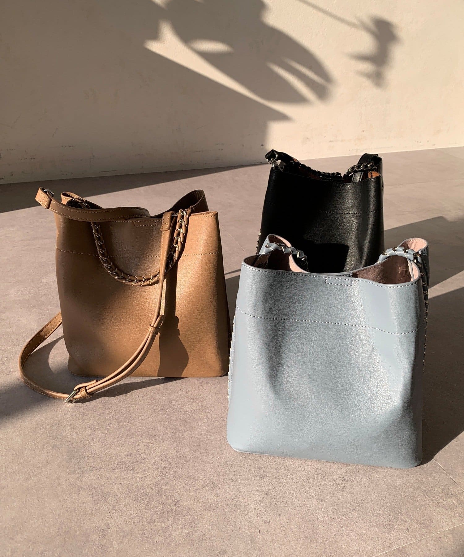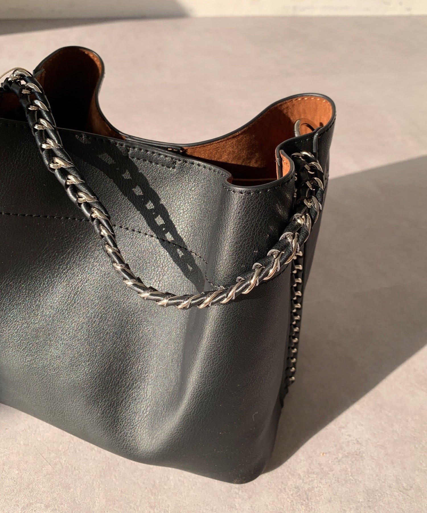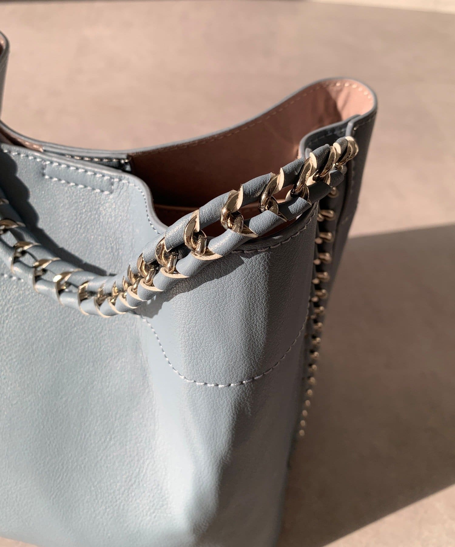 サイドのかがりチェーンがデザインポイントの2wayトートバッグ。