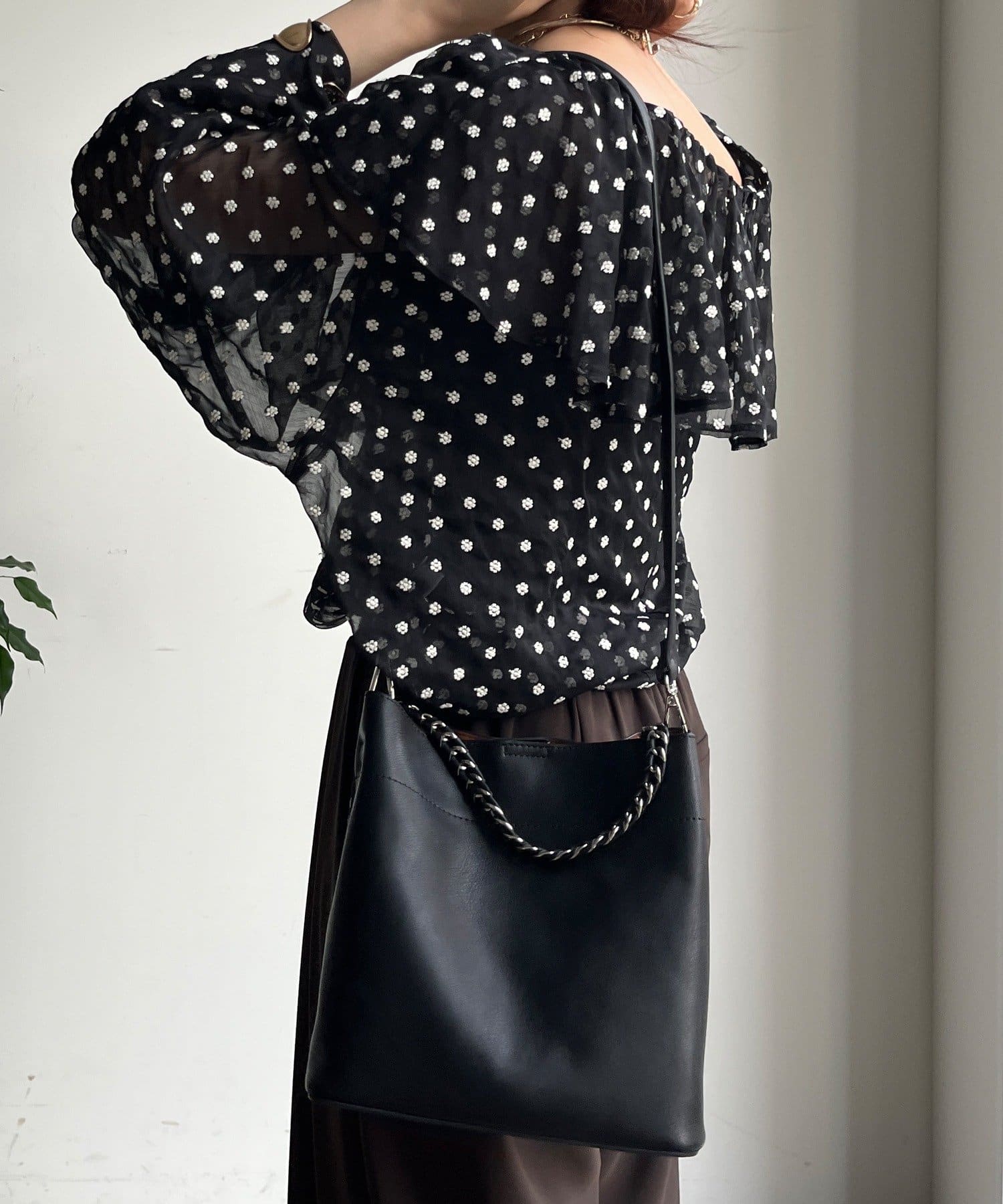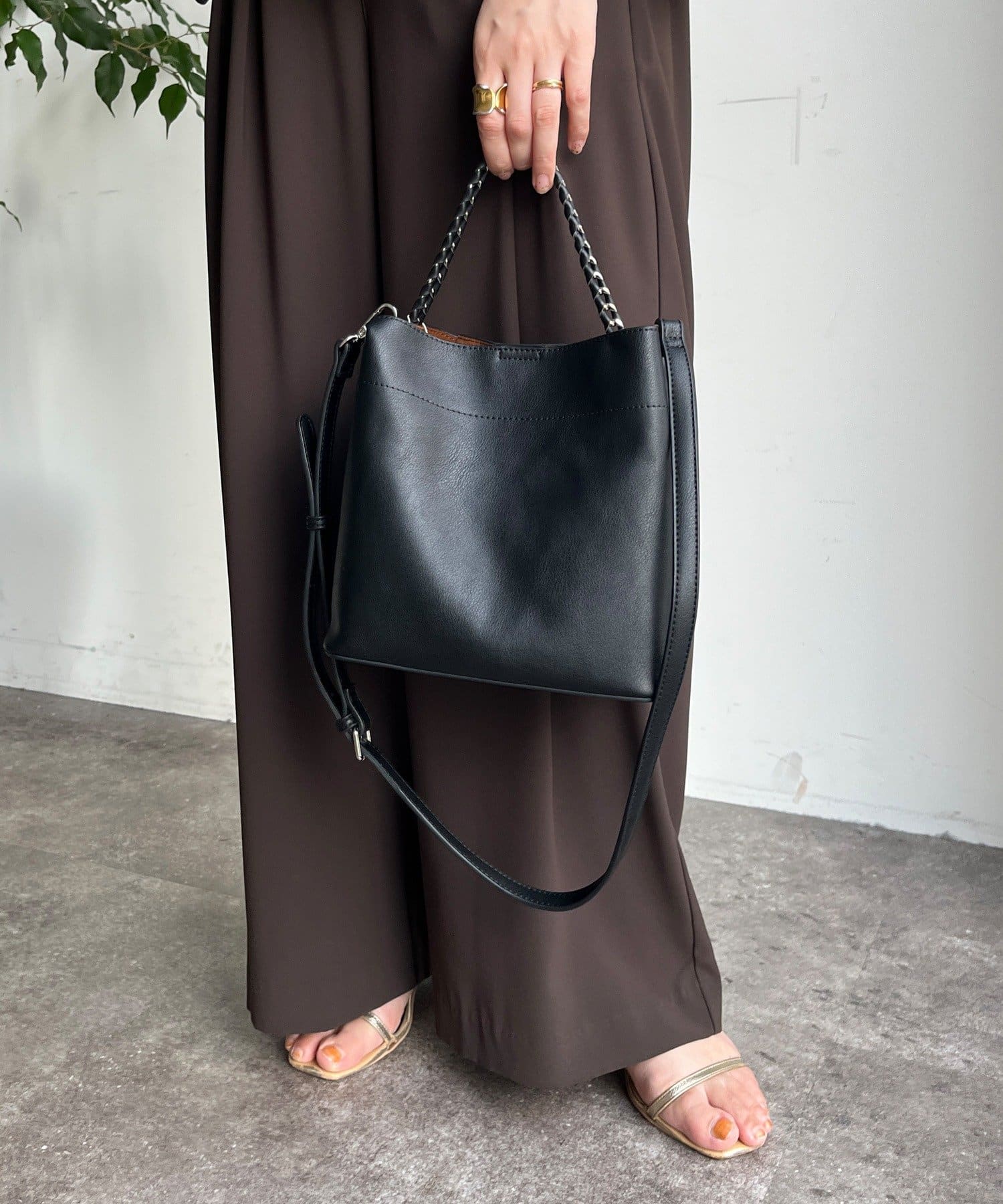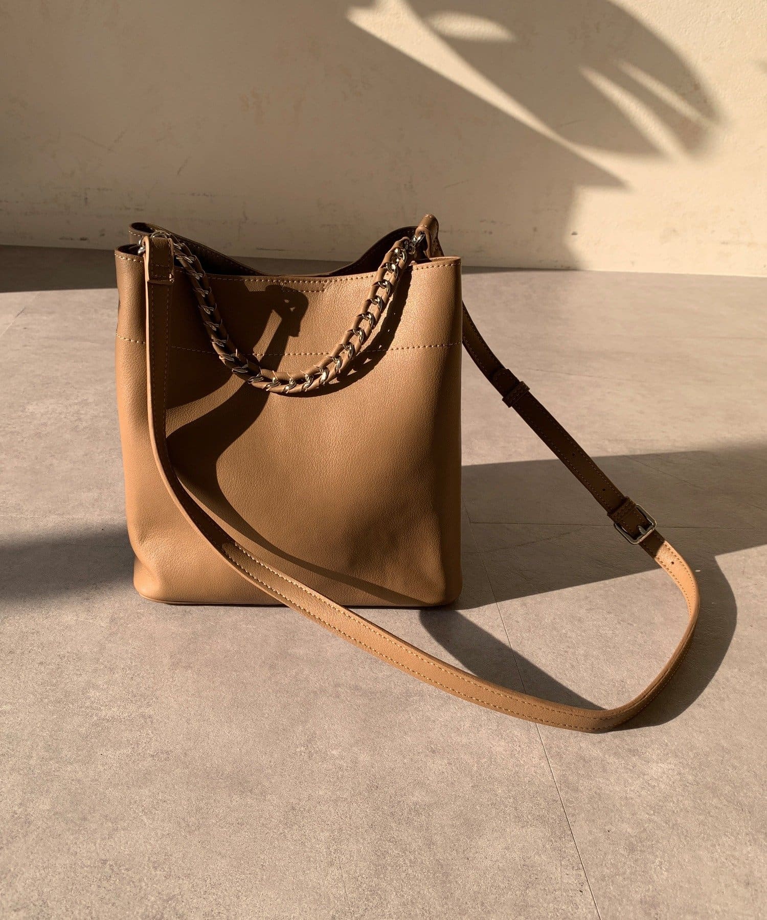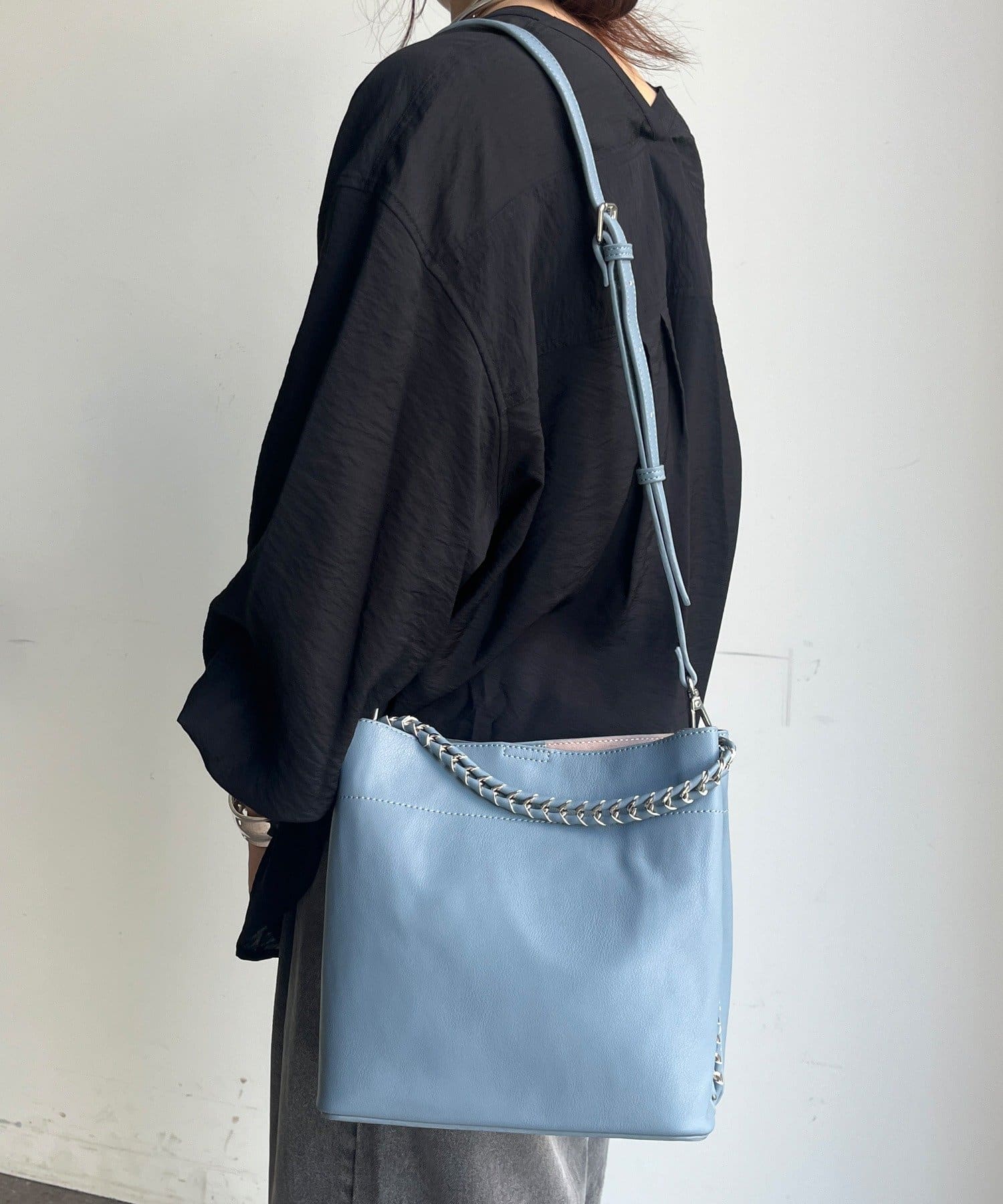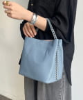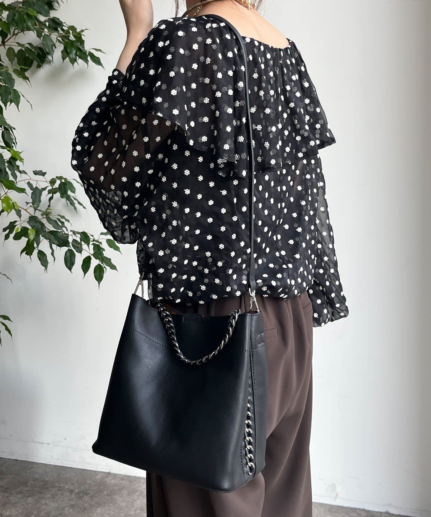 サイドのかがりチェーンがデザインポイントの2wayトートバッグ。
