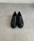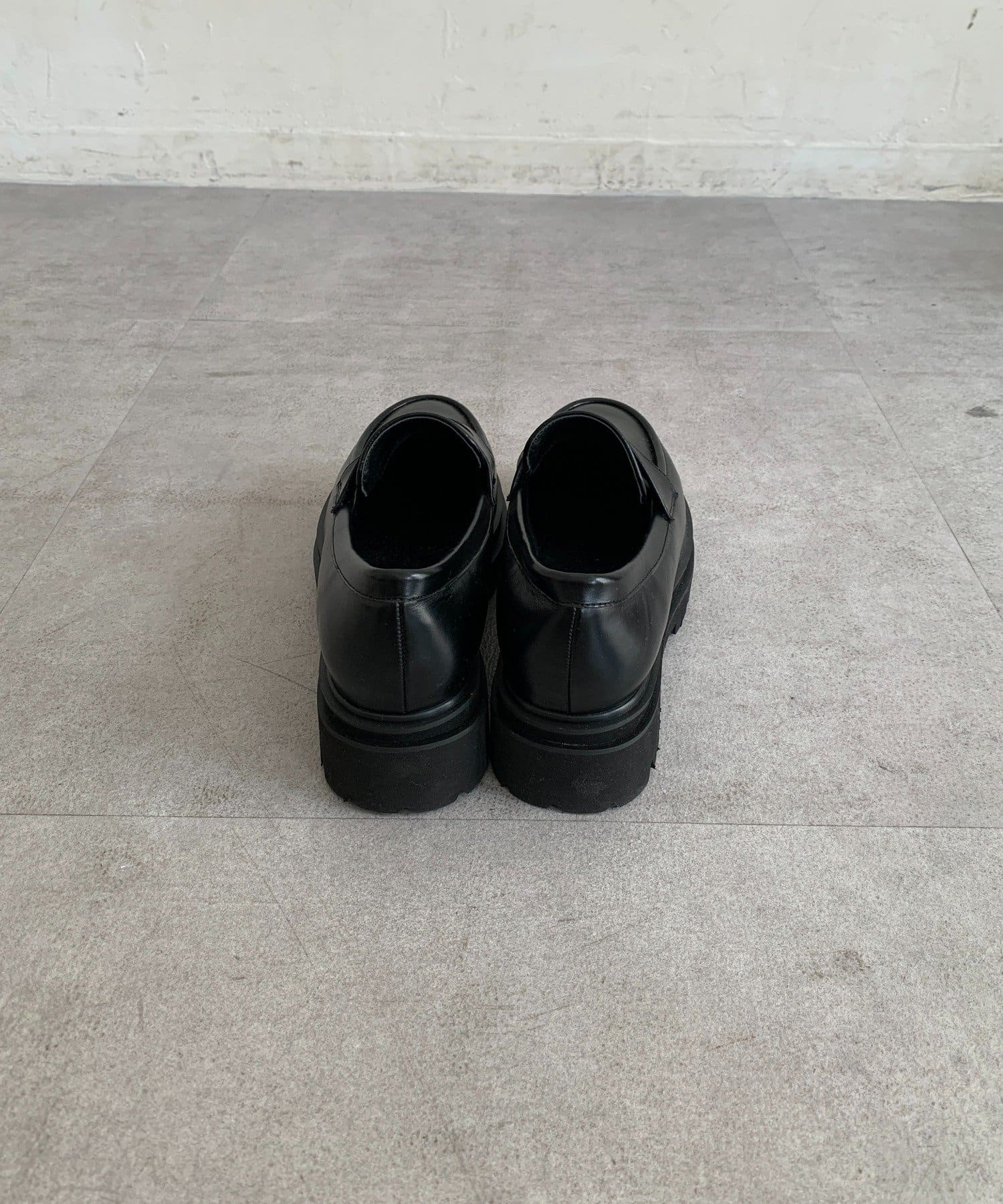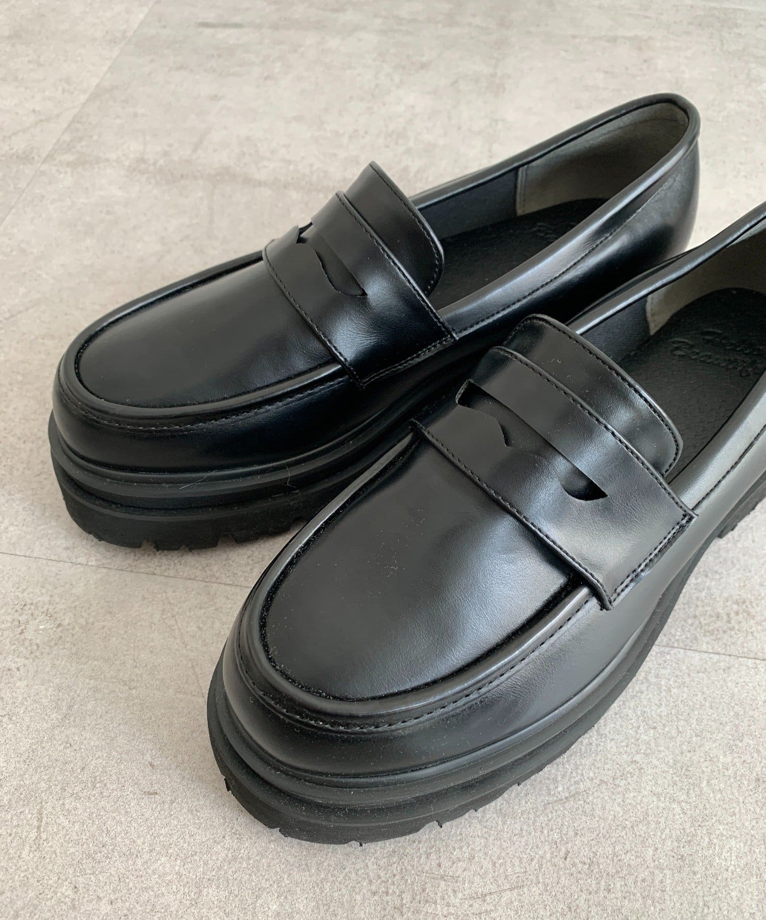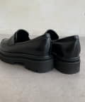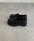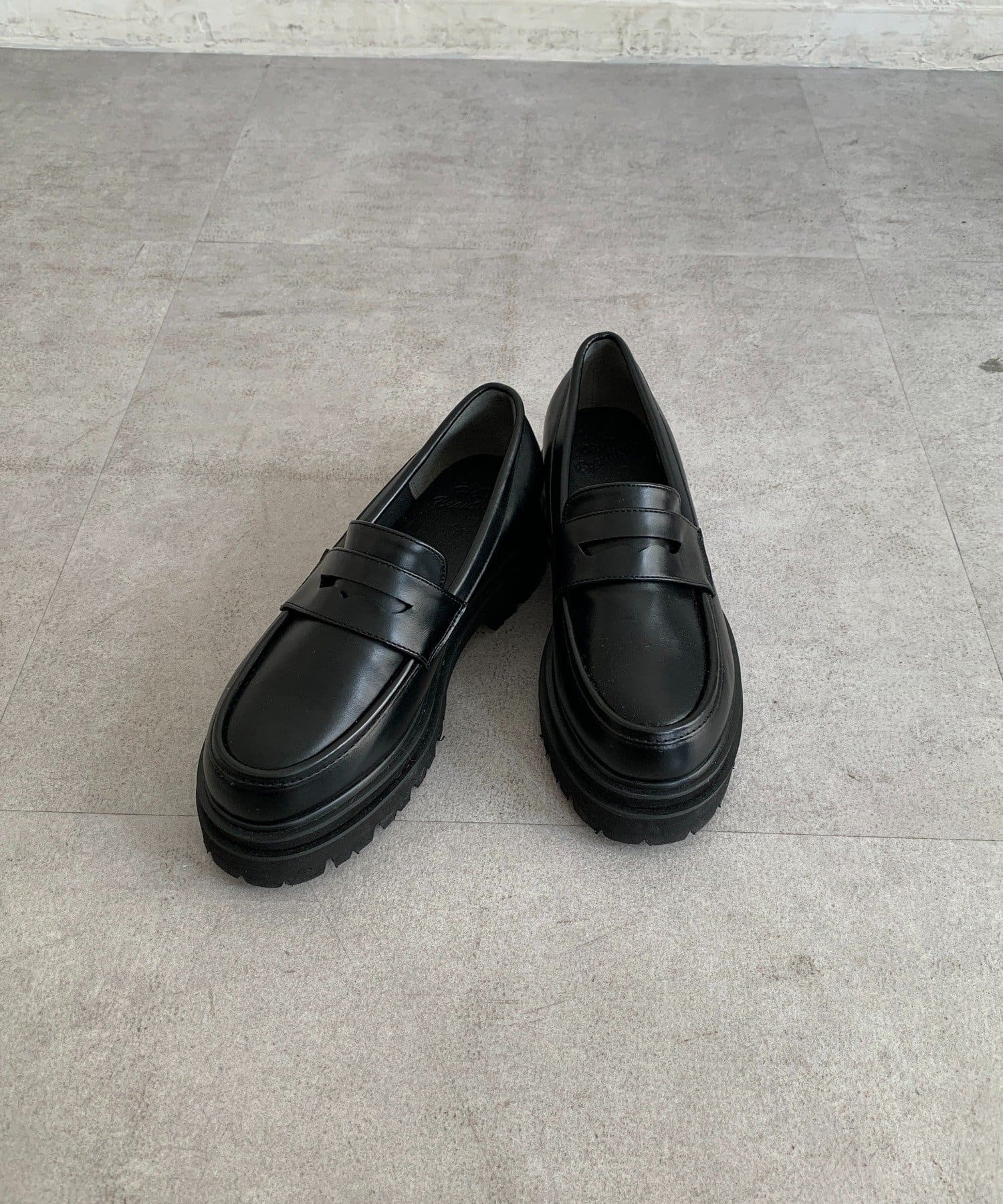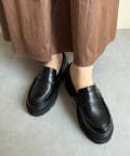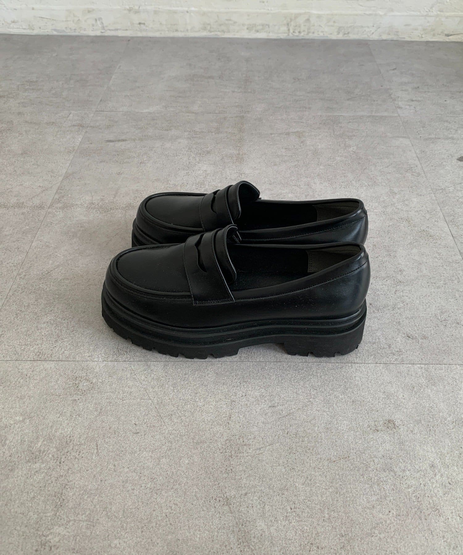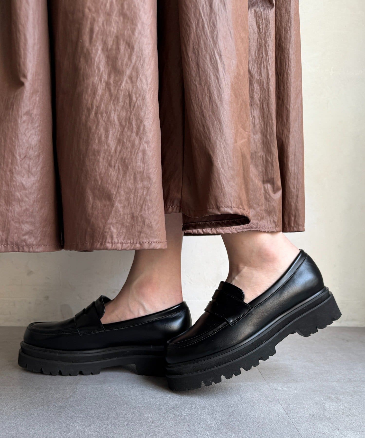 シンプルなデザインながらも、存在感のあるプラットフォームソールが足元に注目を!