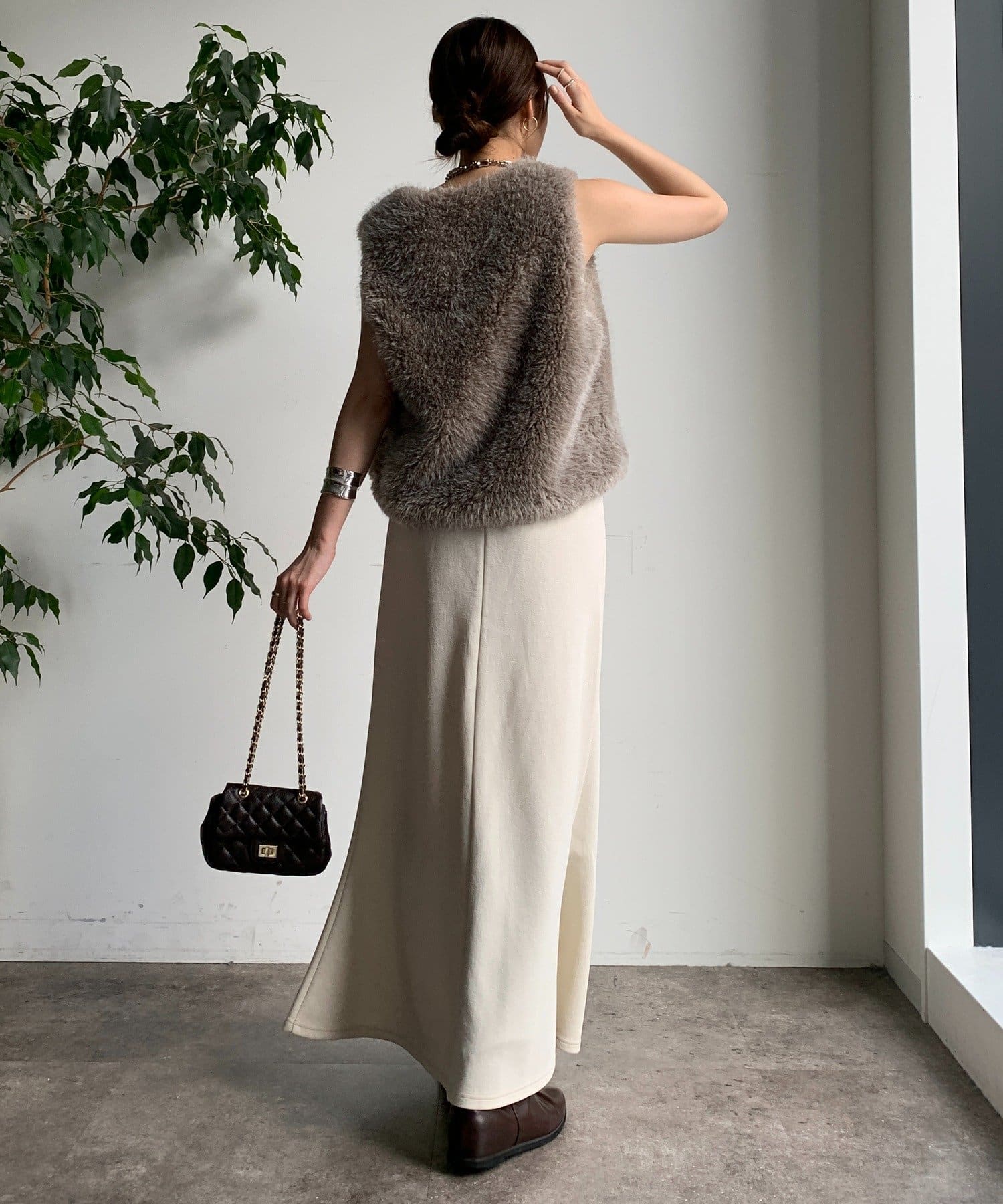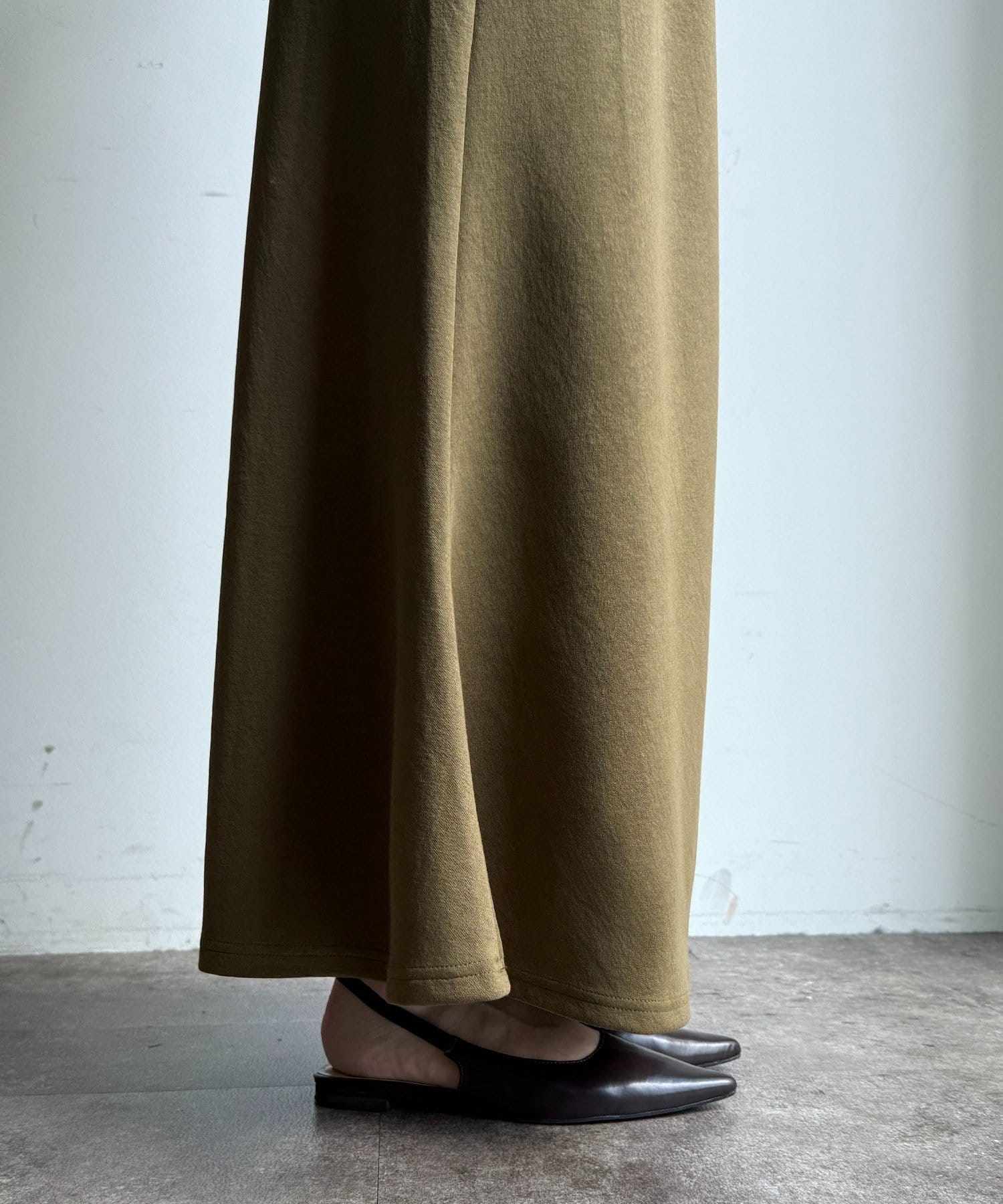 長めの丈と、裾に向かって緩やかに広がるフレアラインが、女性らしい美しいシルエットを演出します。
