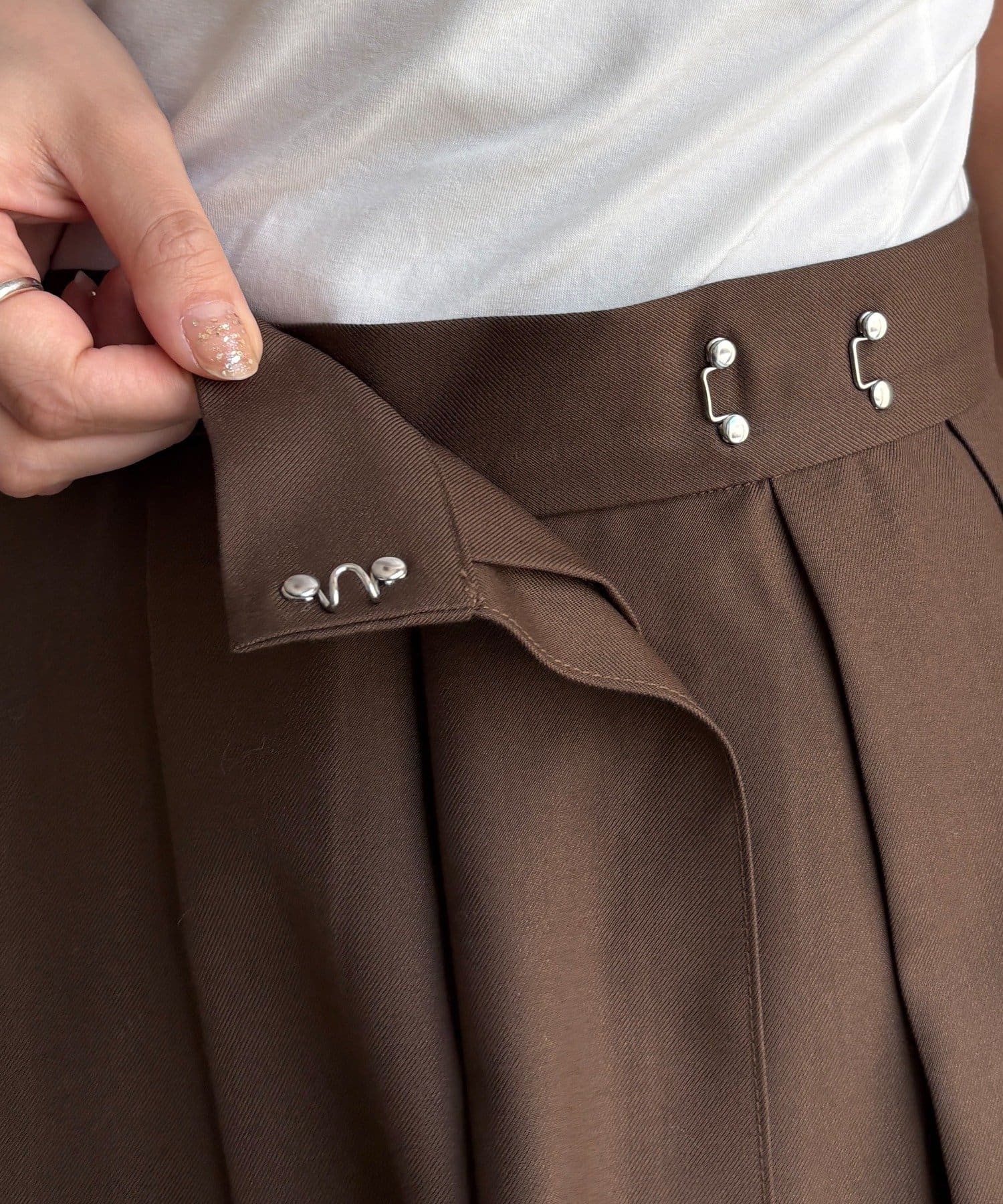 中のボタン、外側のホックとともに2段階にサイズ調節が可能なため、スタイリングやご自身のフィット感に合わせて着用していただけますよ。