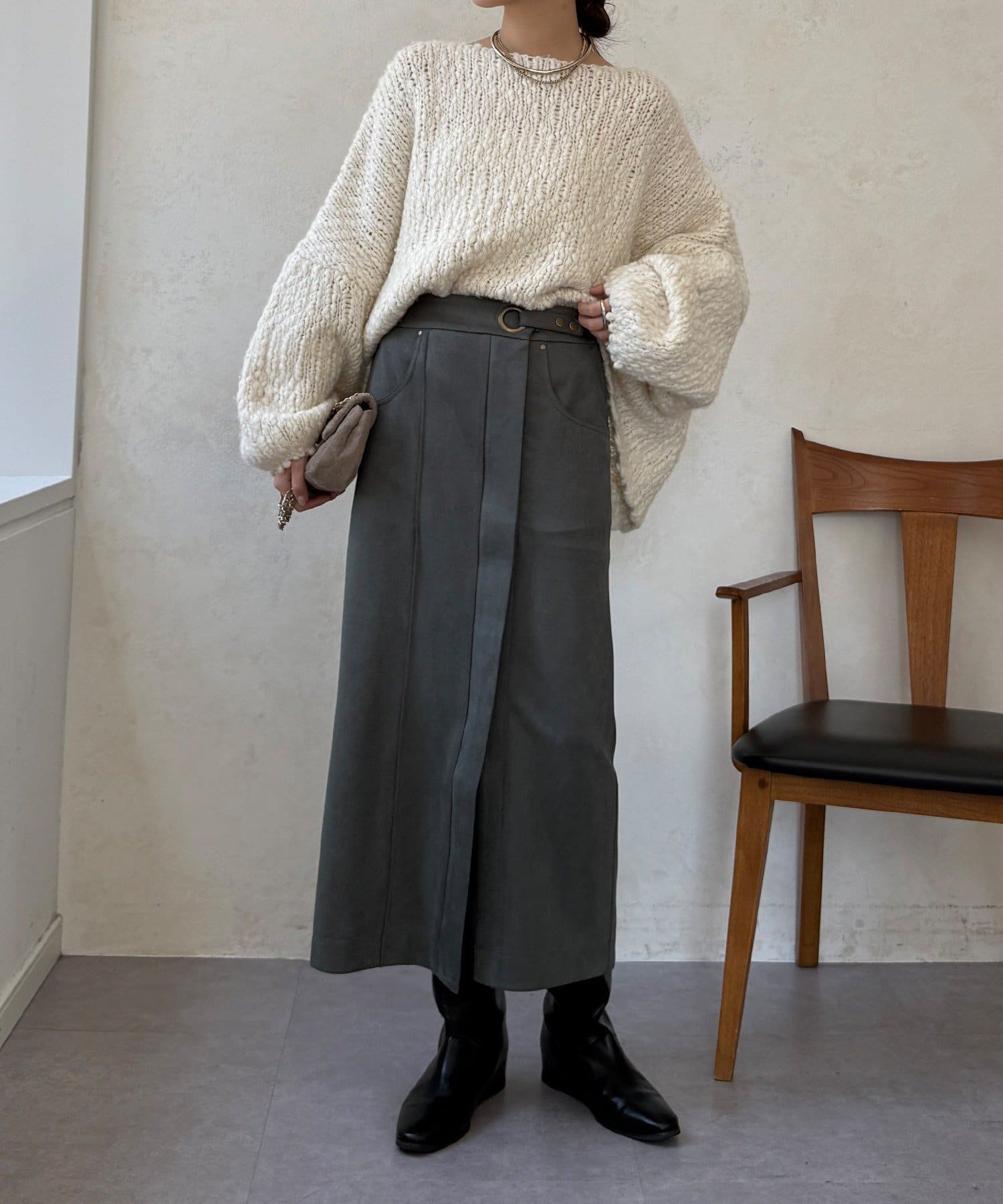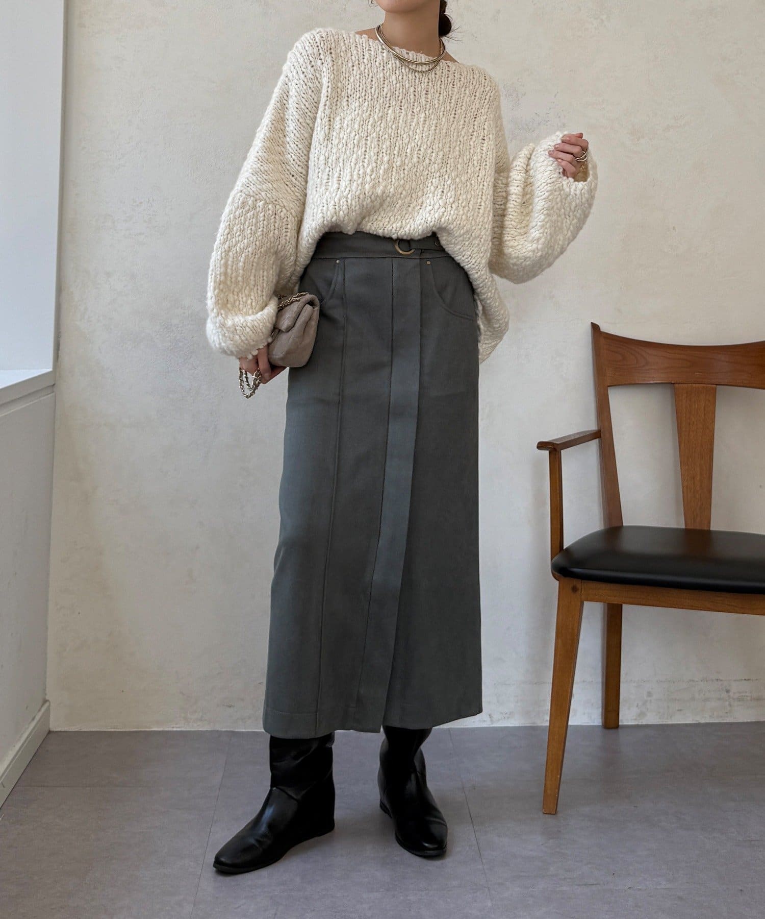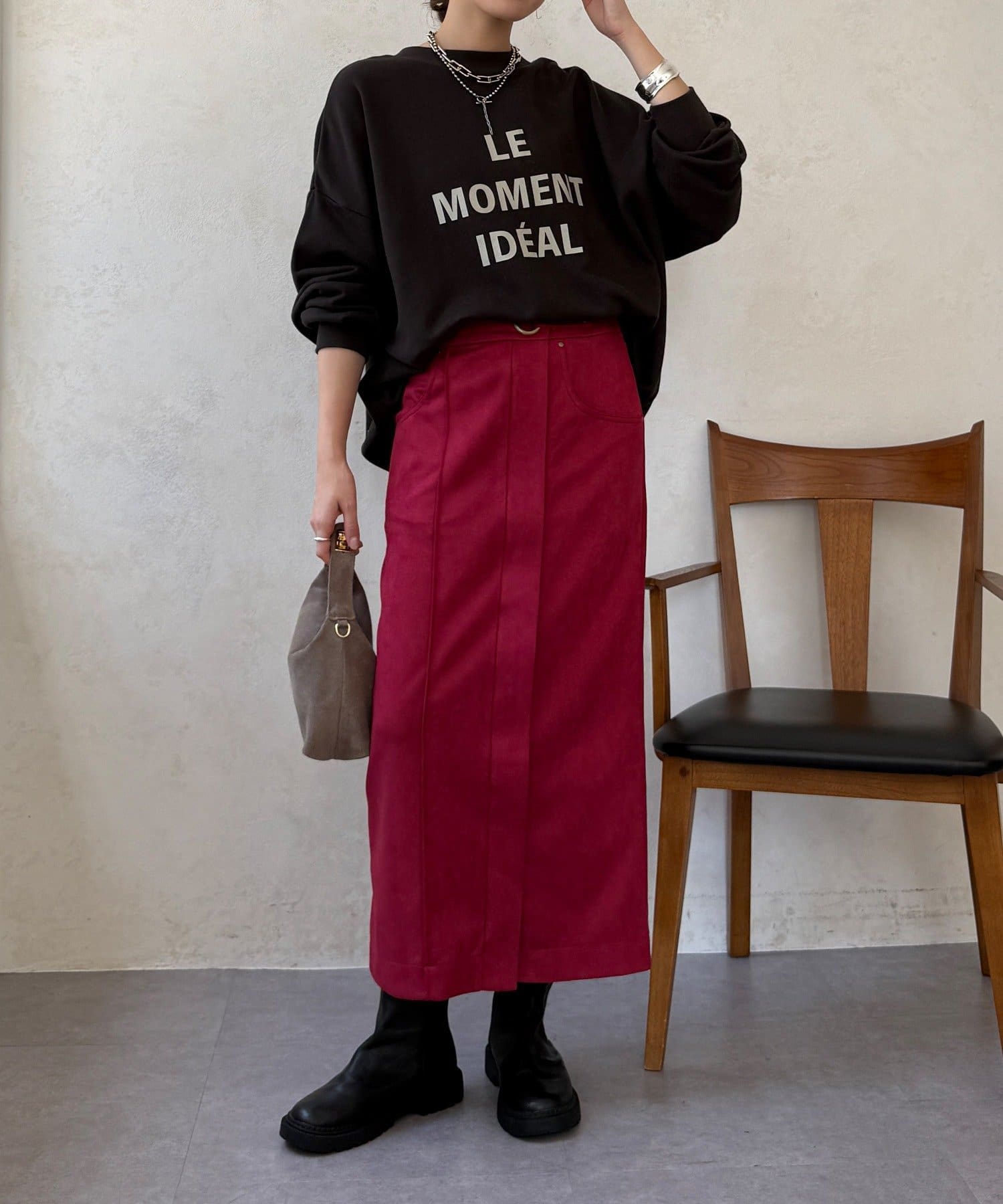 ブラウスやニット、カジュアルなスウェットまで、合わせるトップスを選ばない万能さも魅力です。