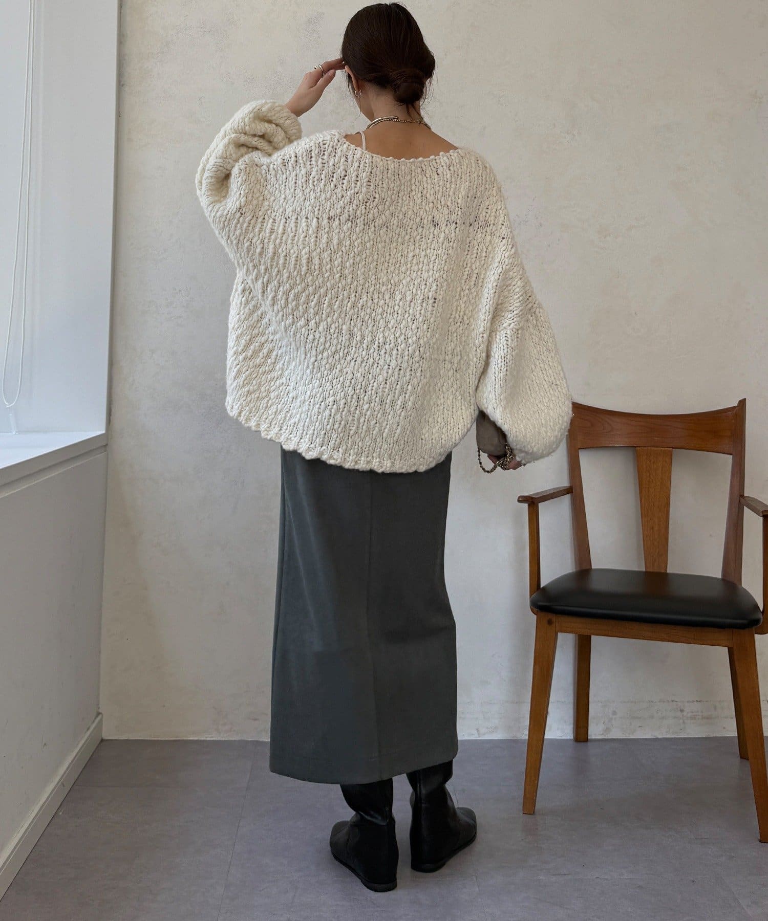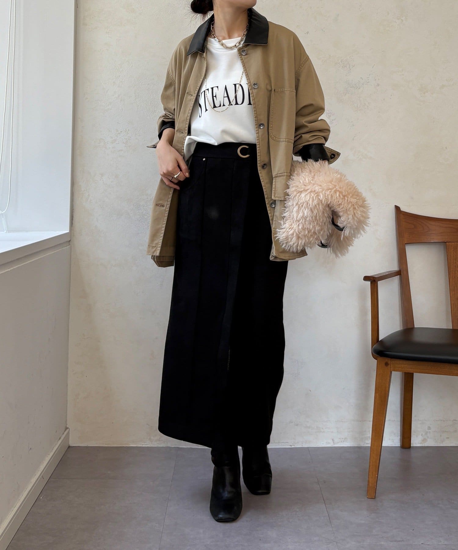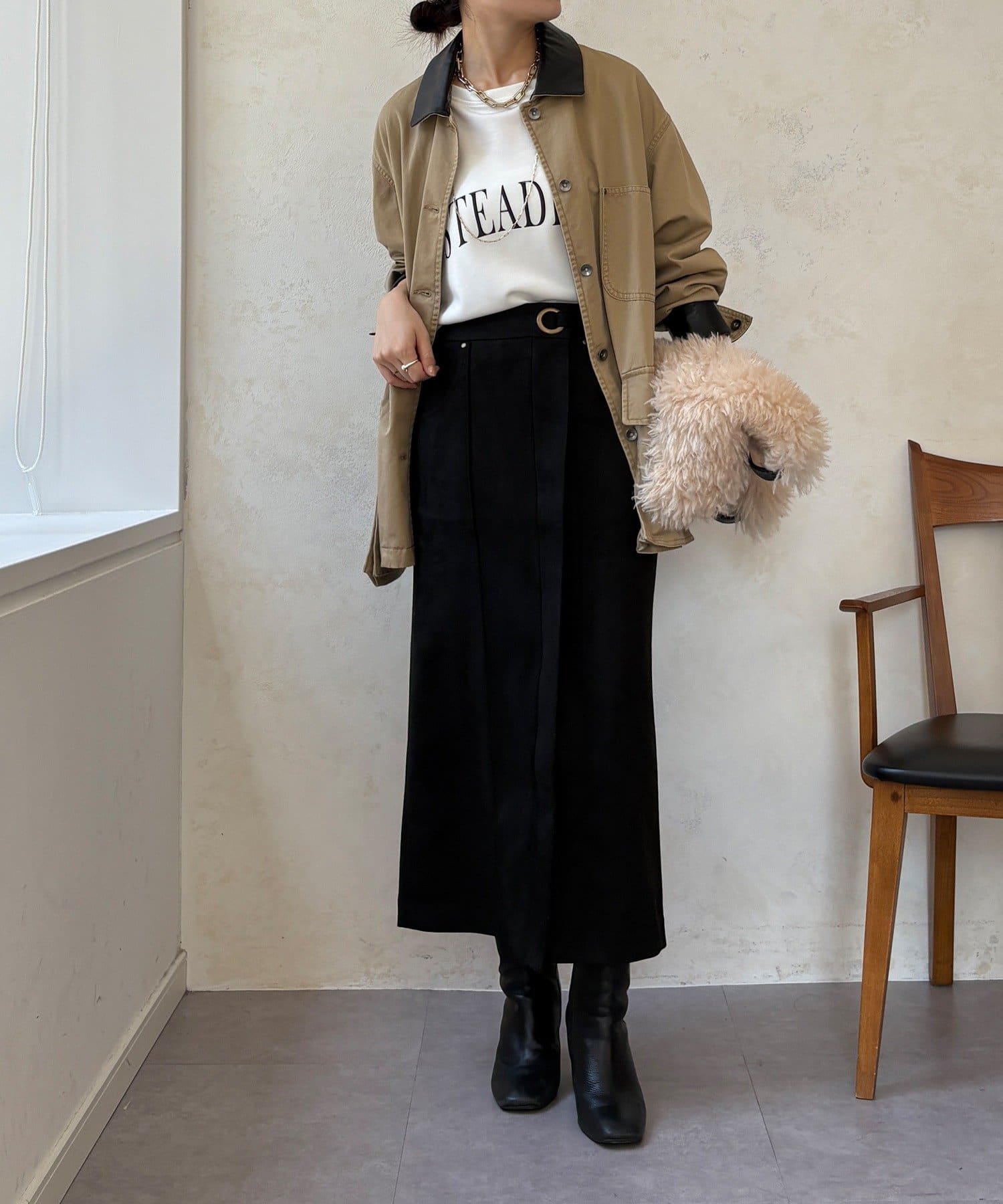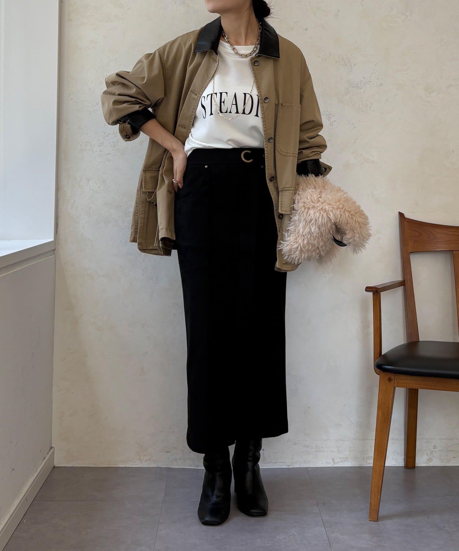 ブラウスやニット、カジュアルなスウェットまで、合わせるトップスを選ばない万能さも魅力です。