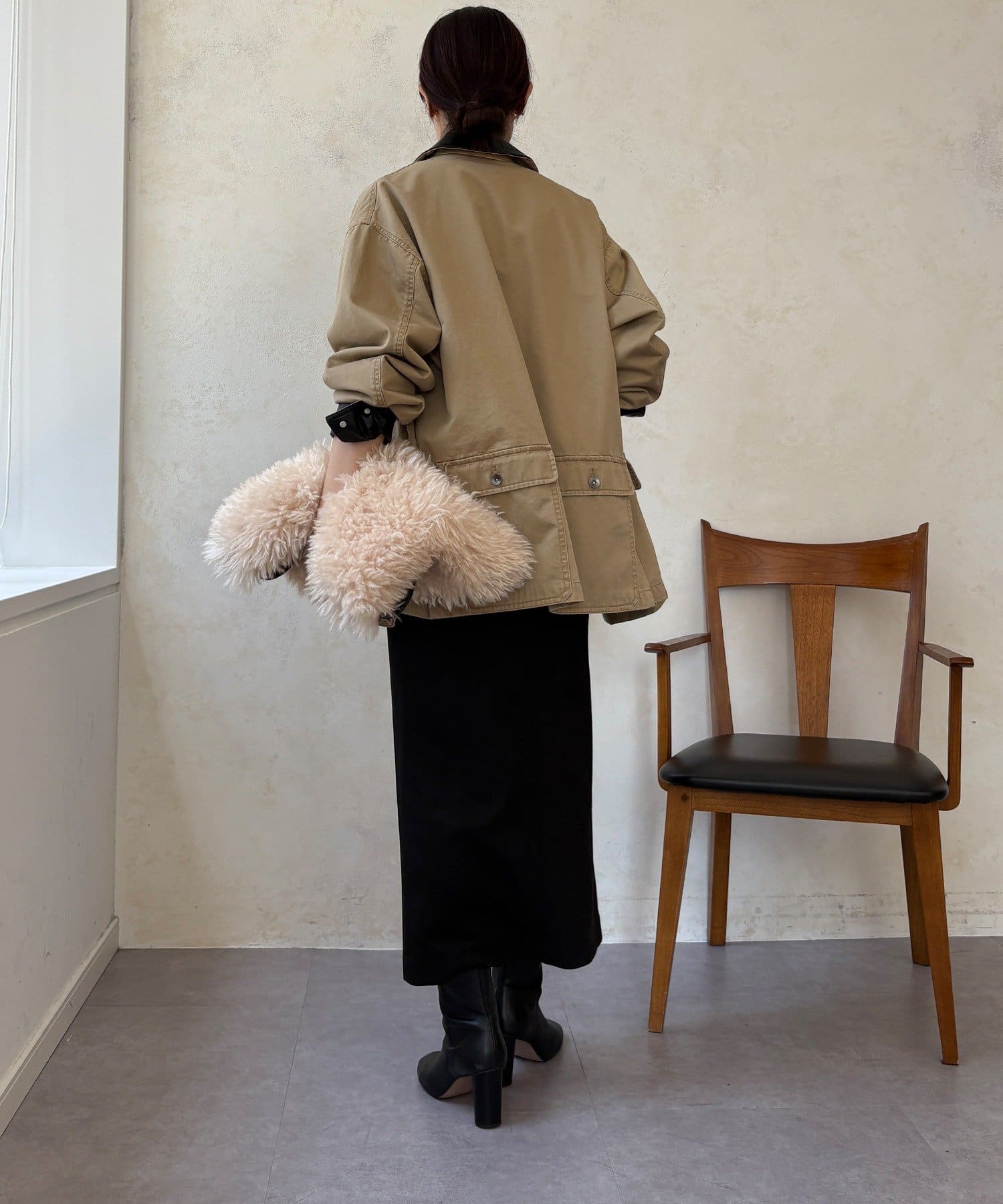 しっとりとしたスエード調素材と、動きやすさを叶えるポンチ素材を組み合わせた、見た目も着心地も妥協しない一枚。