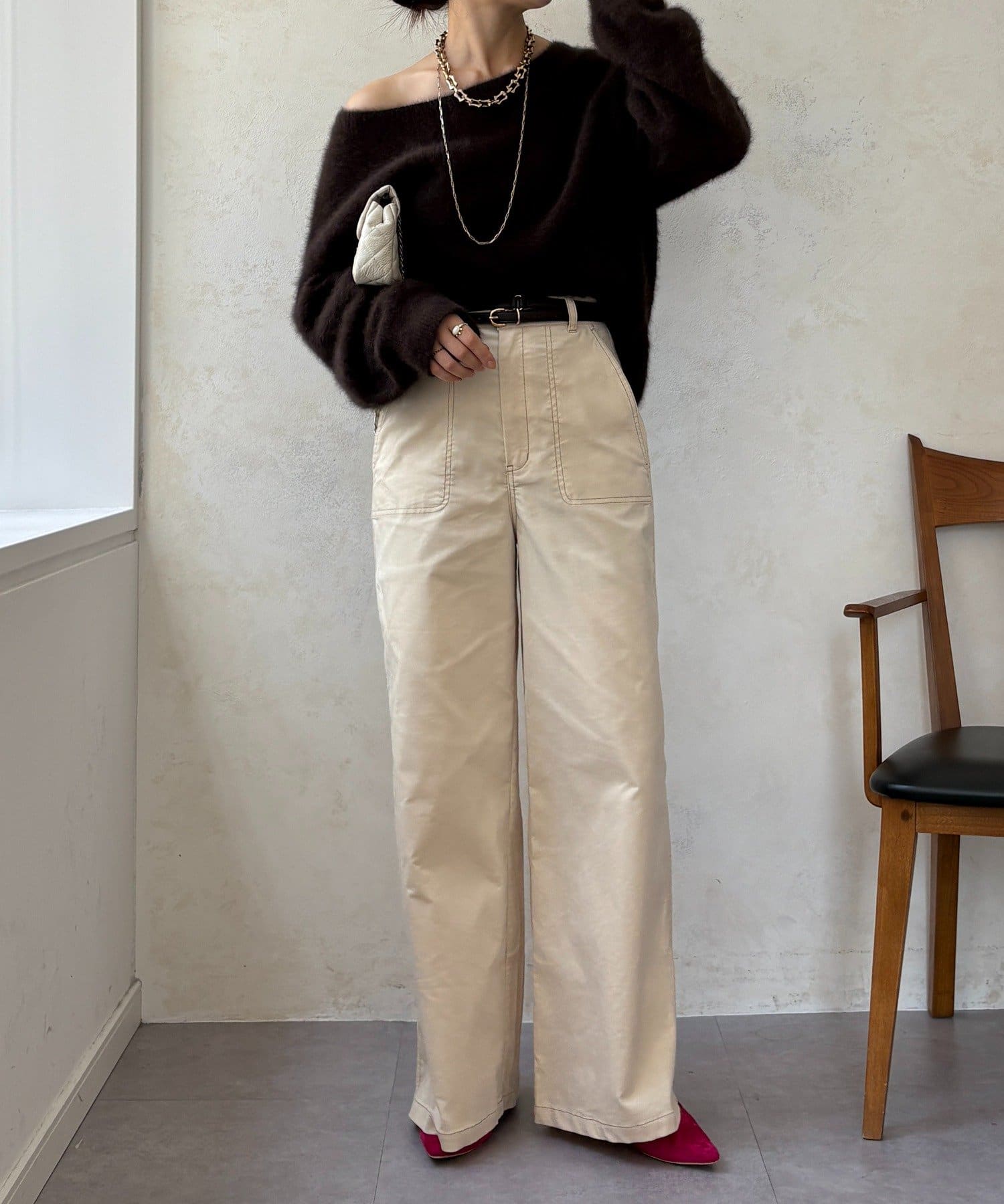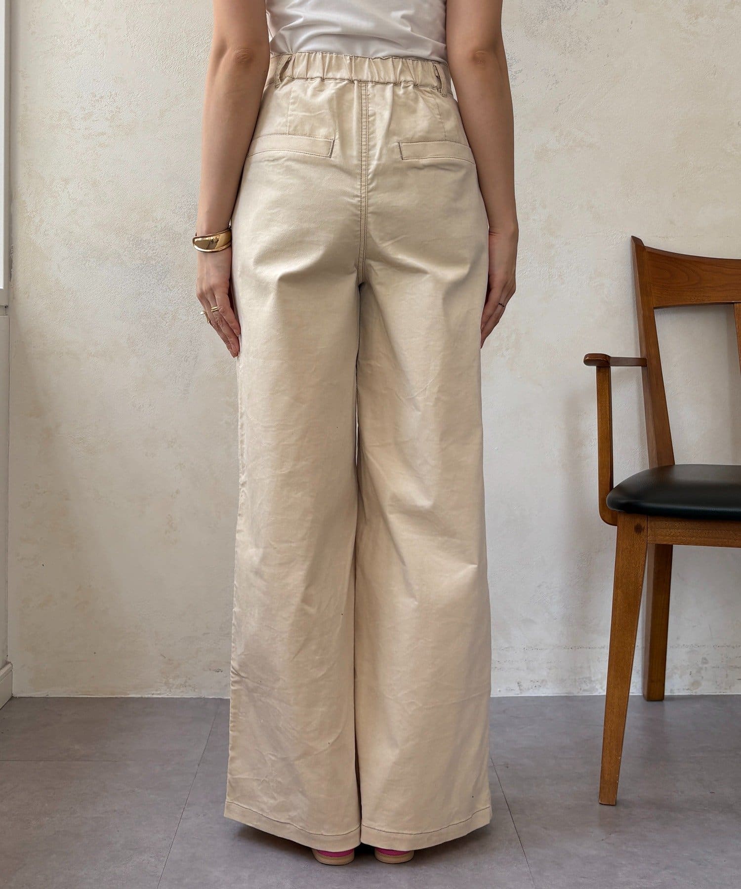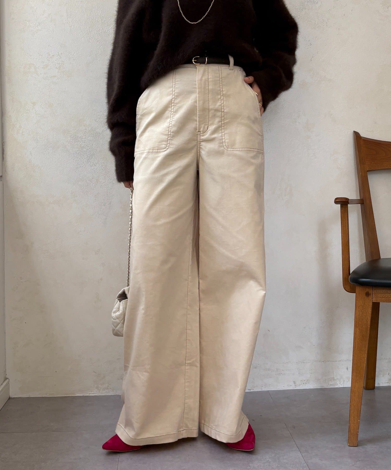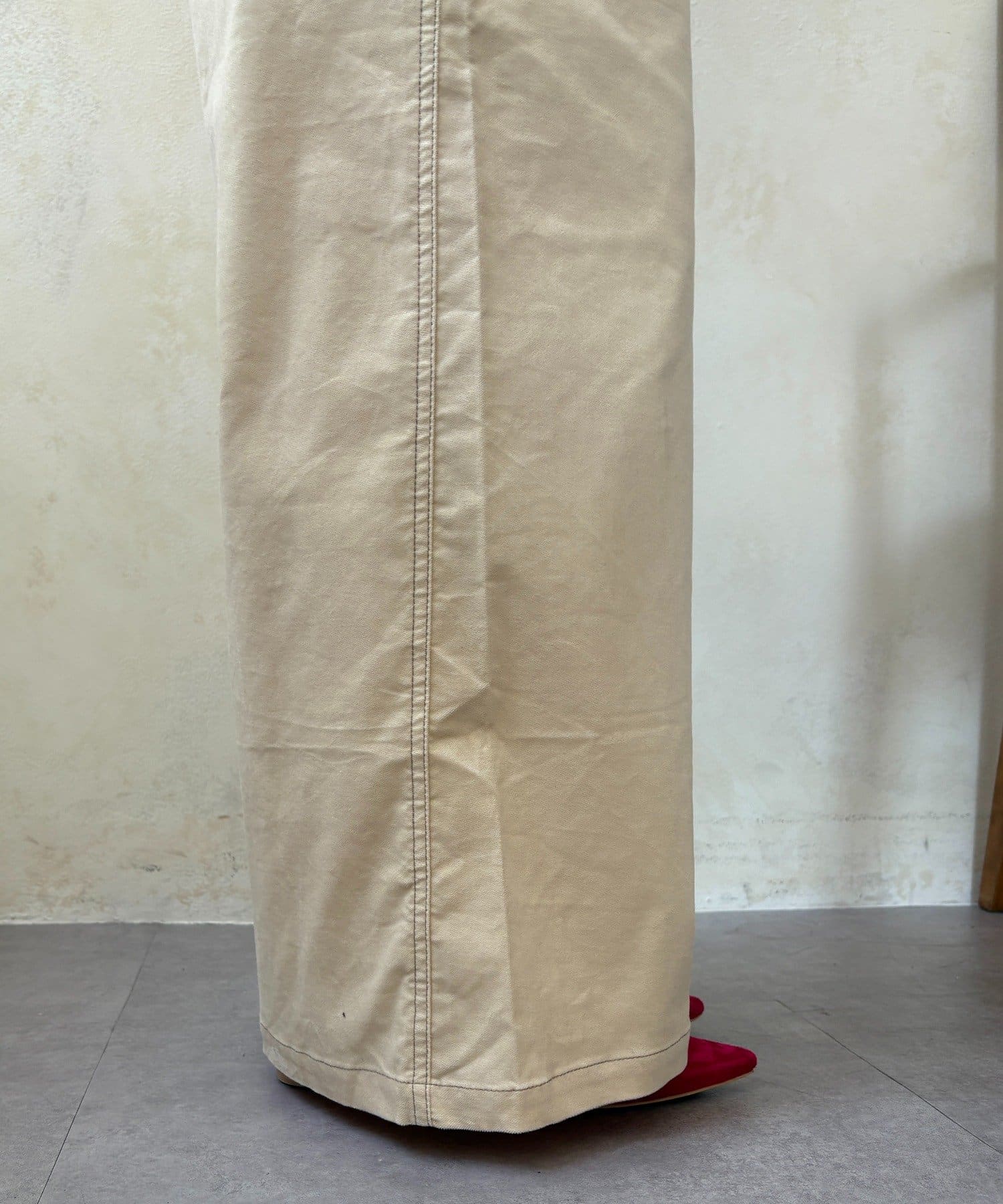 ワイドシルエットが脚のラインを拾わず、ハリ感があるので綺麗なシルエットが保てます。