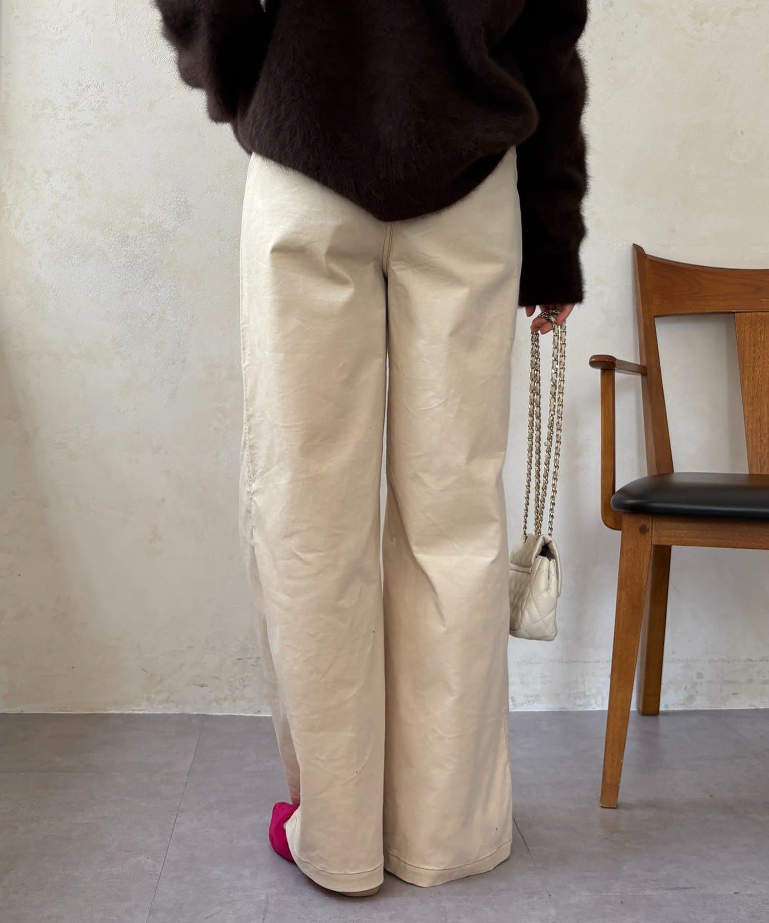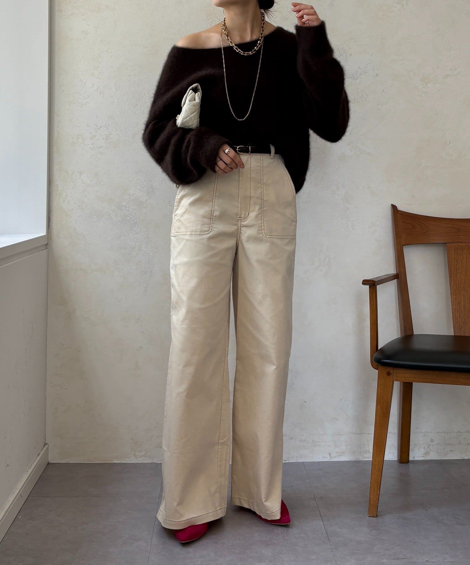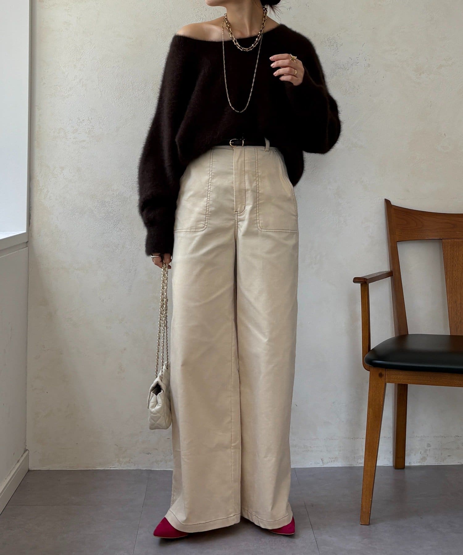 ワイドシルエットが脚のラインを拾わず、ハリ感があるので綺麗なシルエットが保てます。