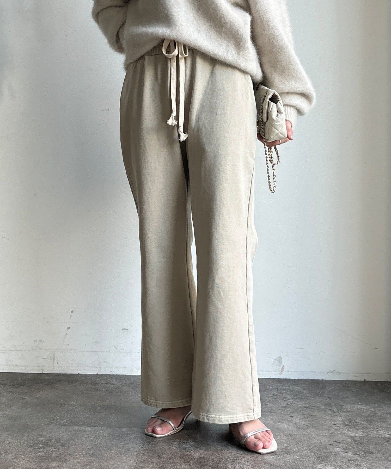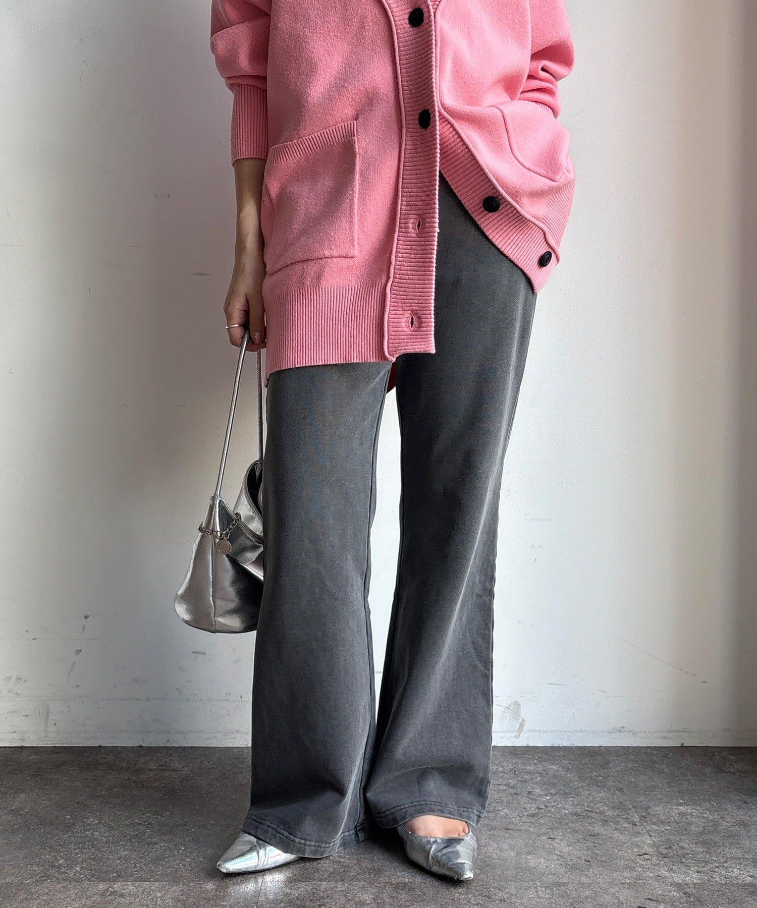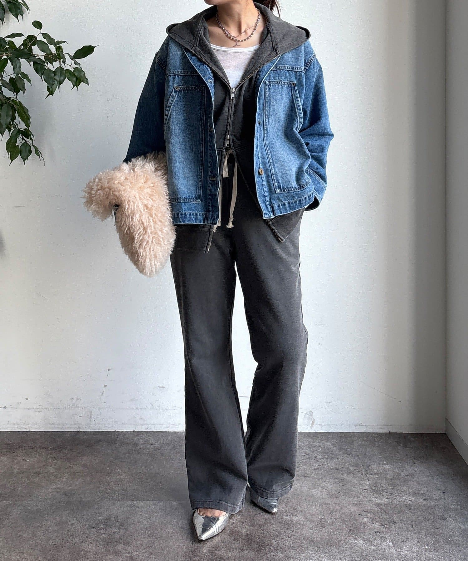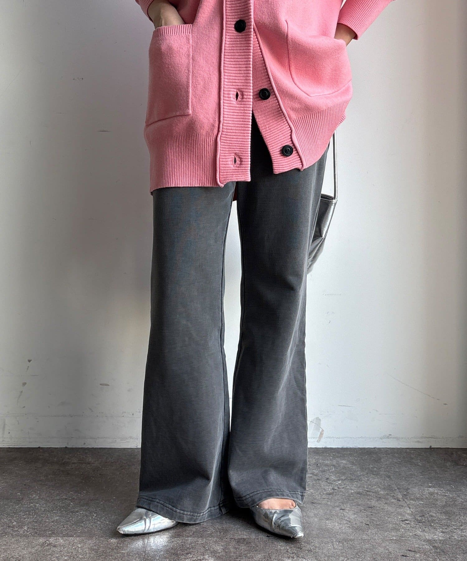 脚のラインをすっきりと長く見せてくれるフレアシルエットは、カジュアルな素材感ながらもきれい見えするポイントに。