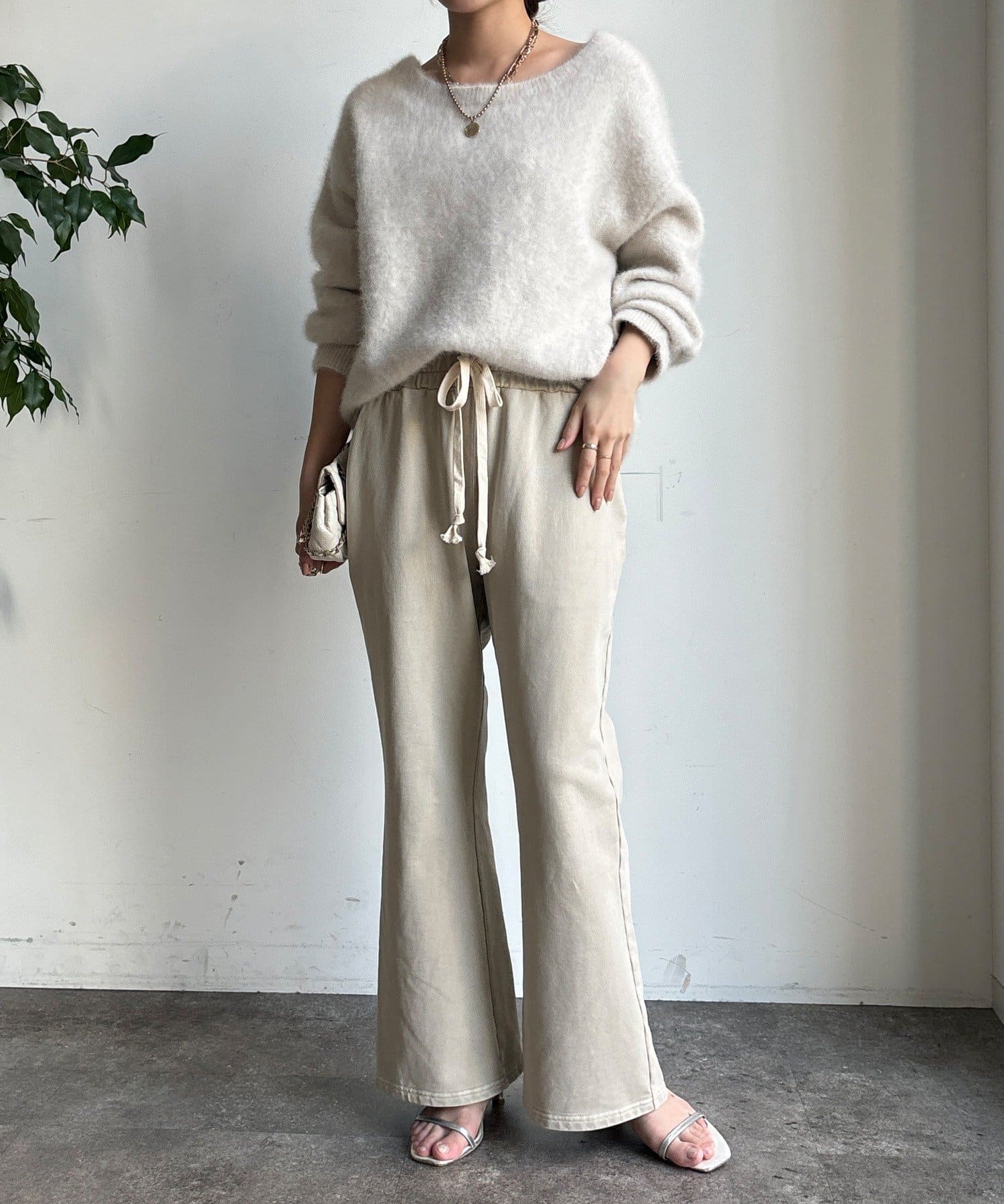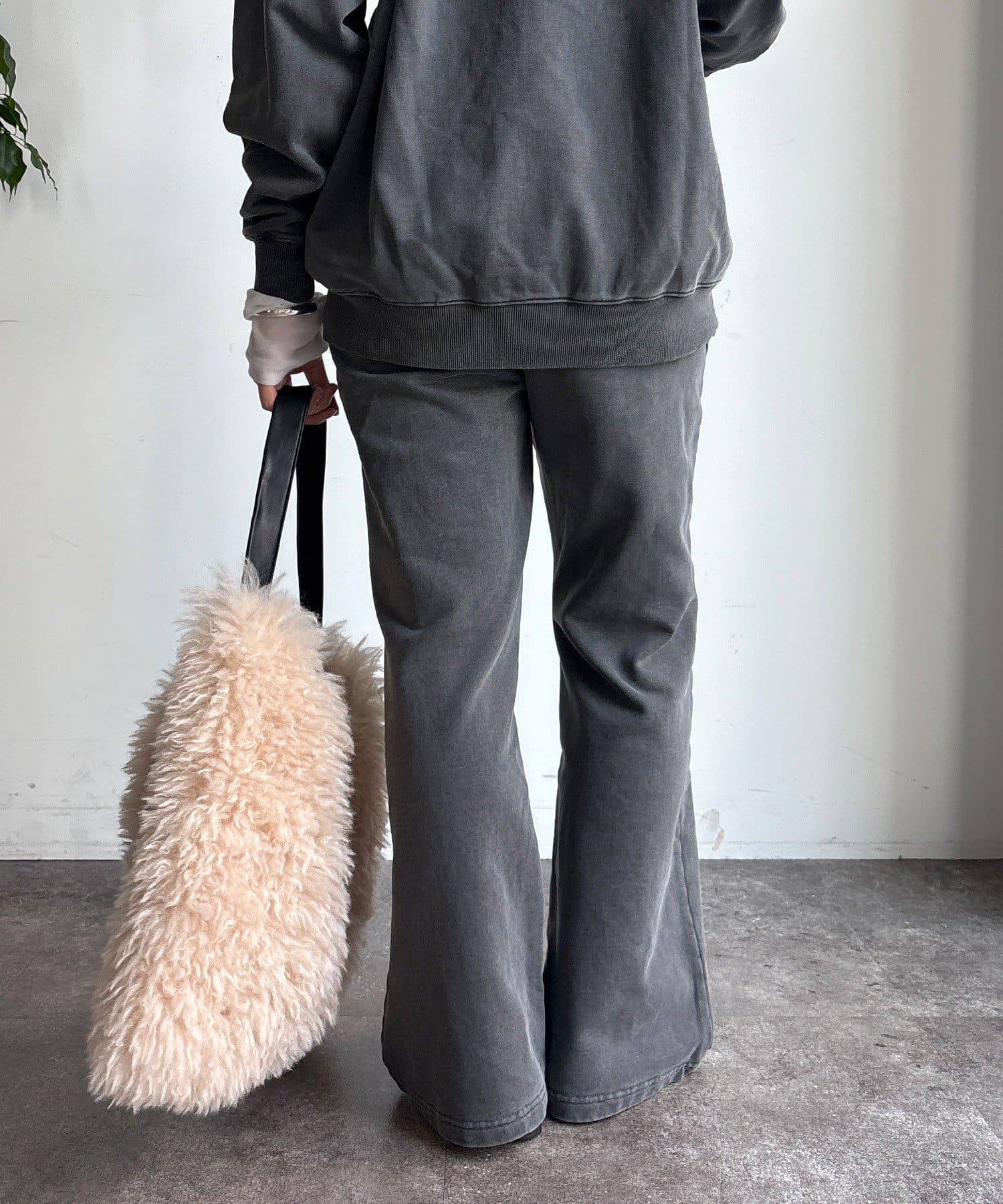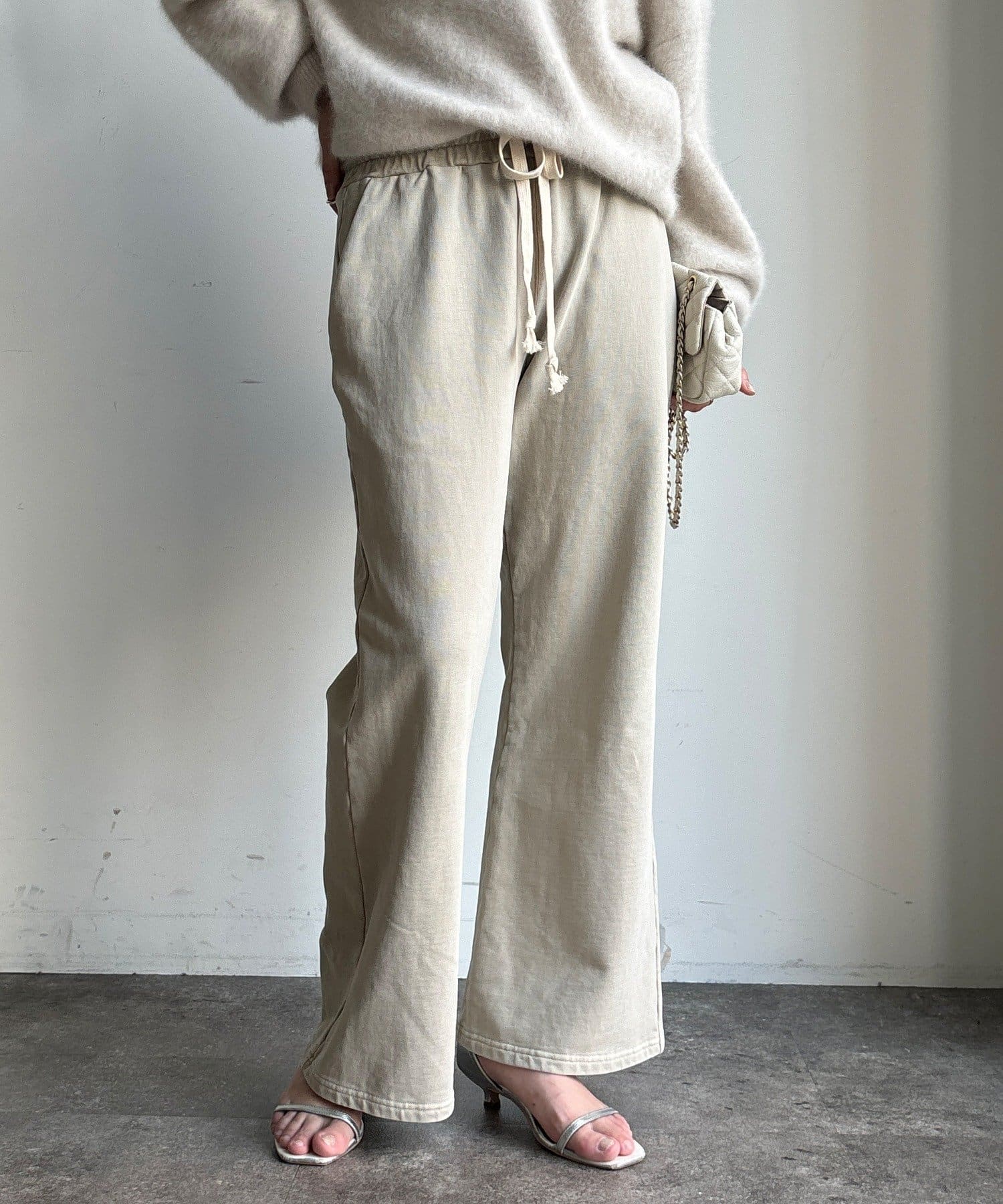 脚のラインをすっきりと長く見せてくれるフレアシルエットは、カジュアルな素材感ながらもきれい見えするポイントに。