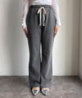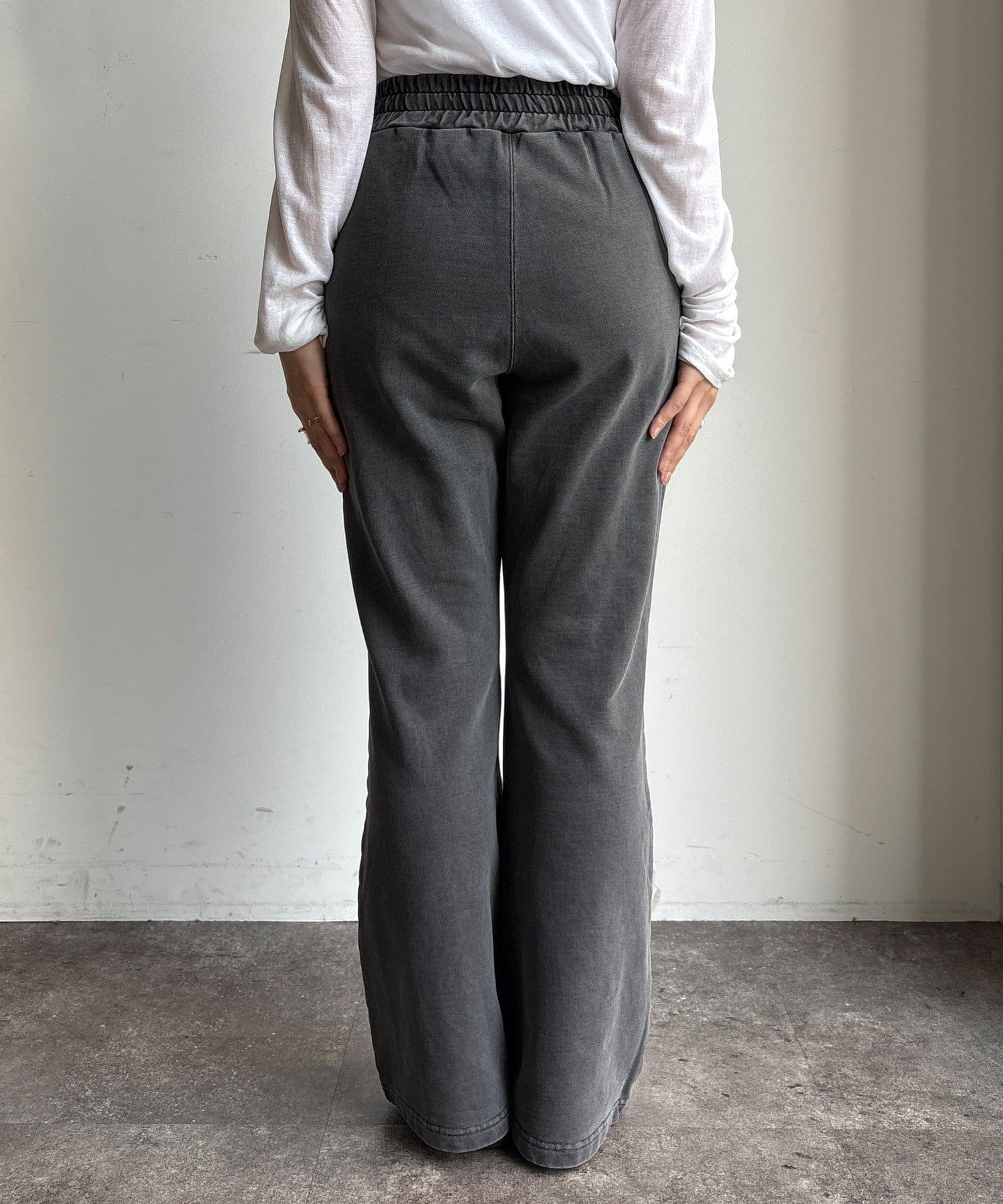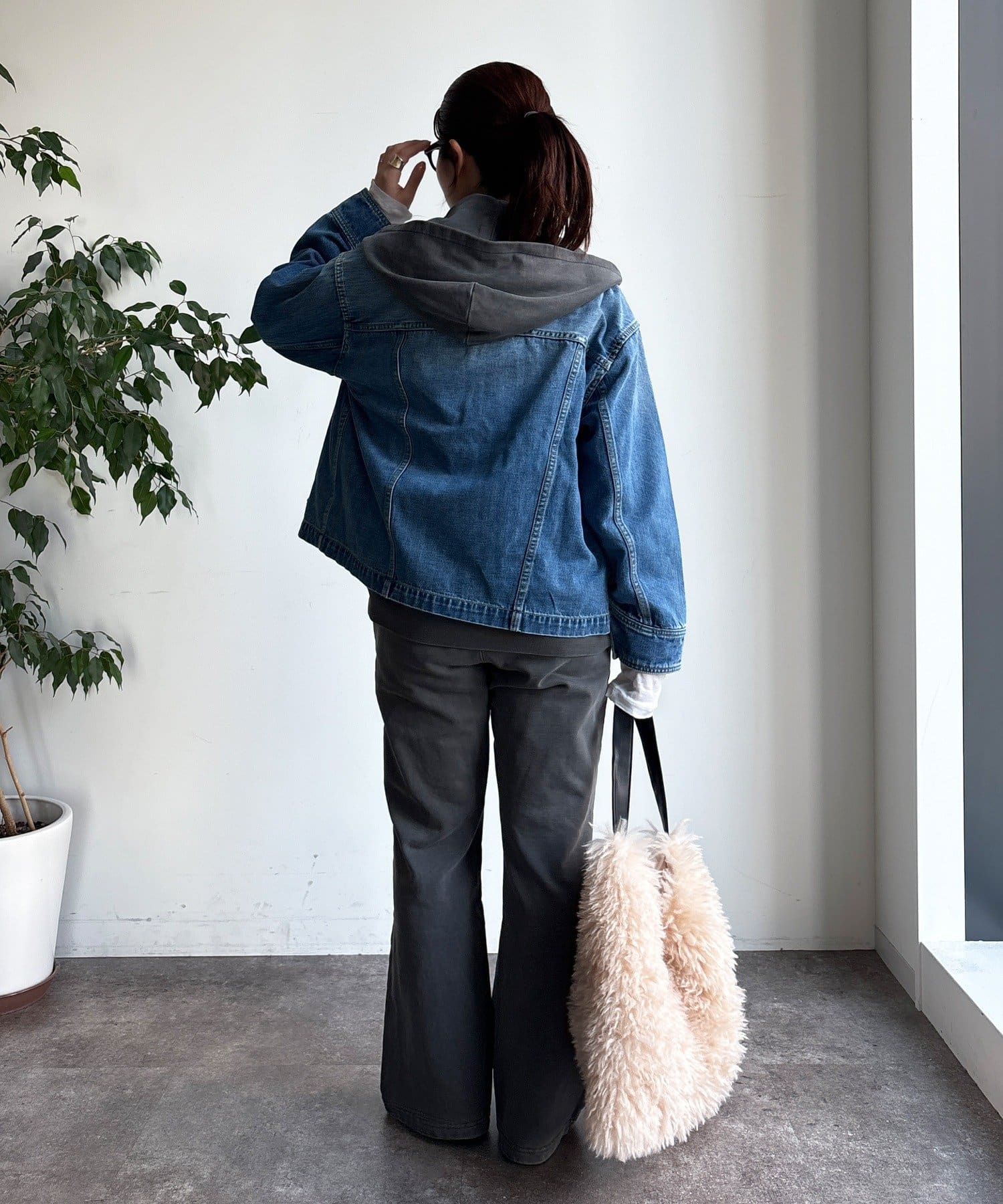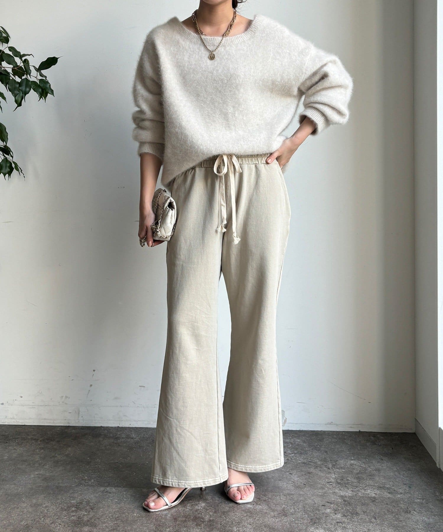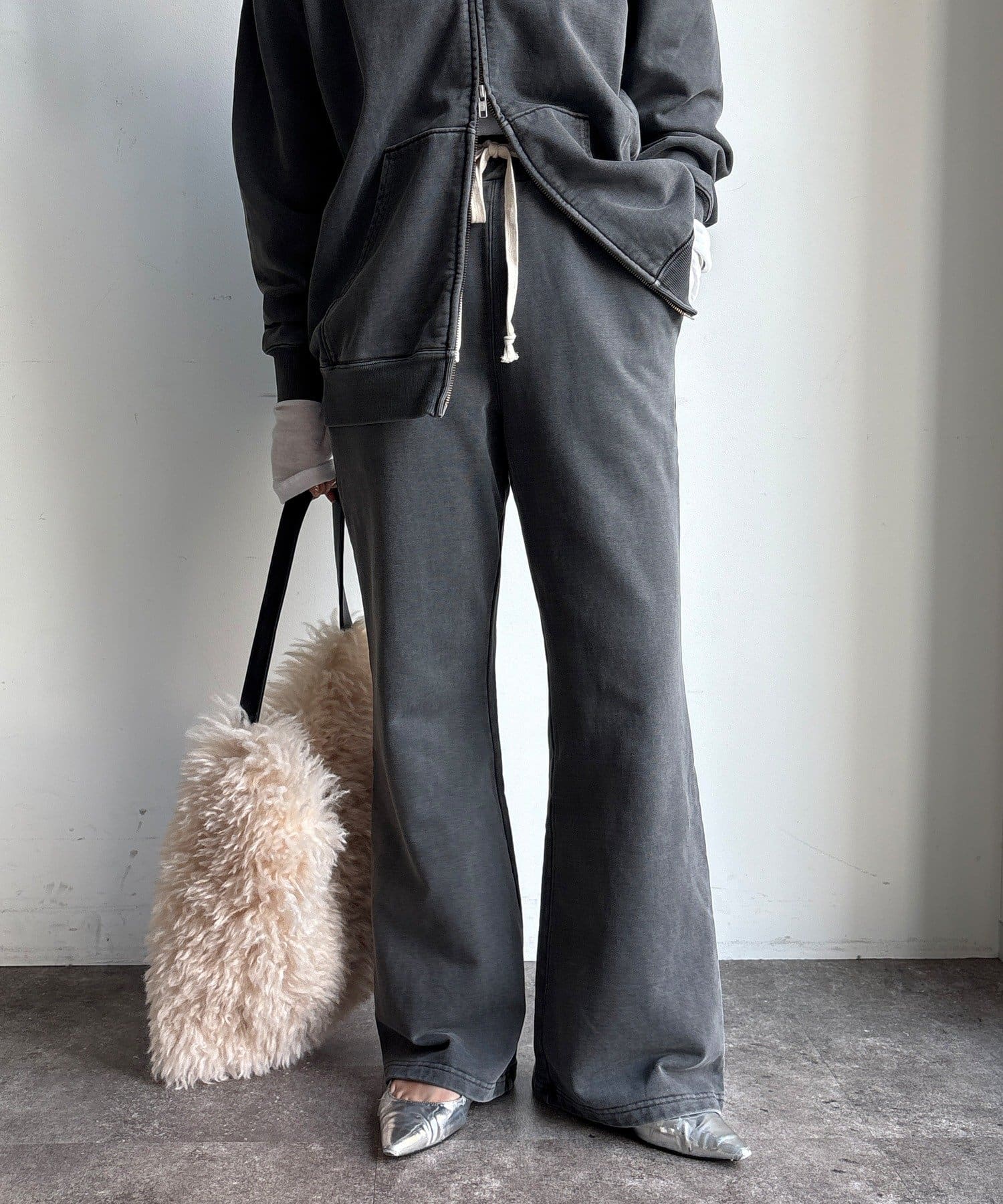 脚のラインをすっきりと長く見せてくれるフレアシルエットは、カジュアルな素材感ながらもきれい見えするポイントに。