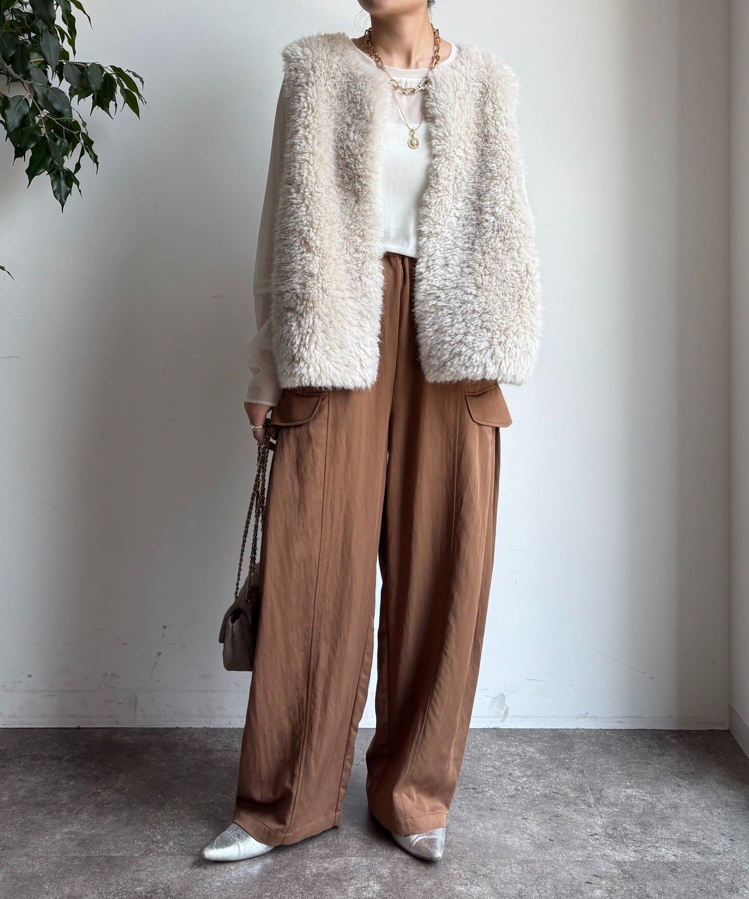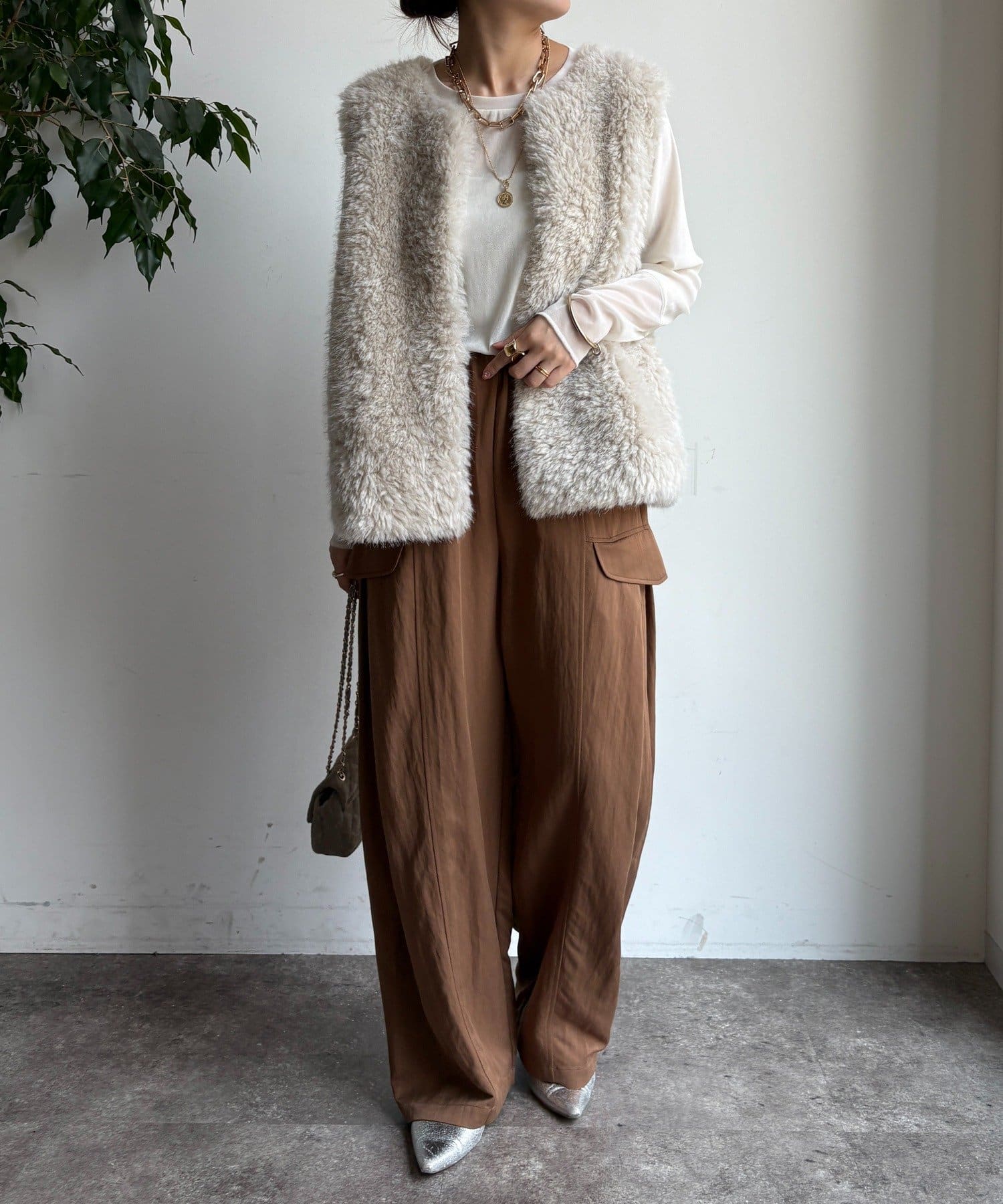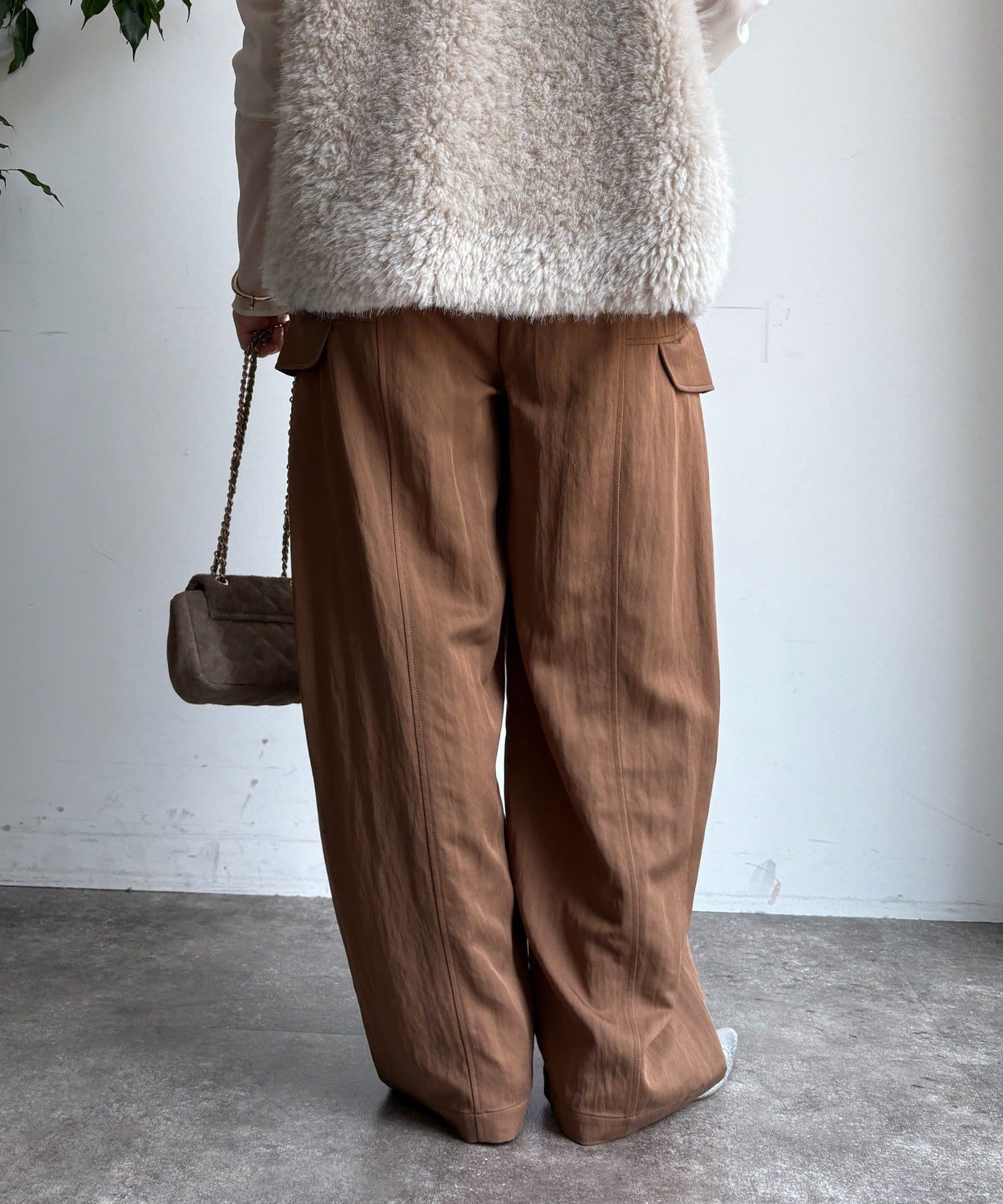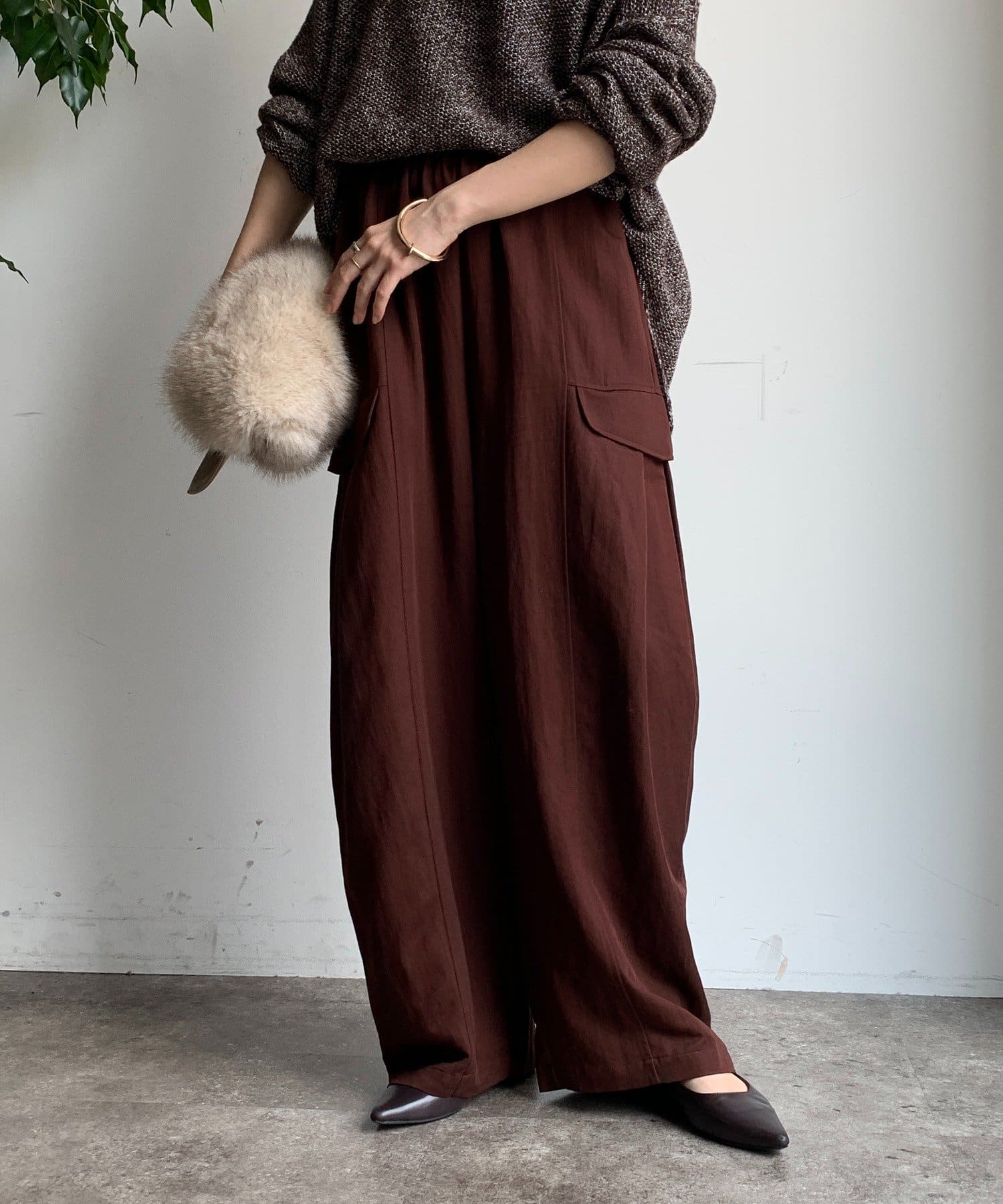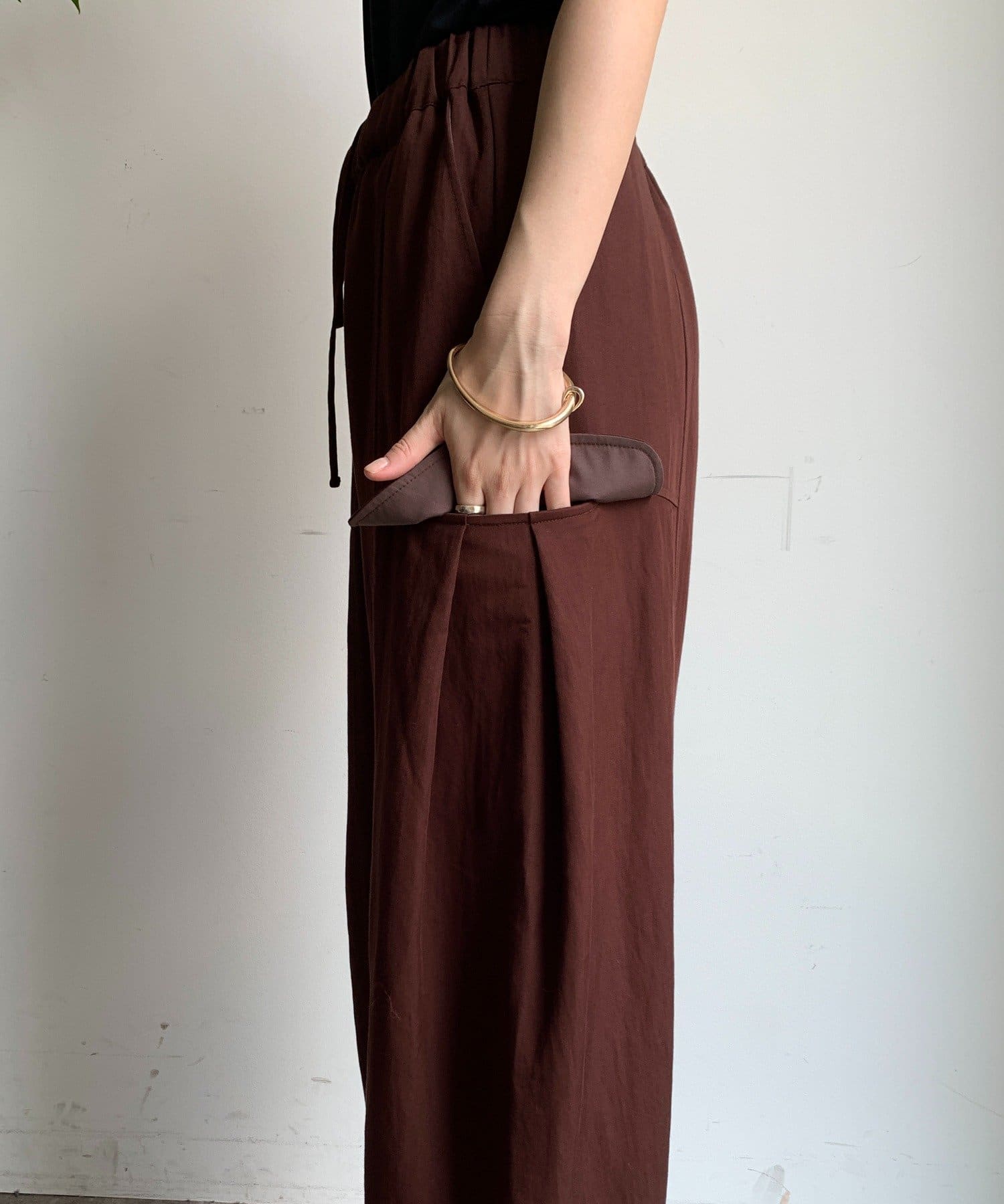 ポケット下に施したタックが、立体感のあるカーブシルエットを生み出し、抜け感のある美しいラインを演出。