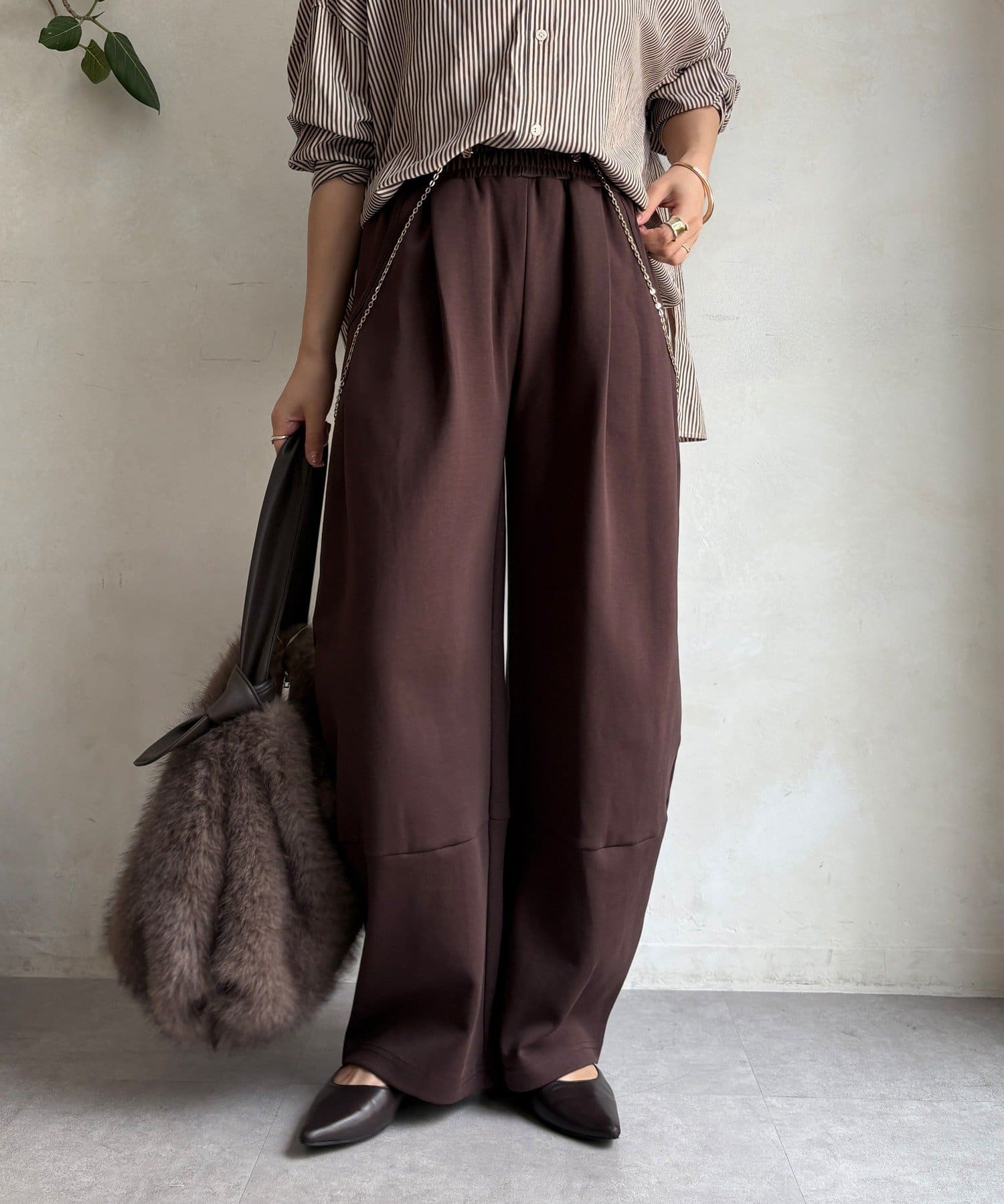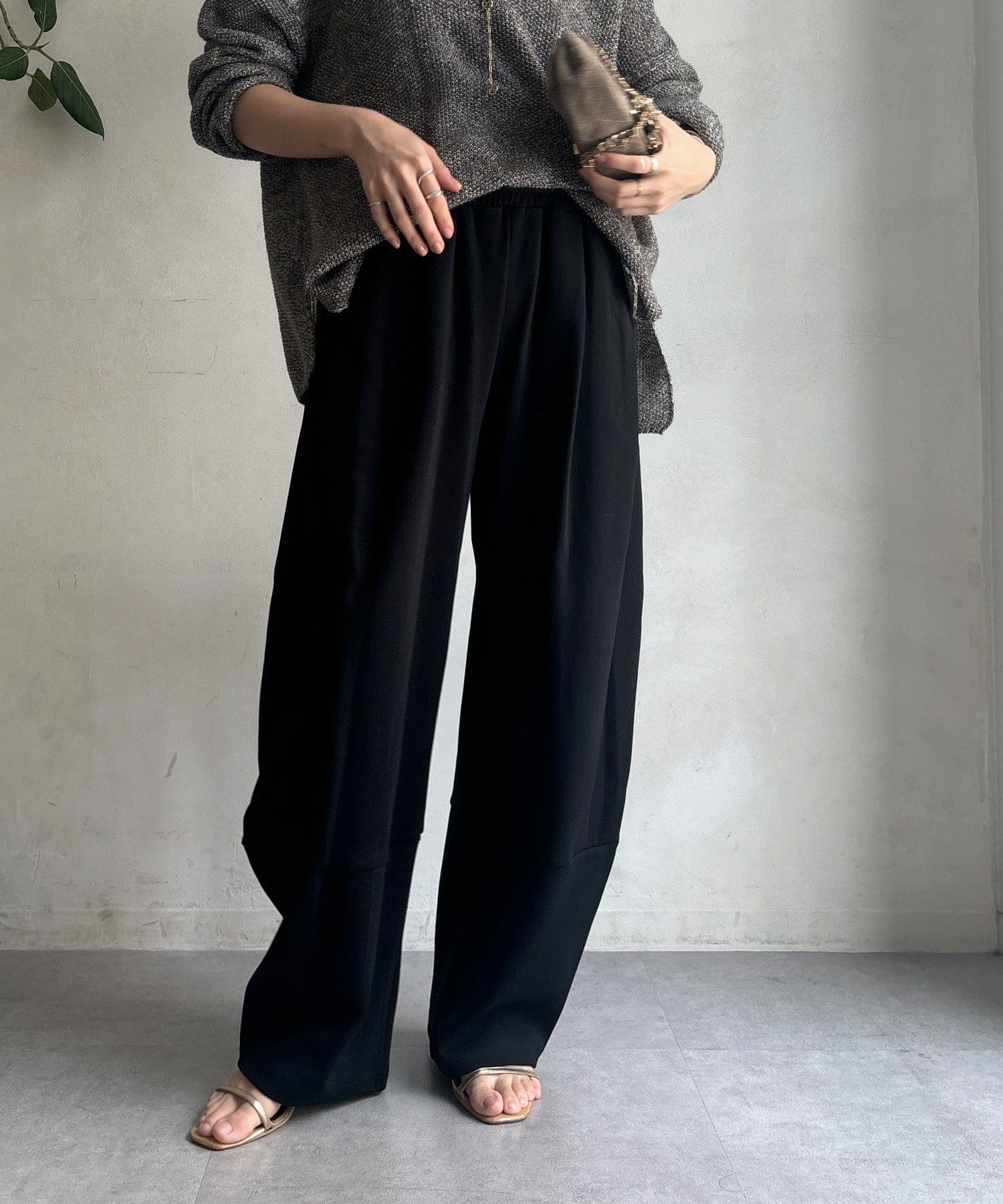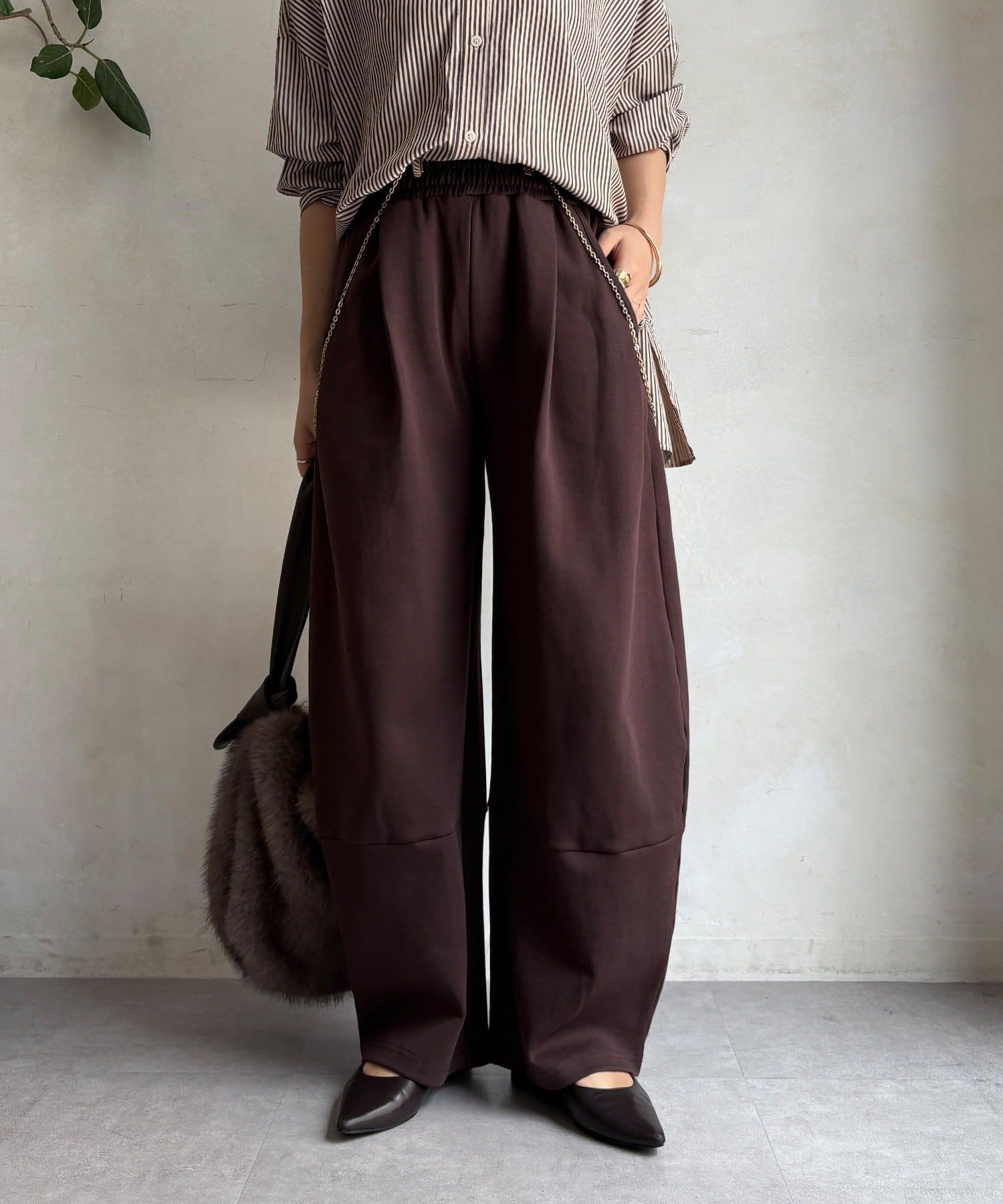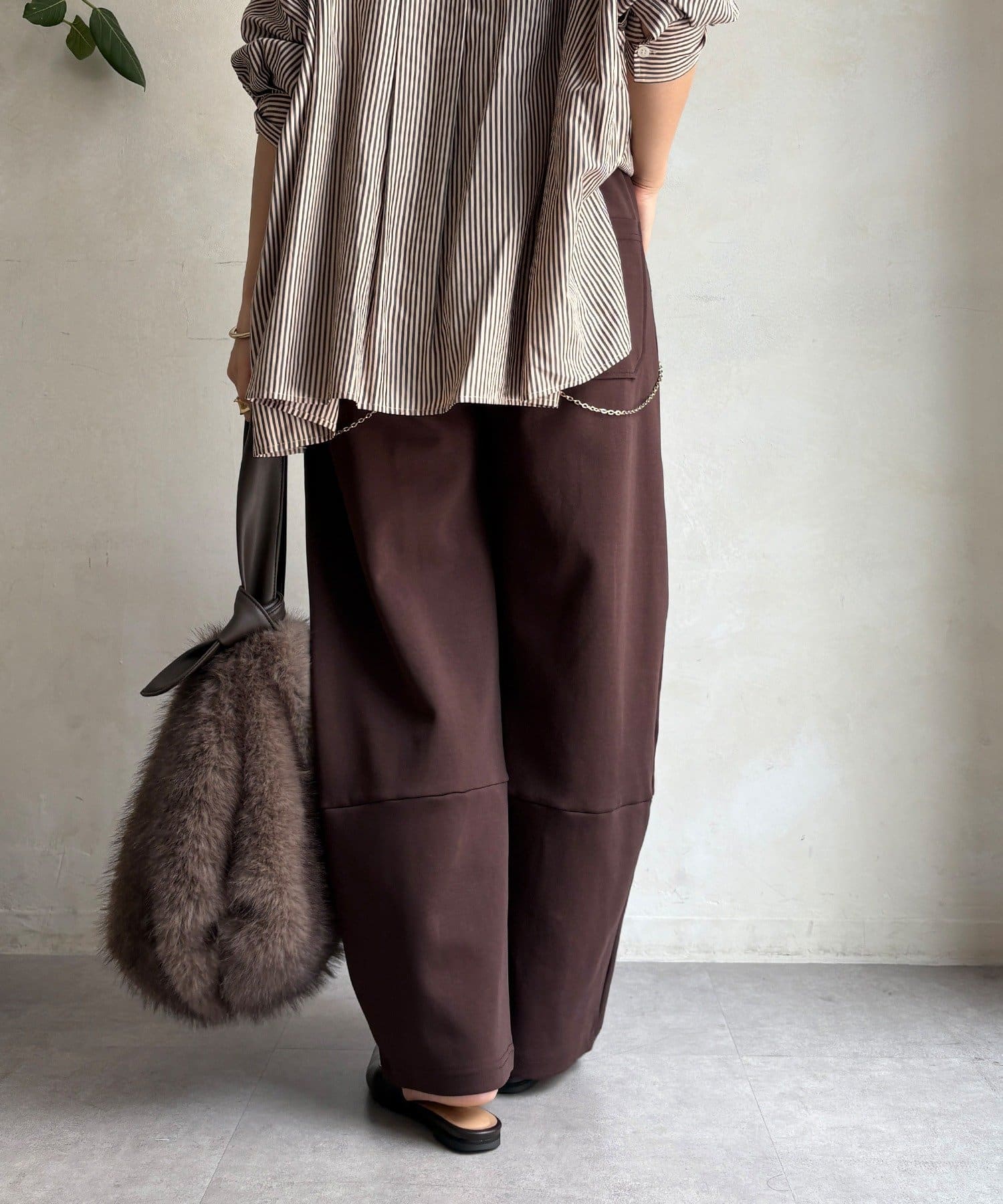 ウエストは総ゴム仕様でストレスフリーで、トップスインもアウトもバランスよく決まり、オン・オフ問わず使える万能アイテムですよ。