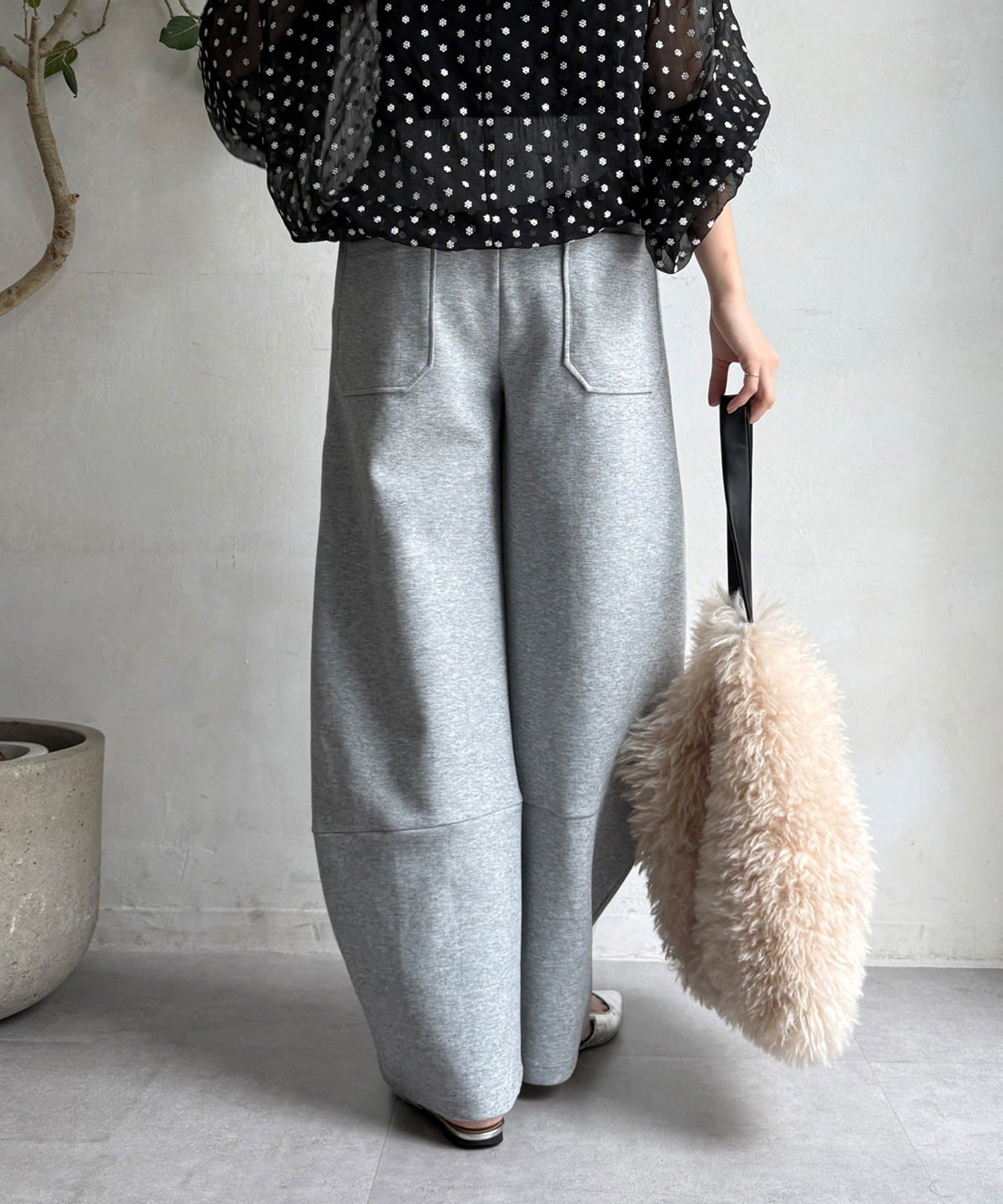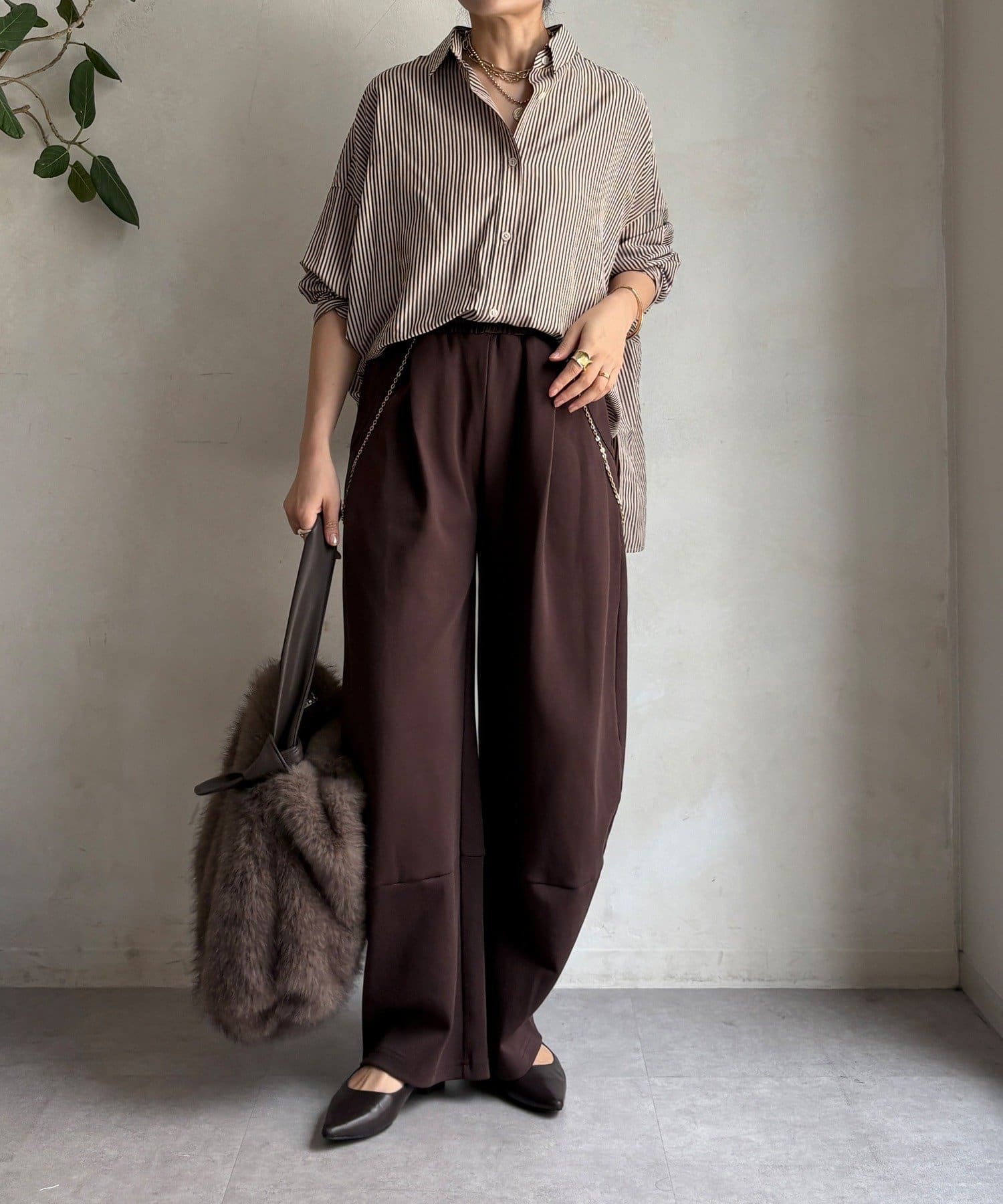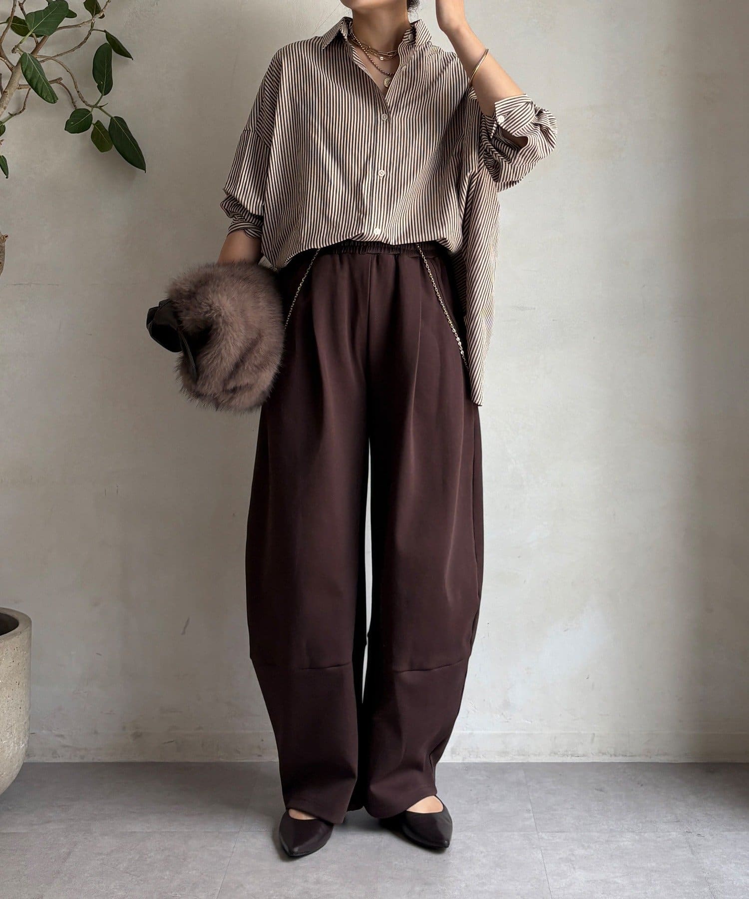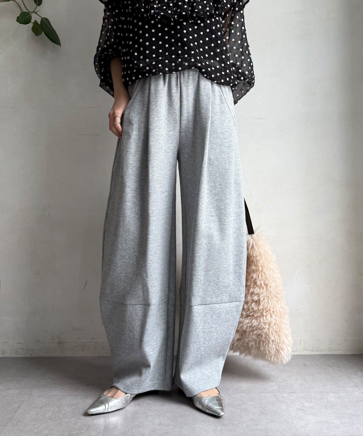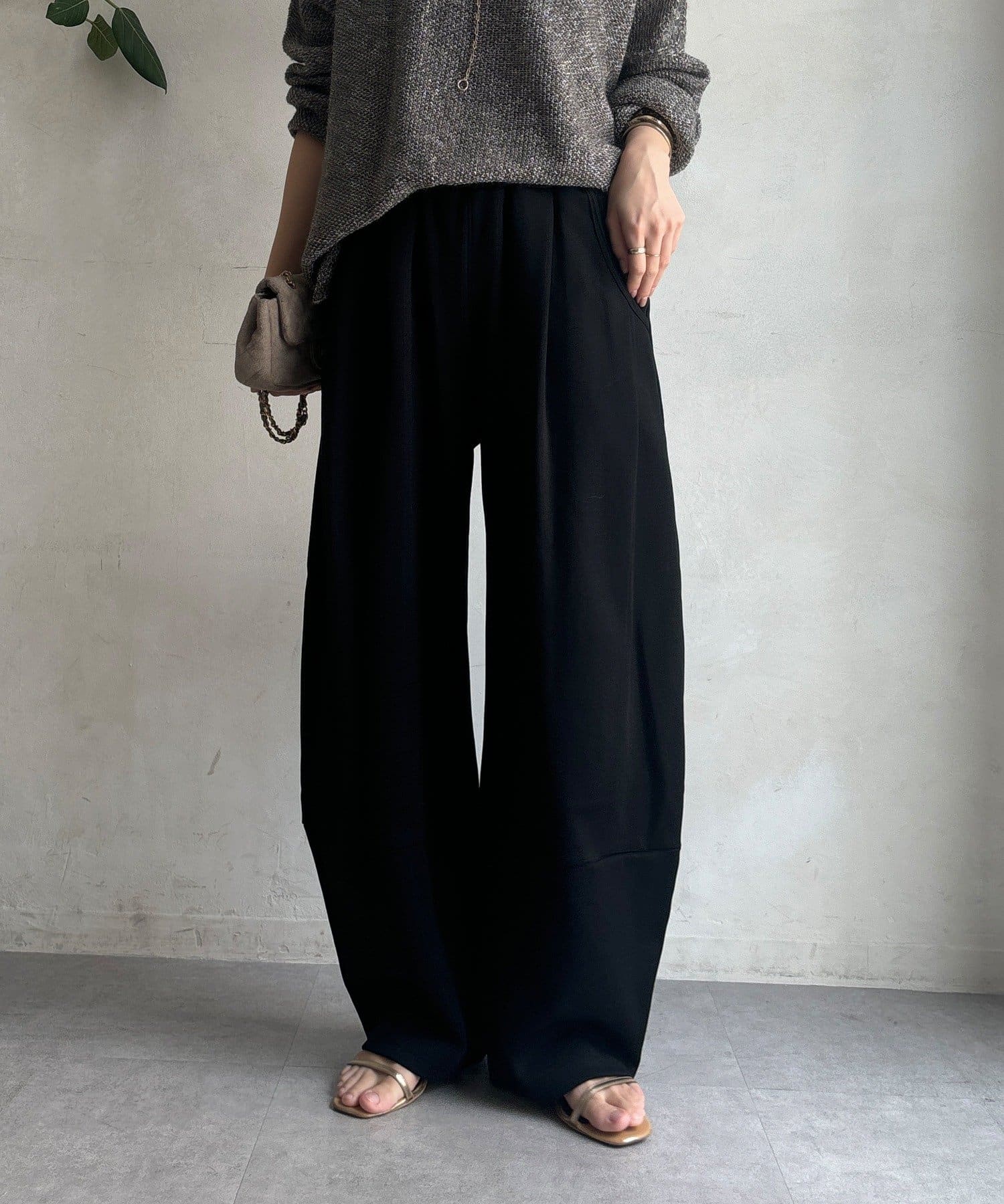 ウエストは総ゴム仕様でストレスフリーで、トップスインもアウトもバランスよく決まり、オン・オフ問わず使える万能アイテムですよ。