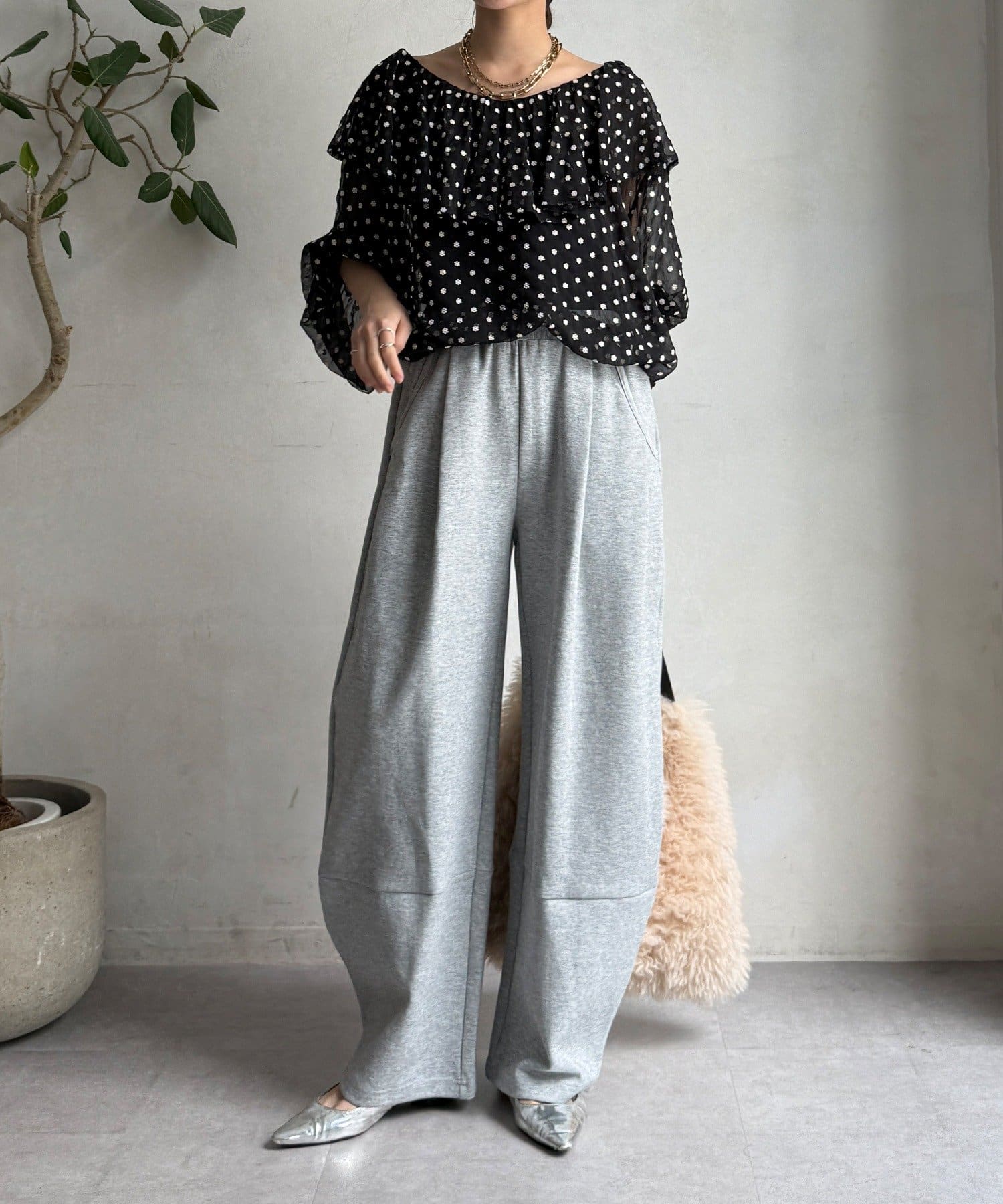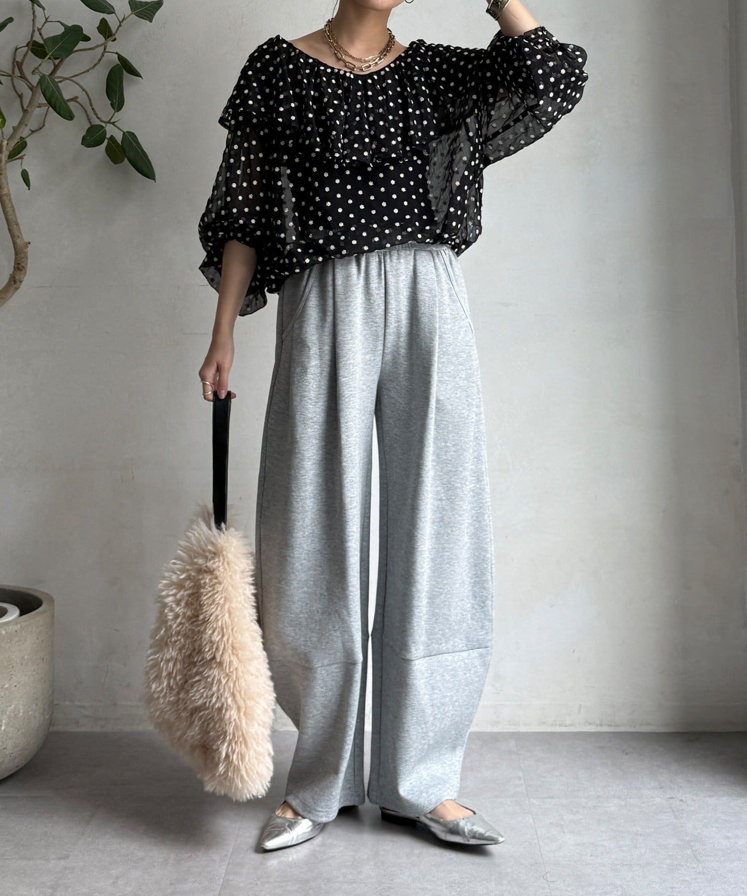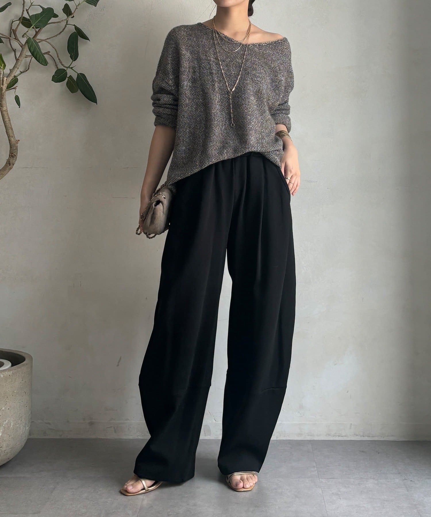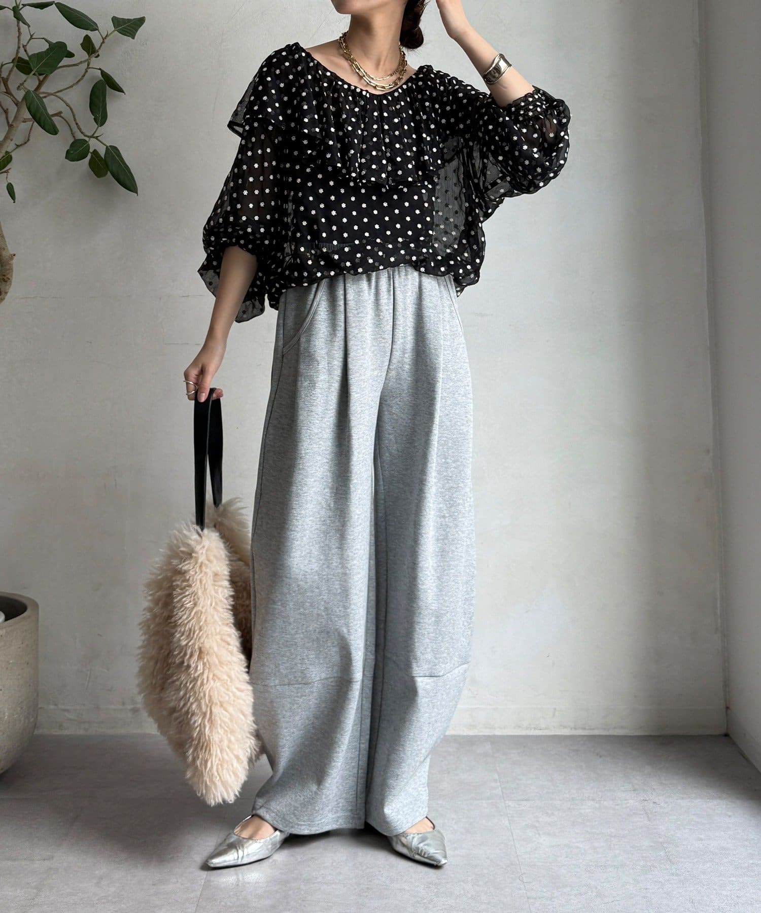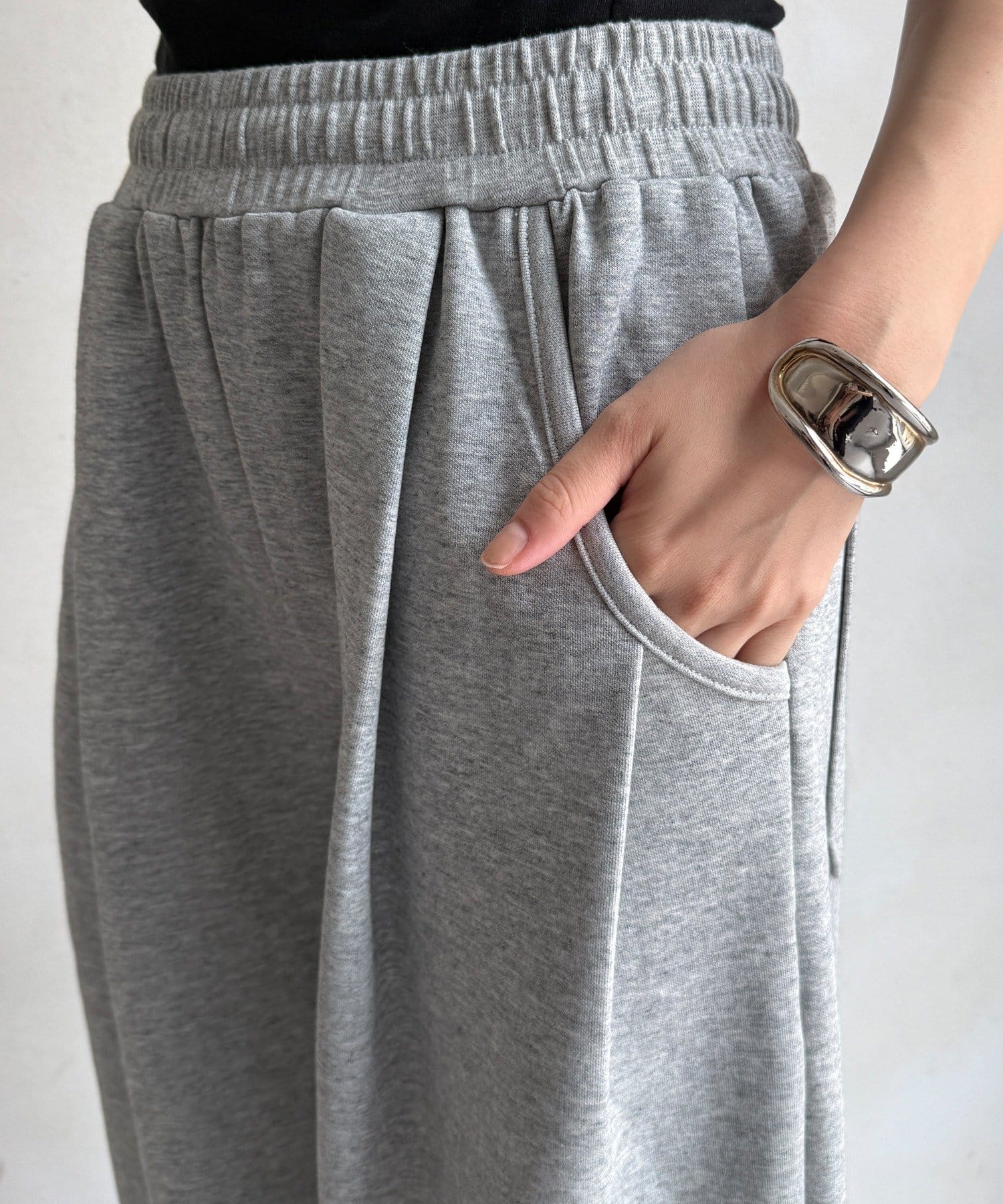 ウエストは総ゴム仕様でストレスフリーで、トップスインもアウトもバランスよく決まり、オン・オフ問わず使える万能アイテムですよ。