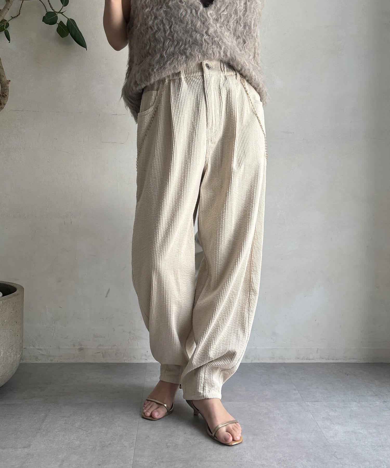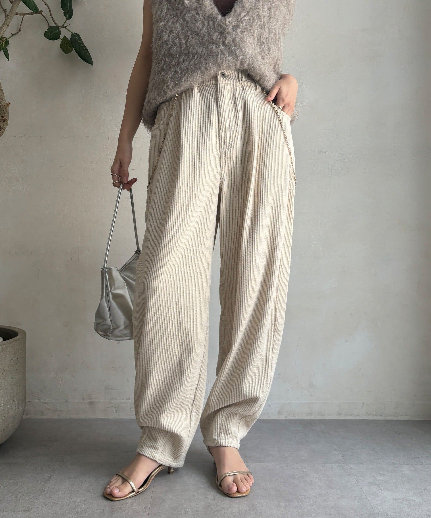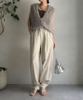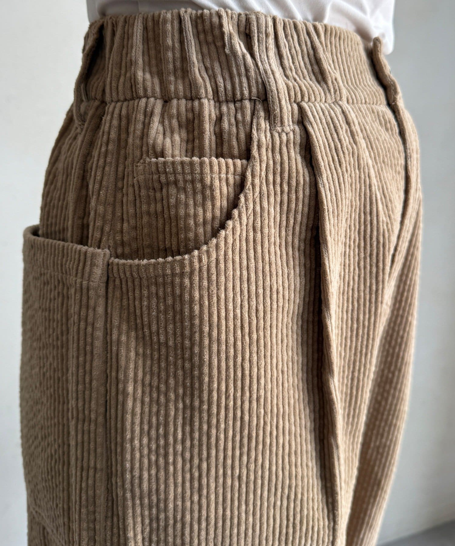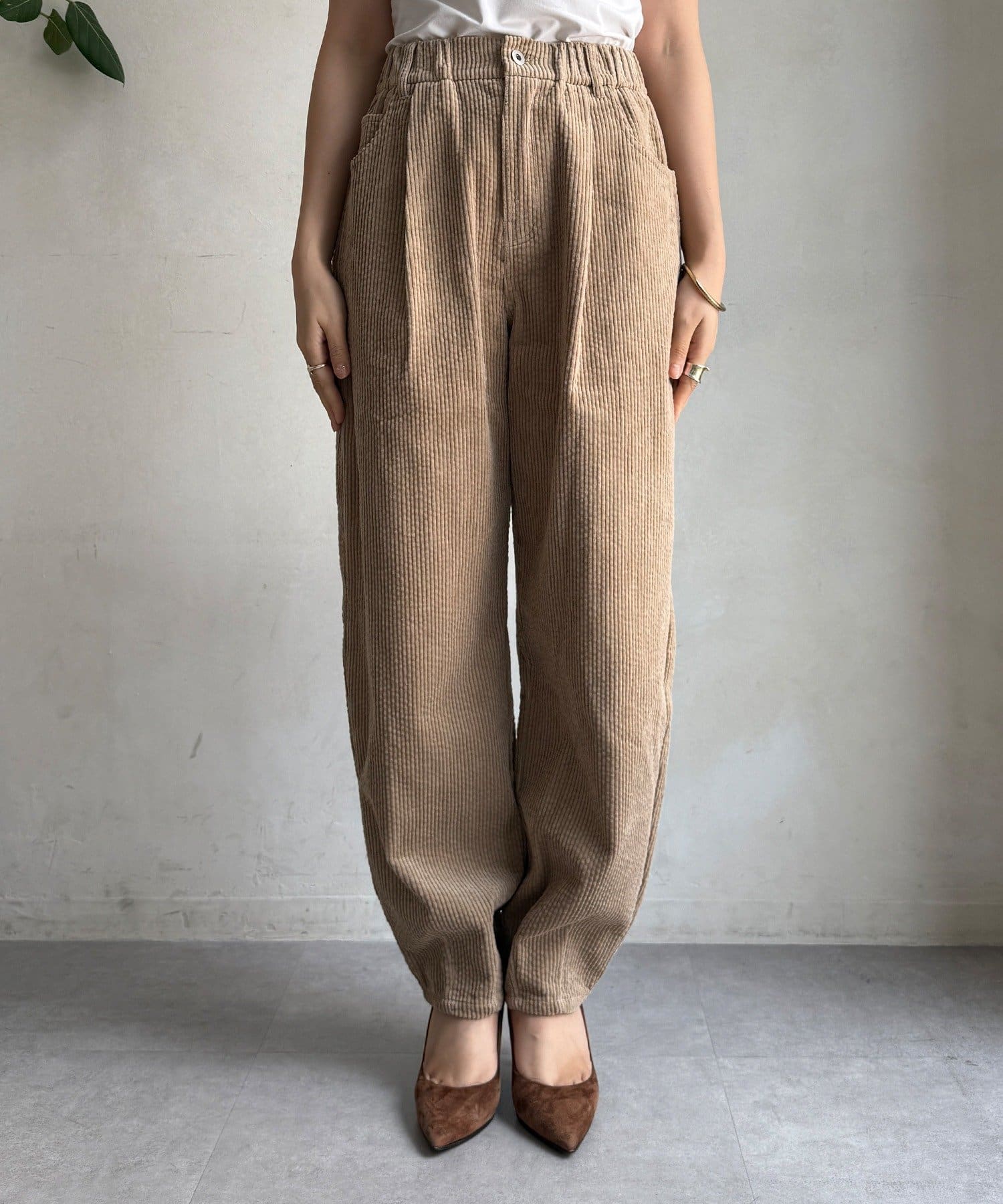ウエストはゴム仕様なので、ストレスフリーでトップスインもアウトもバランスよく決まり、オン・オフ問わず使える万能アイテムですよ。