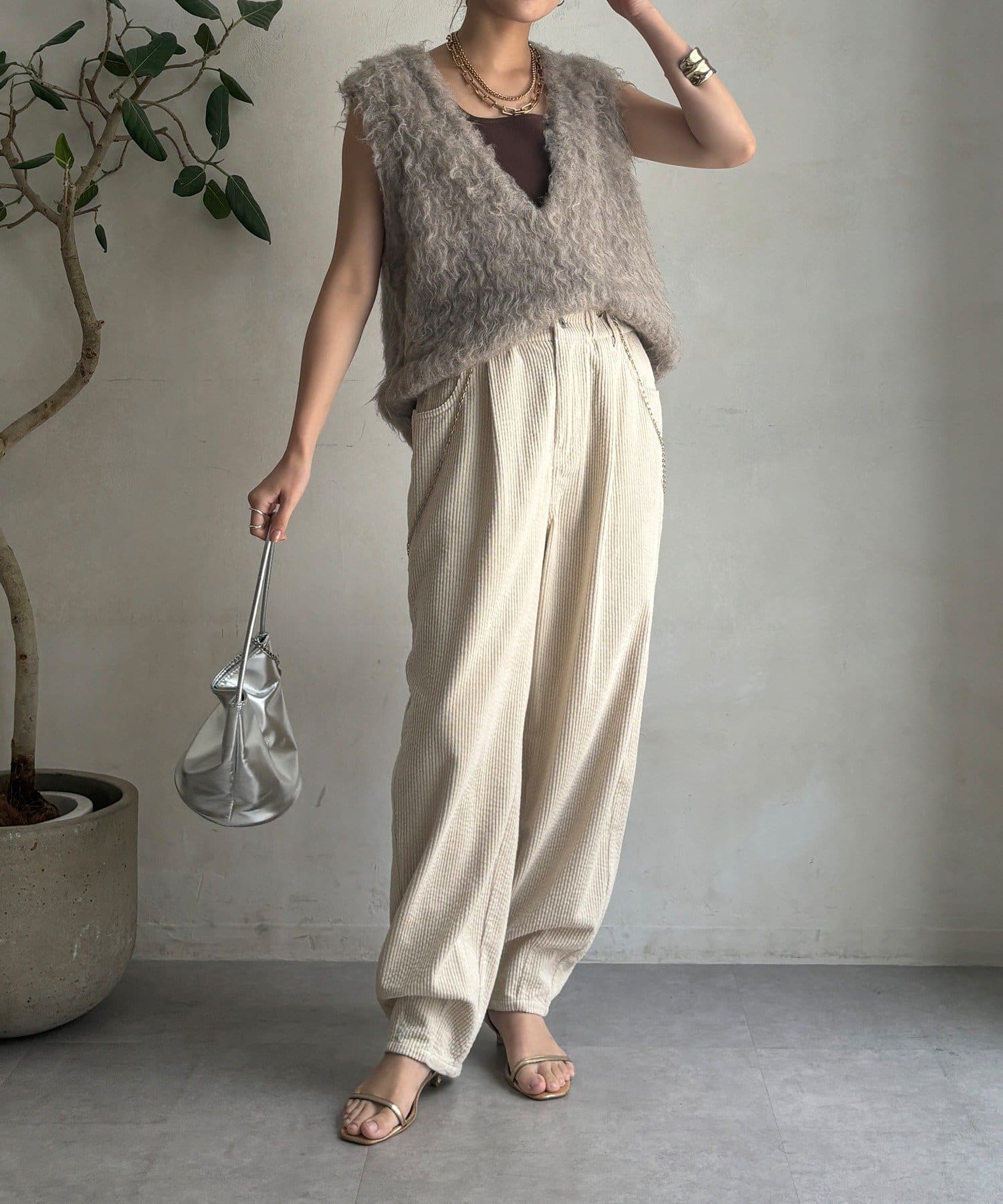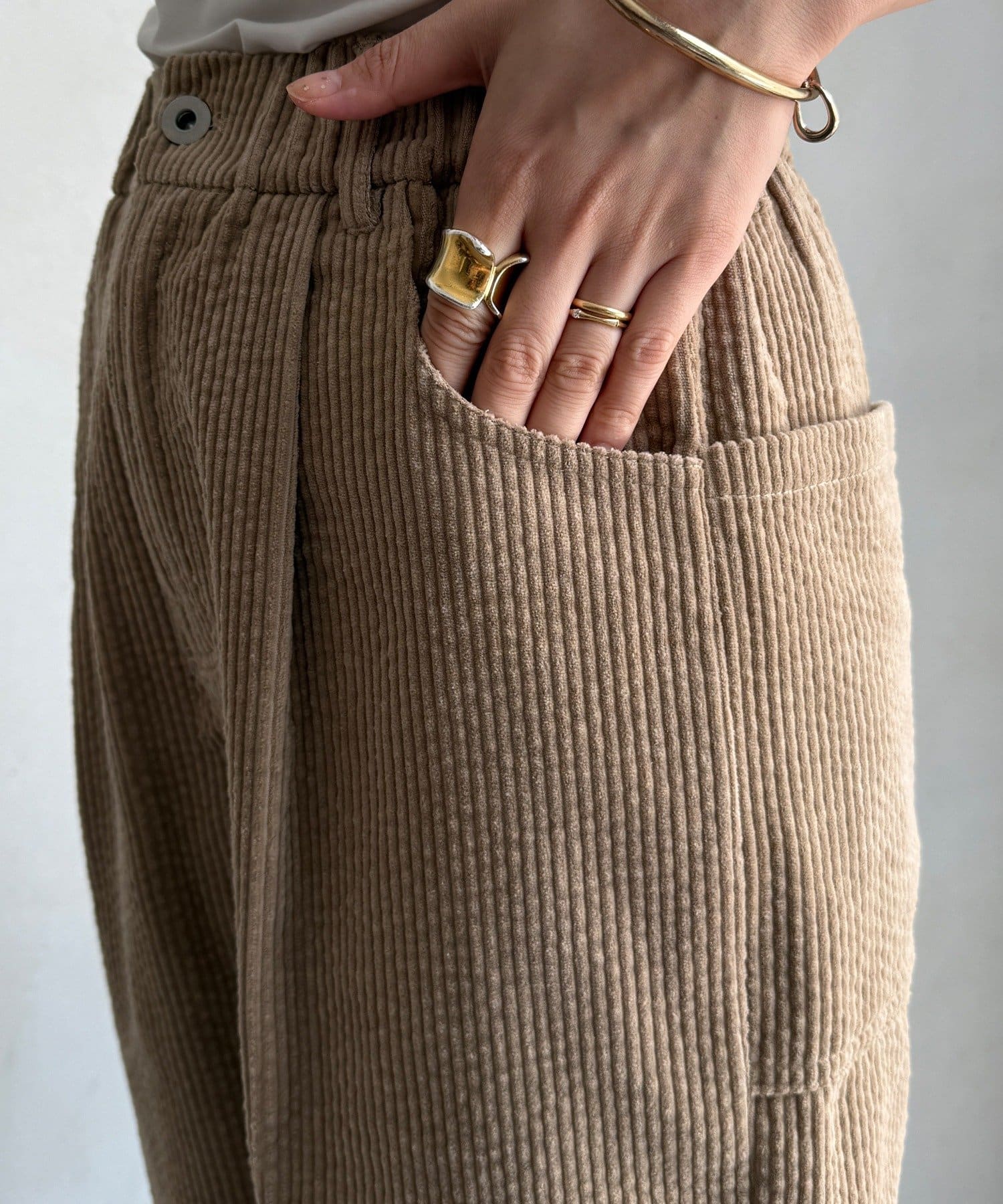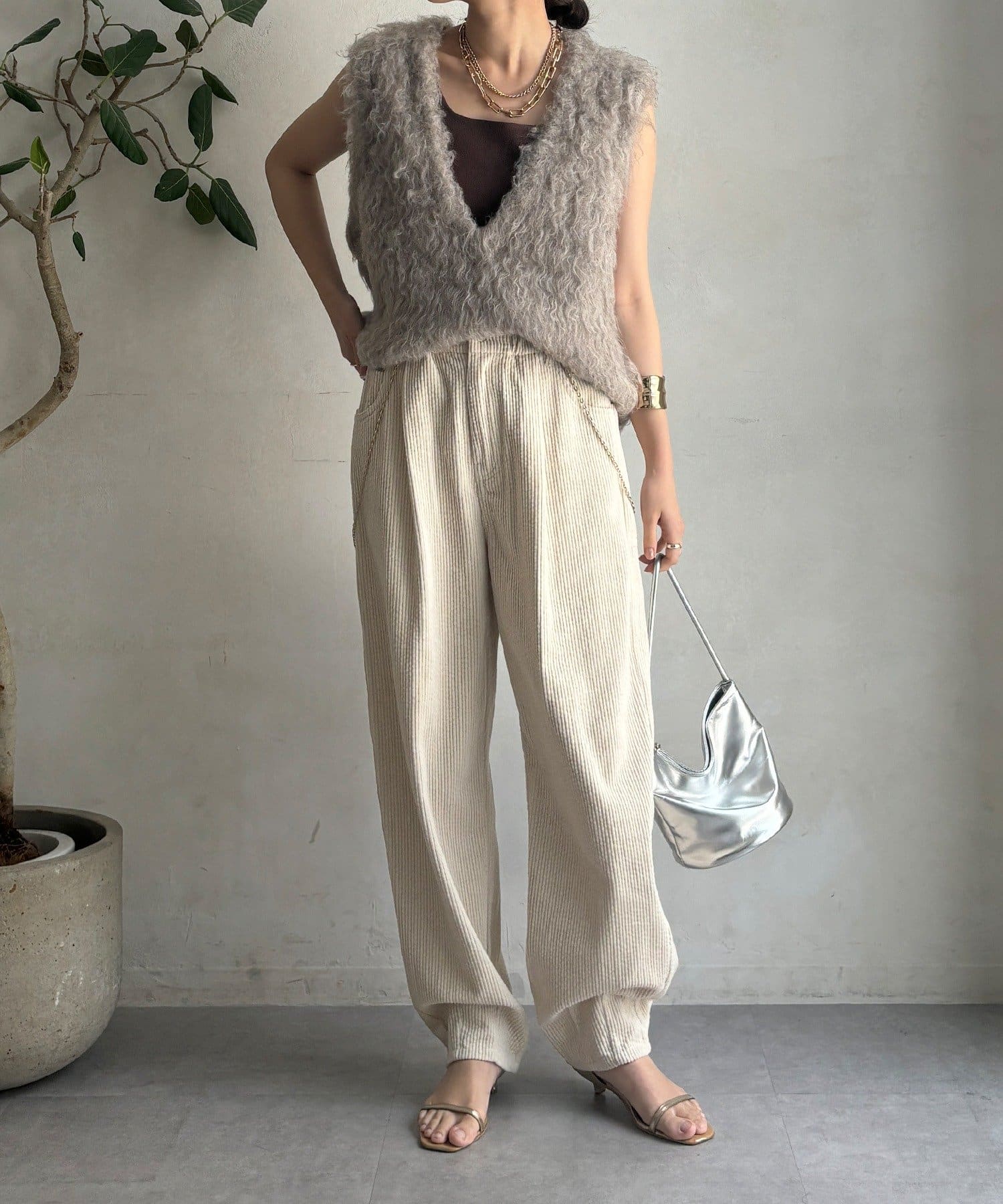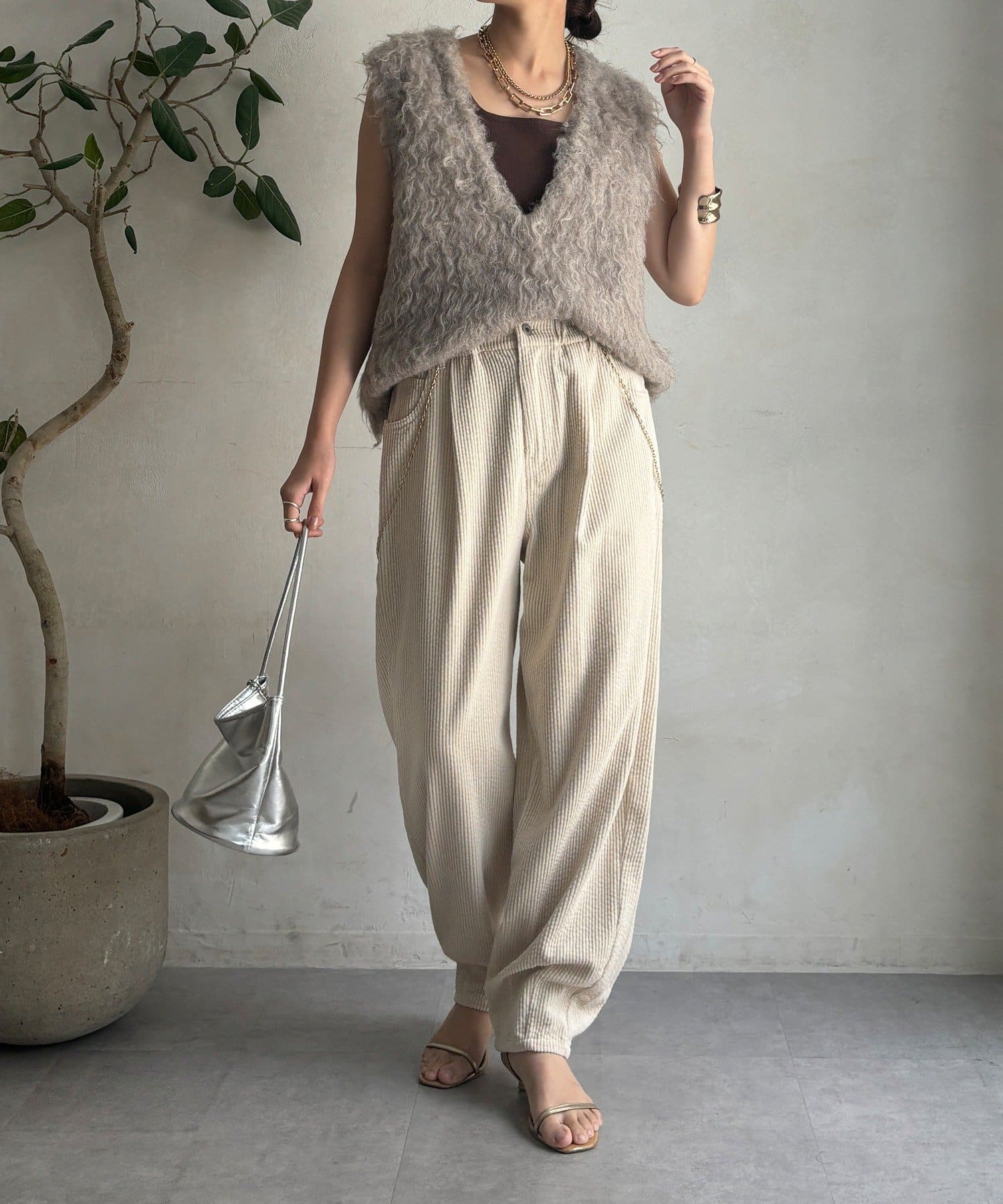 ウエストはゴム仕様なので、ストレスフリーでトップスインもアウトもバランスよく決まり、オン・オフ問わず使える万能アイテムですよ。