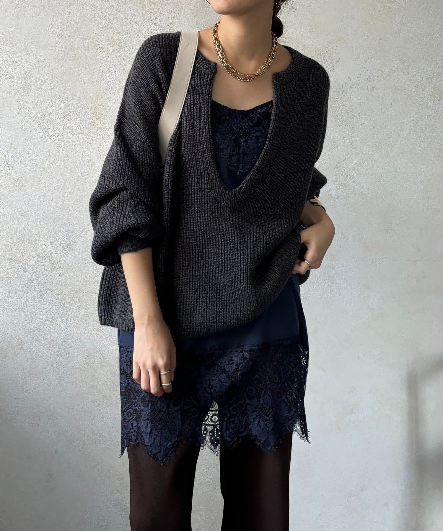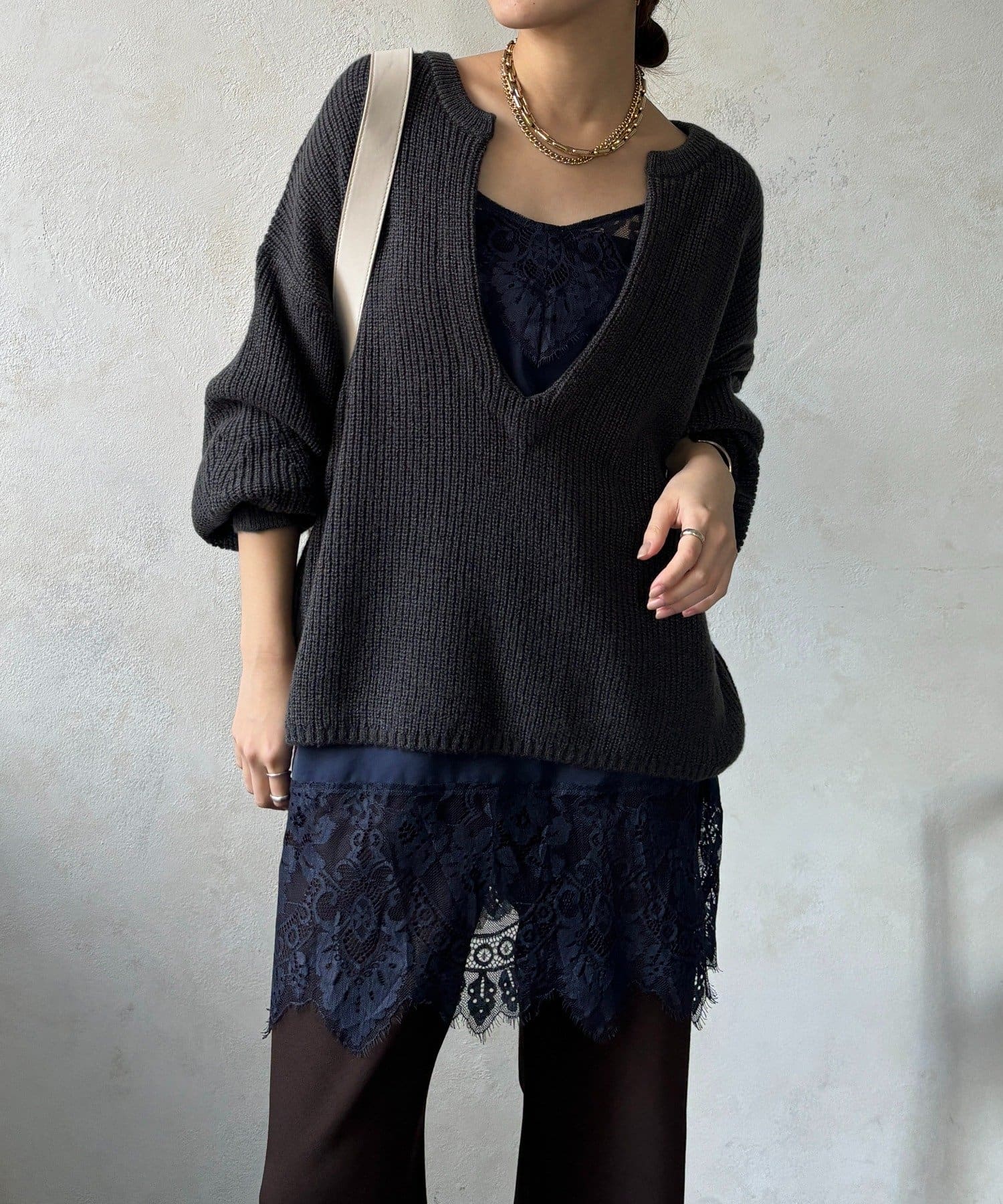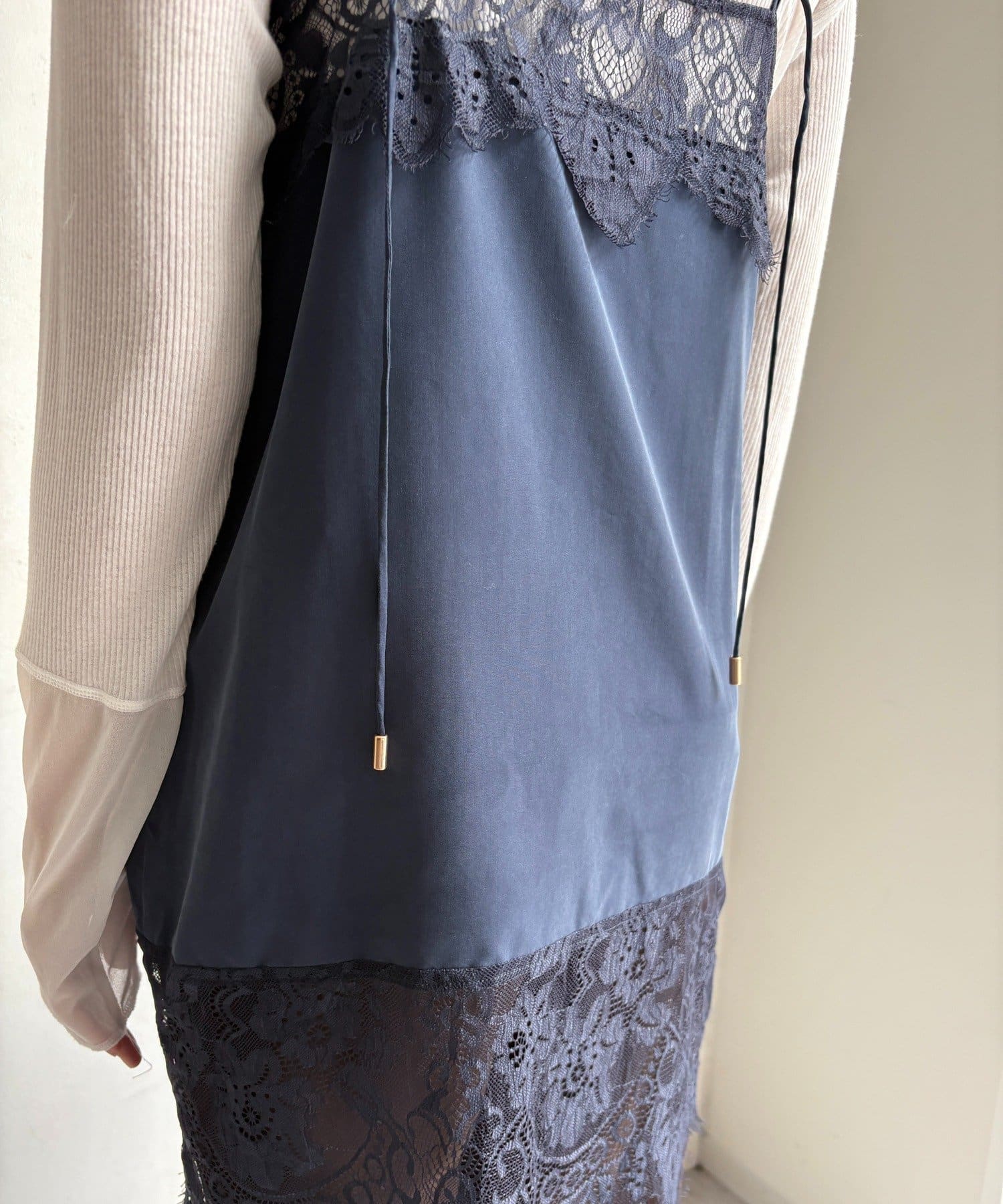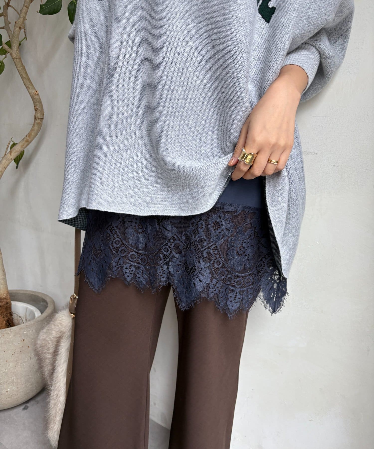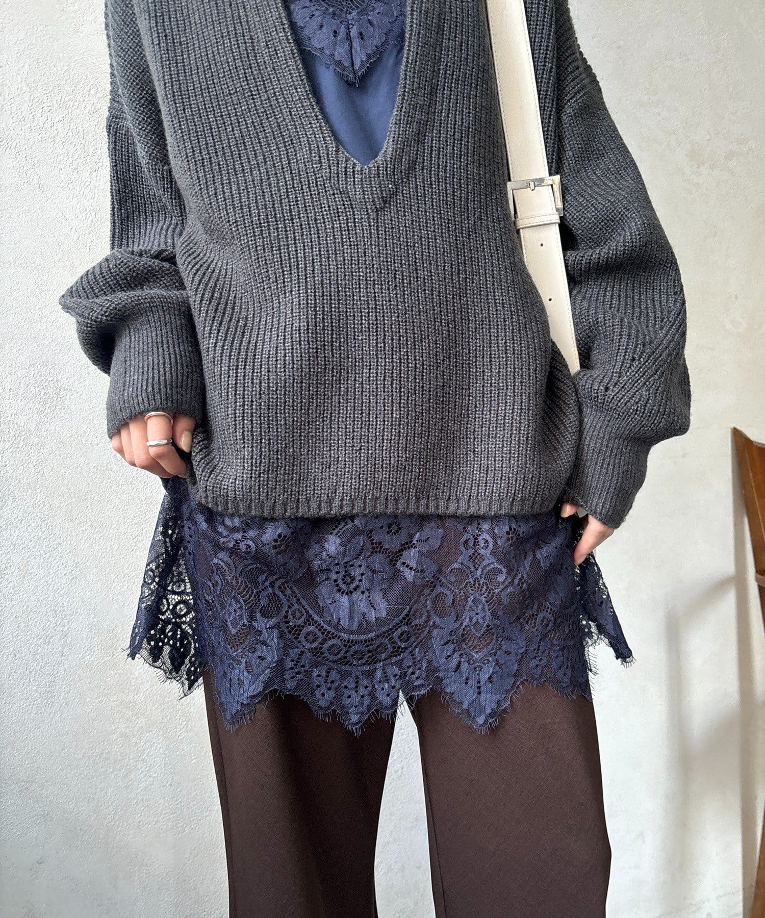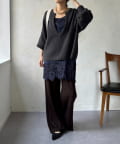 ネックラインと裾にあしらわれた繊細なレースが目を惹く、