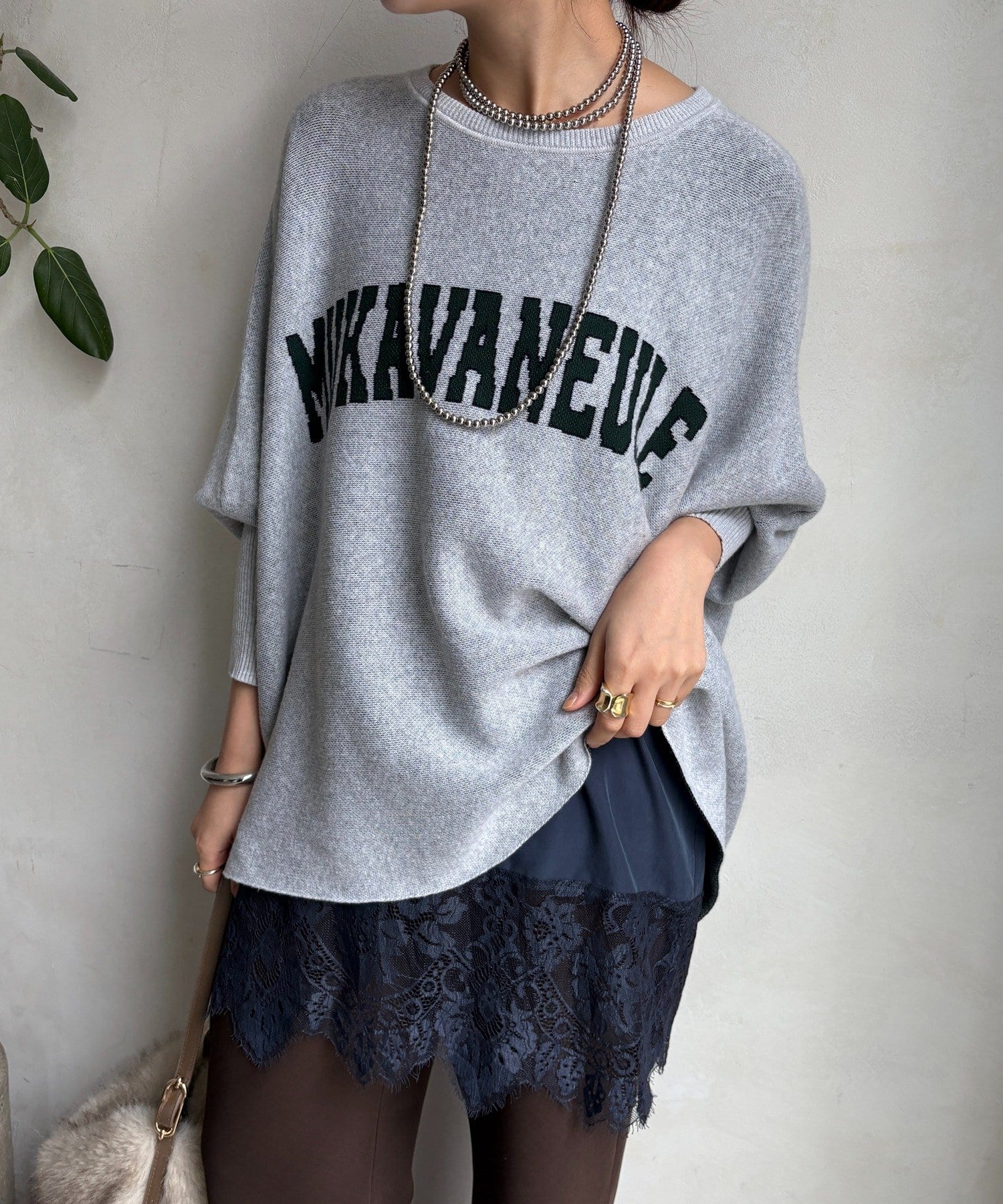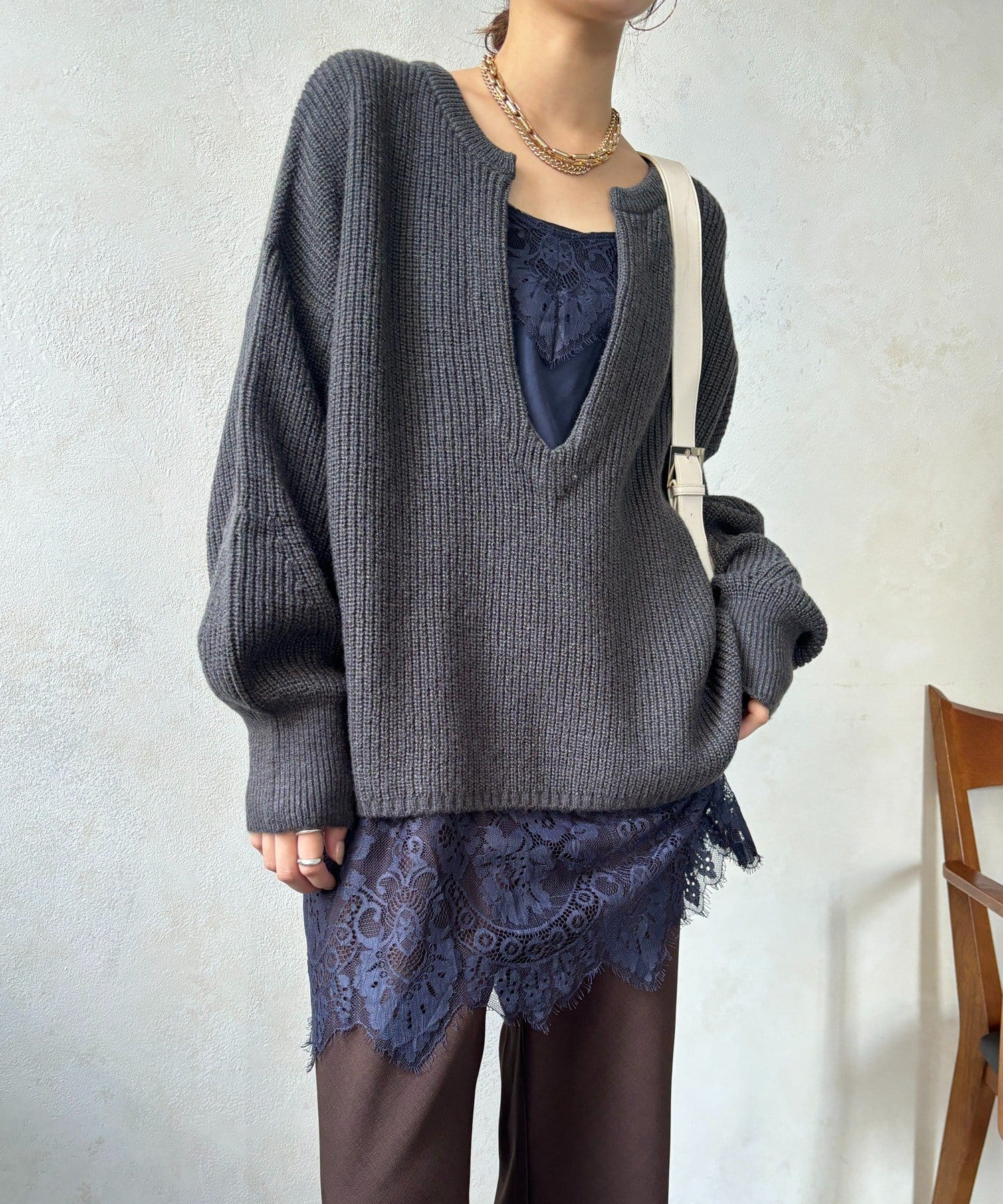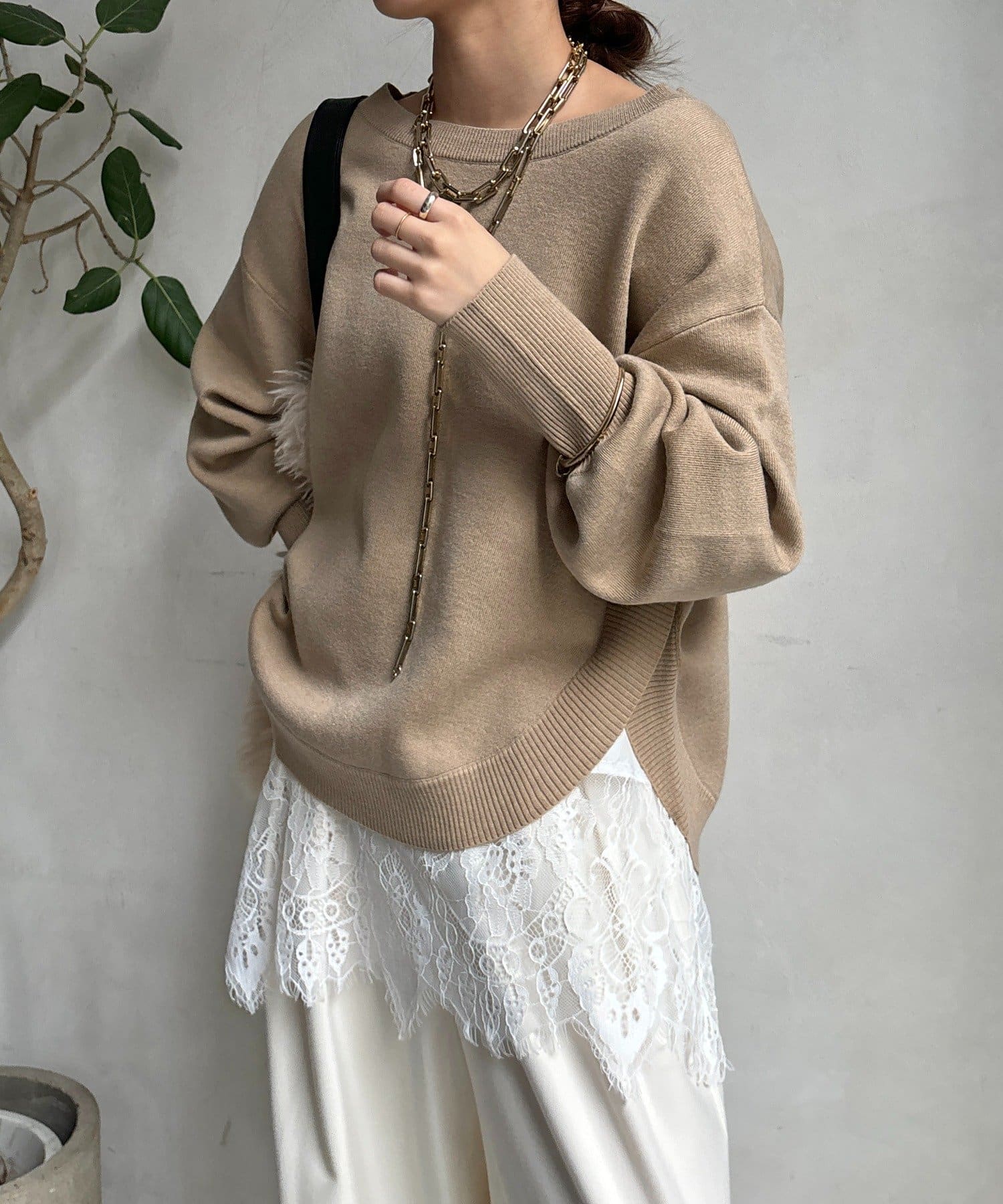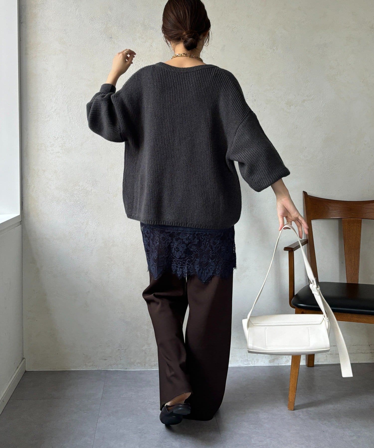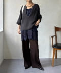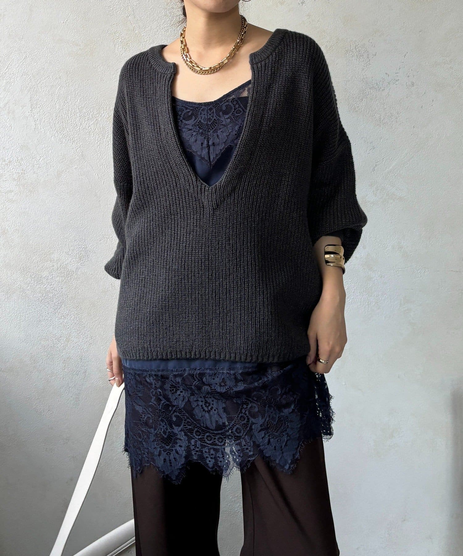 ネックラインと裾にあしらわれた繊細なレースが目を惹く、