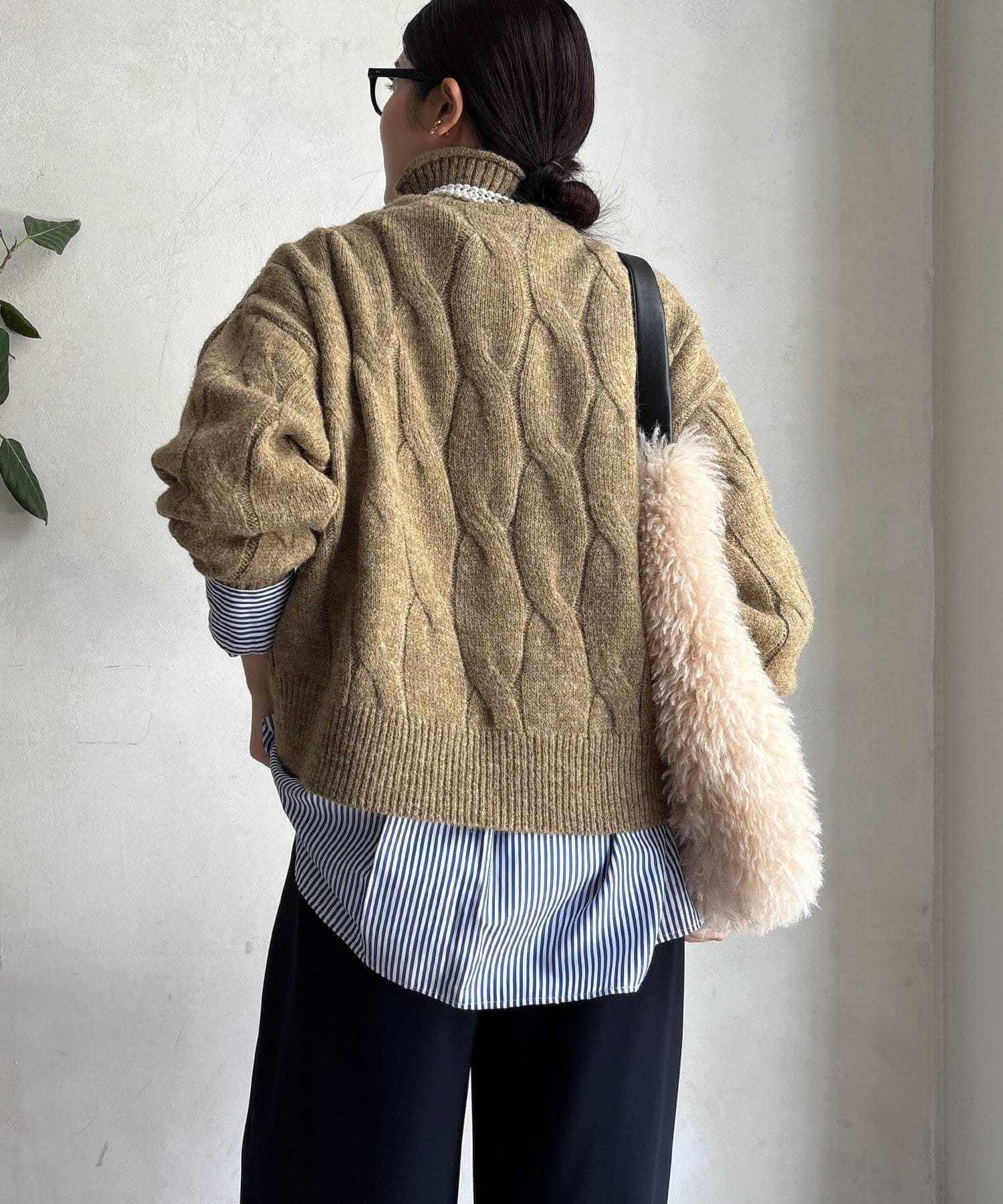 トレンド感あふれるショート丈で、ケーブル編みデザインがスタイリングを引き締めてくれます。