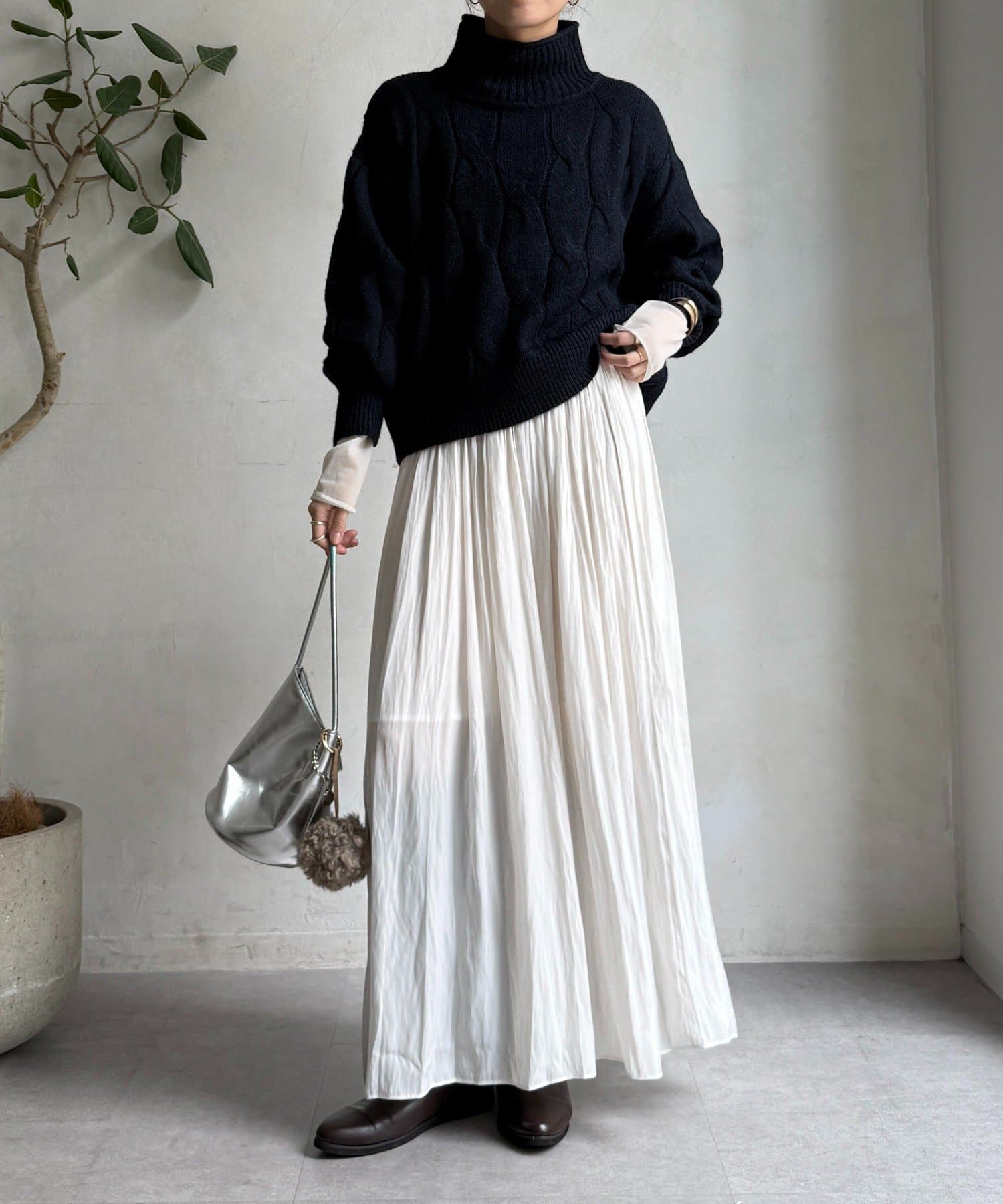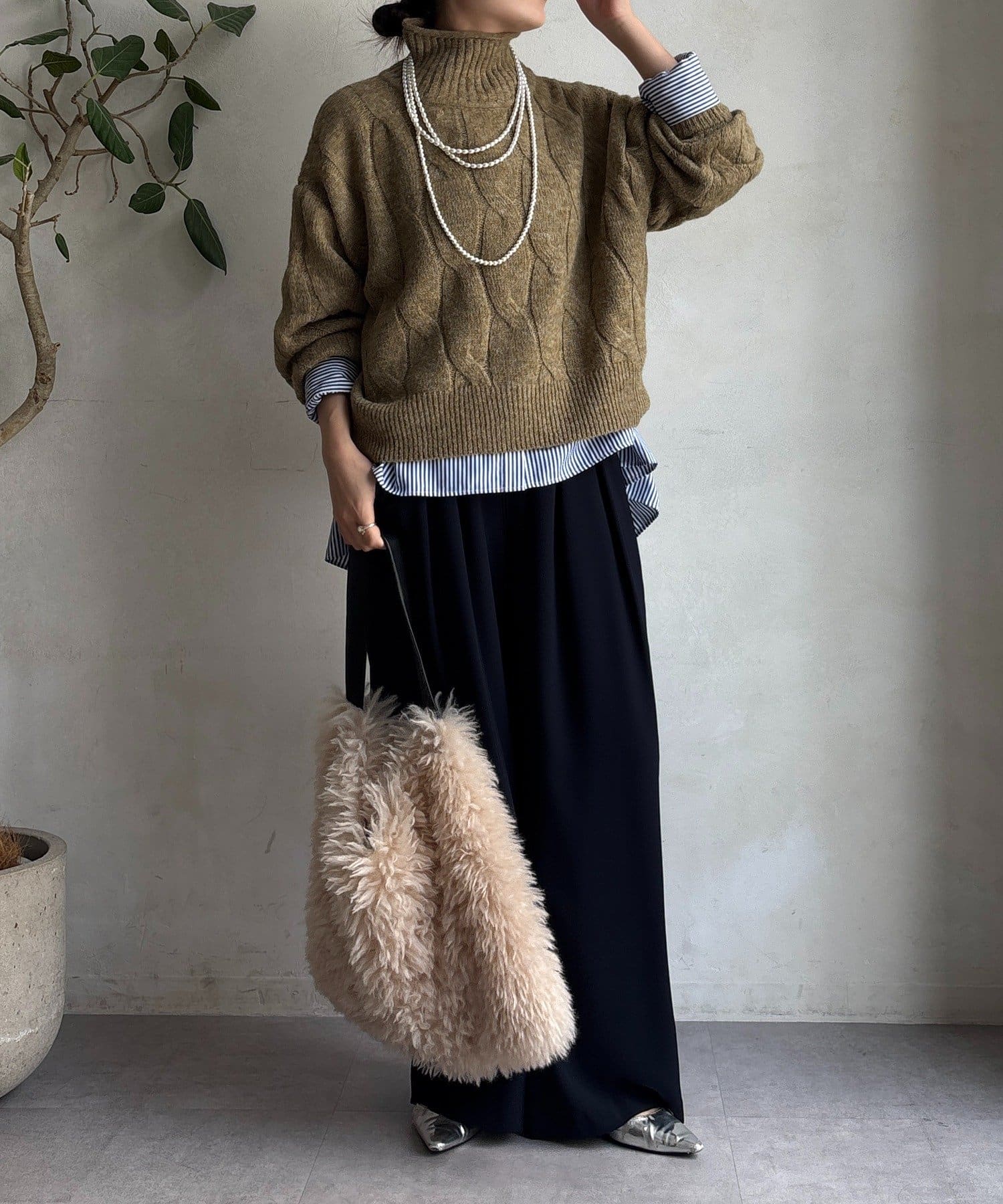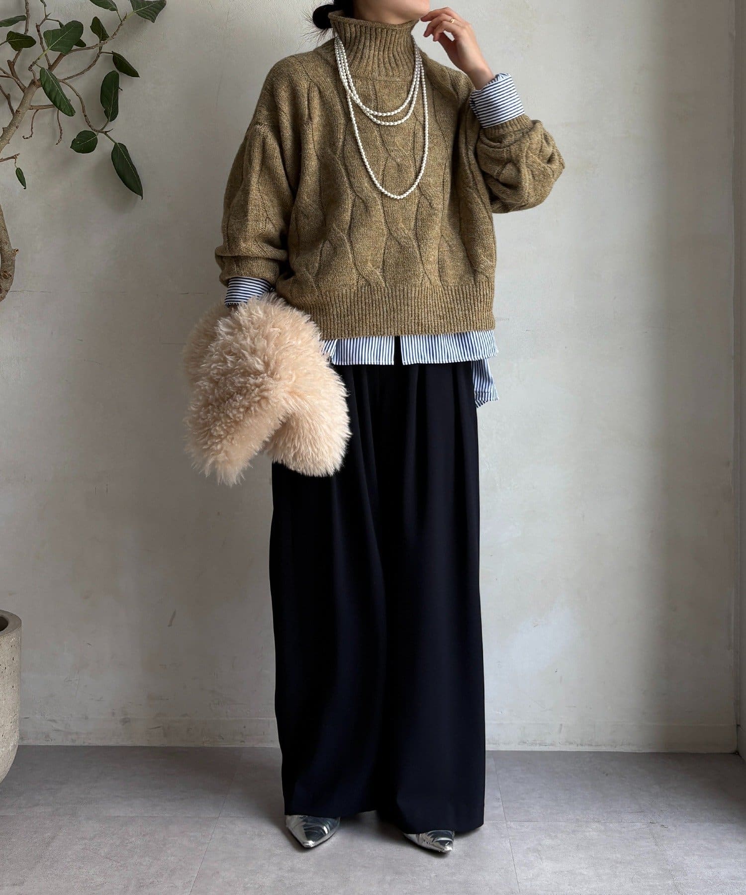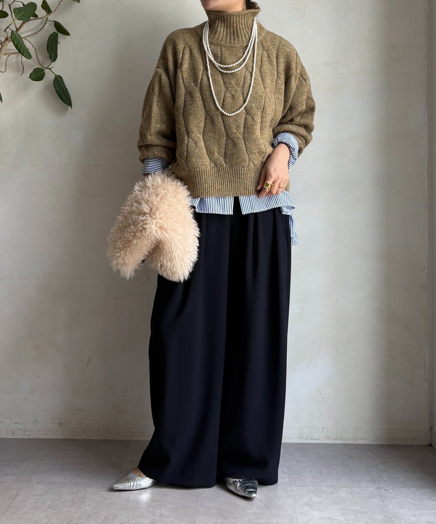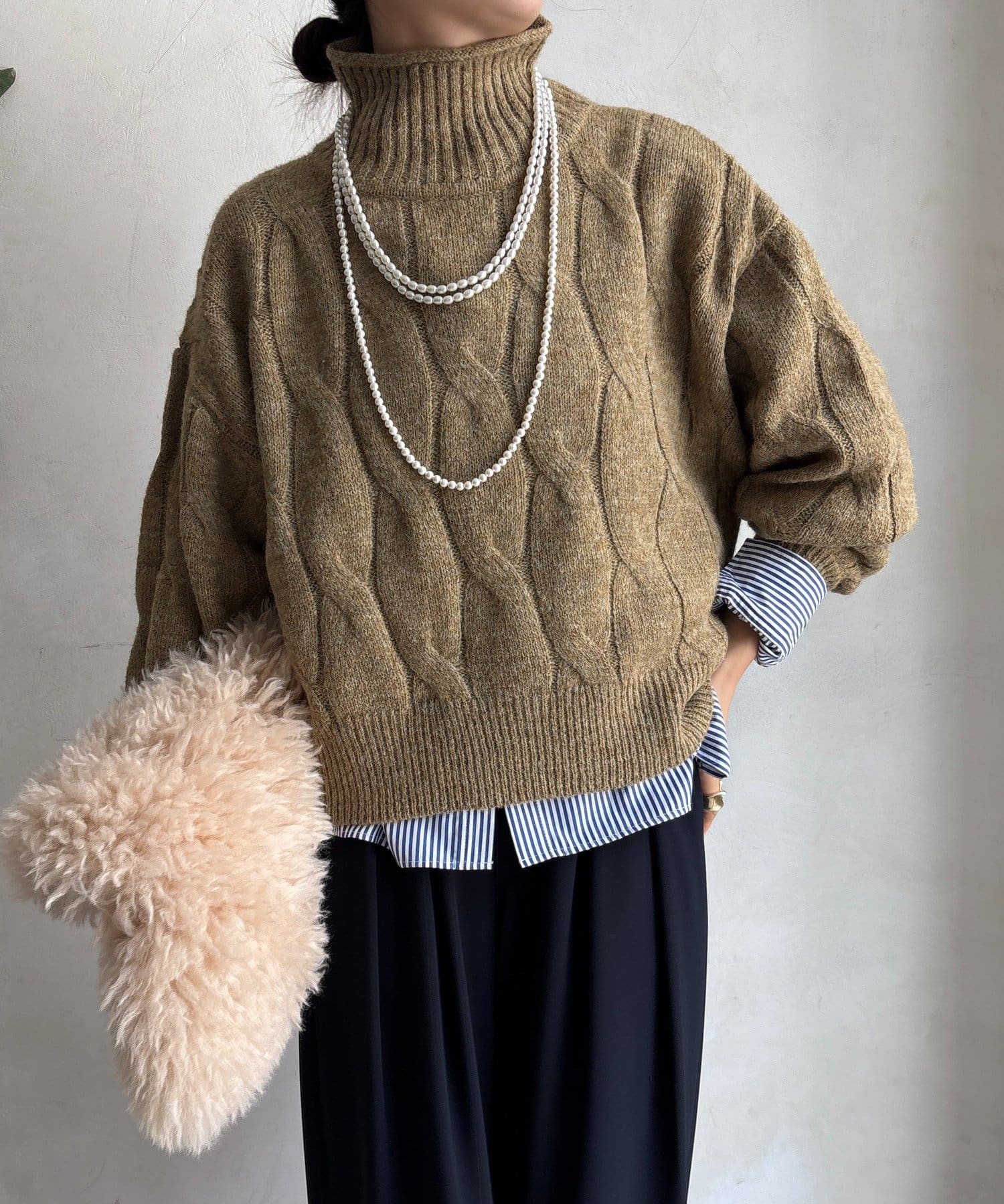 高くなりすぎていないハイネックと、ケーブルラインが特徴的なハイネックプルオーバー!