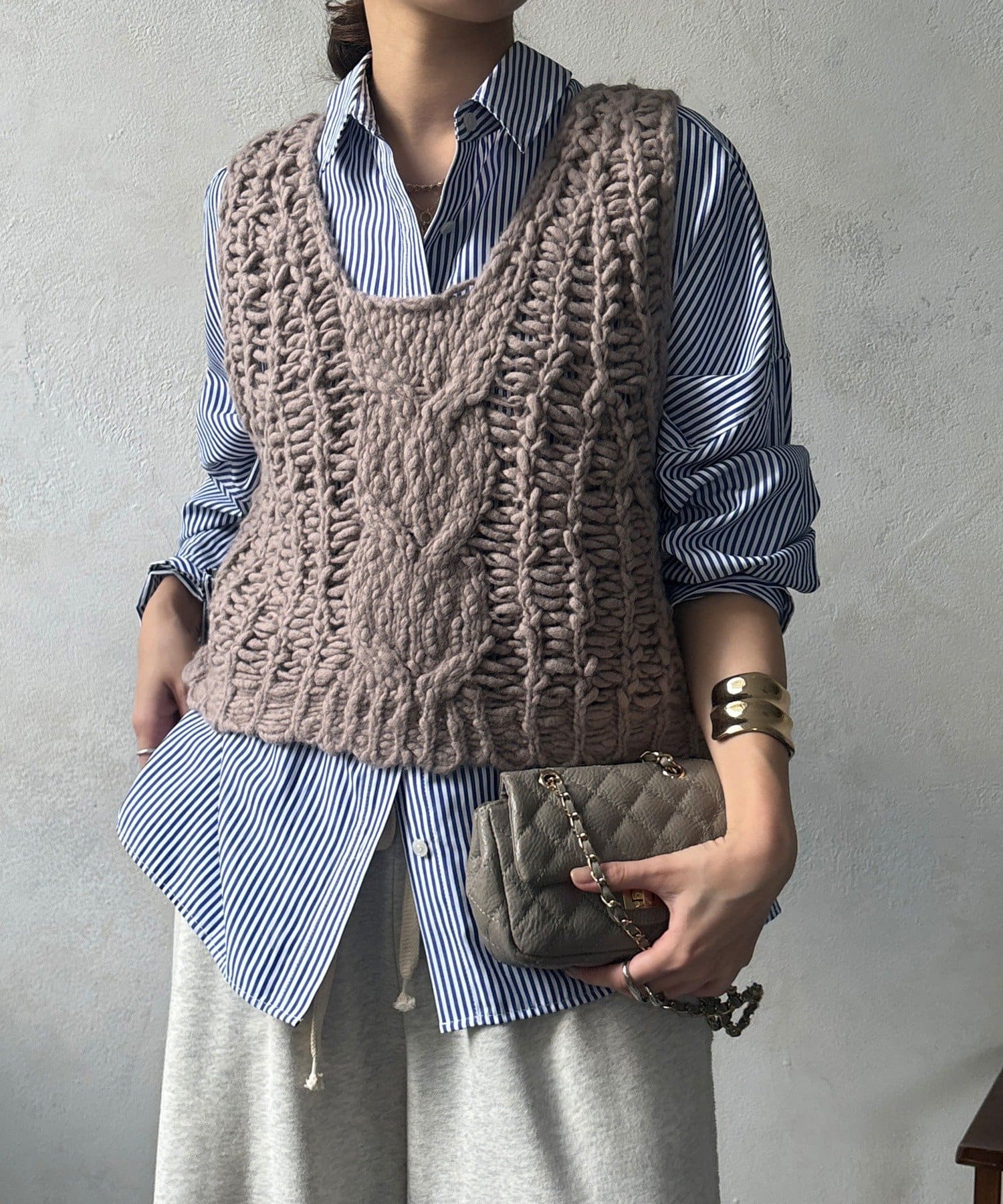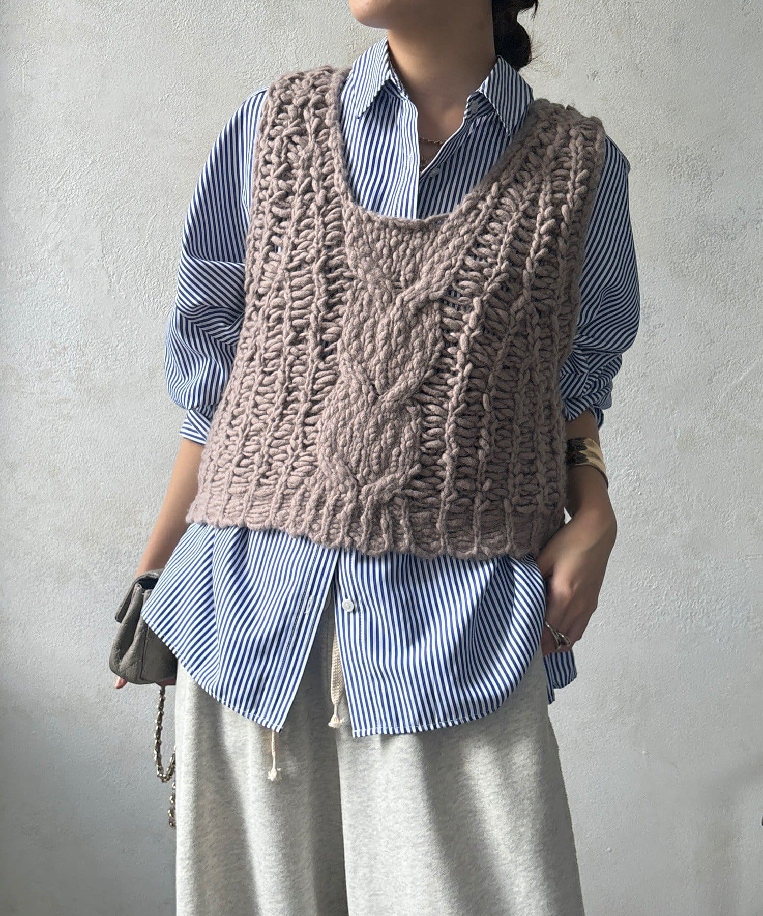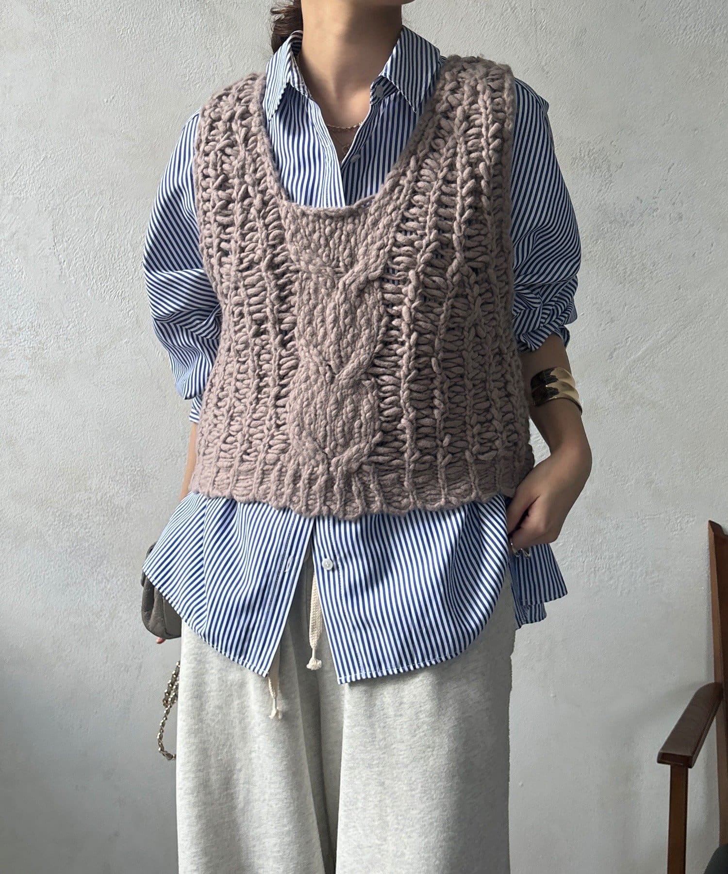 ざっくりとしたローゲージのケーブル編みが目を惹く