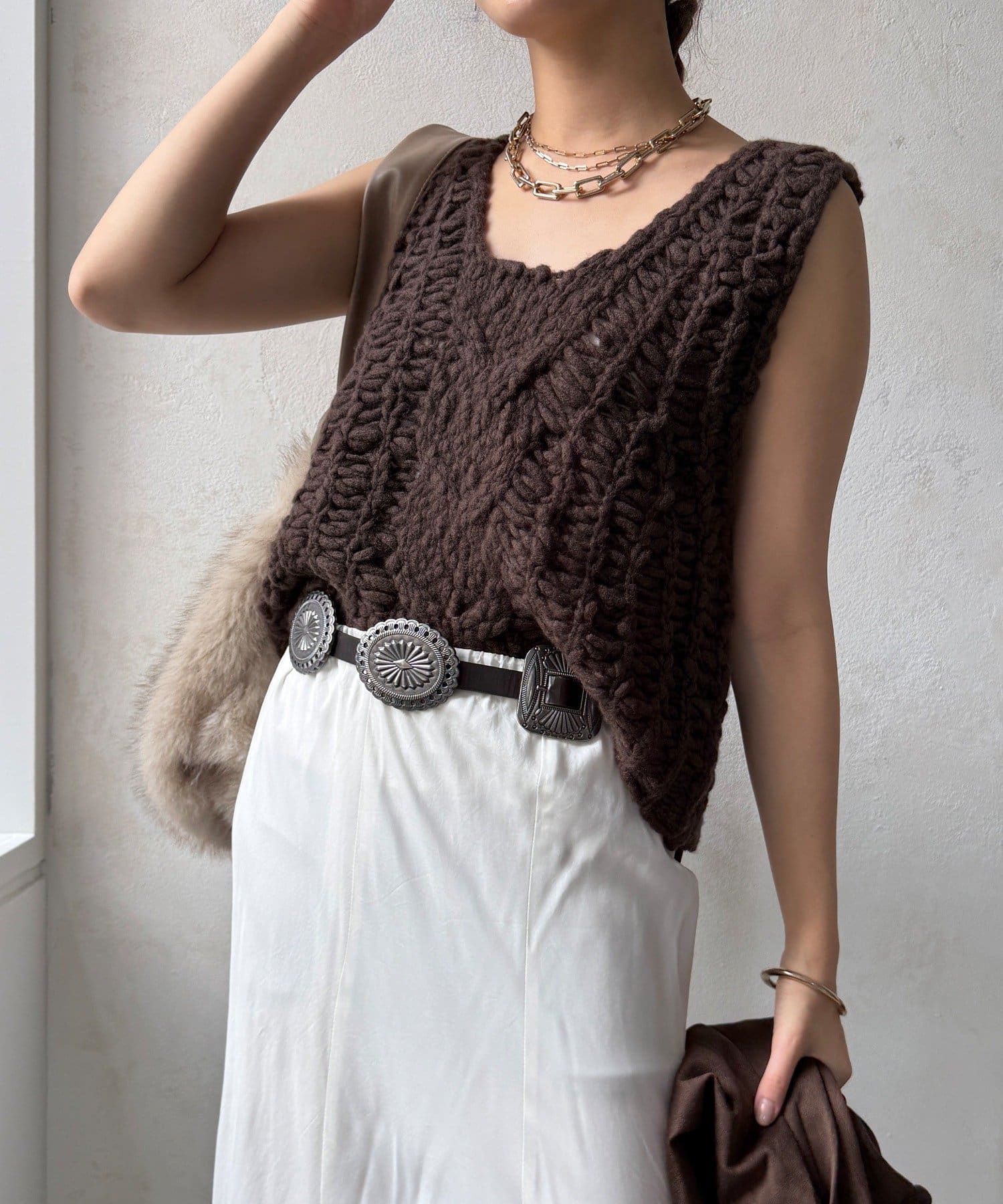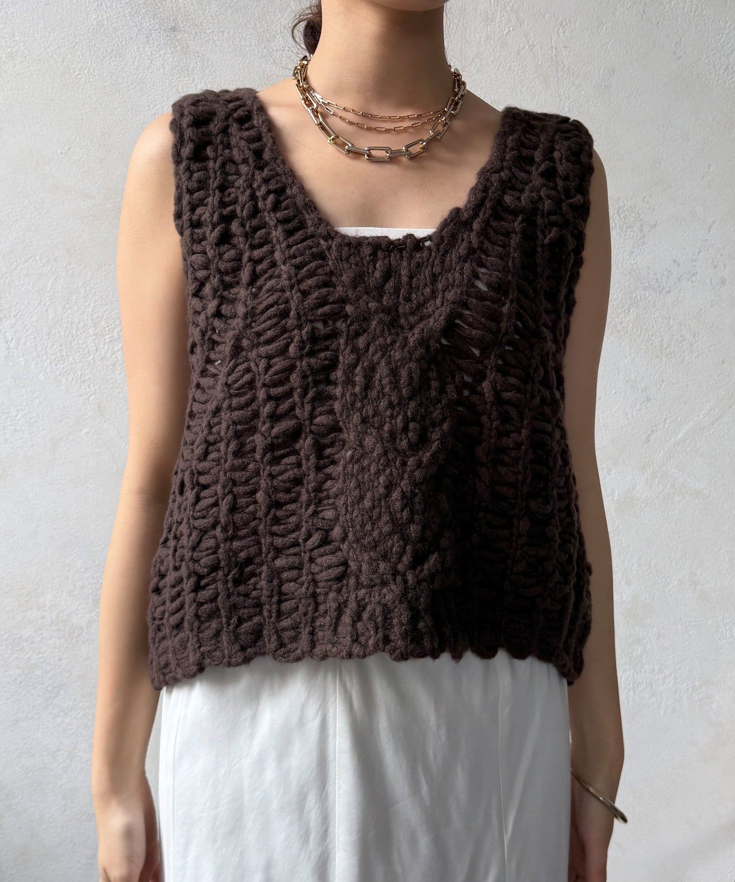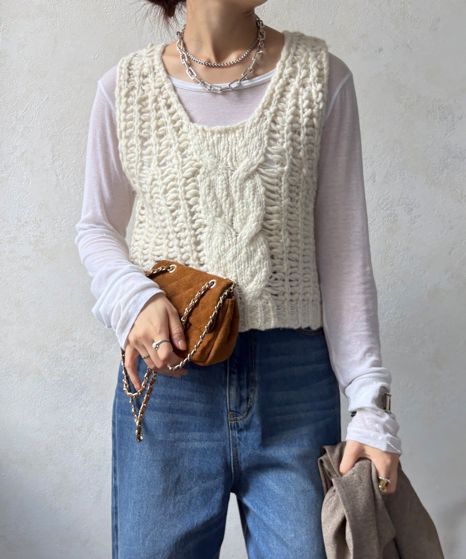 ざっくりとしたローゲージのケーブル編みが目を惹く