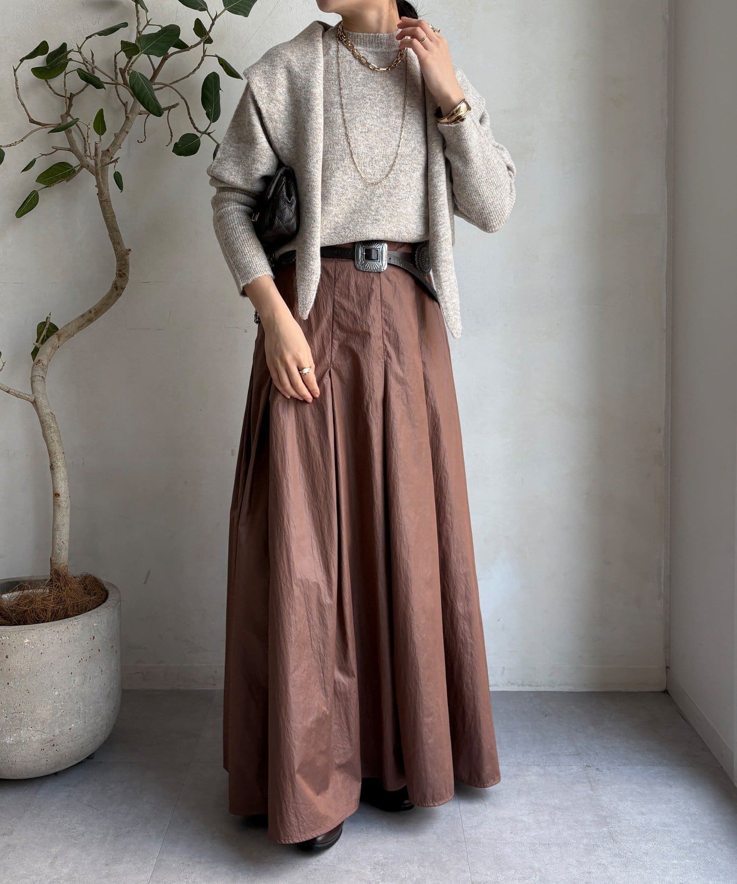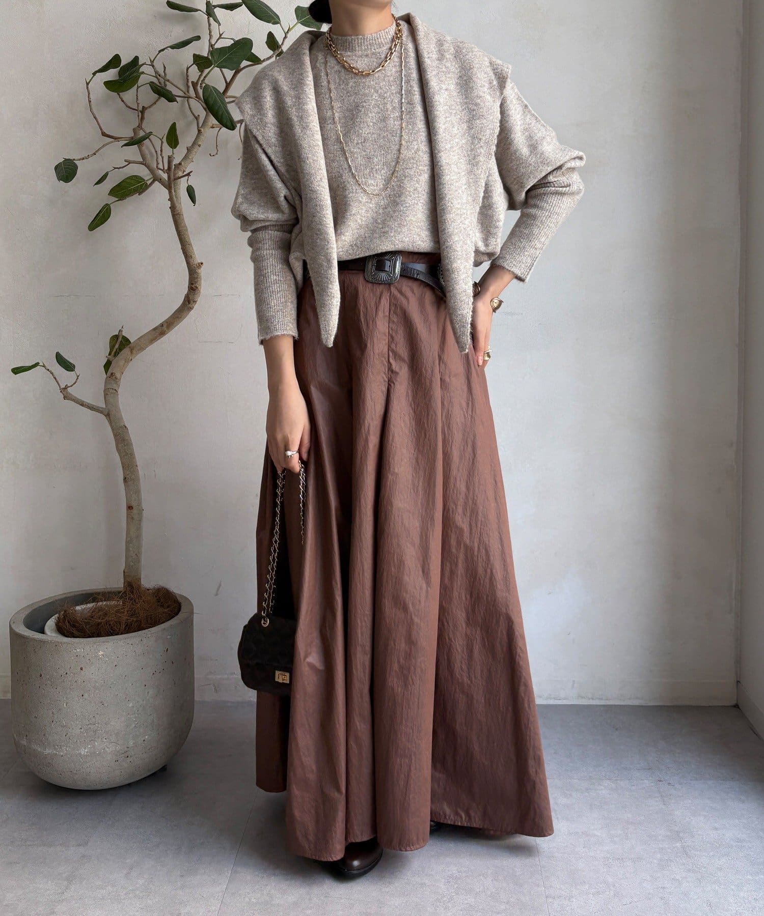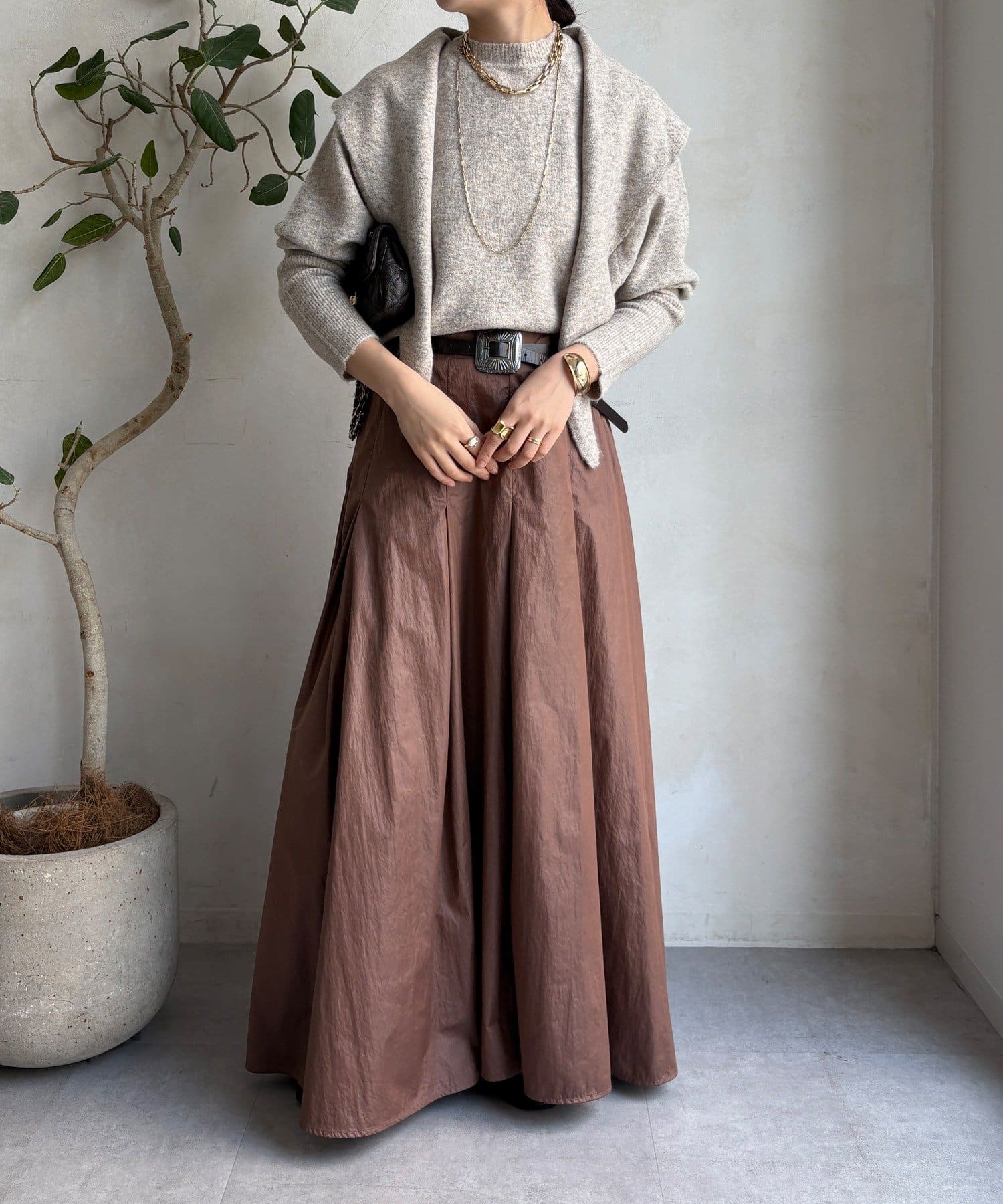 ストールを巻けば立体感のあるスタイルに、垂らして着ればすっきり見え、