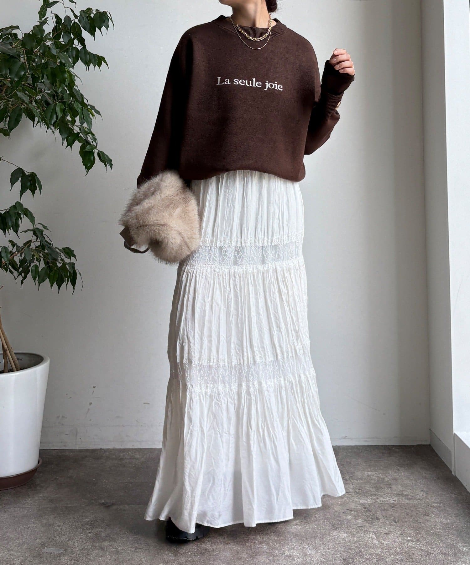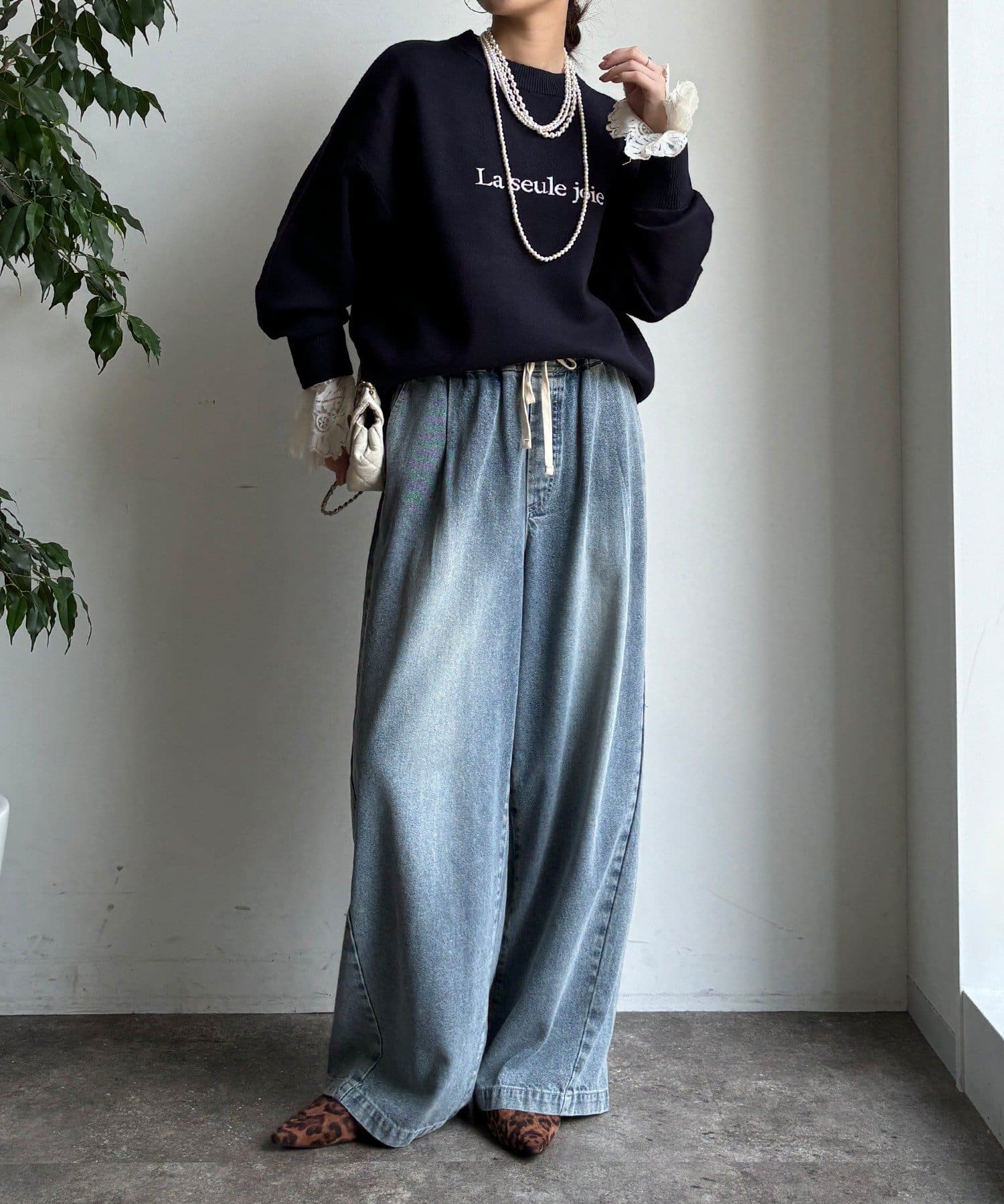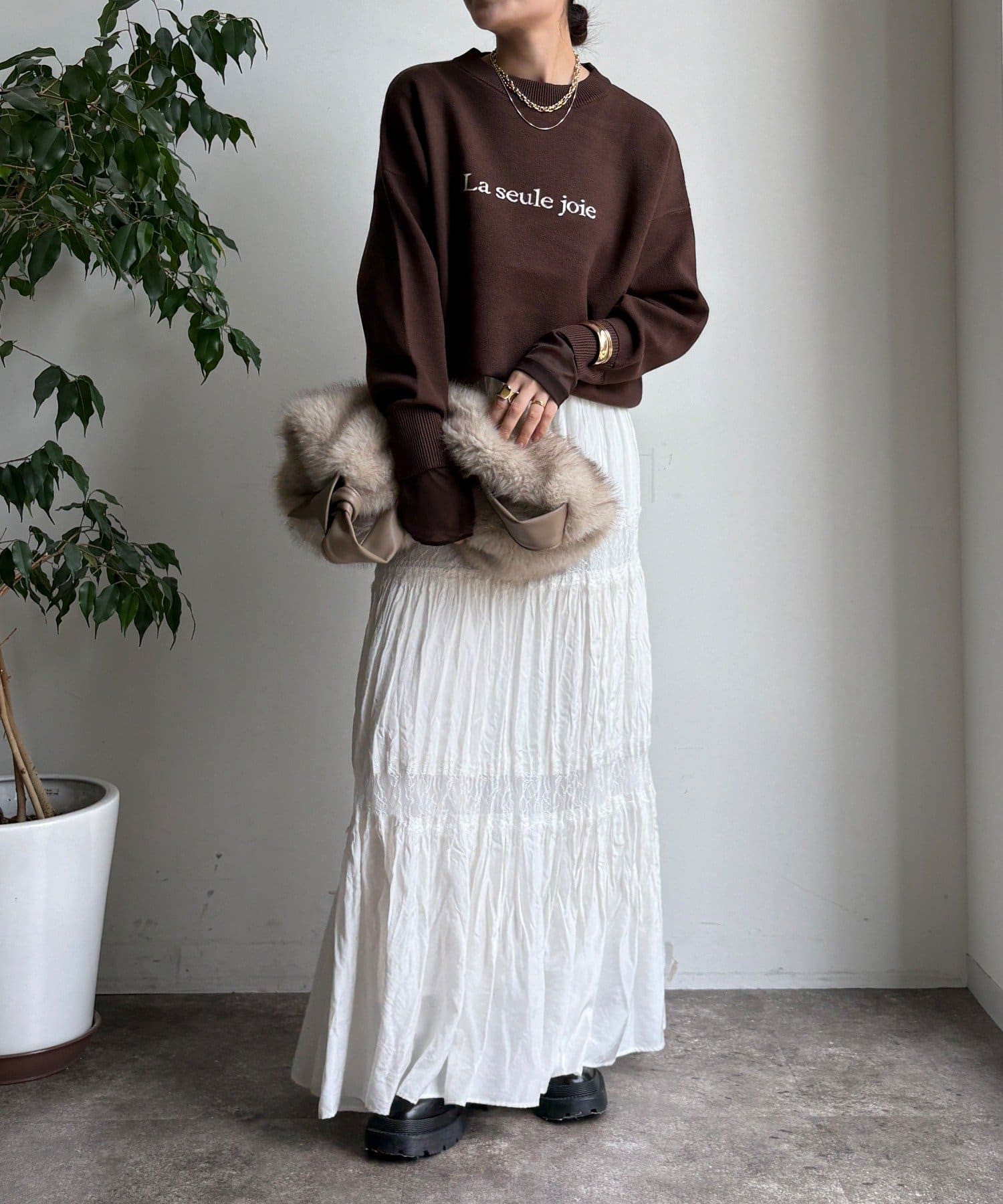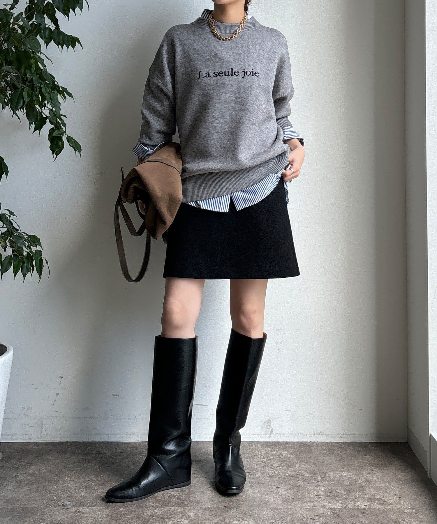 ボトムスを選ばず、デニムやスカート、カーゴパンツなど様々なスタイリングにマッチ。