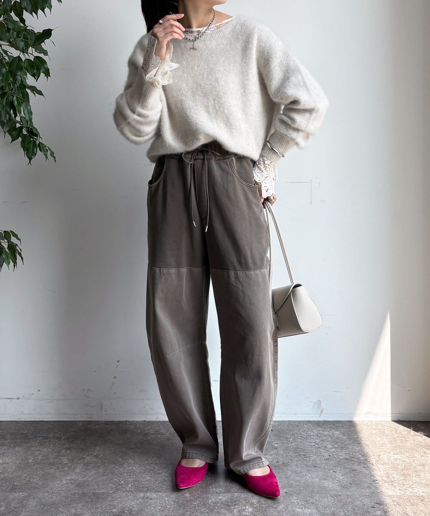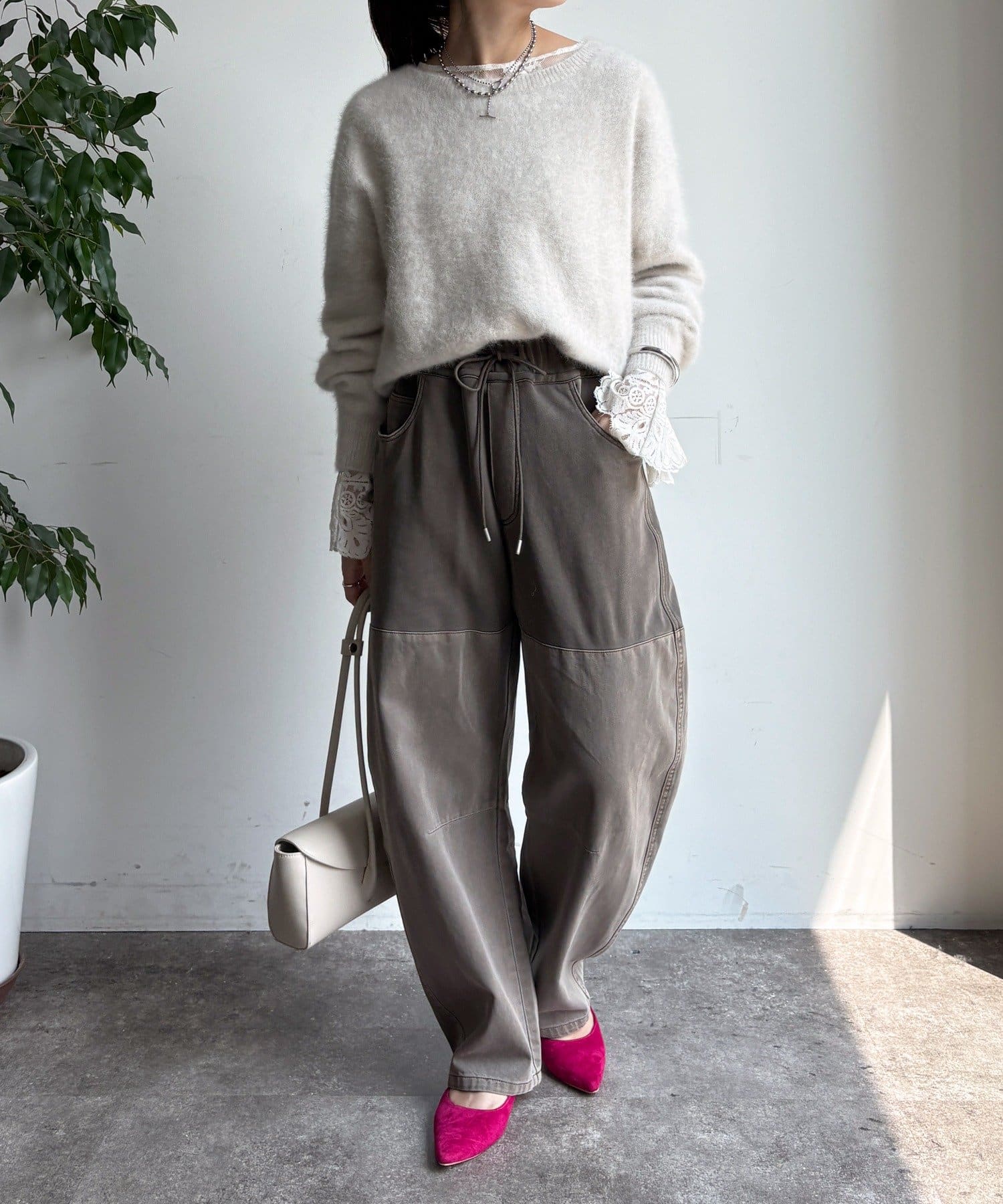 優しいカラーと飽きの来ないベーシックなデザインで、秋冬に長く重宝しそうなニット。