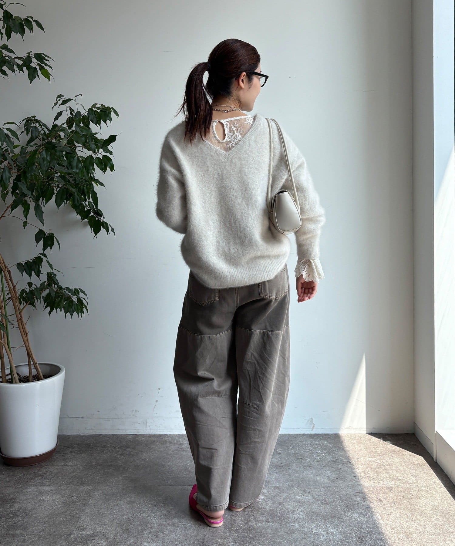 フワッフワ素材は着太りしやすそうですが、Vネックのおかげでスッキリして見えます