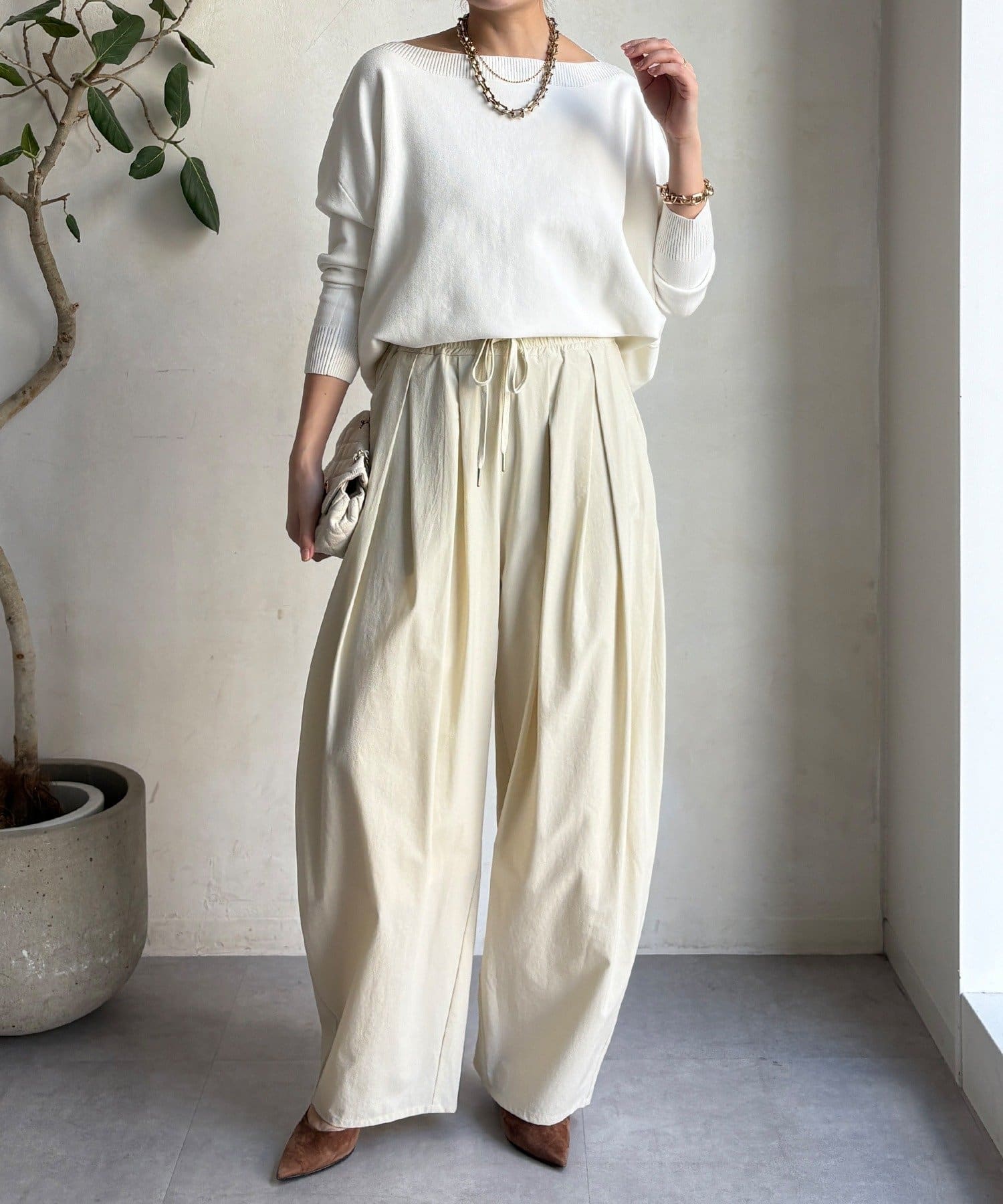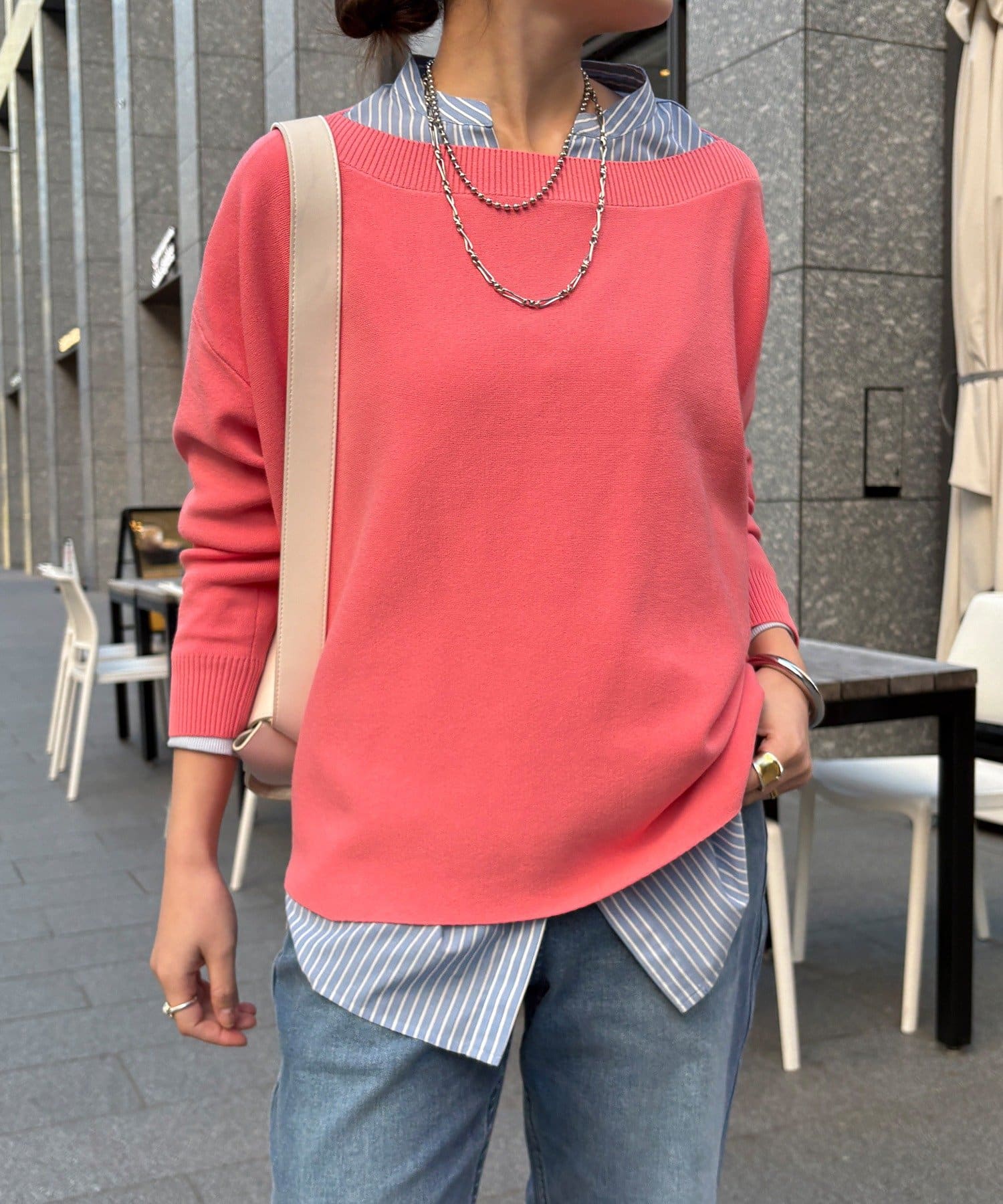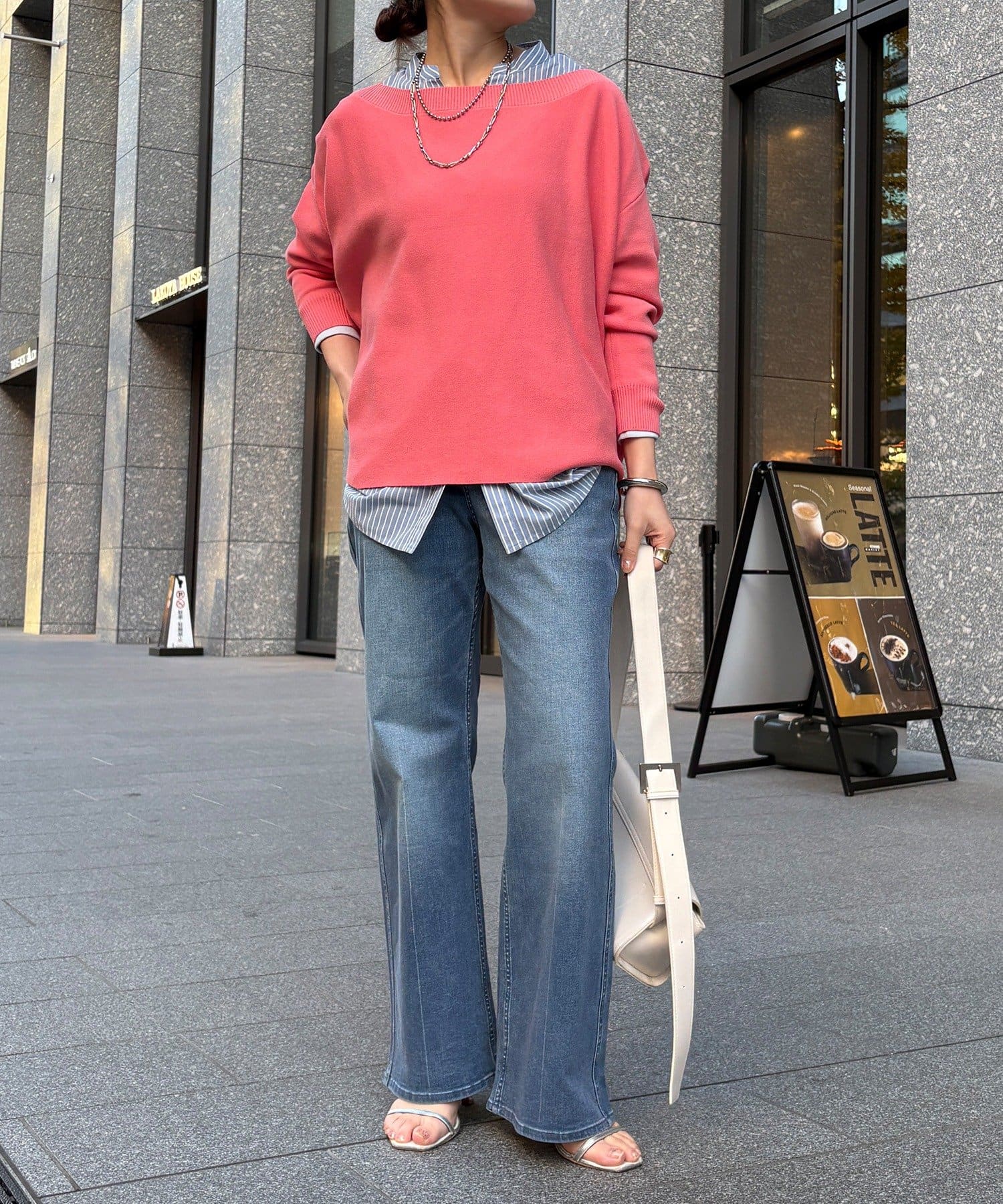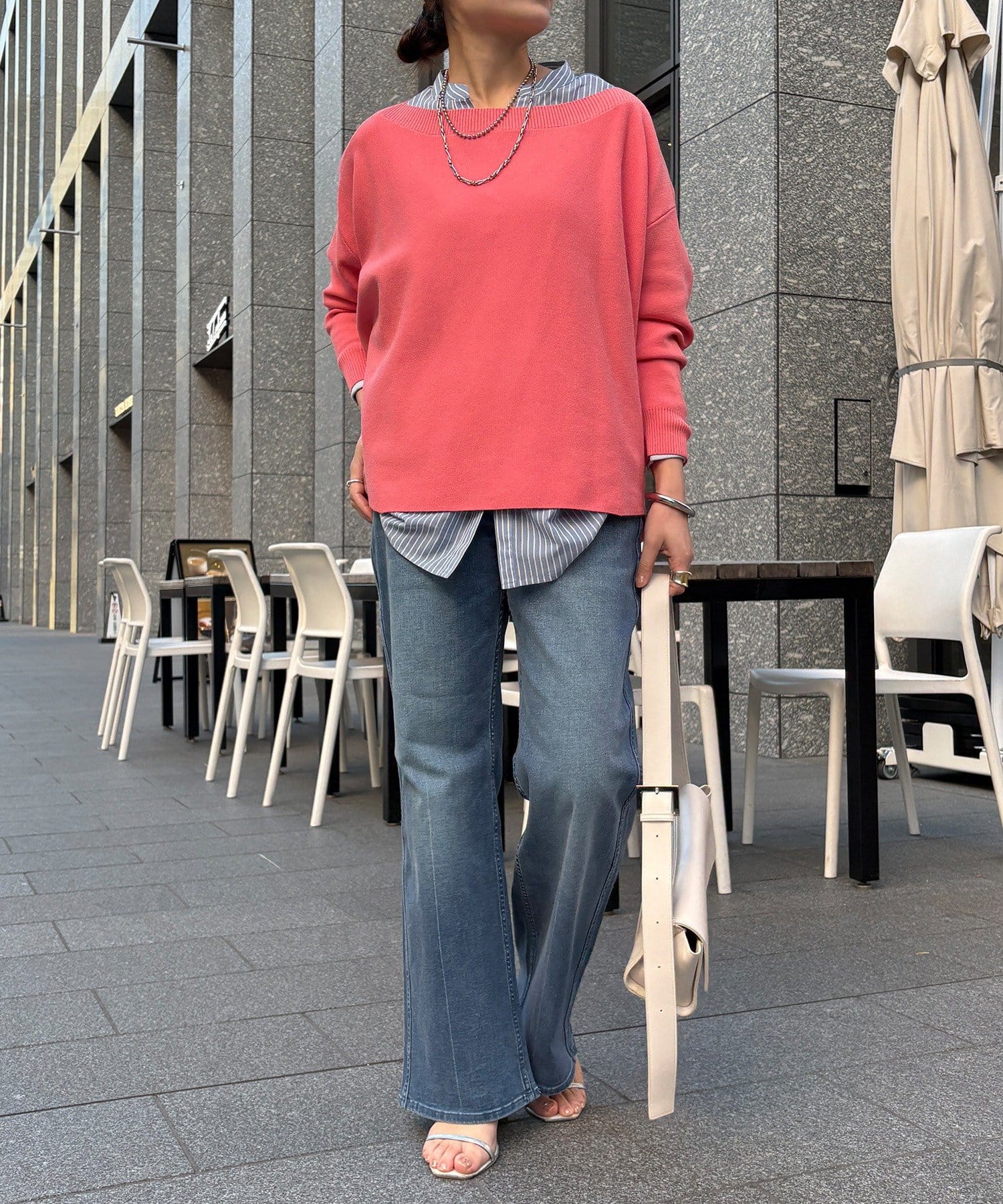 シルエットは、すっきりとしたボートネックで仕上げることで、抜け感をプラス。