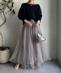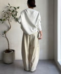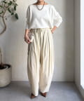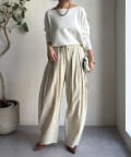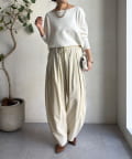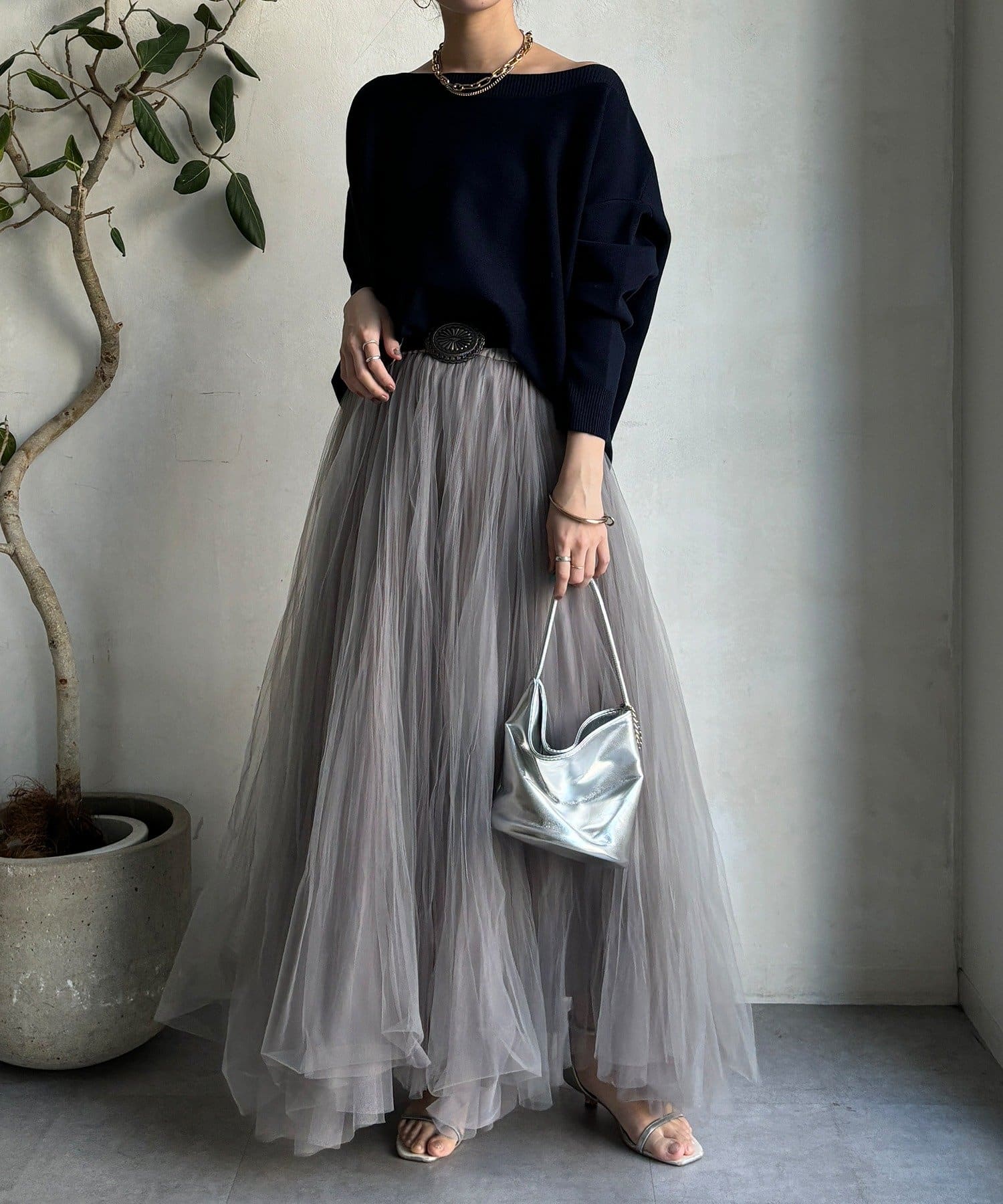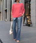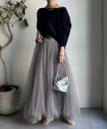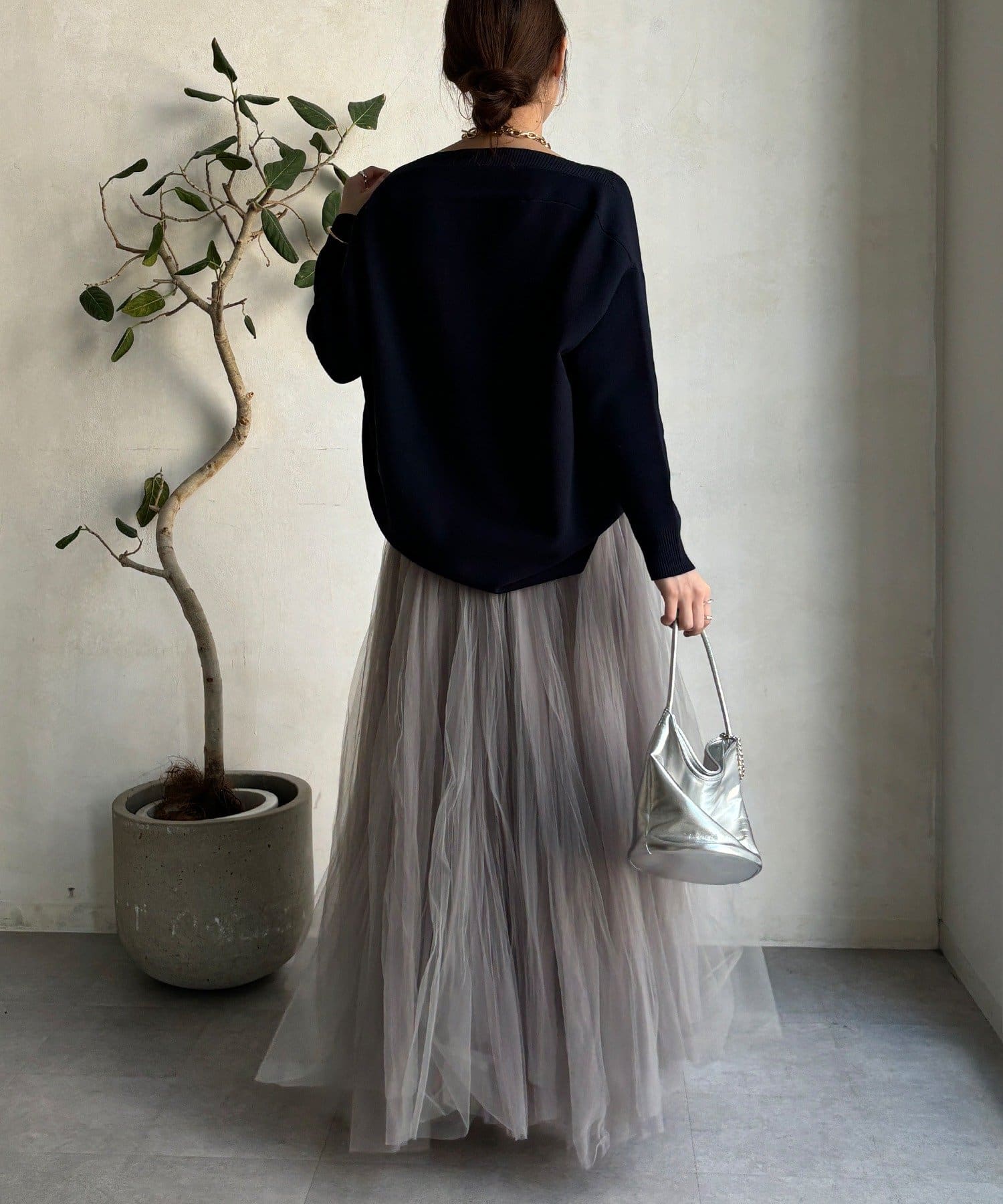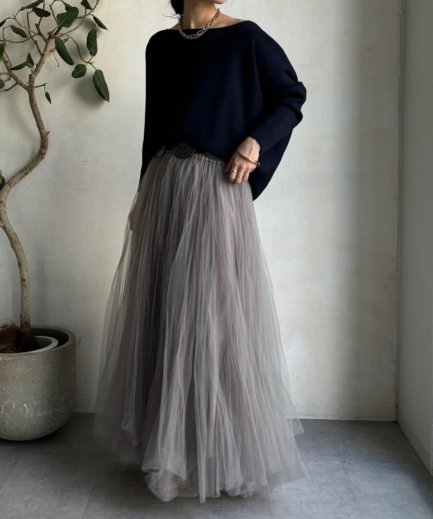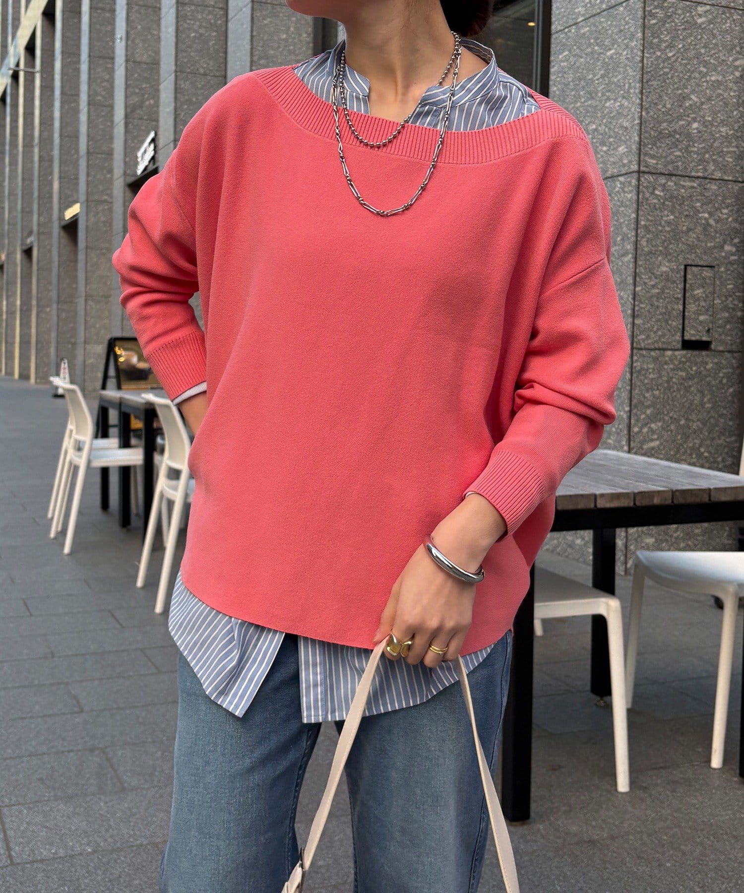 シルエットは、すっきりとしたボートネックで仕上げることで、抜け感をプラス。