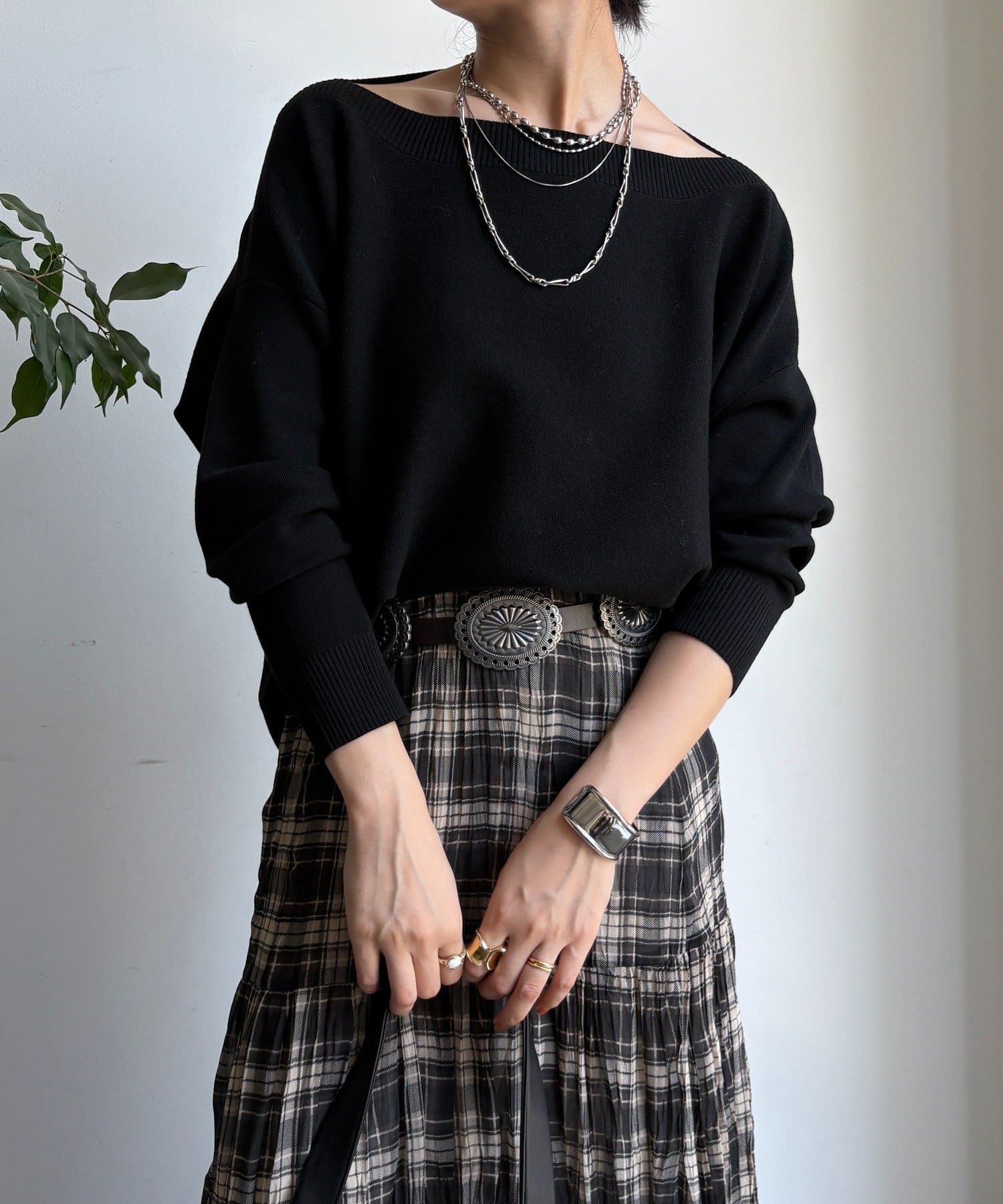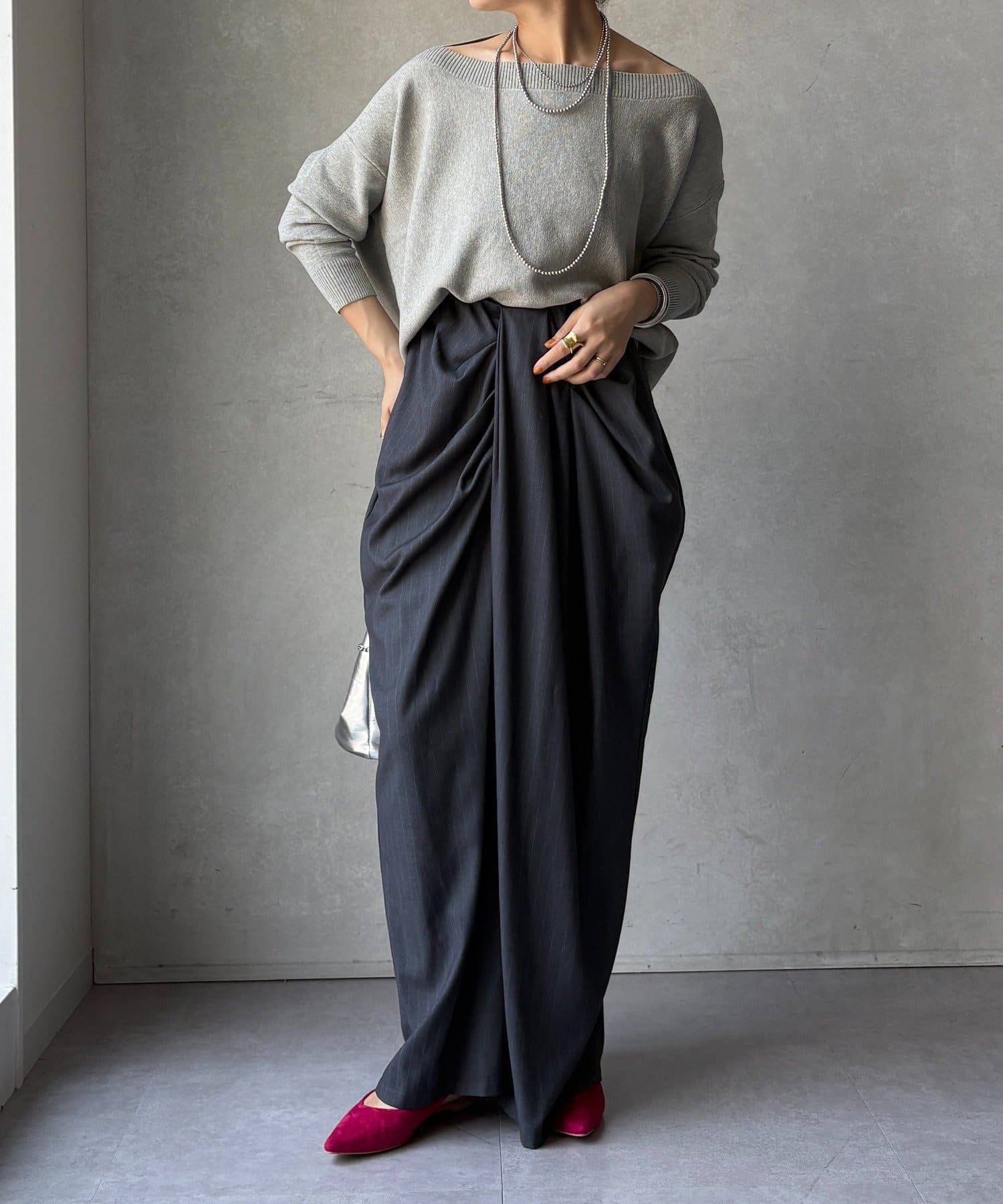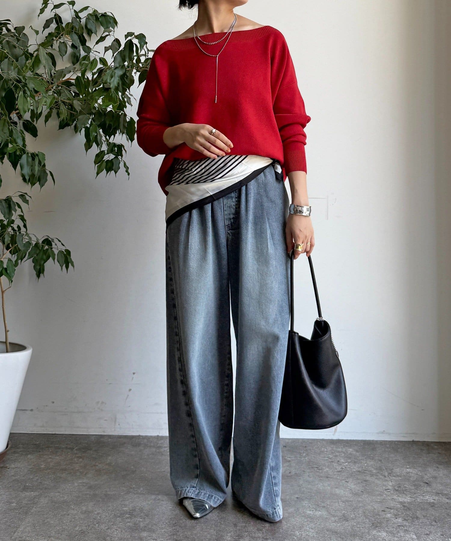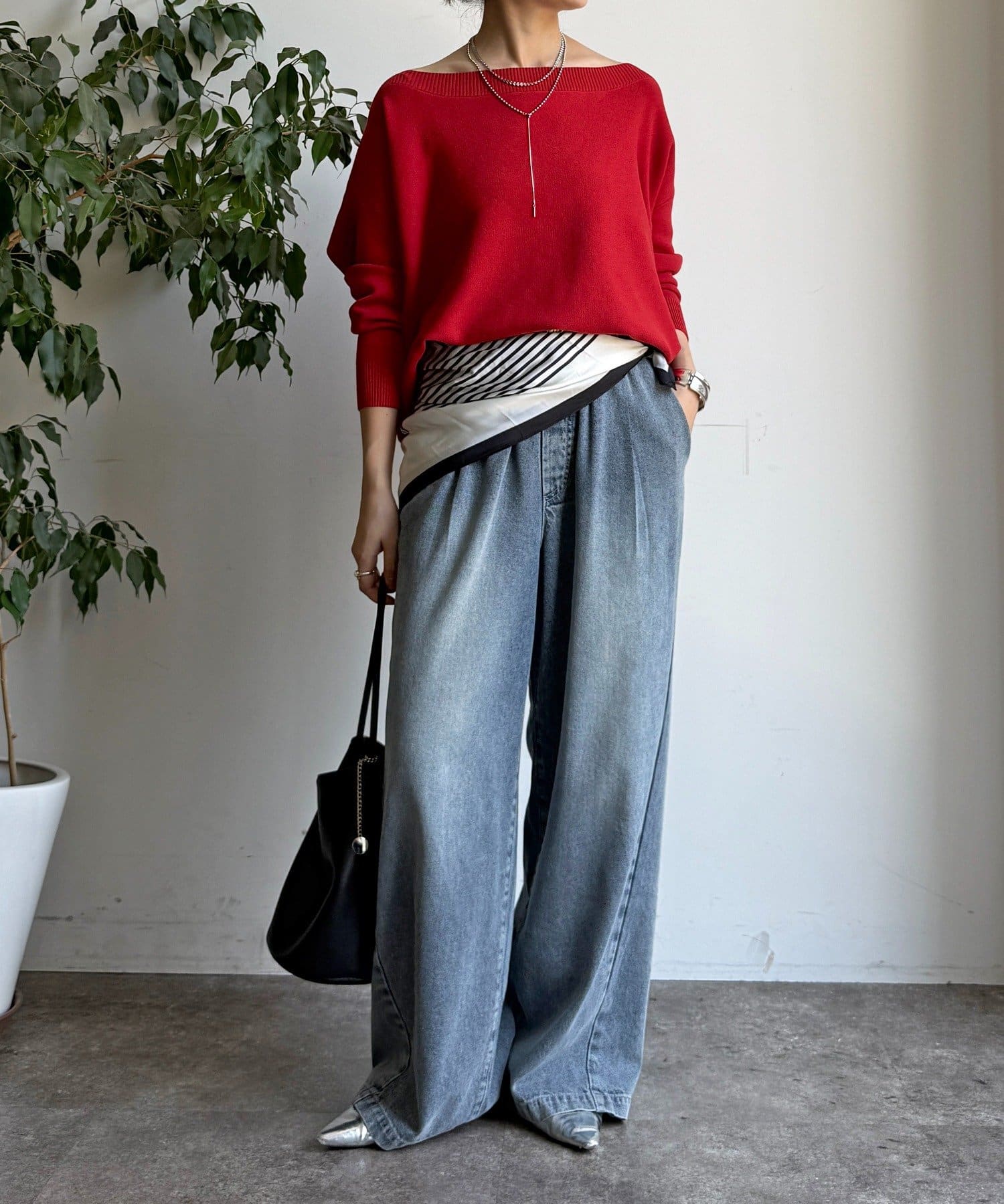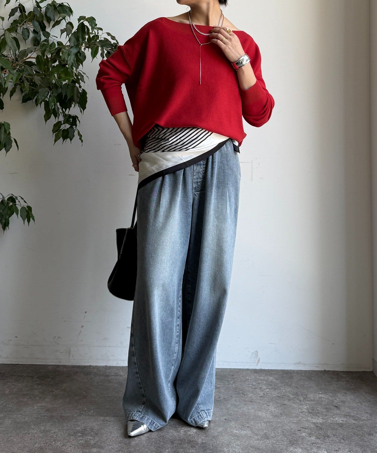 シルエットは、すっきりとしたボートネックで仕上げることで、抜け感をプラス。