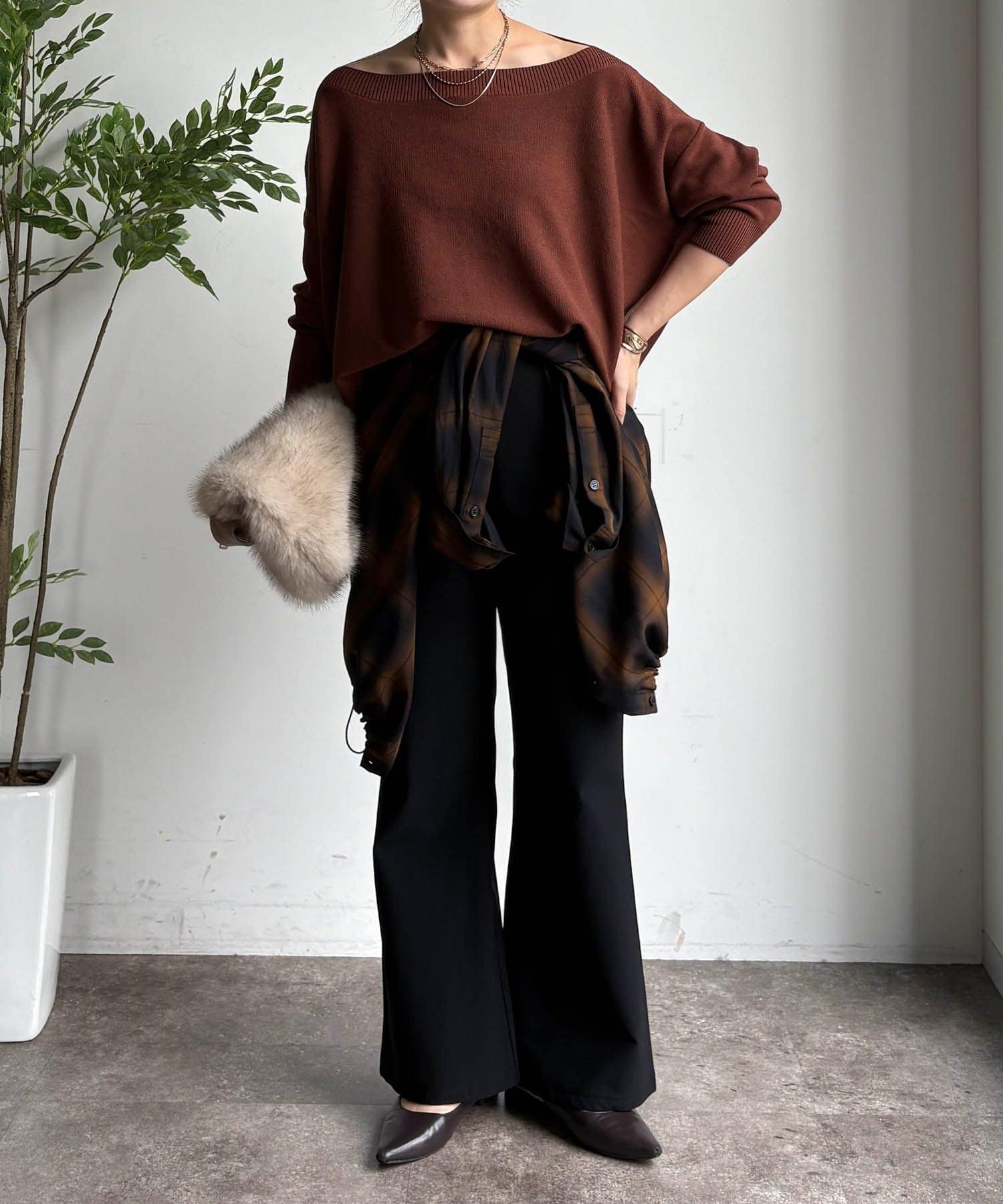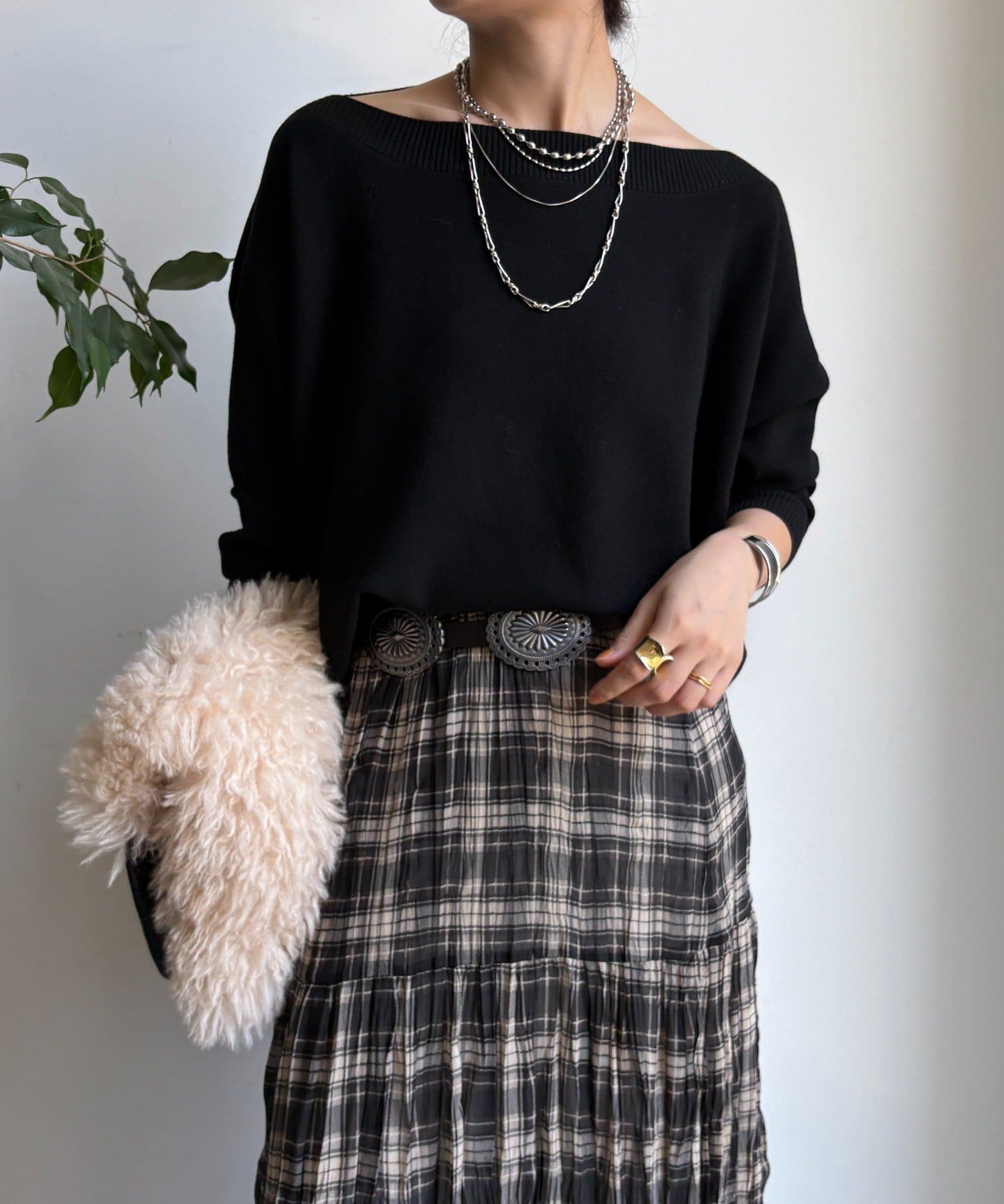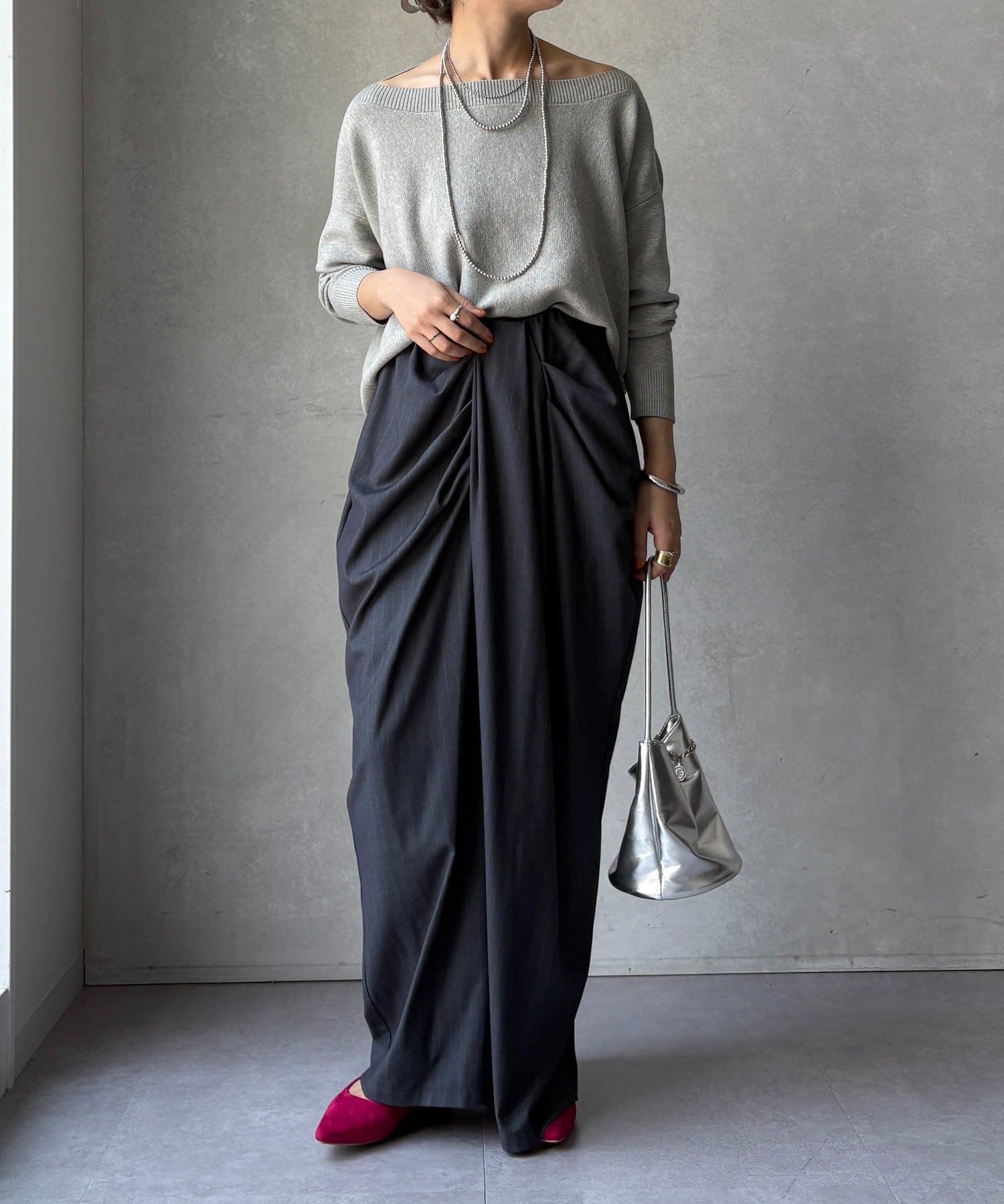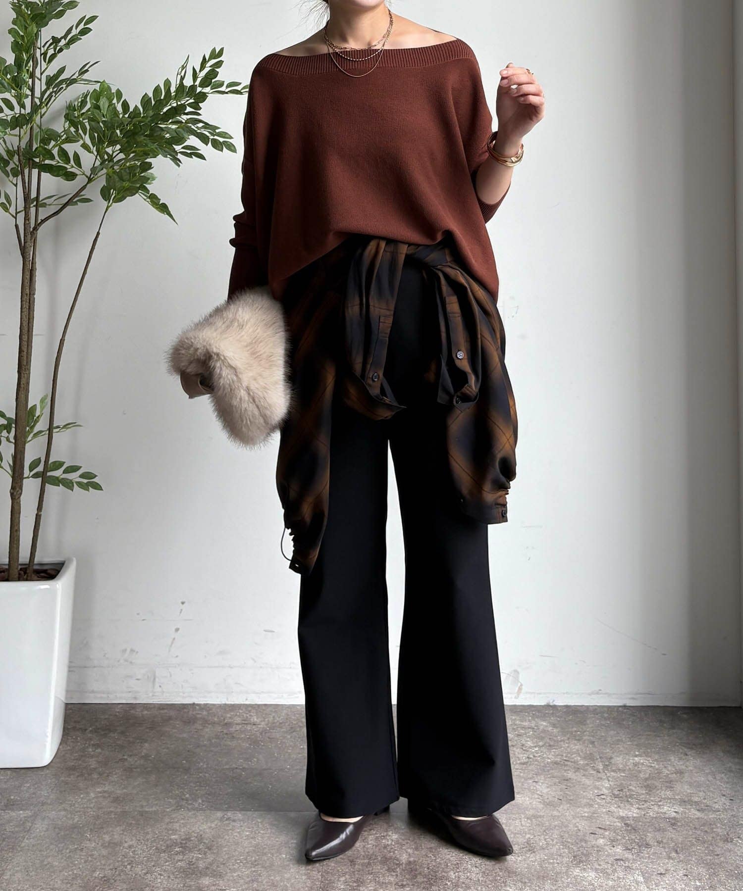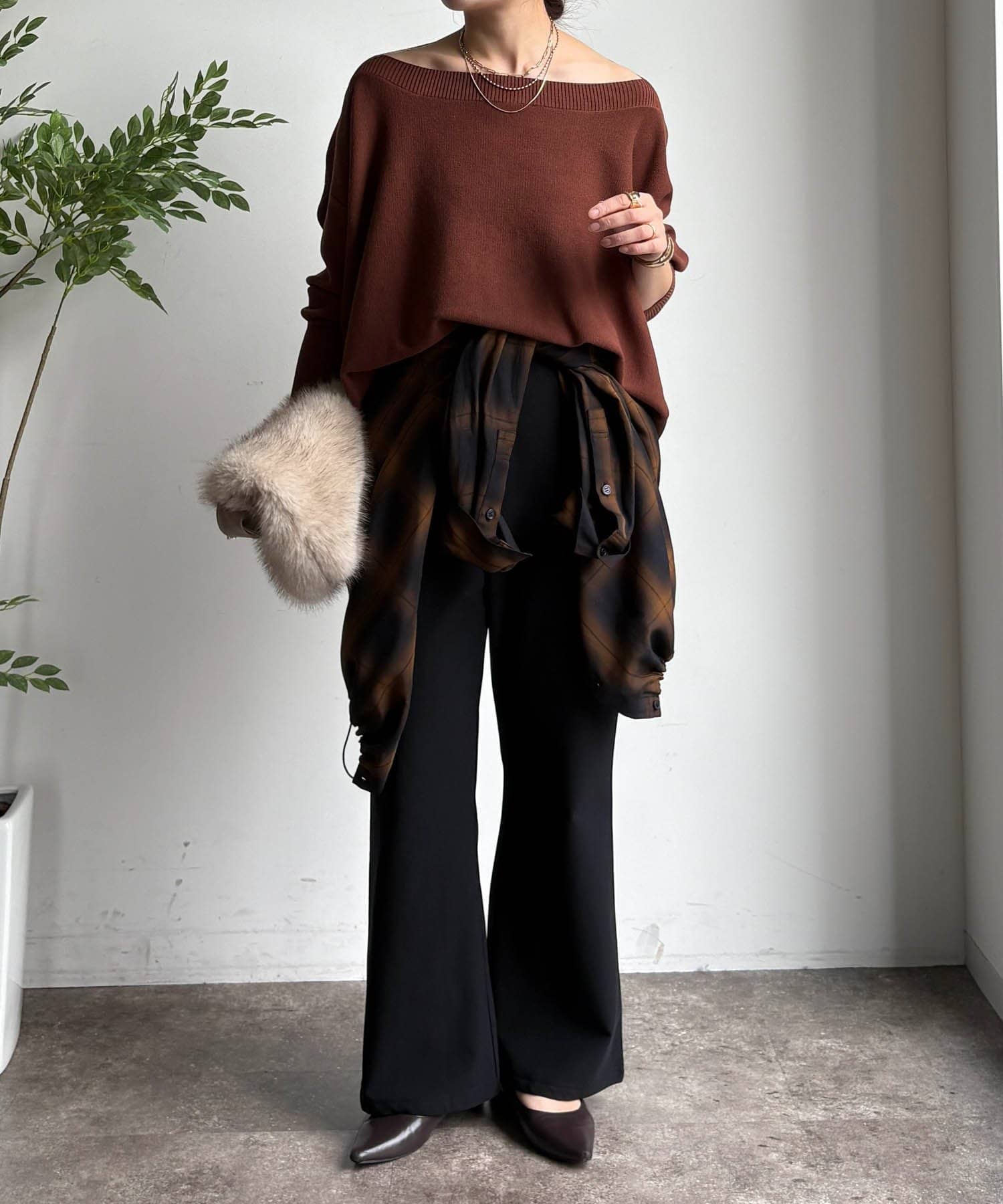 シルエットは、すっきりとしたボートネックで仕上げることで、抜け感をプラス。