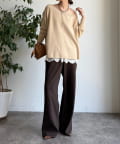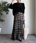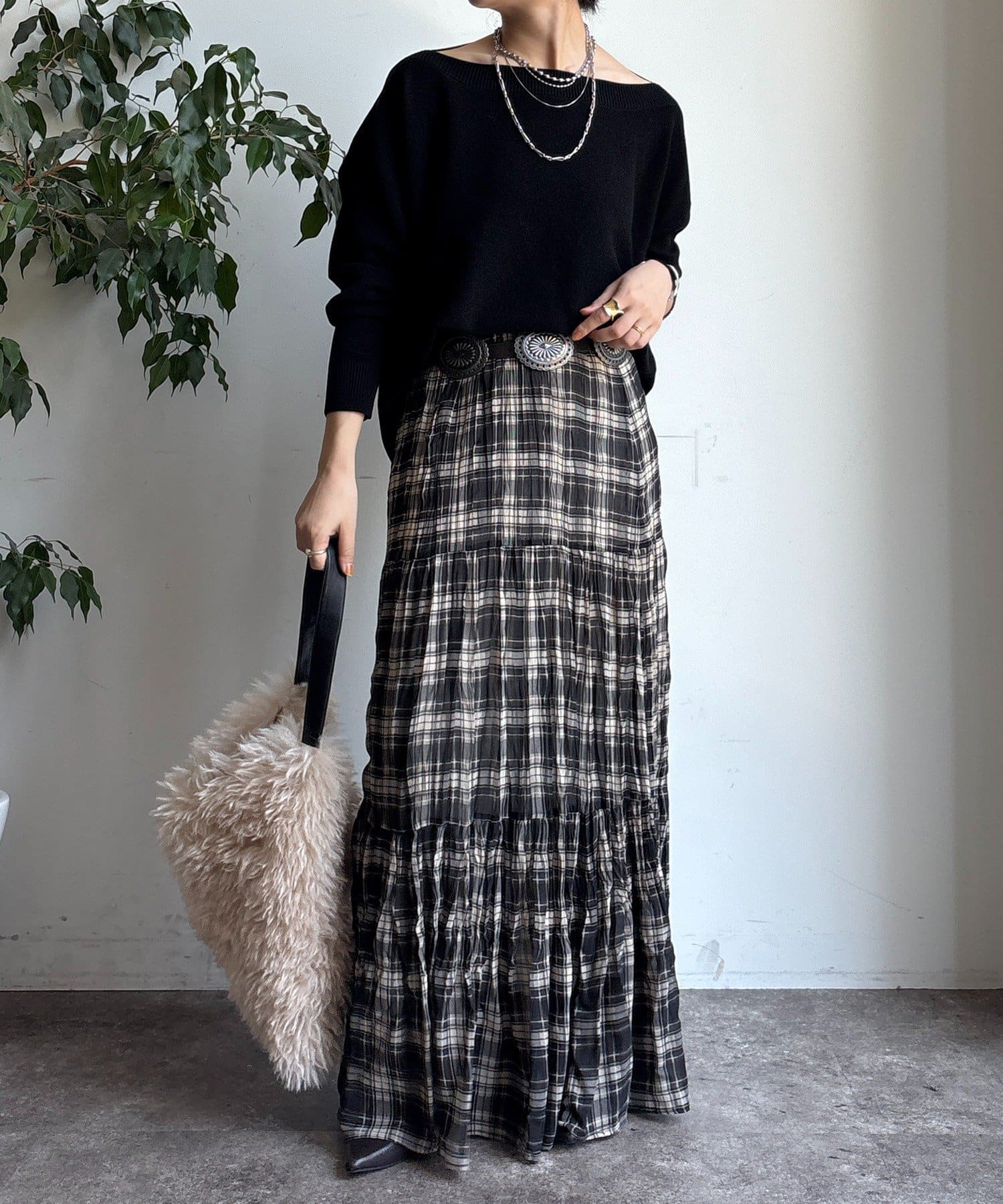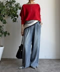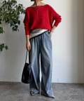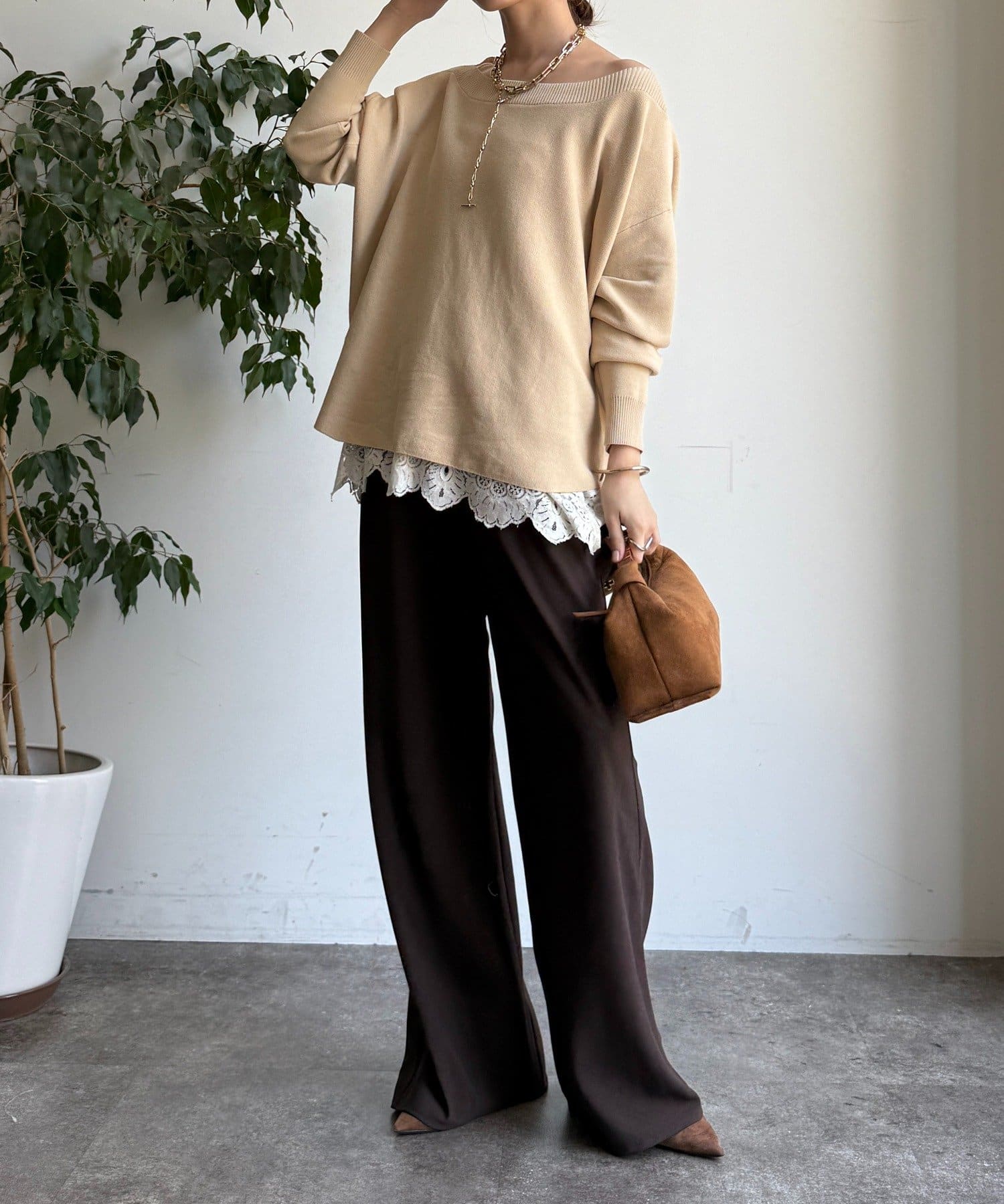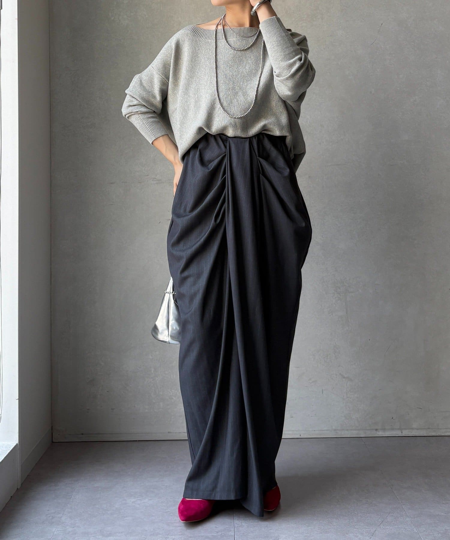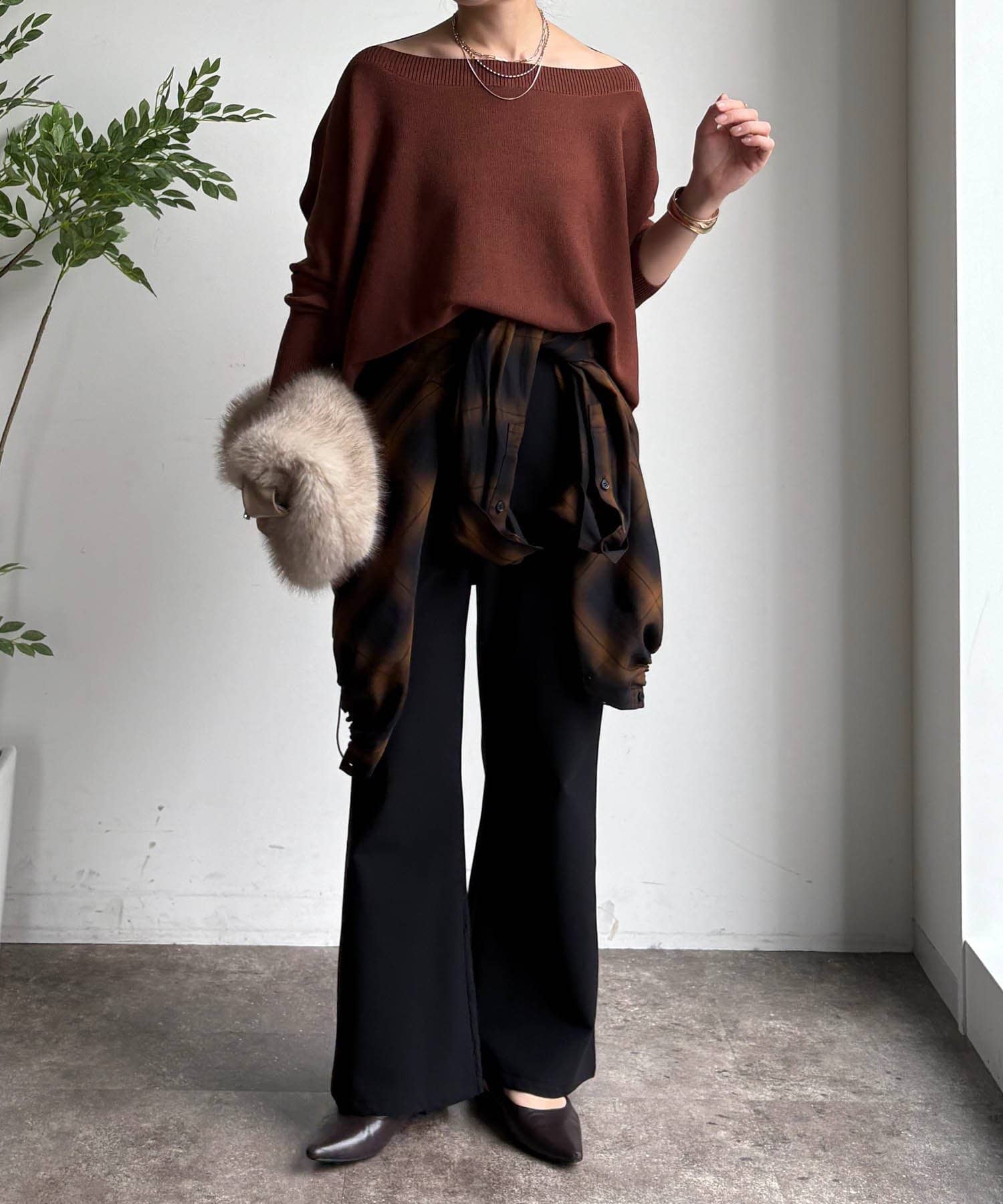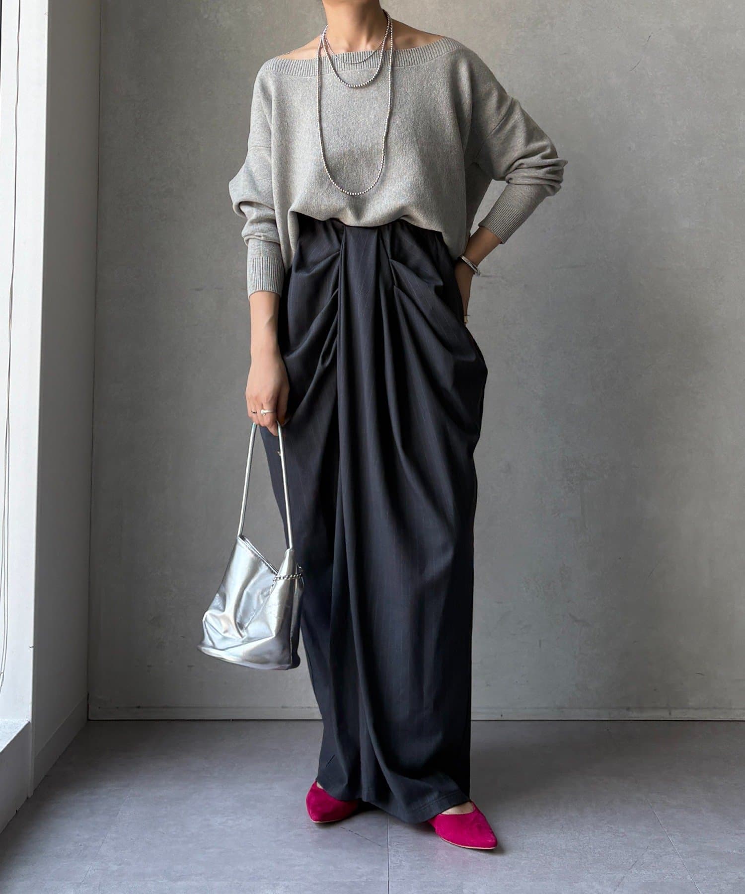 シルエットは、すっきりとしたボートネックで仕上げることで、抜け感をプラス。