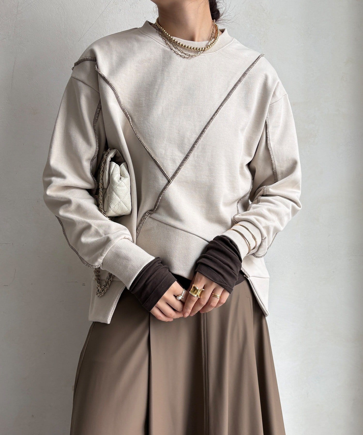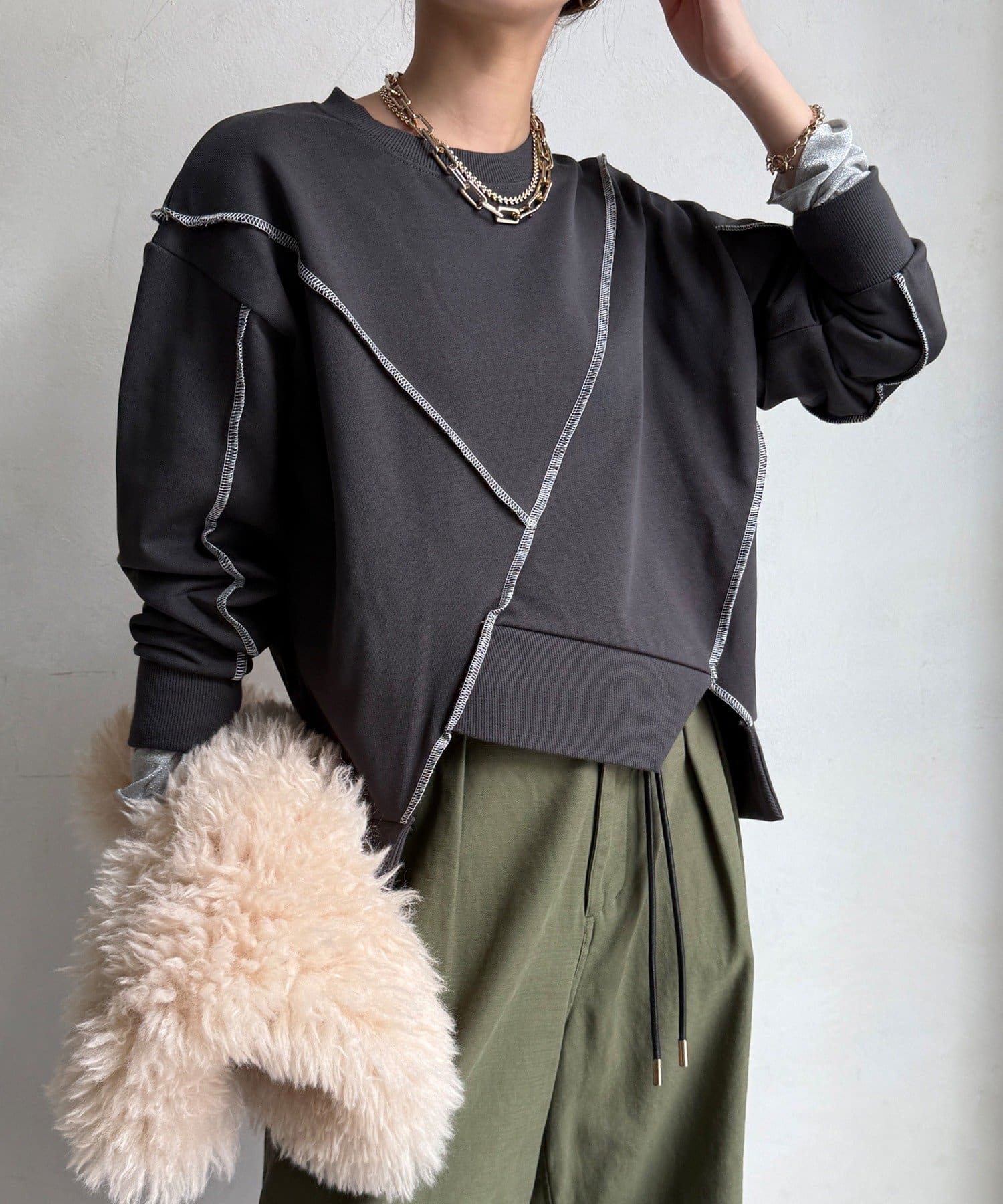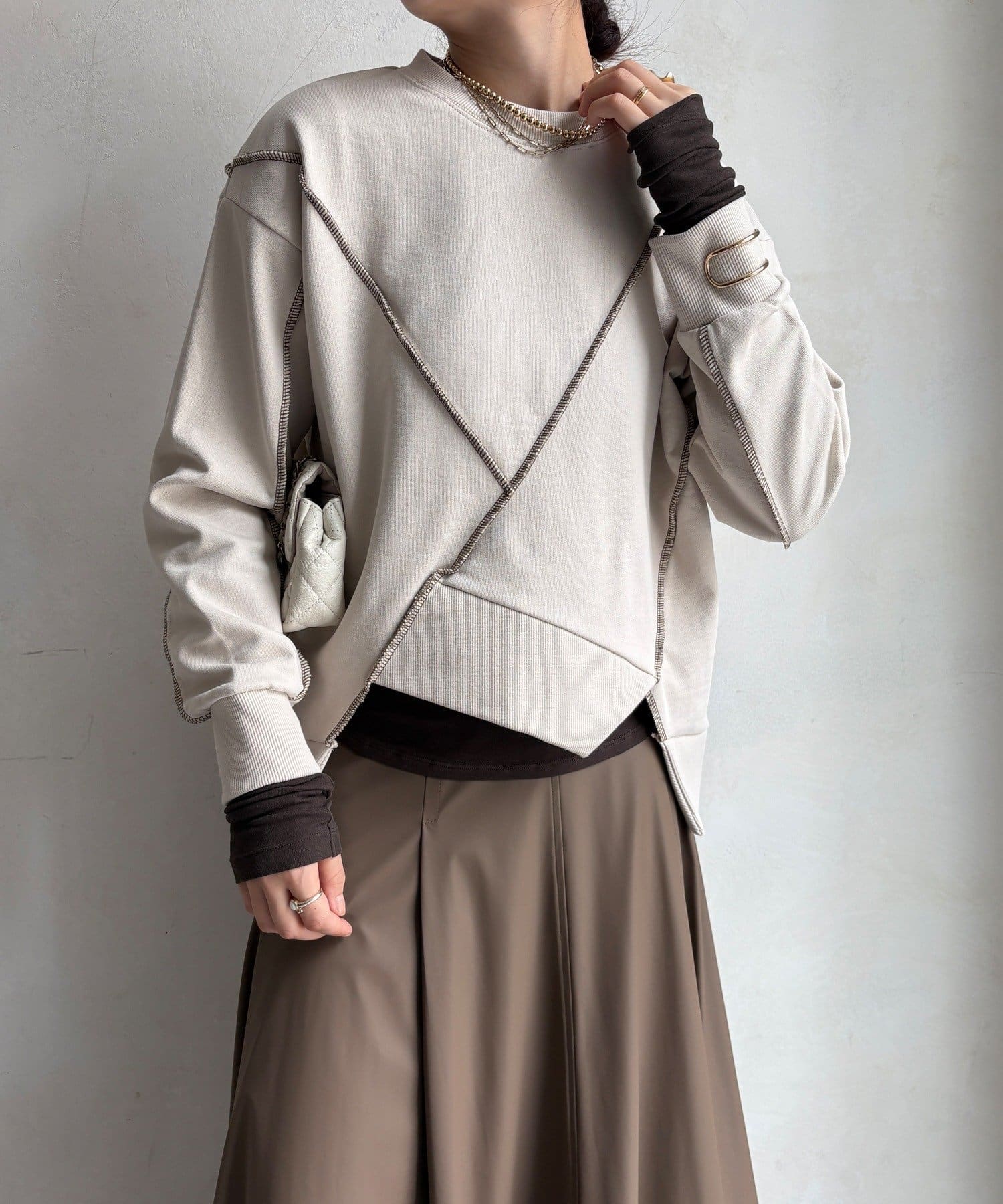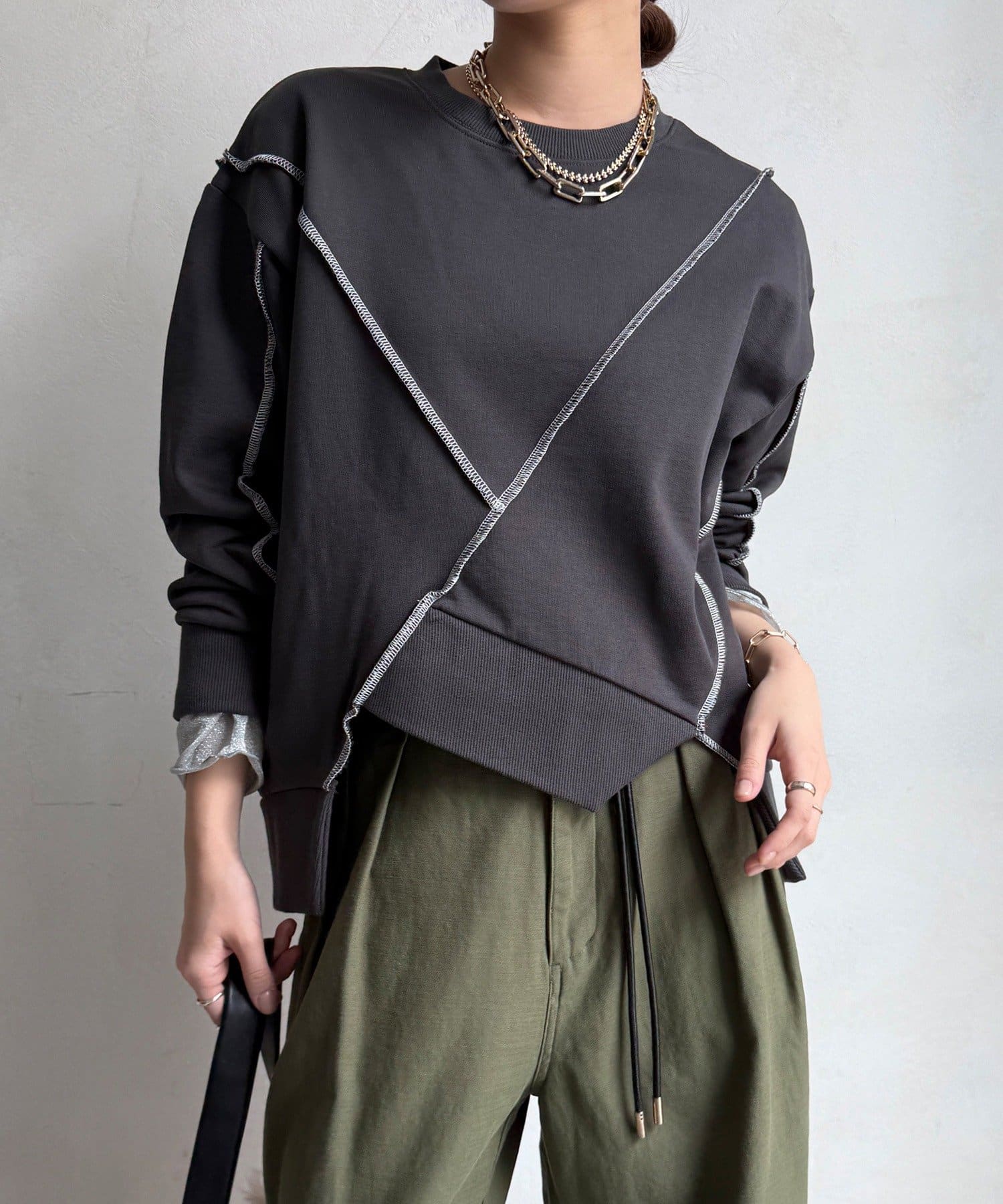 切り替えデザインが立体的なシルエットを生み出し、他にはない個性を演出するトップス。
