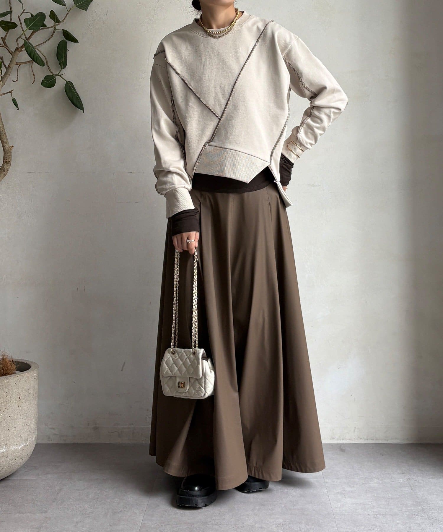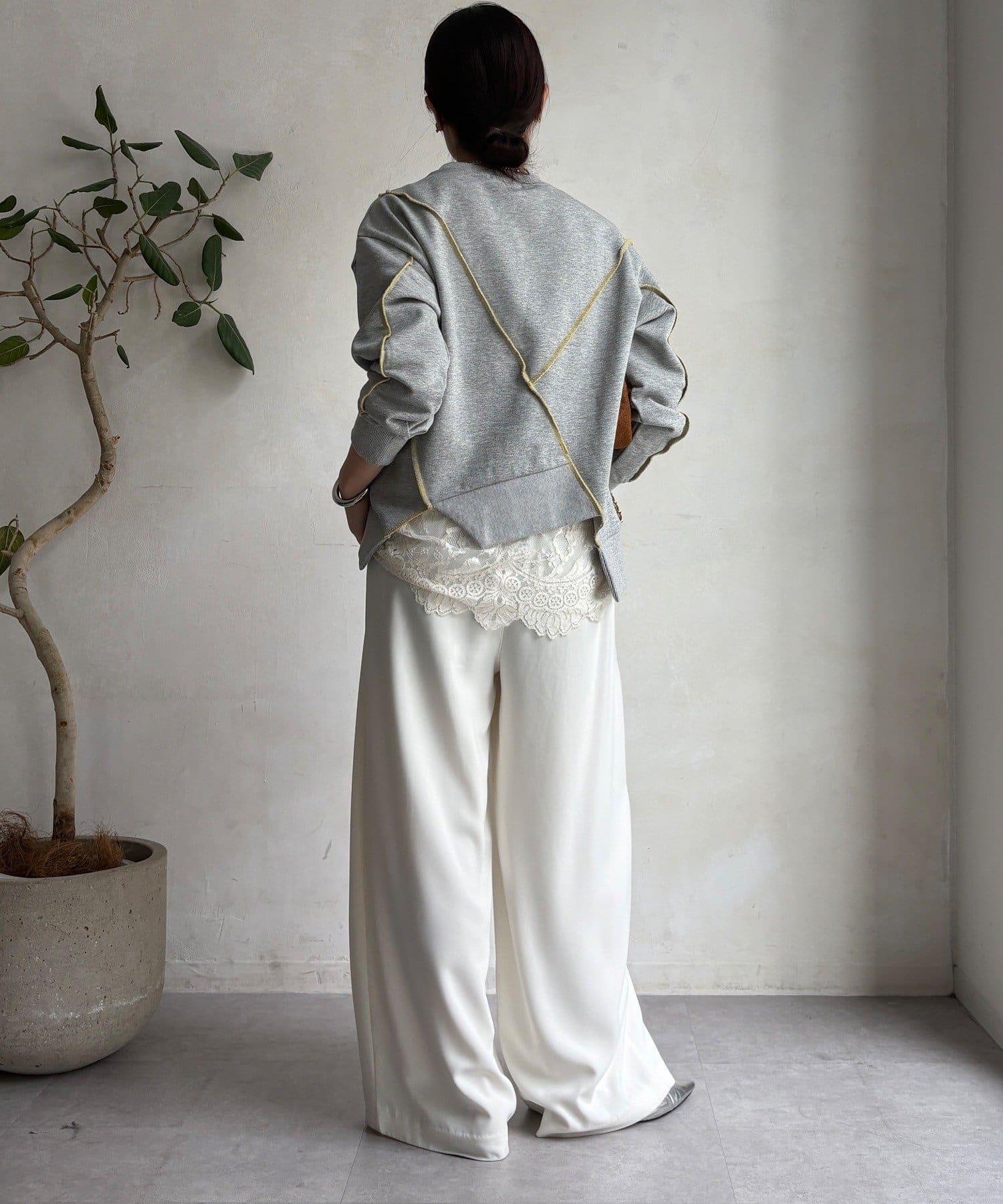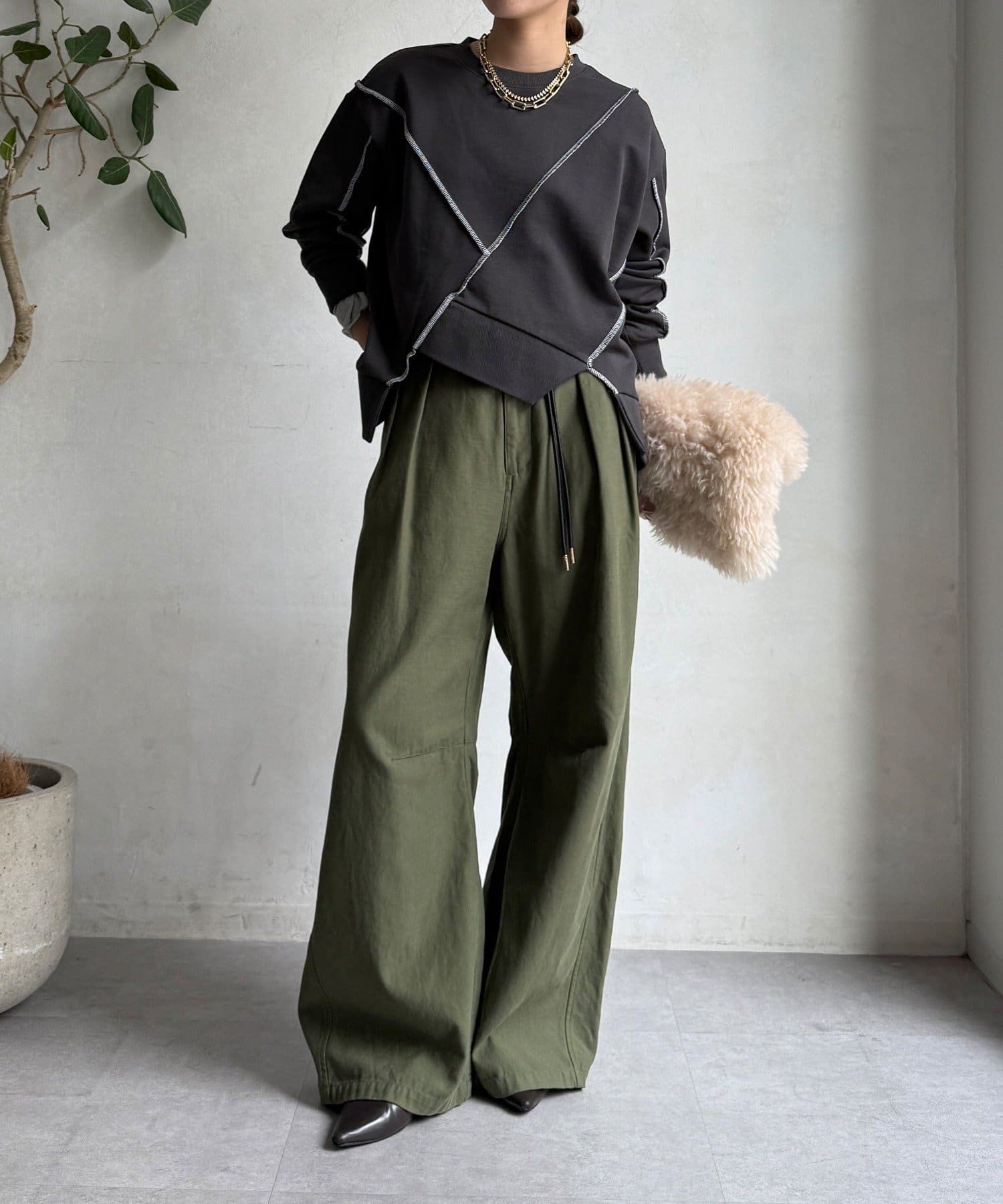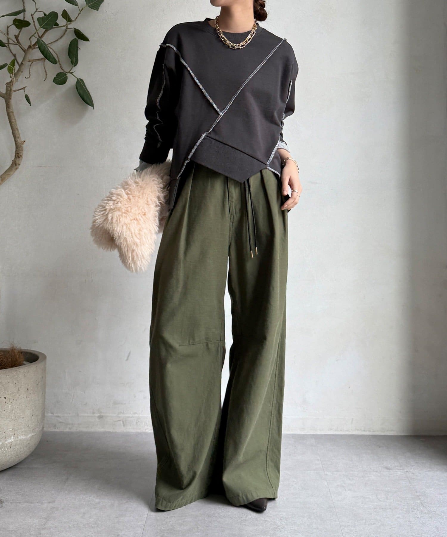切り替えデザインが立体的なシルエットを生み出し、他にはない個性を演出するトップス。